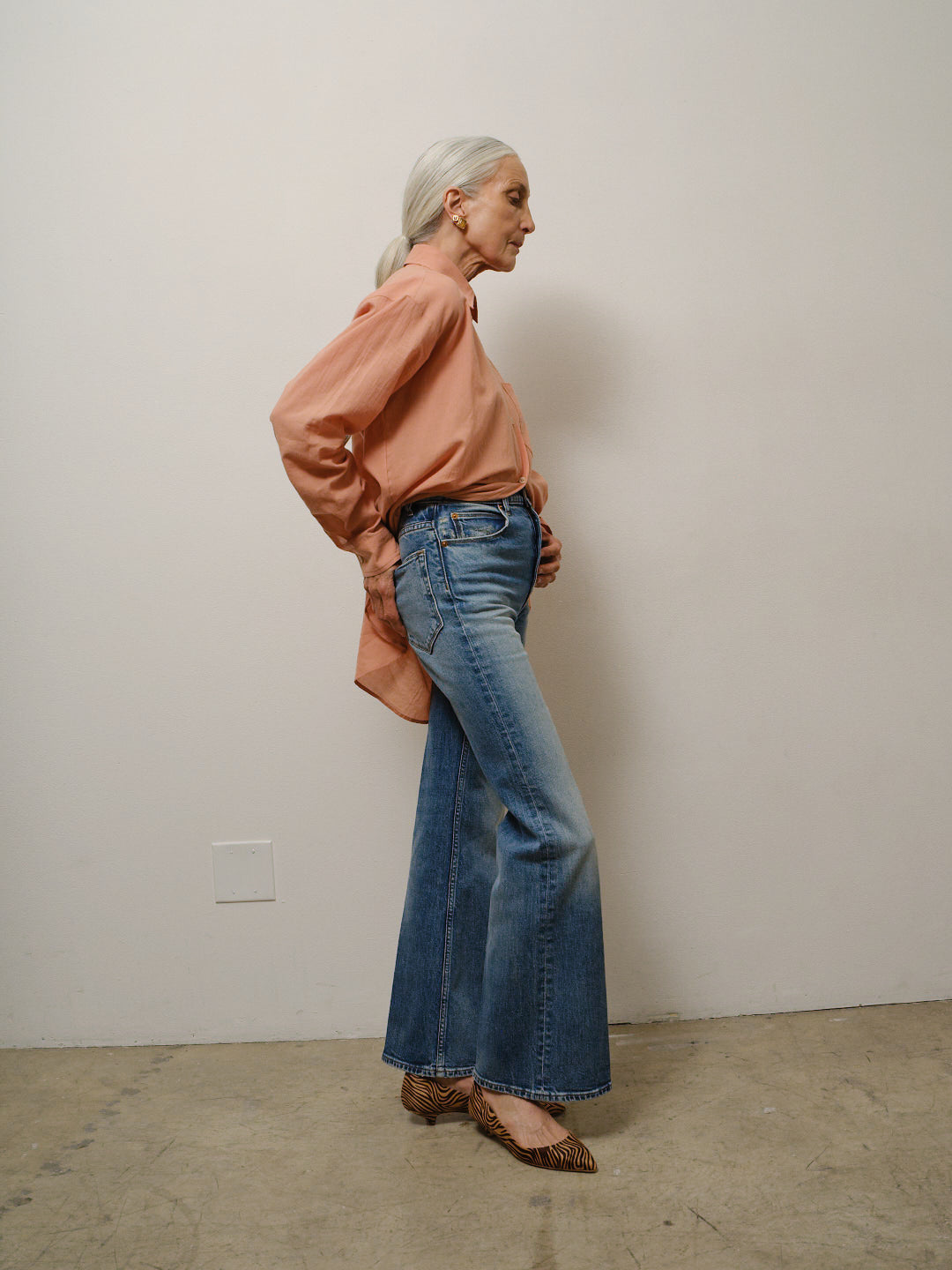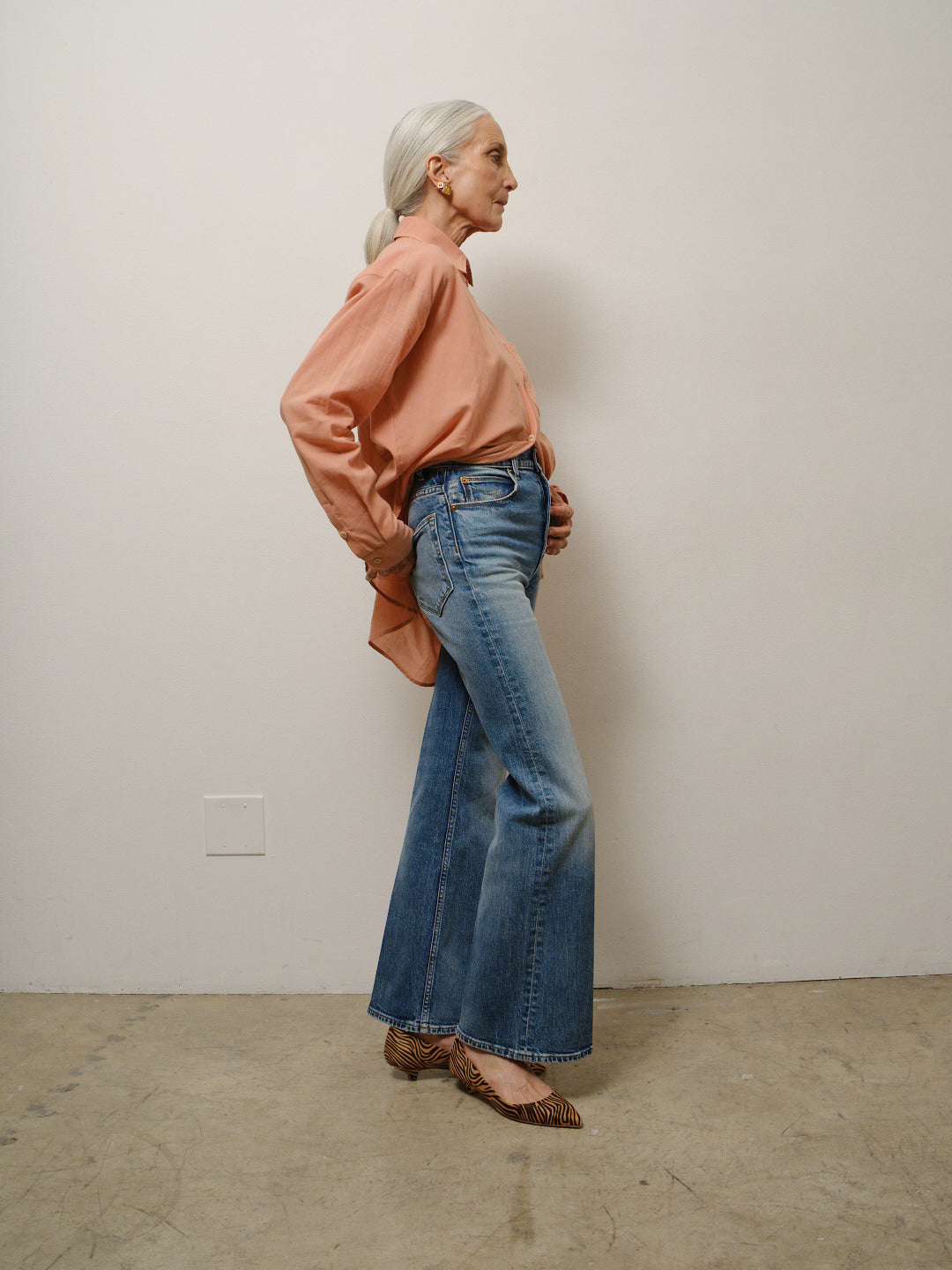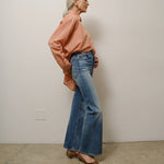 A relaxed flare that does the long and lean look well. A leg shaped like a narrow A. A leg that elongates. The shape that leans. A 13” high rise that accentuates the natural waist. A silhouette that you fall in love with, and loves you back with it’s 2% stretch.