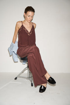 A deep V cami with delicate lace detail, perfect for layering under a blazer or a night out with the Crease Jean. Tailored in sand washed silk charmeuse with the satin side soft to the skin.