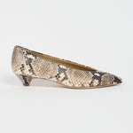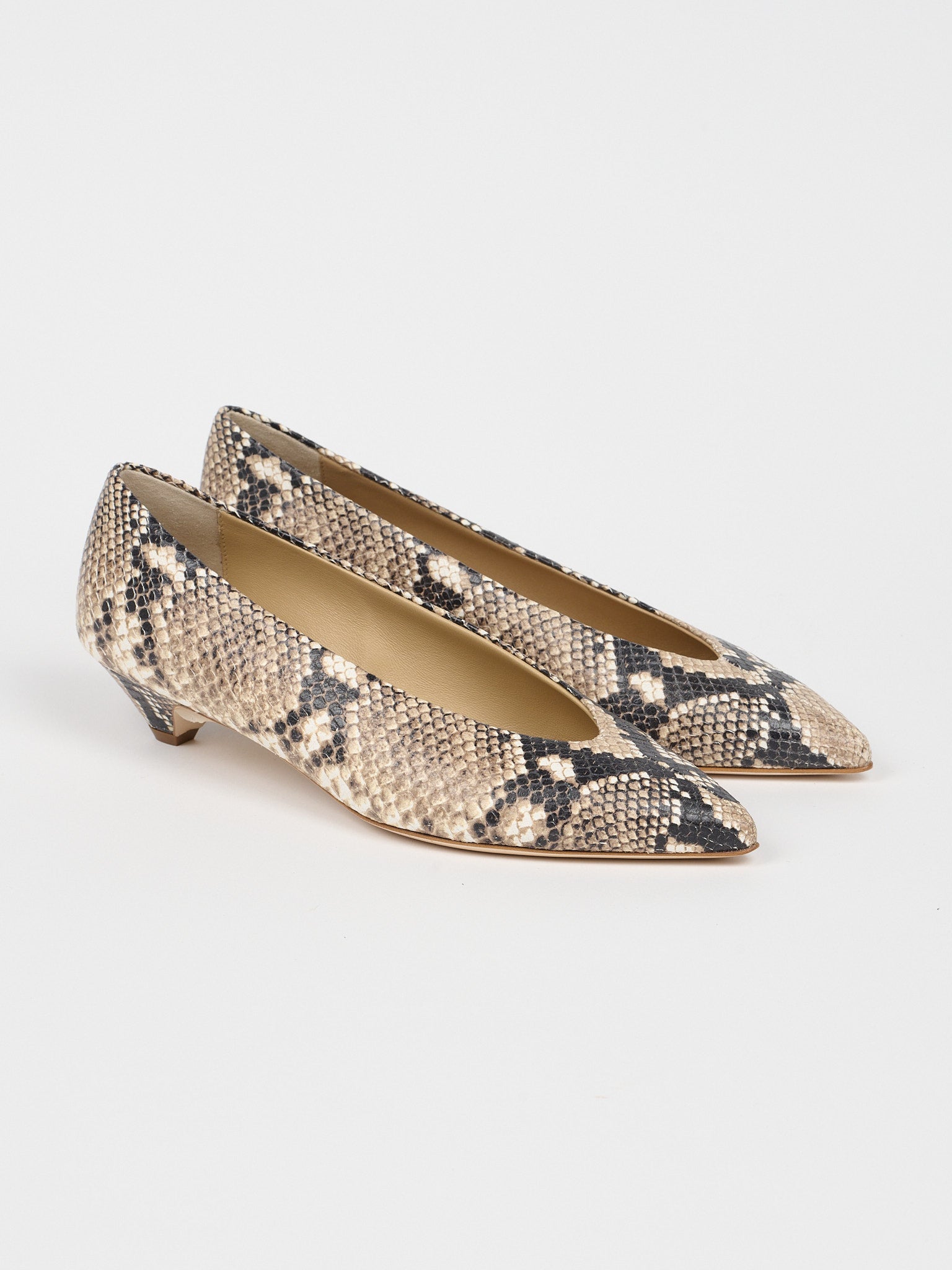 A trapezoidal shaped low heel, a more enclosed surround of the foot, a soft point and seamed detail. A modern pump.