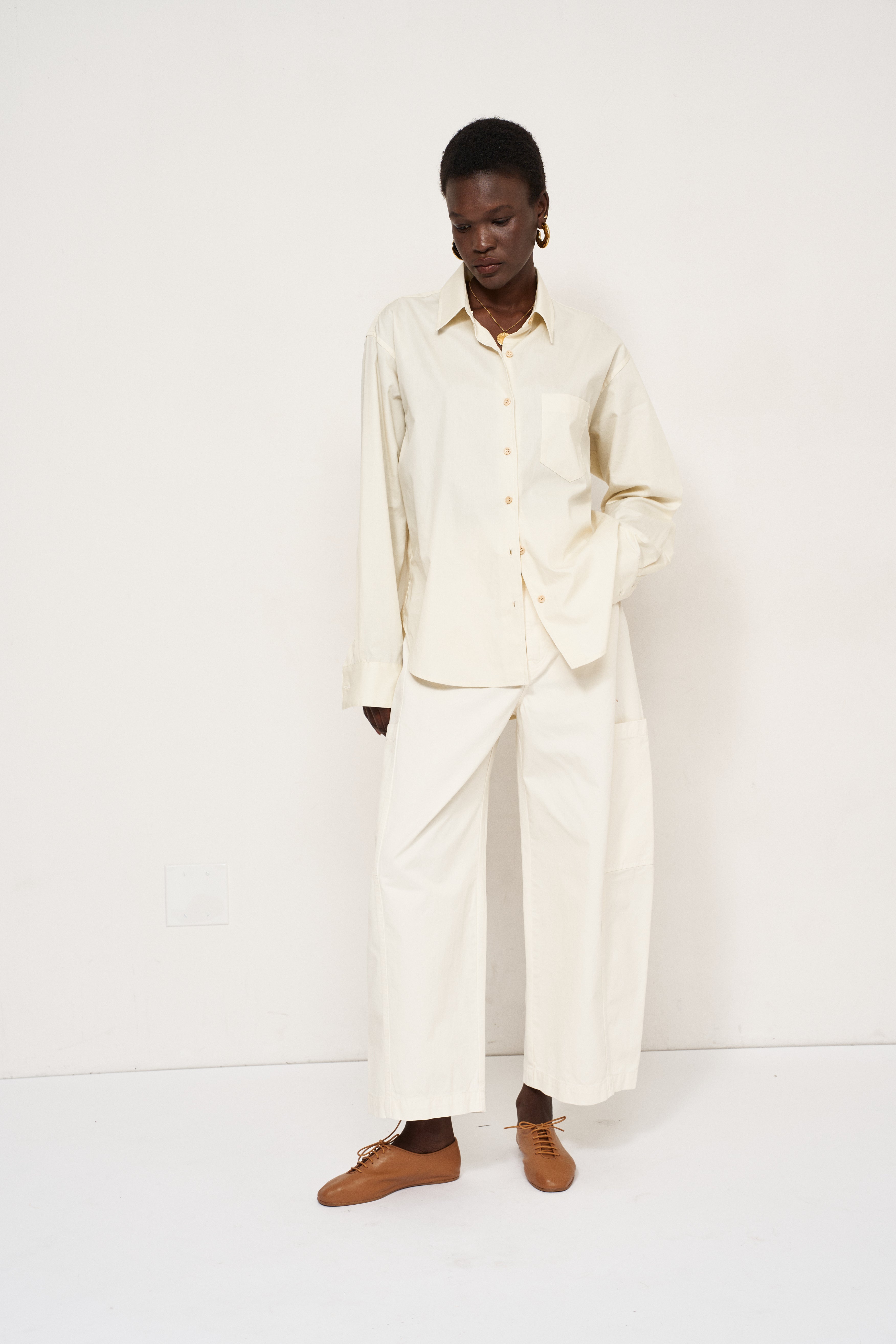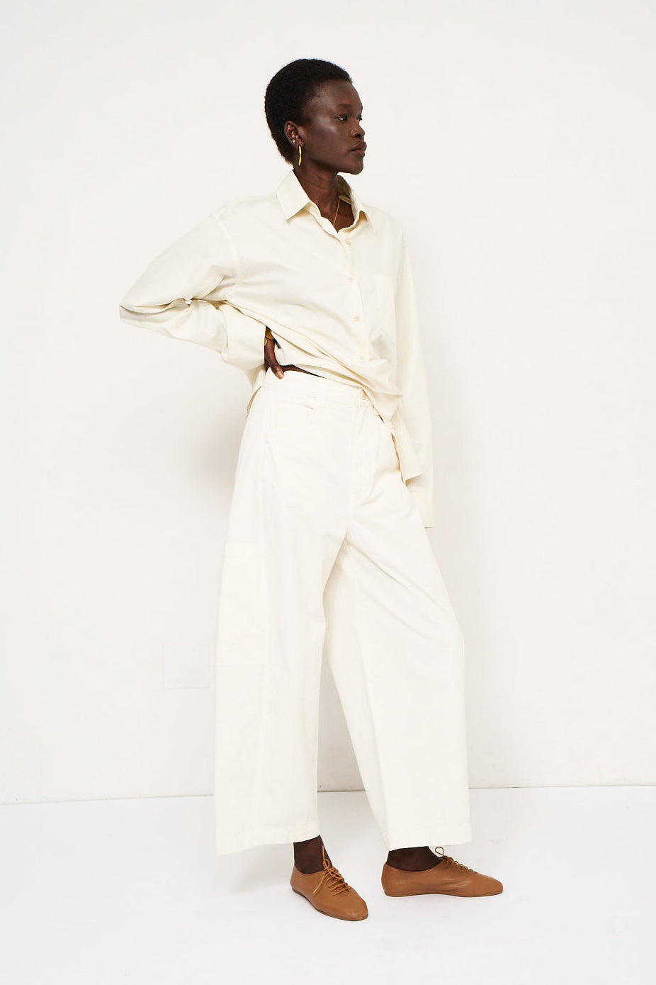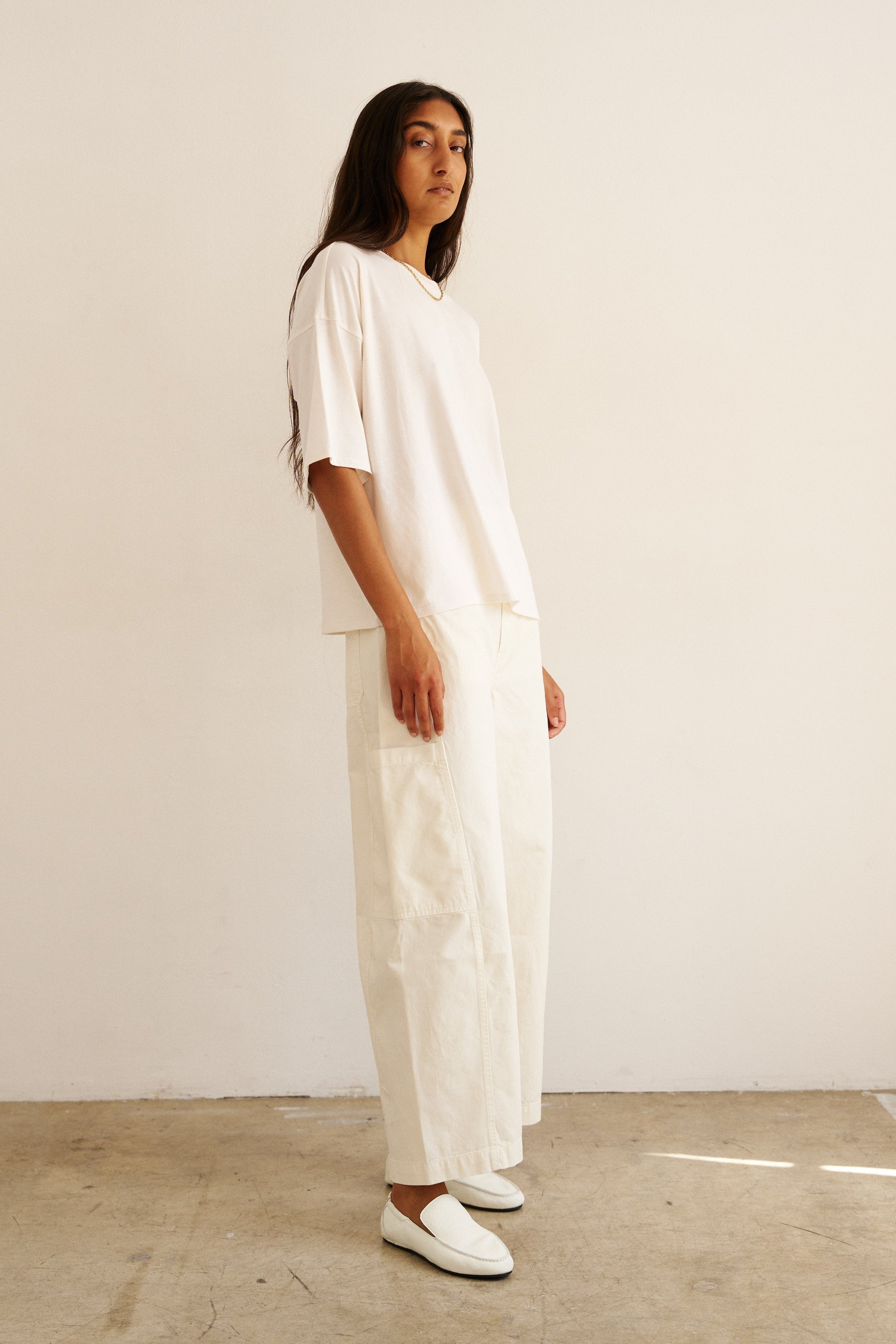 Our signature Baggy painter in a fresh spring crop. The architecturally sculpted & baggy shape contrasts a natural fit waist. Inset patch pockets are functional and inspired by chic house painters. Form meets function in a forward silhouette with a casual feel.