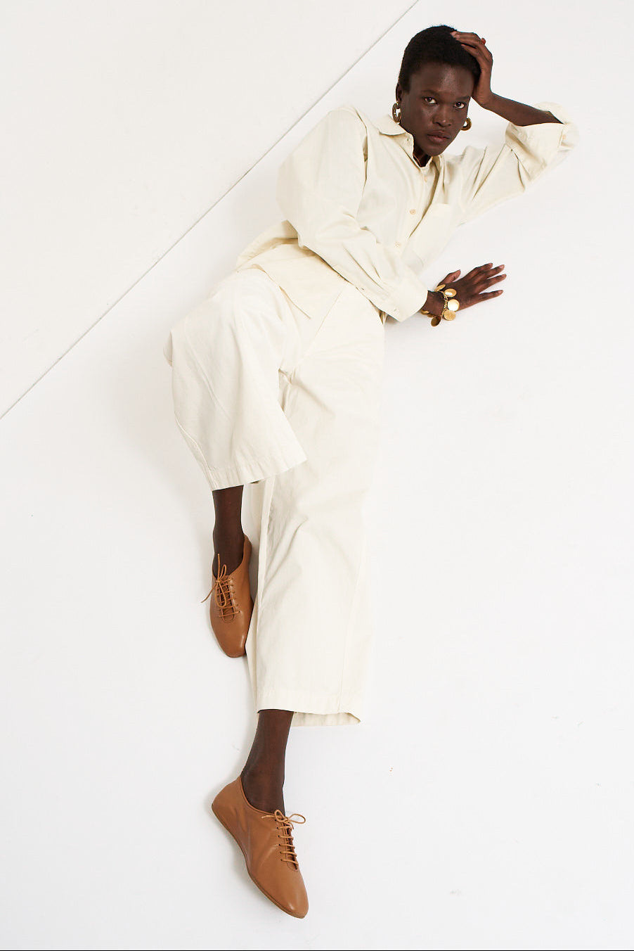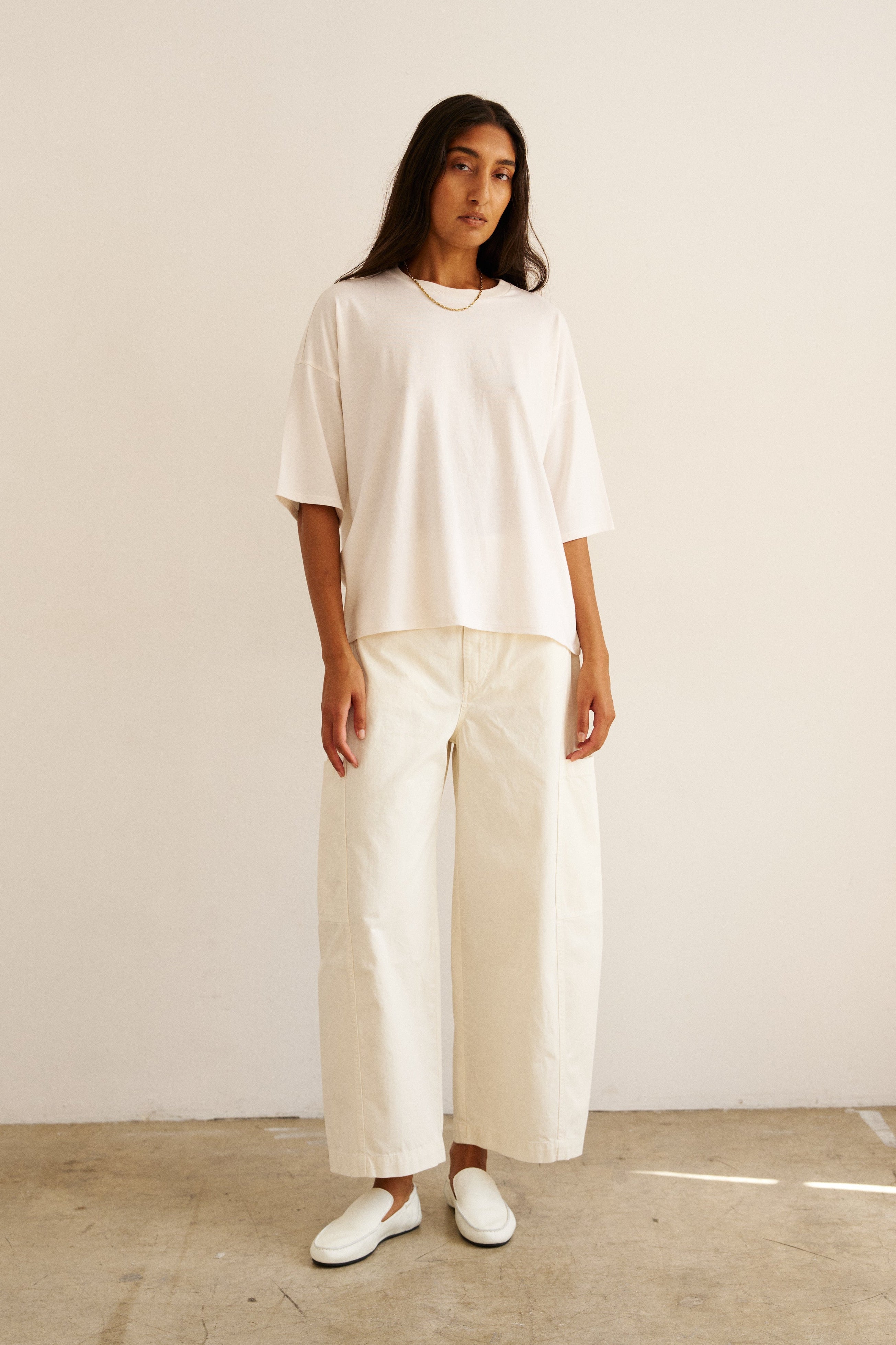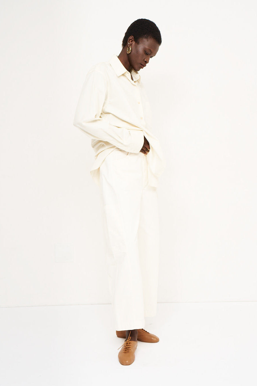 Our signature Baggy painter in a fresh spring crop. The architecturally sculpted & baggy shape contrasts a natural fit waist. Inset patch pockets are functional and inspired by chic house painters. Form meets function in a forward silhouette with a casual feel.