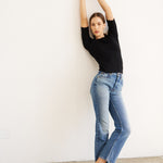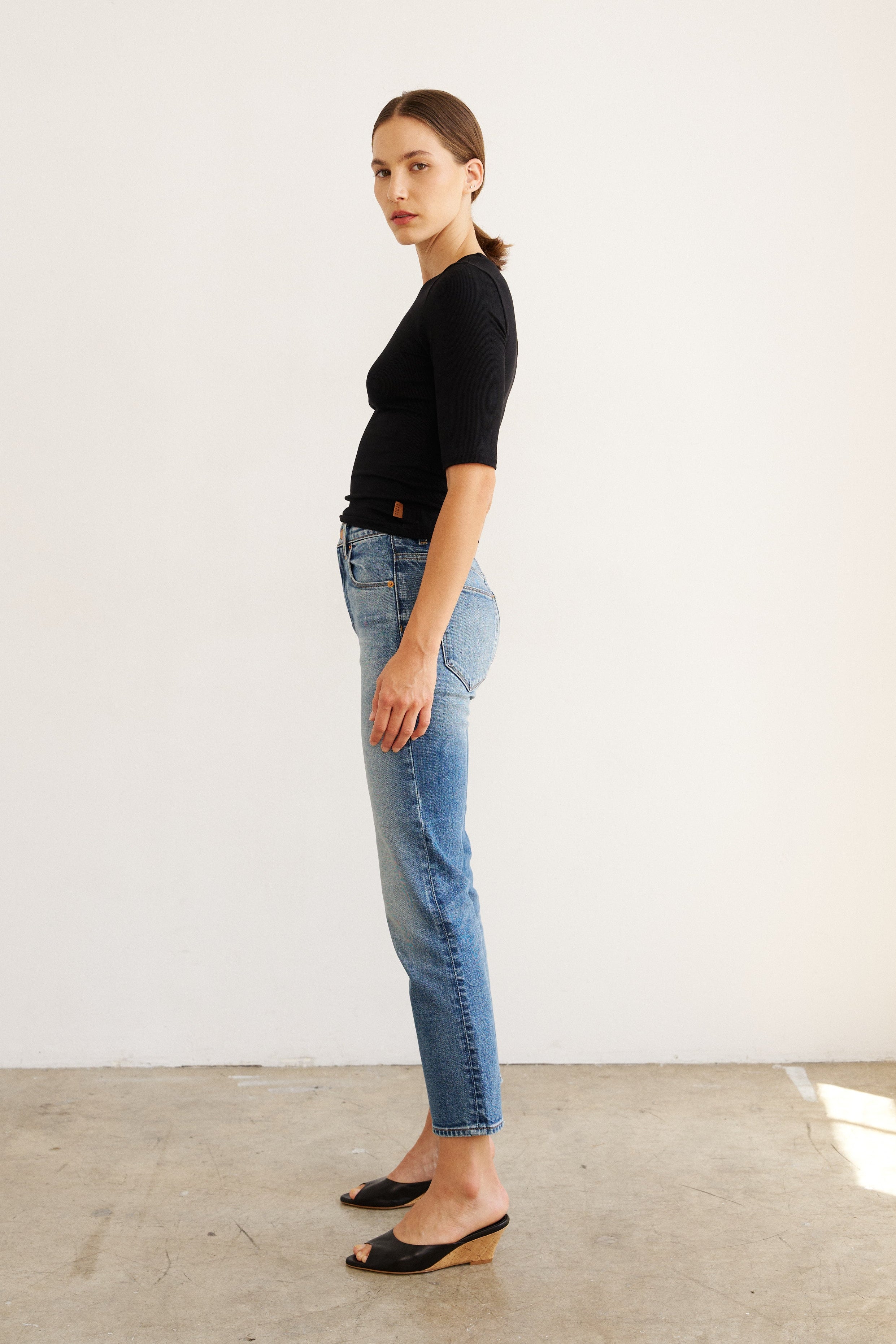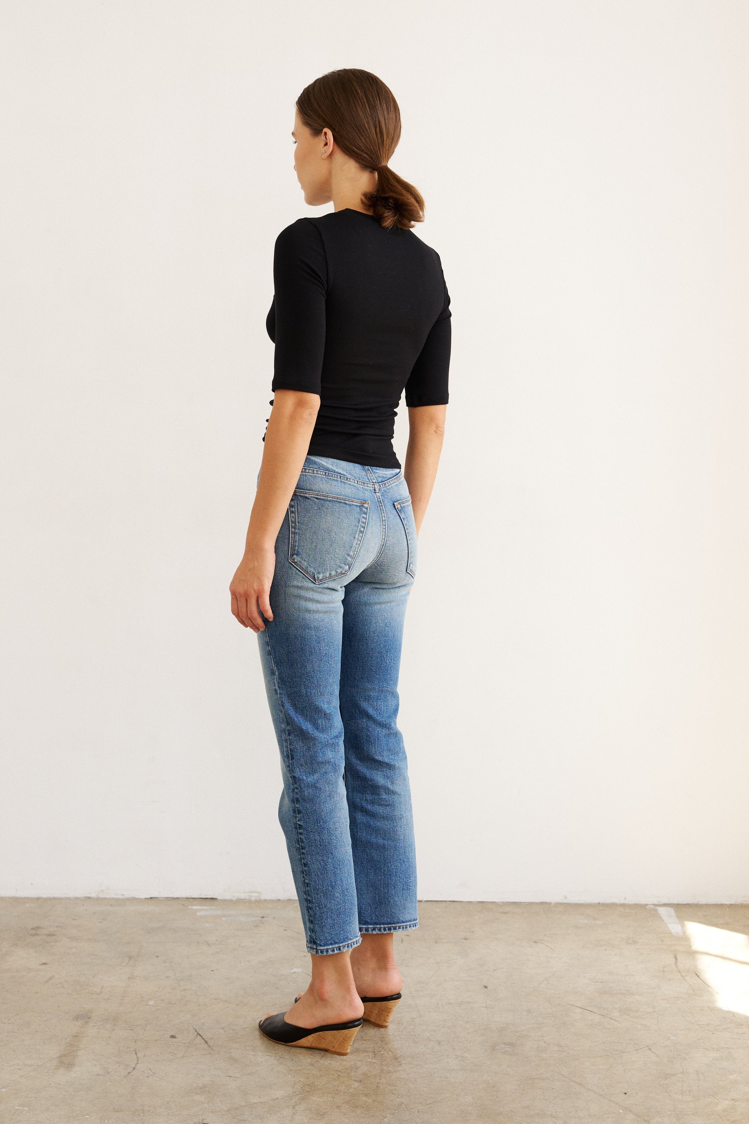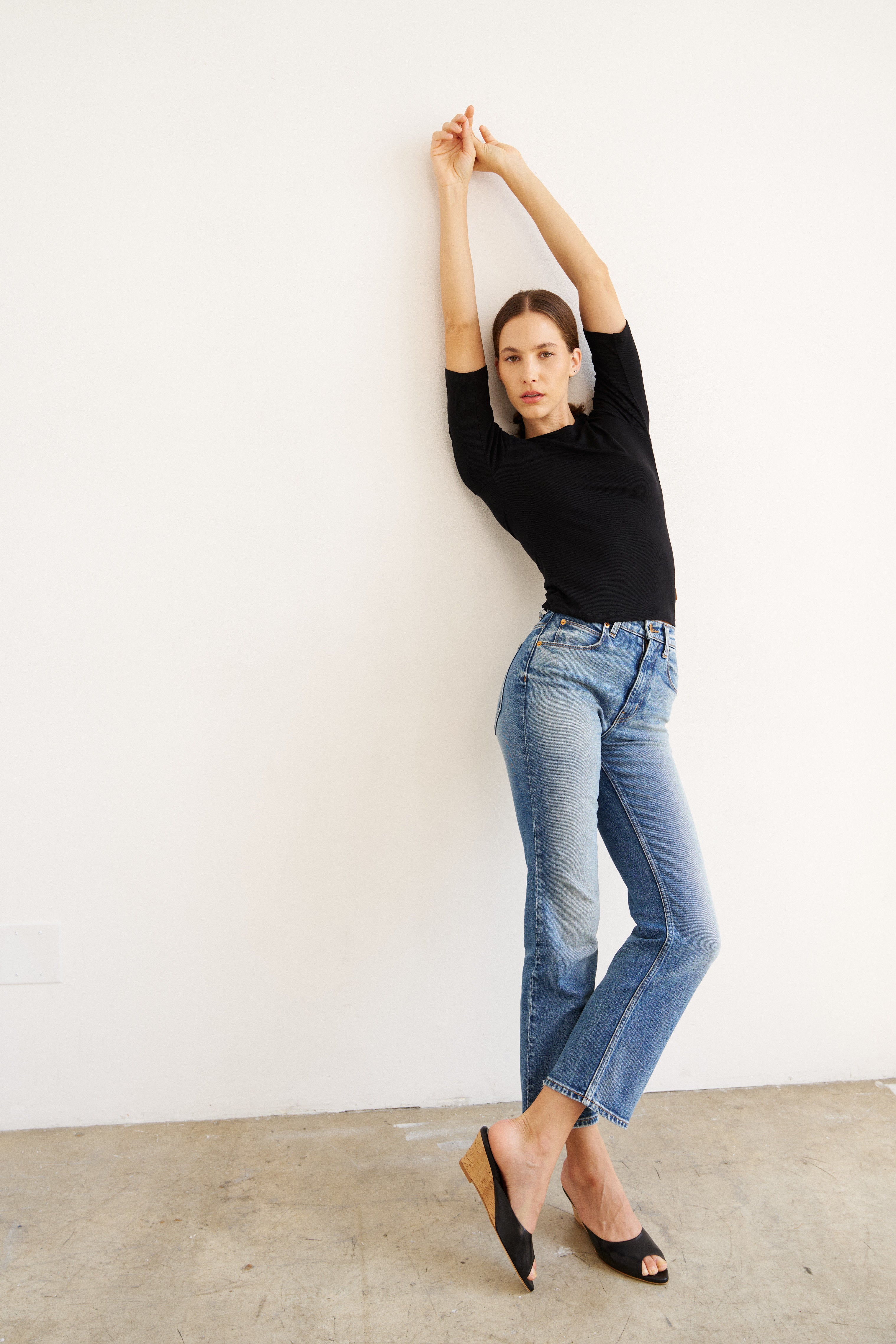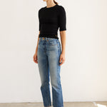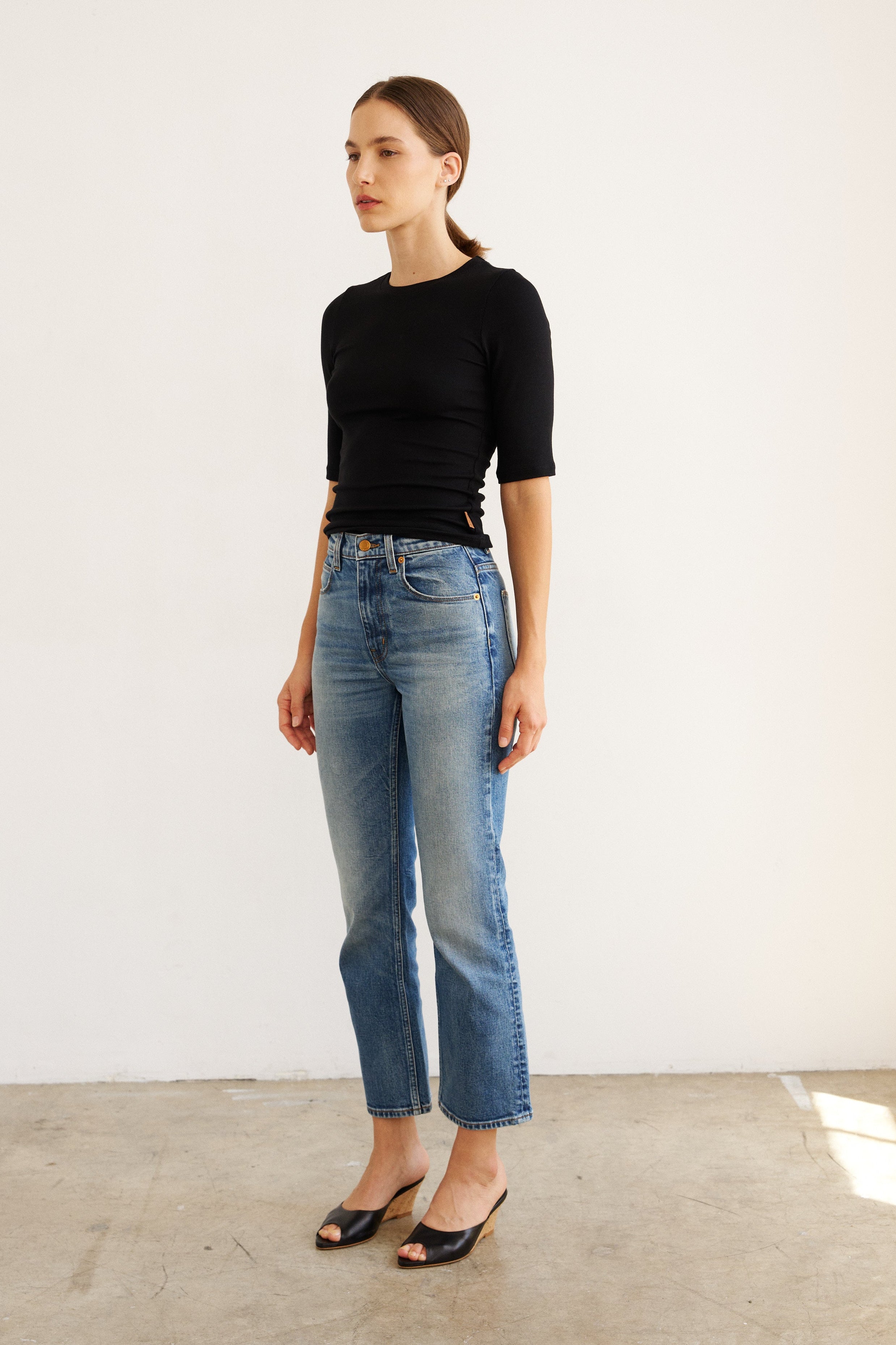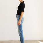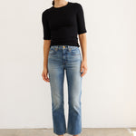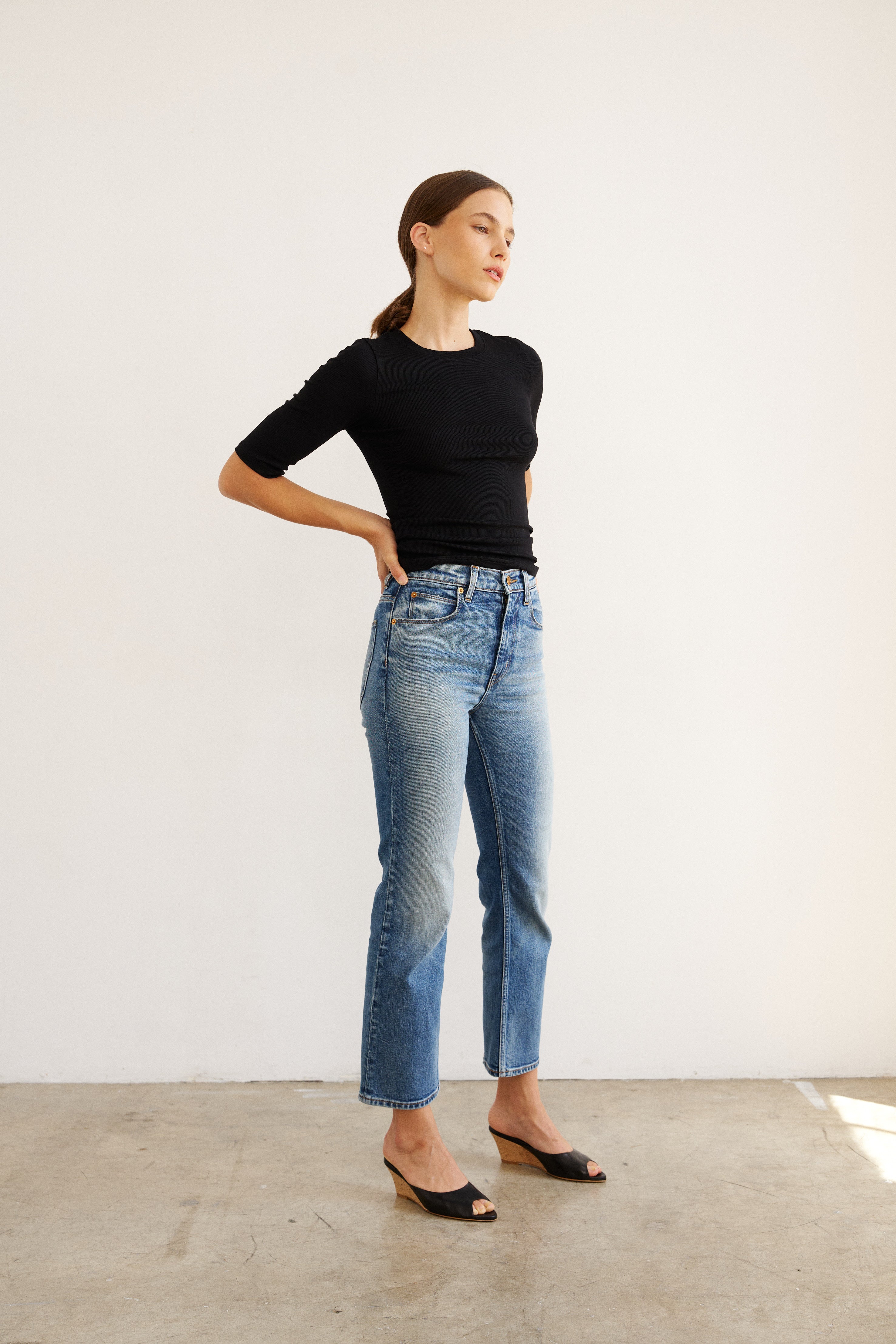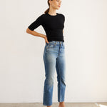 An iconic, high-mid rise, ankle length jean, The Kenickie Jean is the perfect shoe show off jean. A sliver of ankle is exposed with it's 28” inseam. A straight seam at the hips slims the front view. We shifted the side seams forward just a little to create a narrow shape. We put the curves at the back and angle the pockets to create shape and lift at the butt. It’s an architecture of denim.