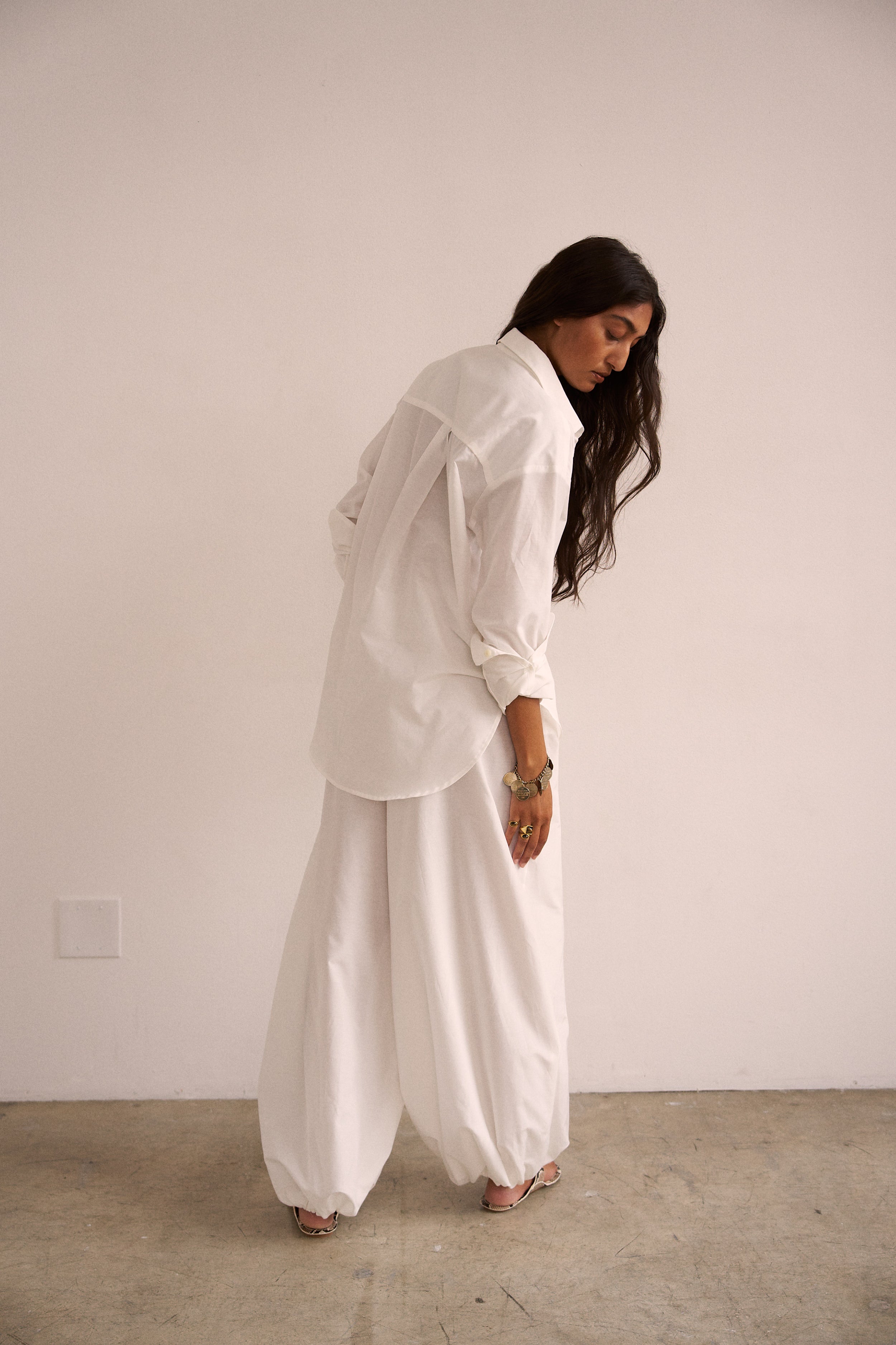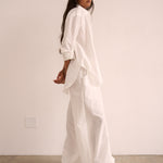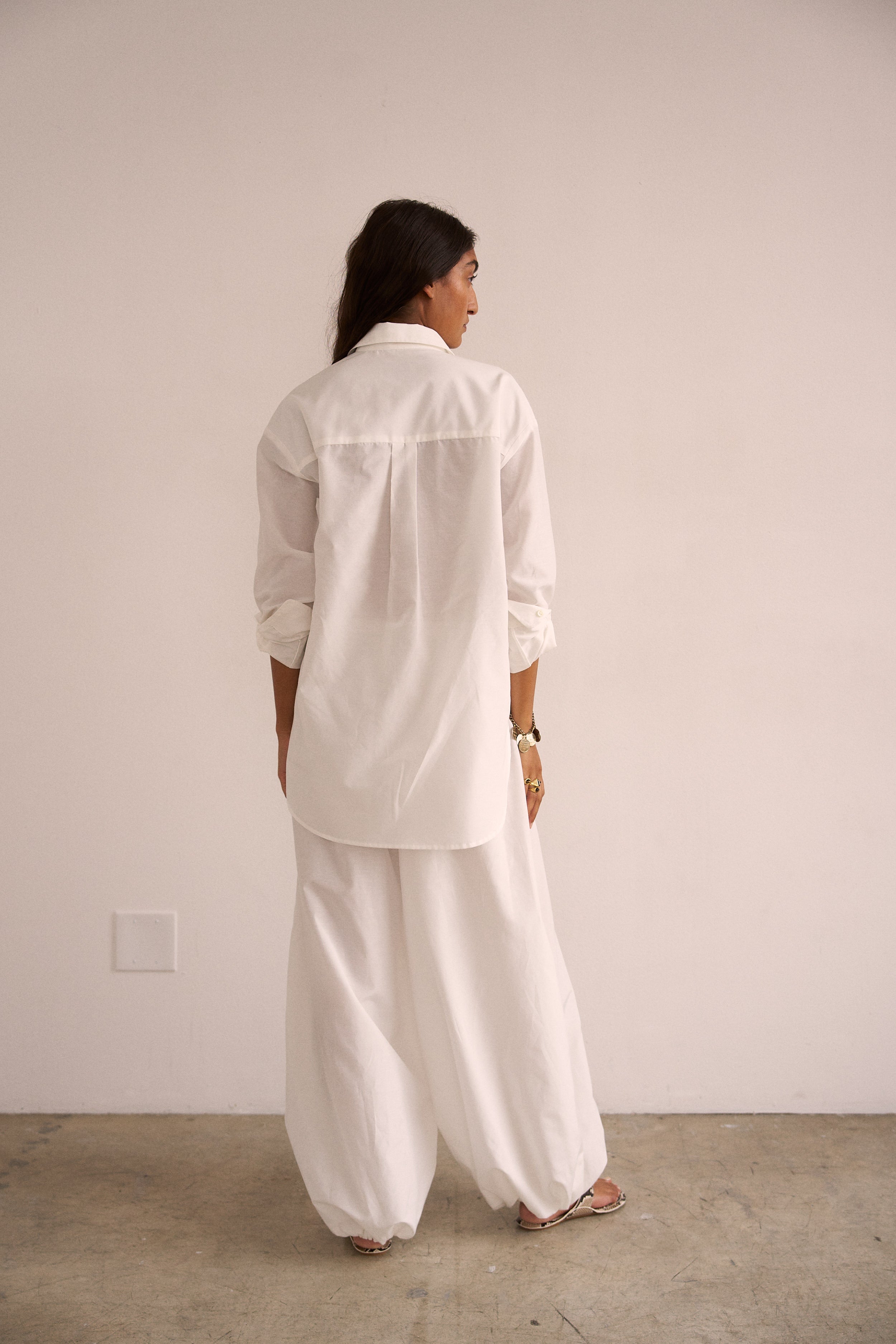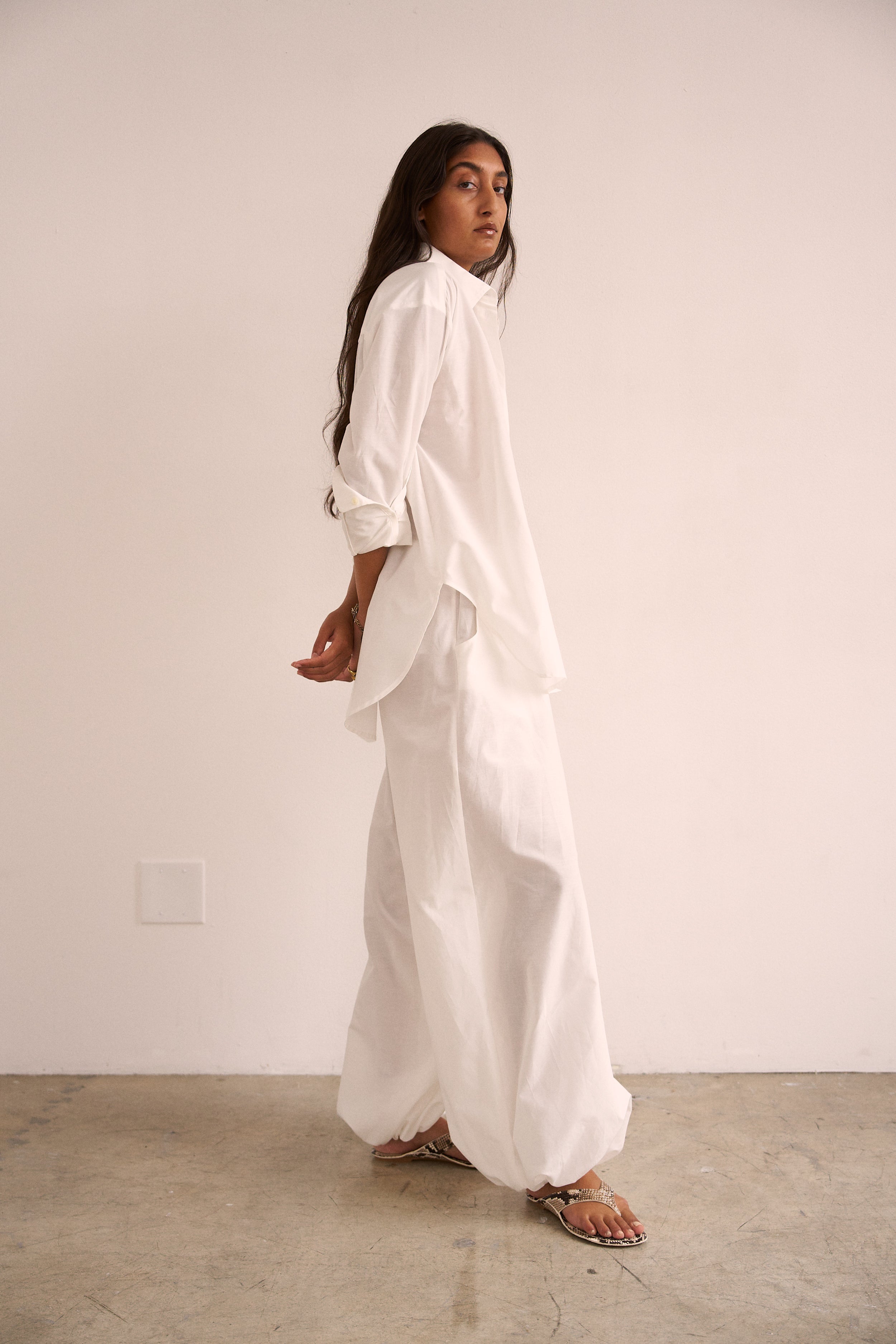 Playing with sheerness and volume, the elastic waist Balloon pant is an pull on pant with extreme volume and sexy vulnerability. Perfect to pair with the Essential blouse in a breezy, barely buttoned way. Tailored in Silk Cotton. Clean front, elastic back construction.
