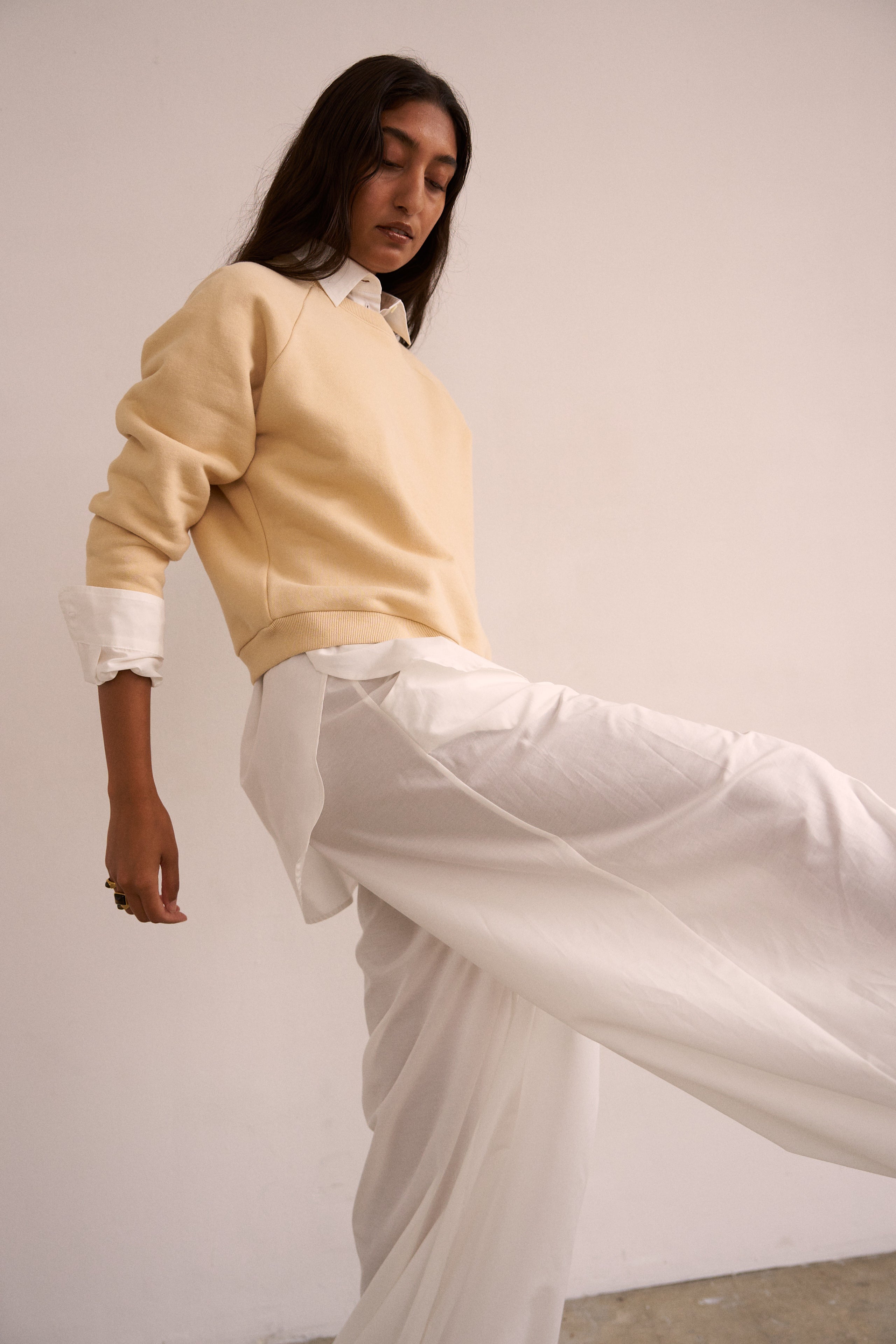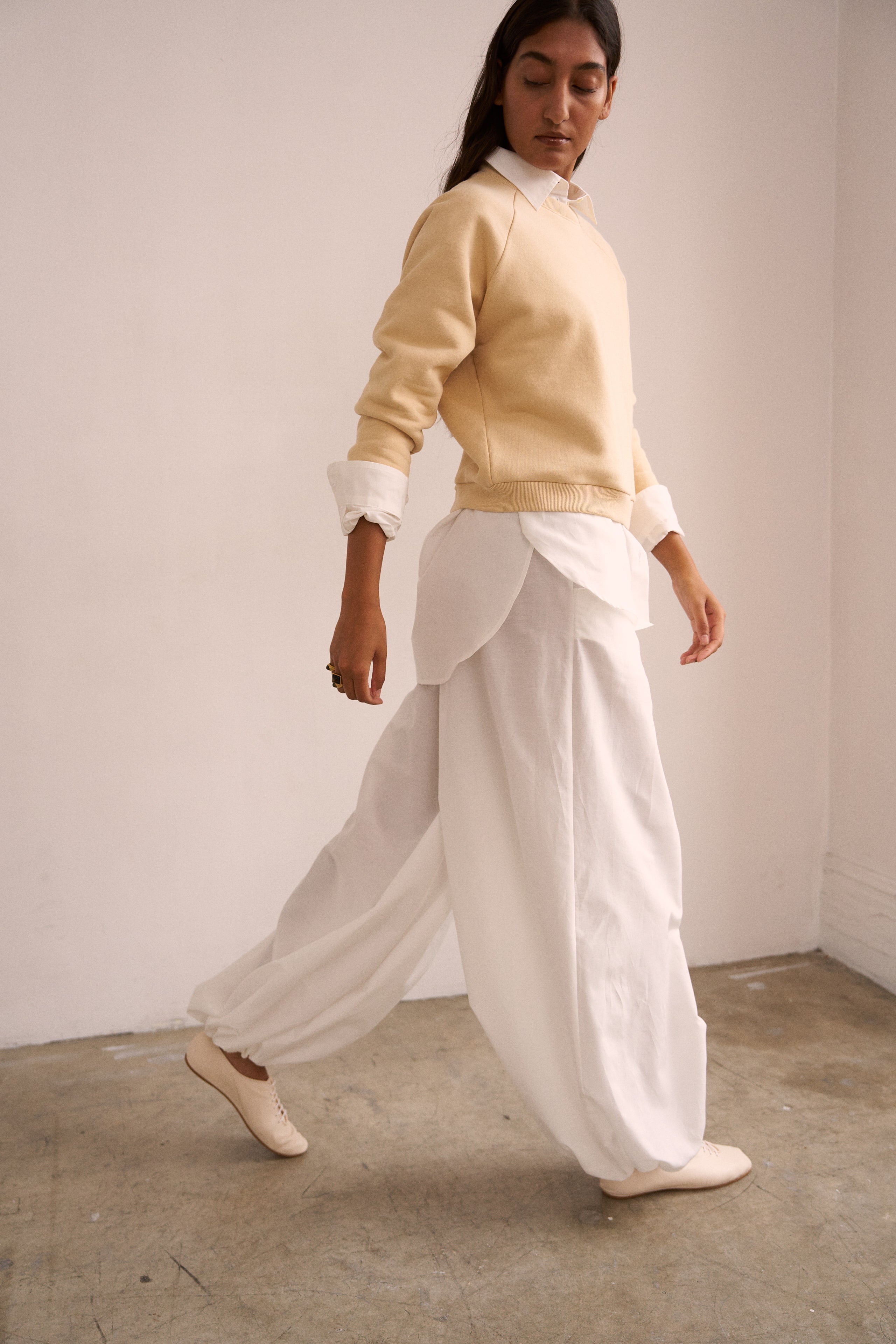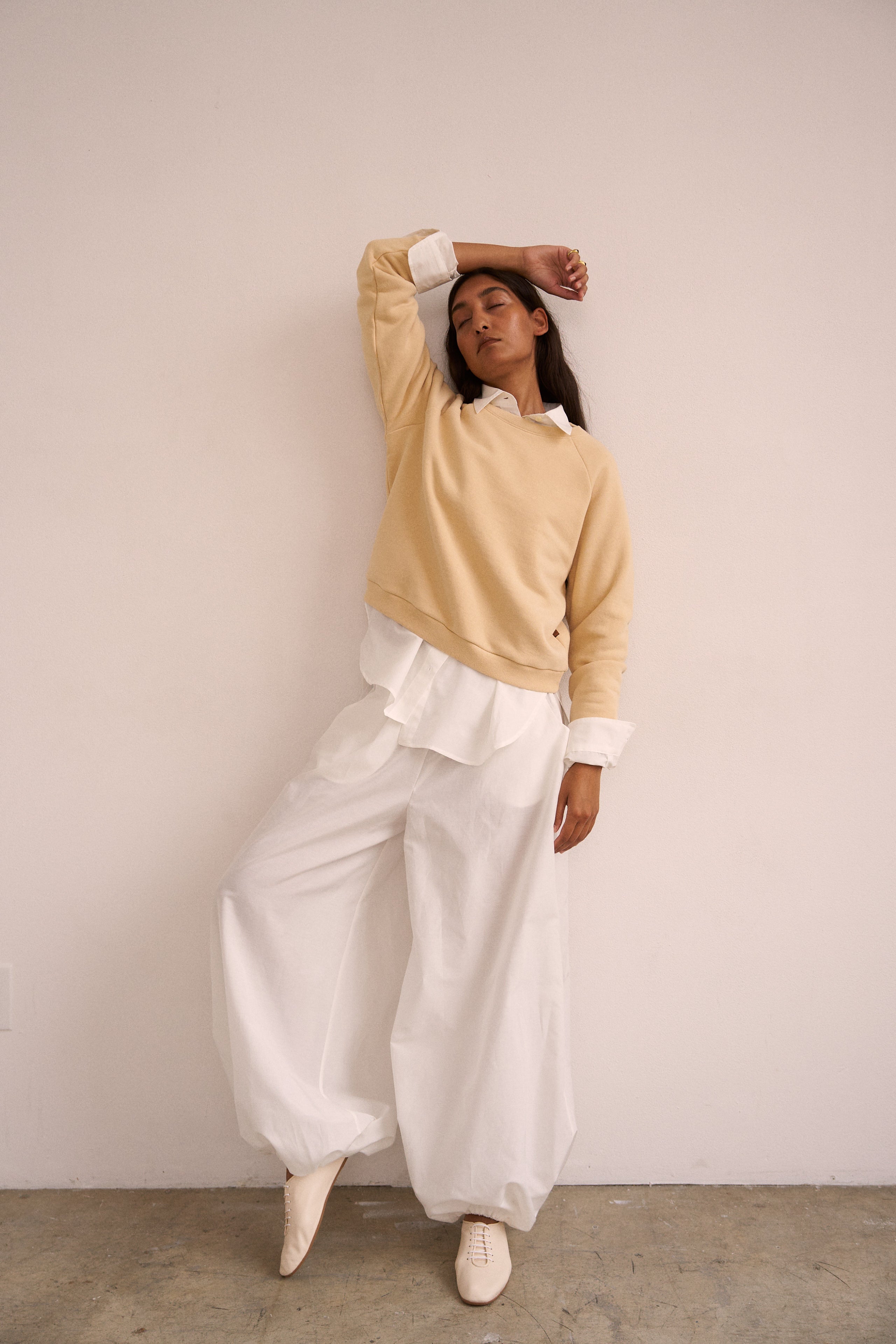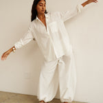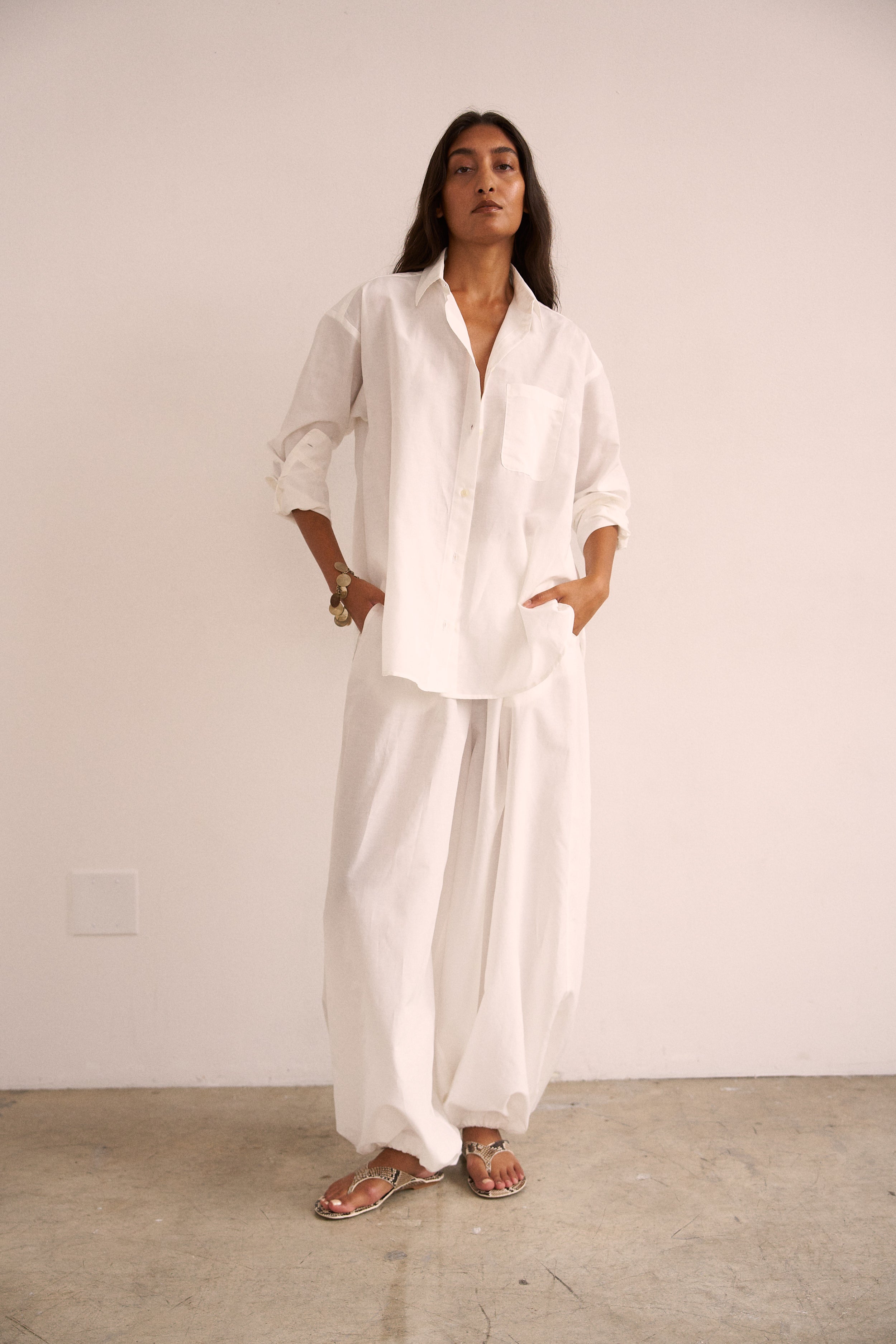 Playing with sheerness and volume, the elastic waist Balloon pant is an pull on pant with extreme volume and sexy vulnerability. Perfect to pair with the Essential blouse in a breezy, barely buttoned way. Tailored in Silk Cotton. Clean front, elastic back construction.