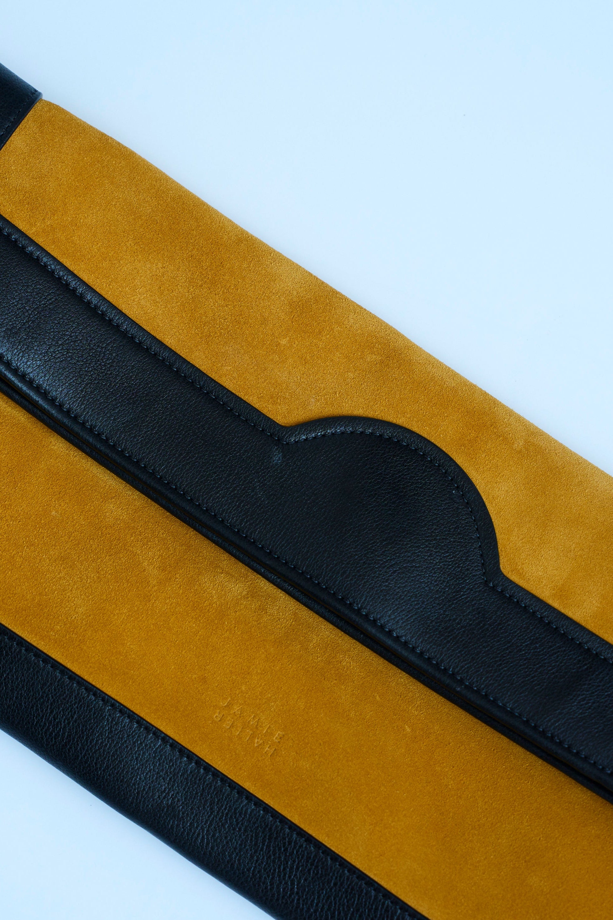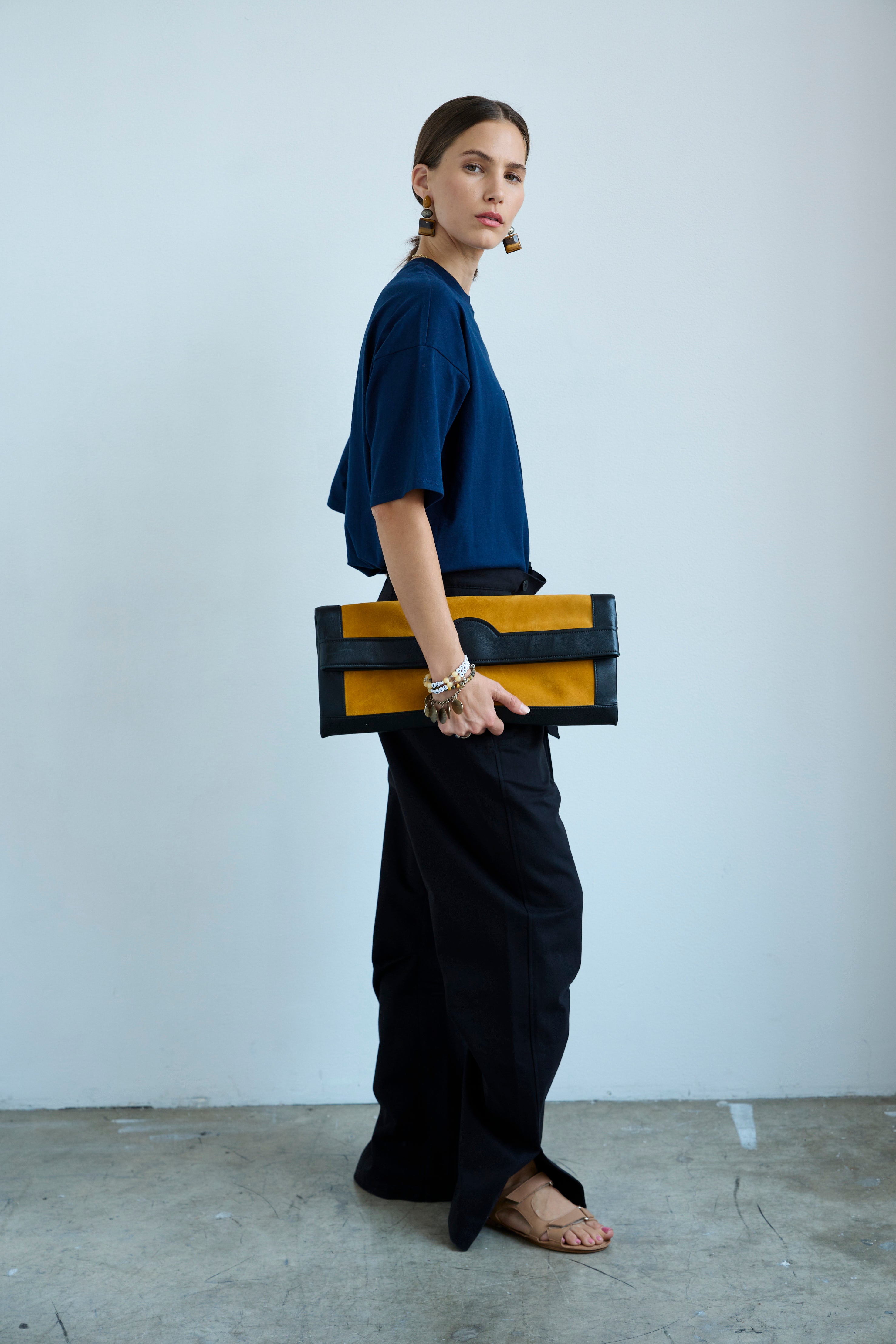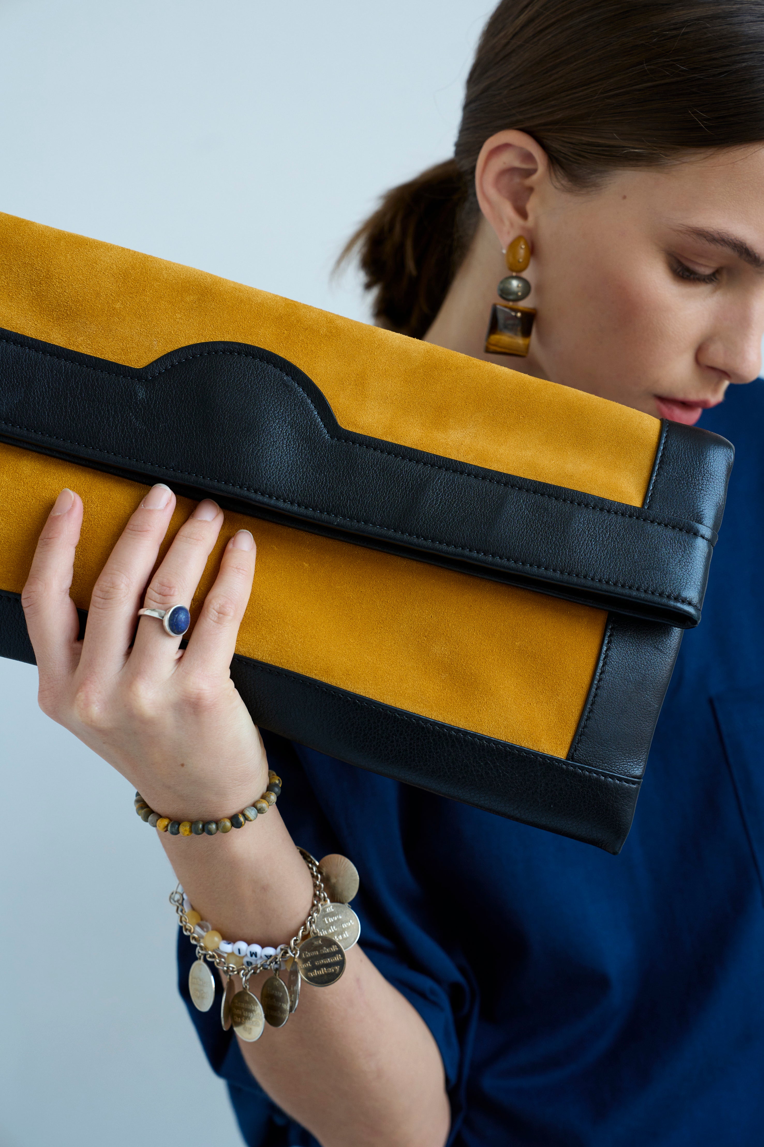 A softly structured, fold over clutch. An elongated silhouette with a sharp spirit. A deeply beautiful custom striped lining brings joy with every opening.