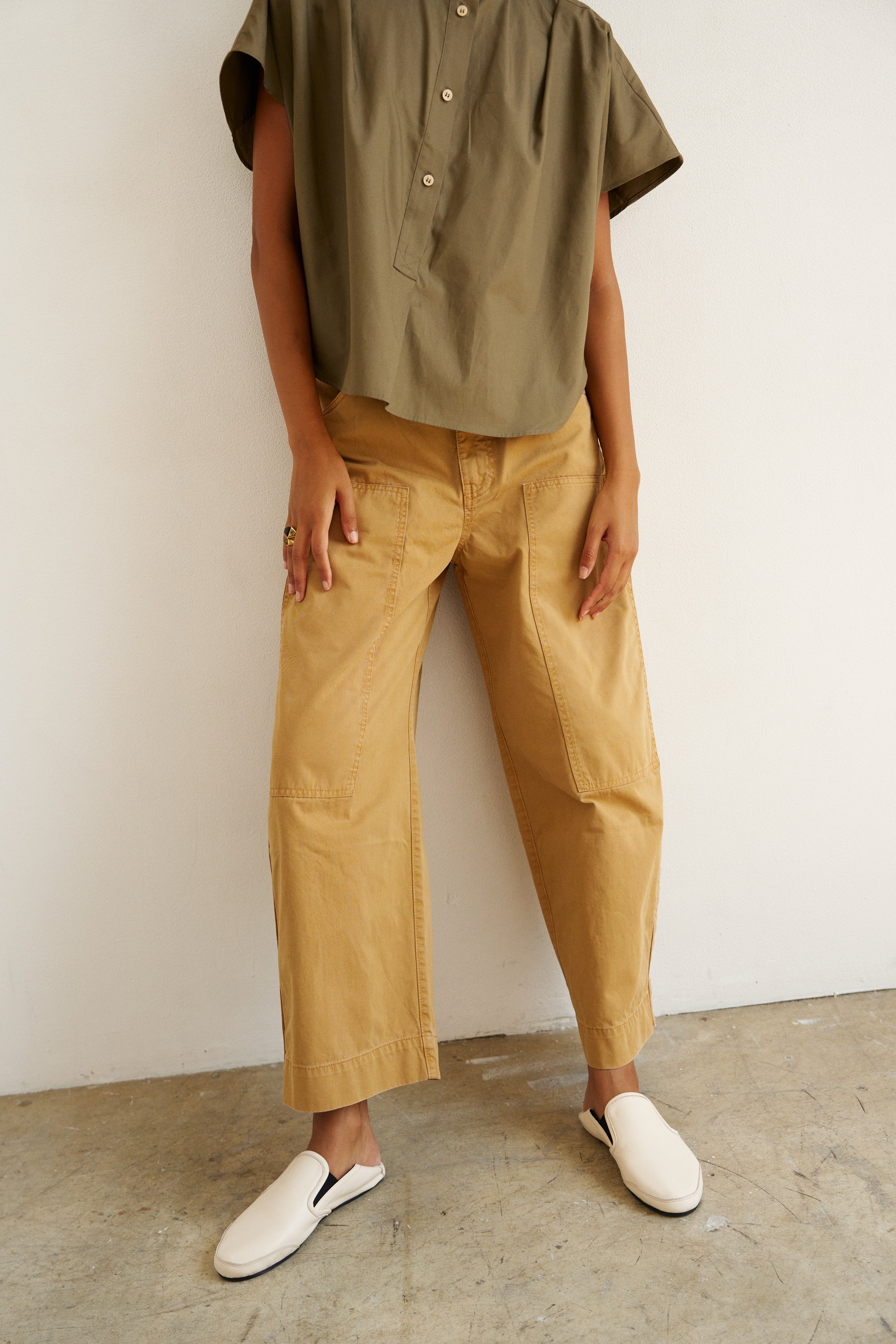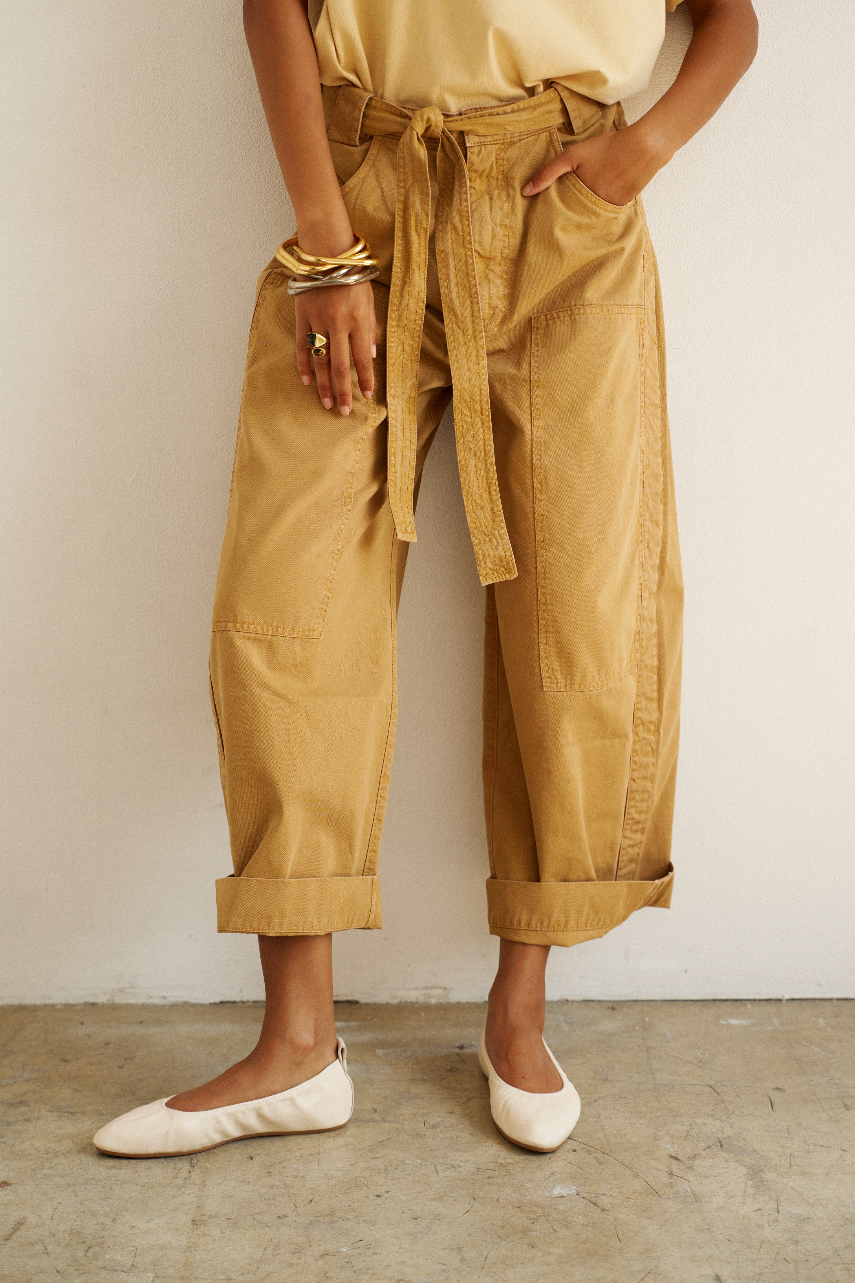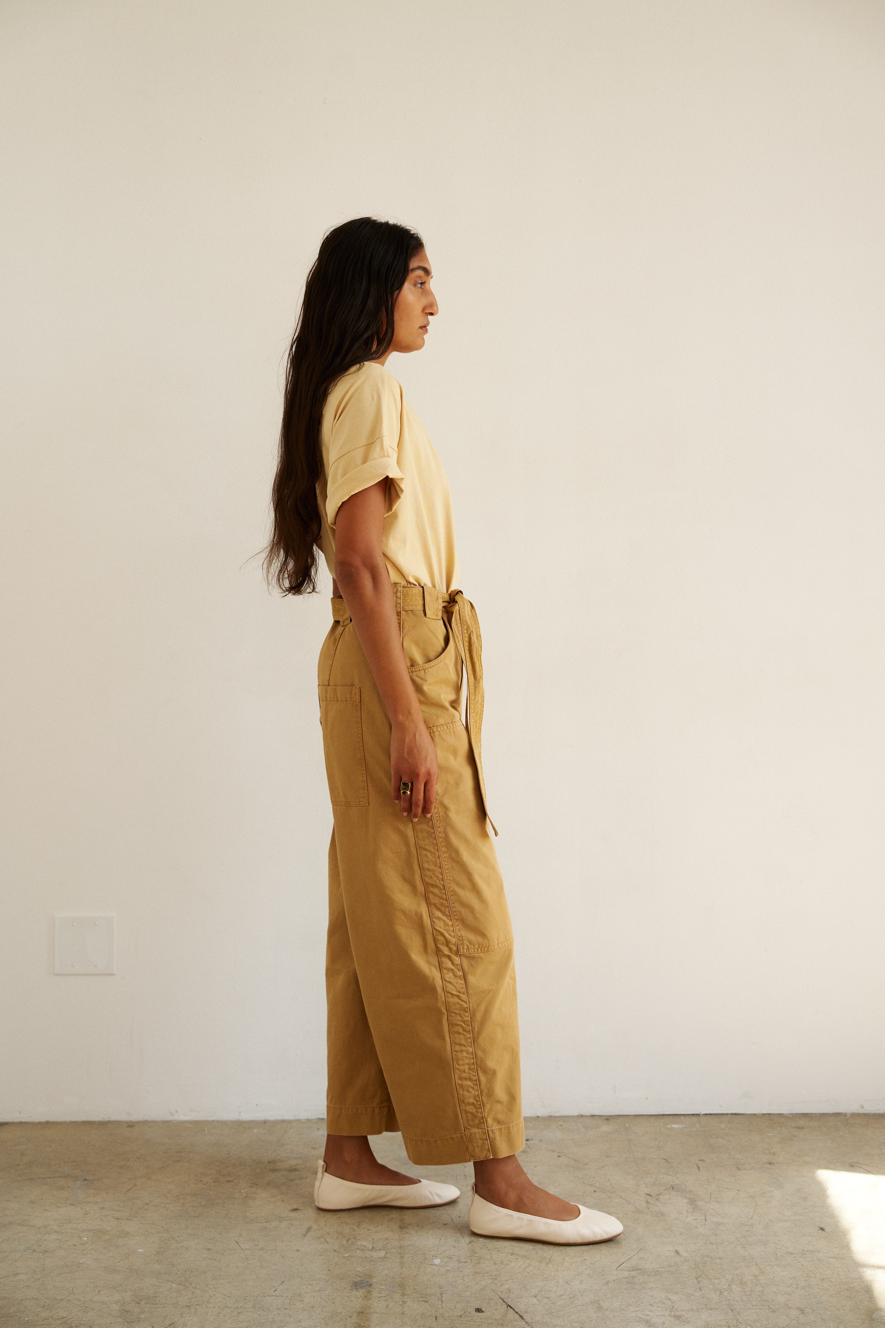 A rounded leg shape contrasts a natural fit waist. Patch forward details and Obi Inspired belt detail. A wide cropped hem at ankle length, perfect for cuffs that show off loafers. Tailored in Japanese brushed twill. Garment dyed for a soft drape, washed-in appeal and undeniable ease.