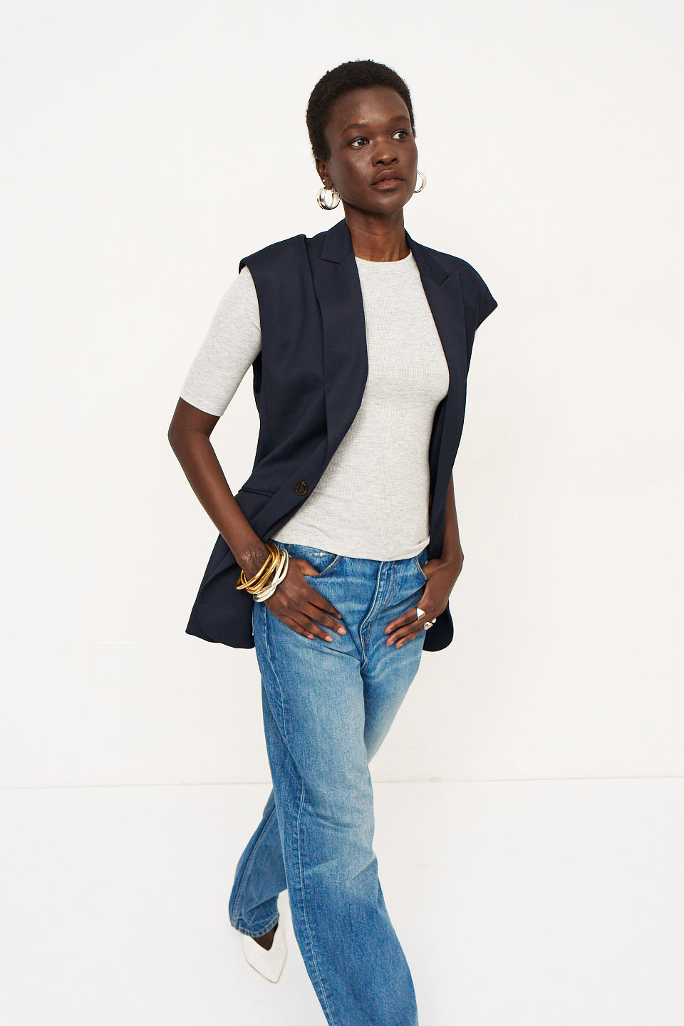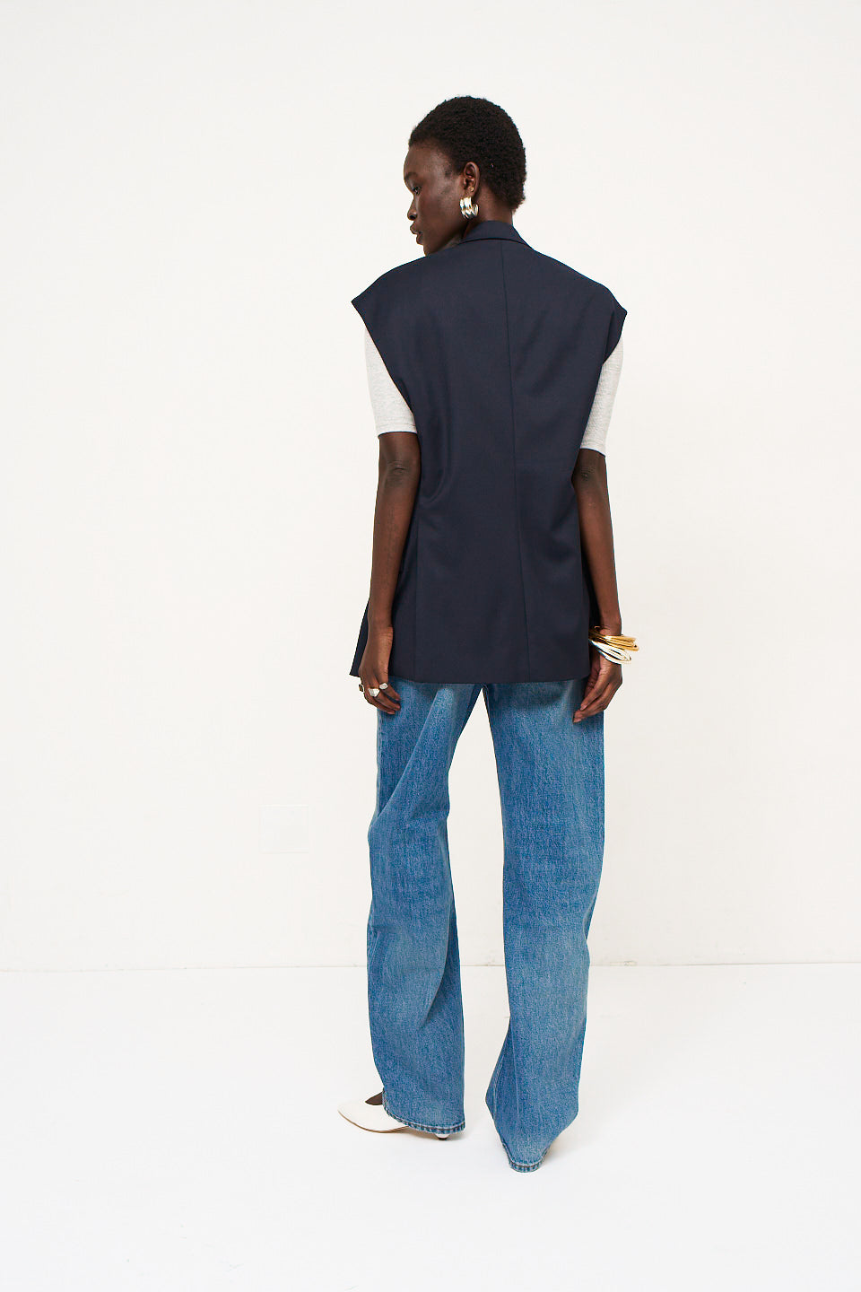 A modern and relaxed vest, classically tailored like a blazer. Fully lined with back vent and single button detail. Tailored in a tropical weight, virgin wool blend from Europe.