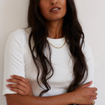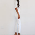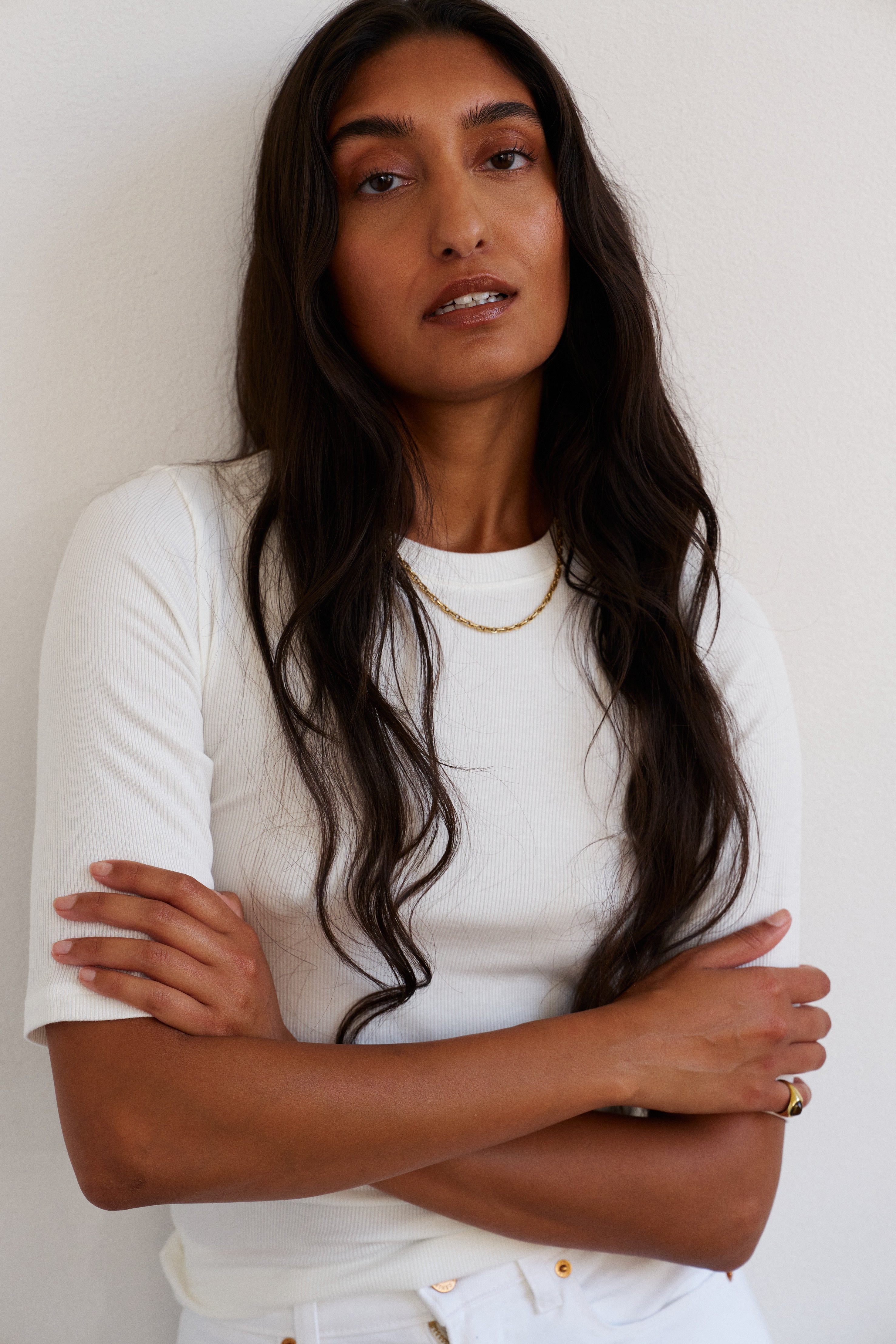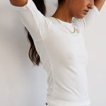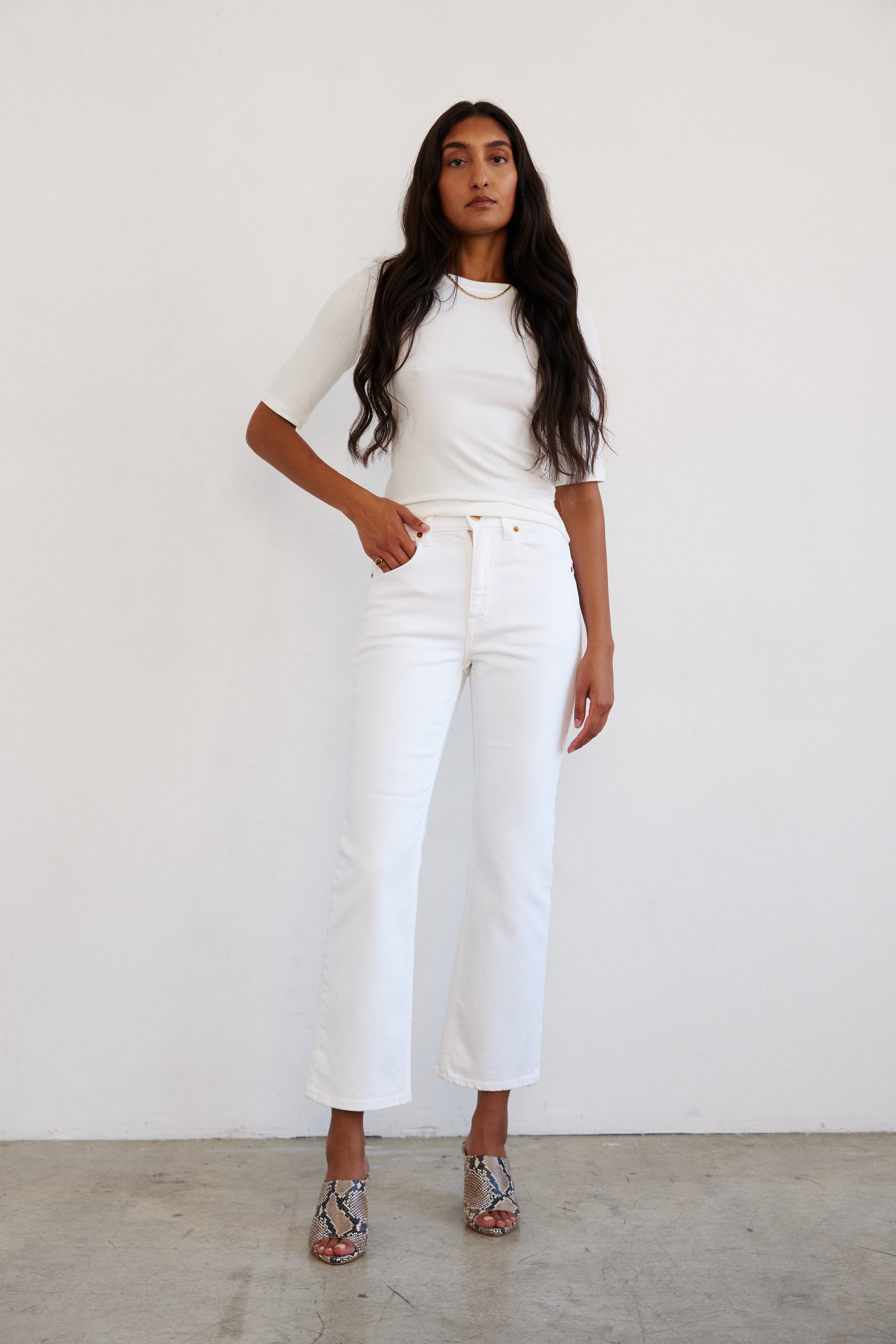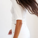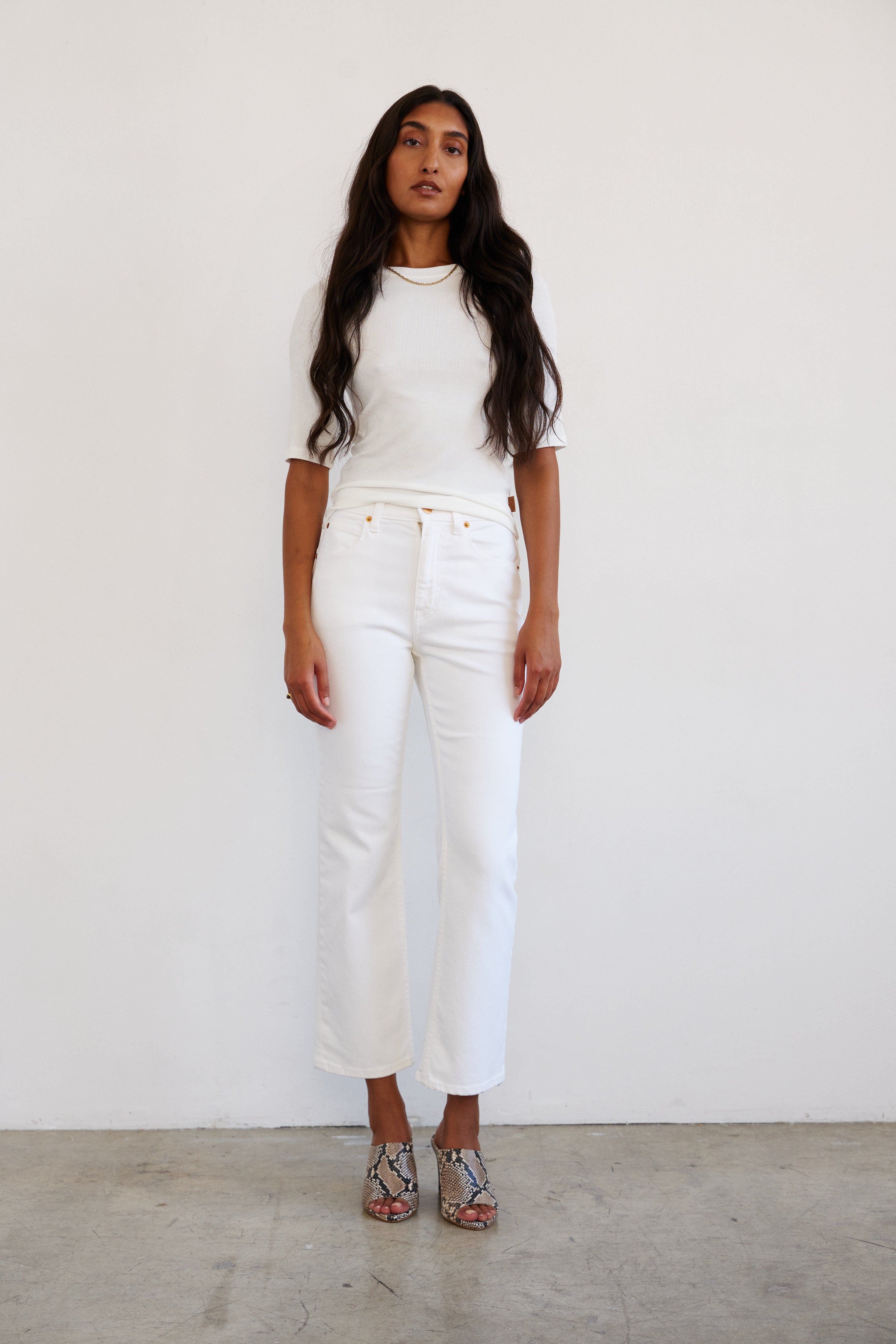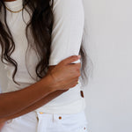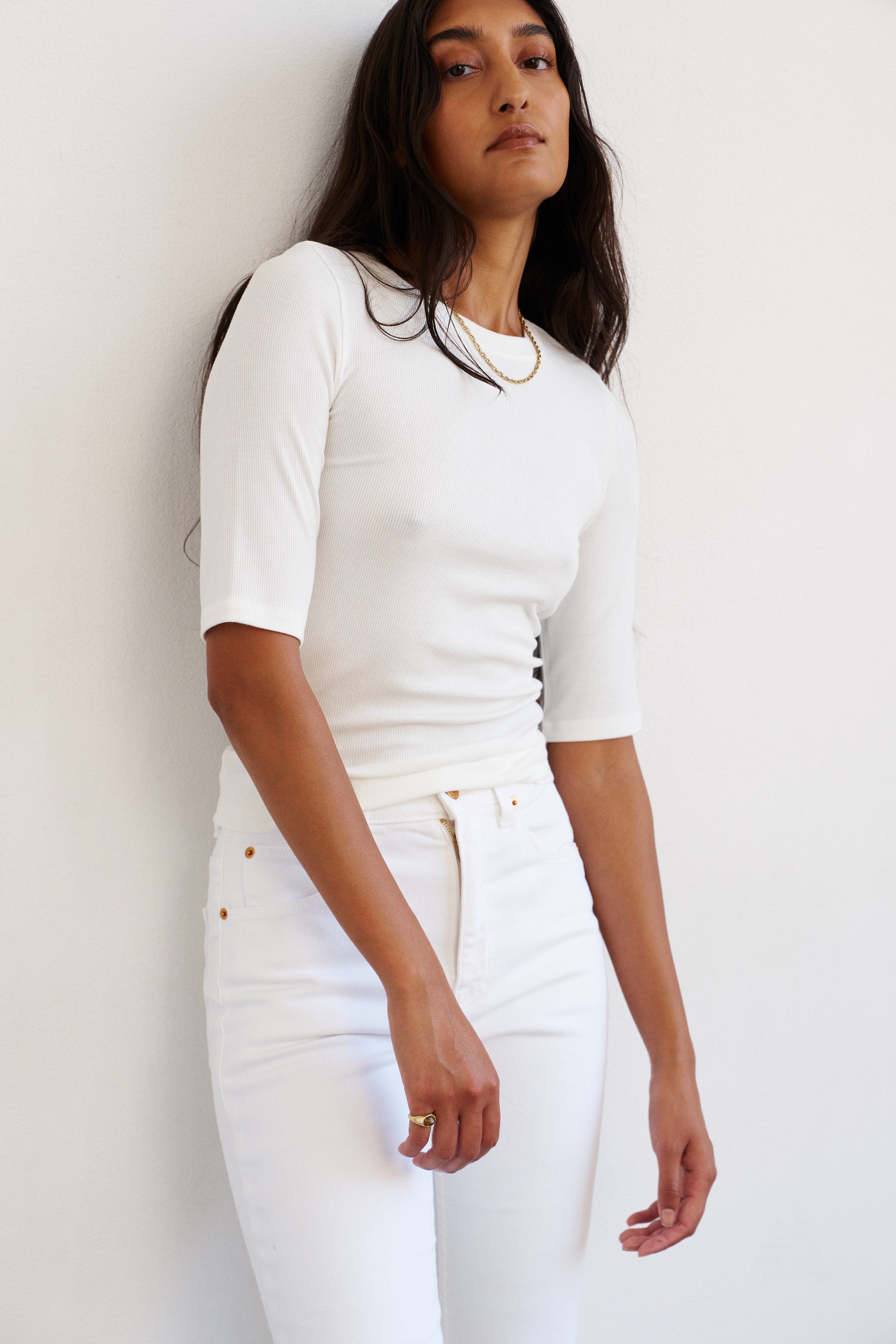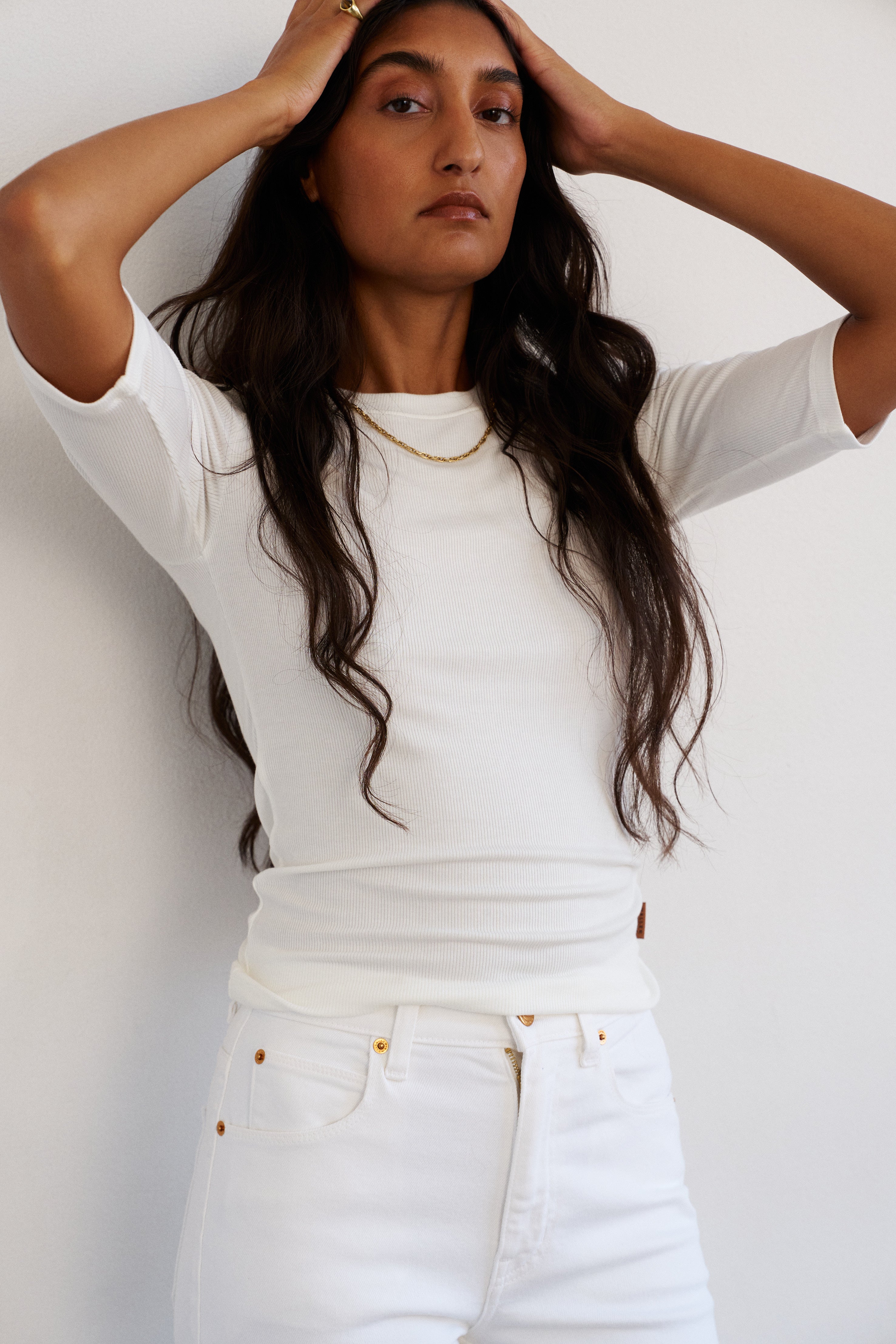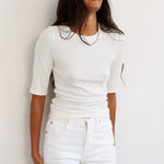 A high and tight crewneck tee in a soft silky rib. Classic and modern but with the ease of softness. Elbow length sleeves feel fresh. A layer piece that can stand alone.