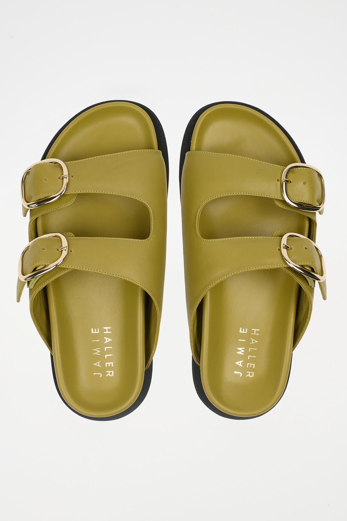 A classic! An Italian Nappa molded footbed offers light arch support and wide width perfection. An extended rubber bumper sole wraps around the footbed contrasting bold beautiful color. The sole inspired by bumper cars, thus the name. A soft slide staple.