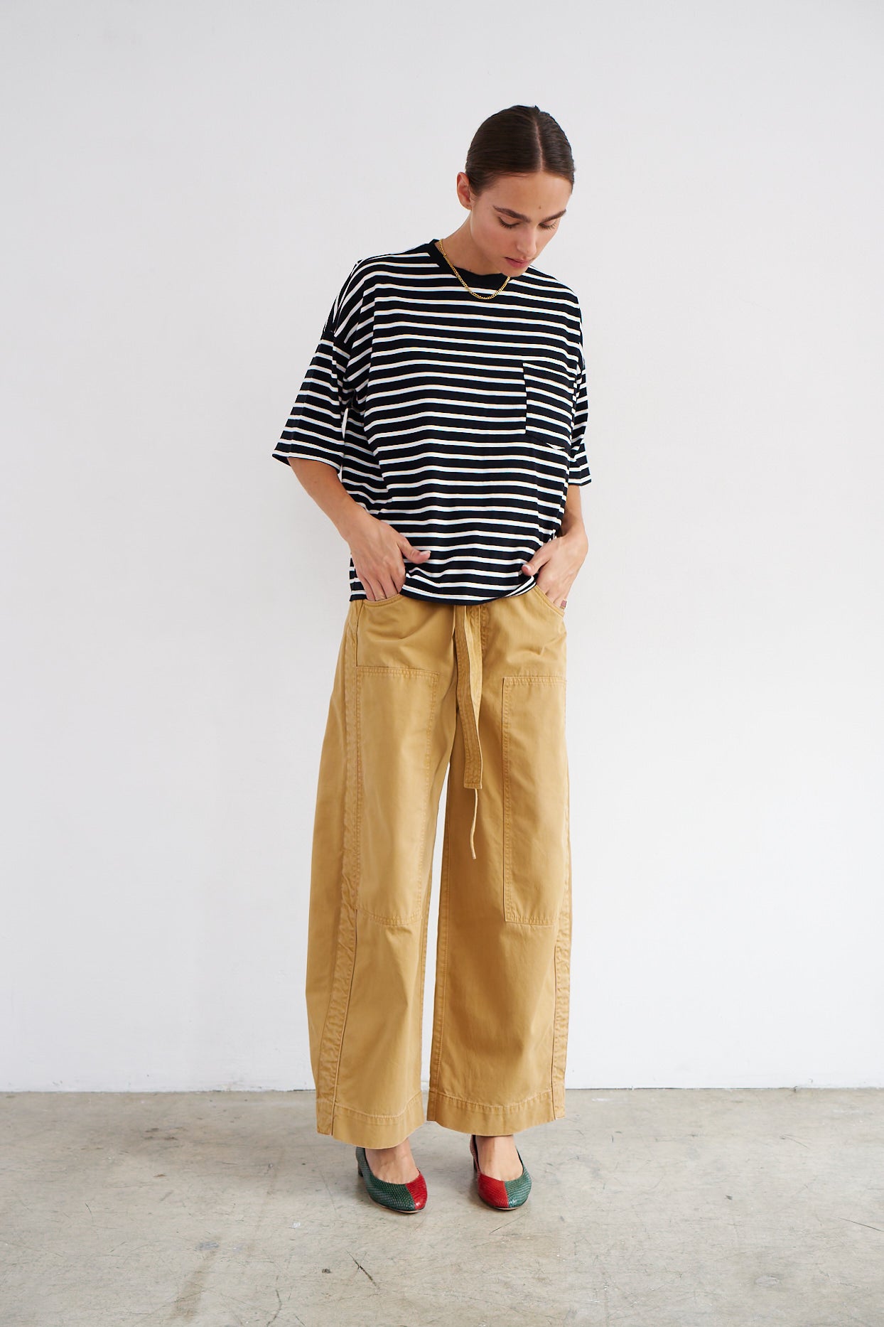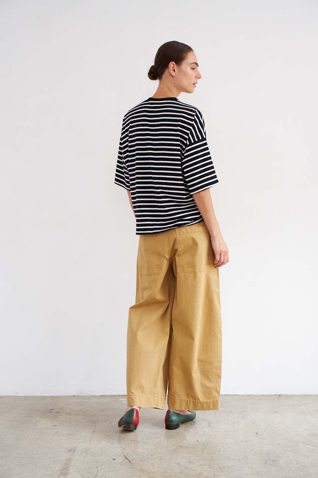A crew neck tee with a dolman inspired loose-ish fit. Boyish inspiration with feminine drape creates modern, understated, casual appeal. A boxy fit creates beautiful shape when tucked and modern structure when undone. Cut in a soft multi-ply Japanese cotton modal jersey. Piece dyed for deep color saturation and preshrunk for fit continuity.