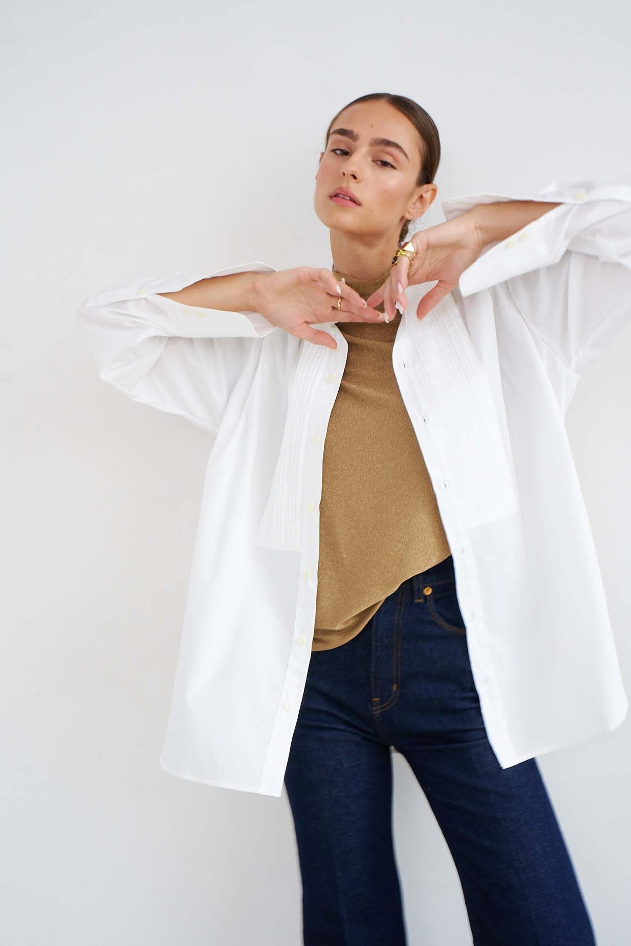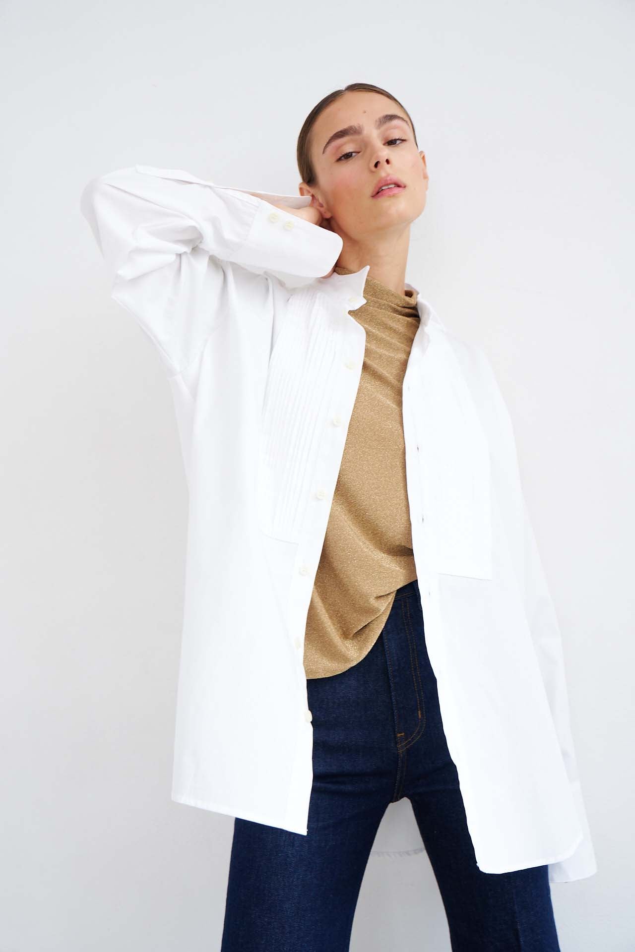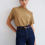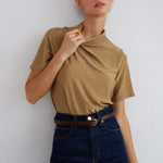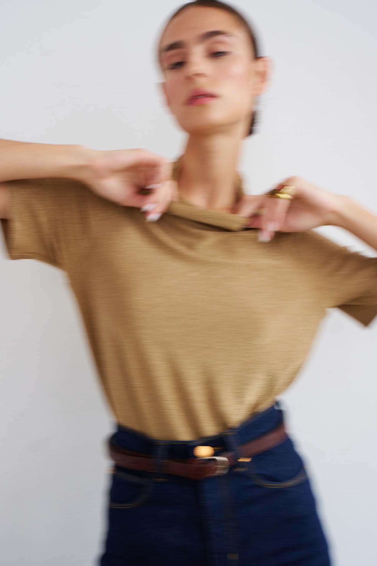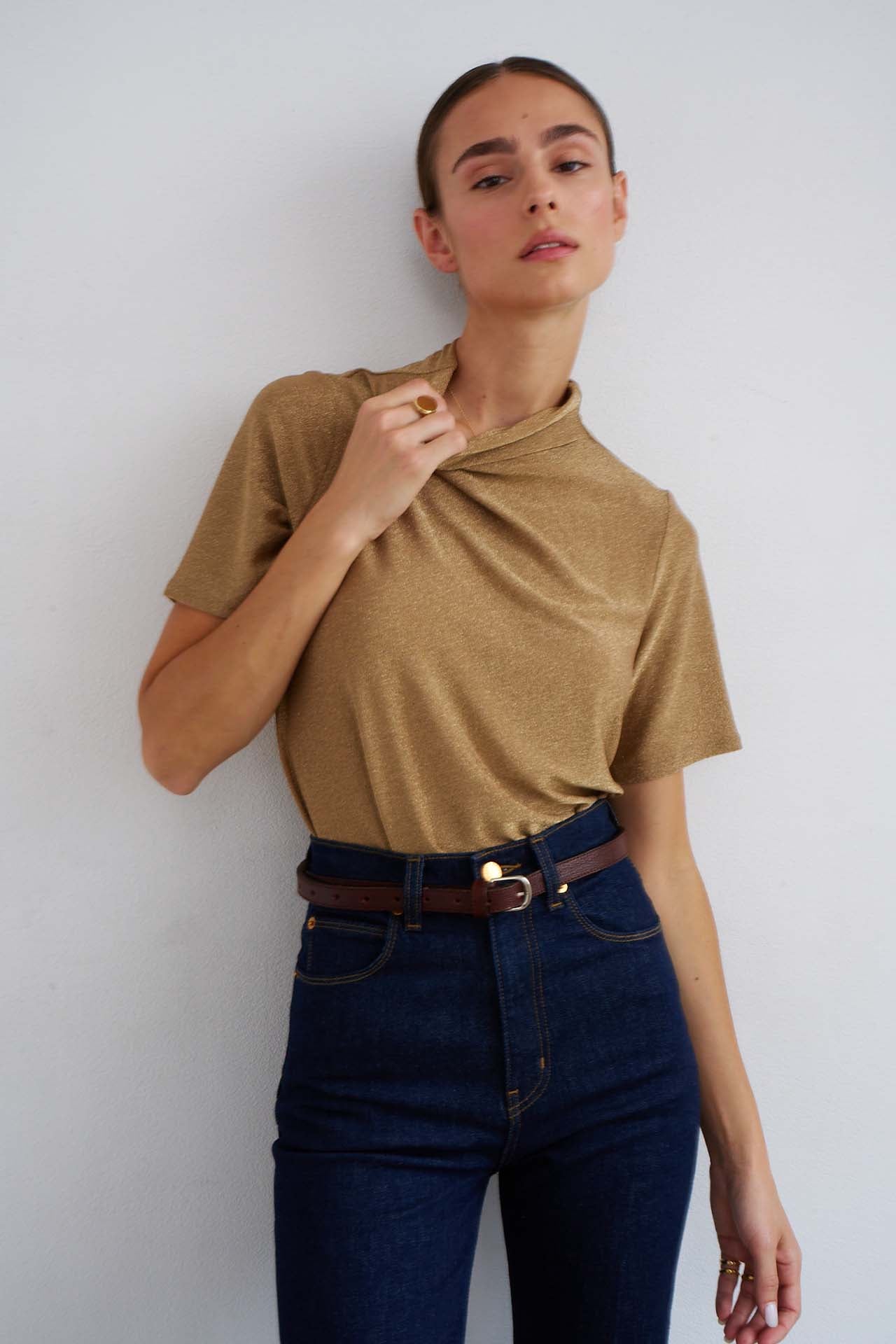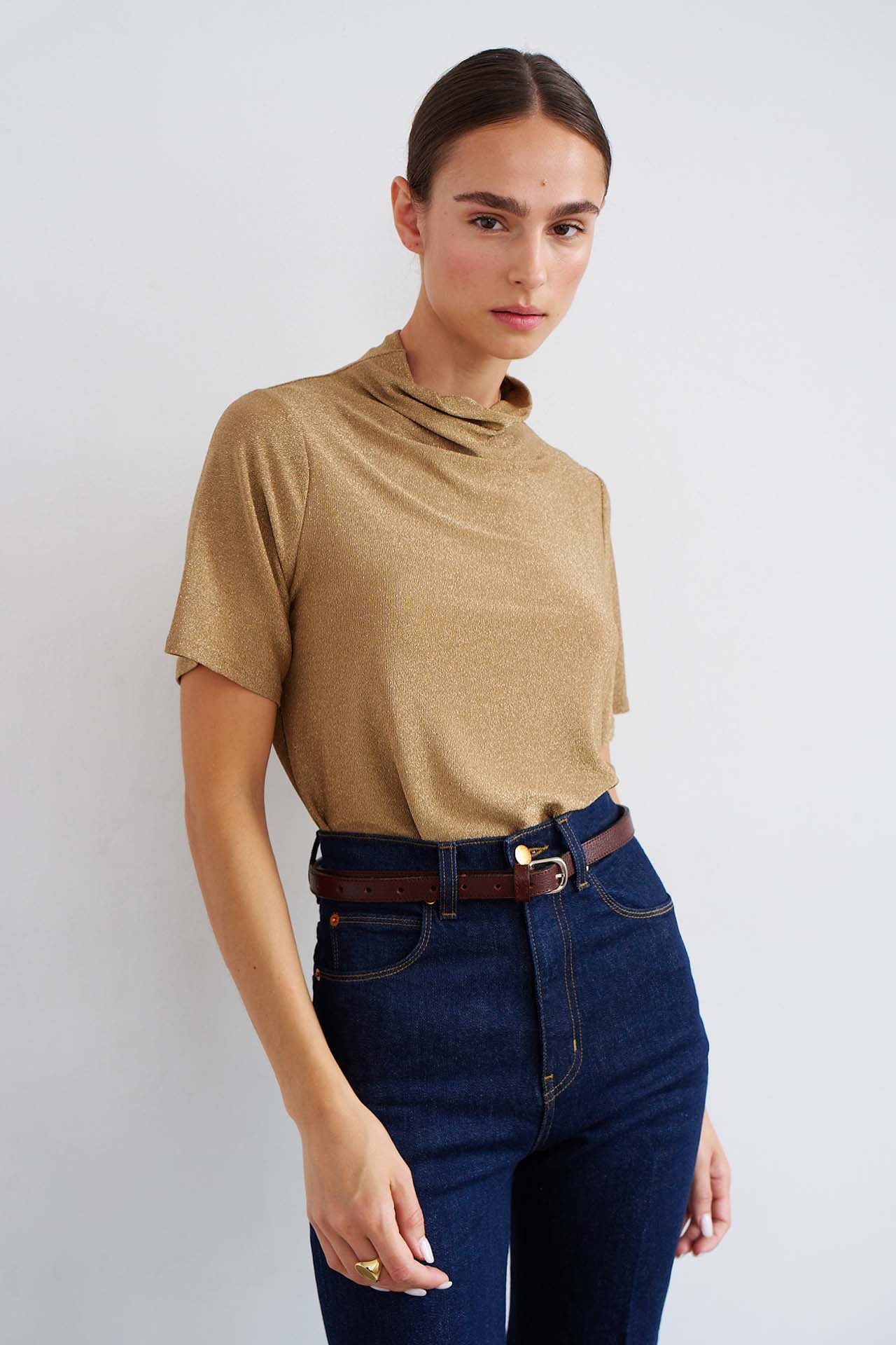 A relaxed tee shirt shape with a built up neckline that drapes into a petite cowl. Tailored in Italian glitter knit jersey.