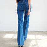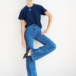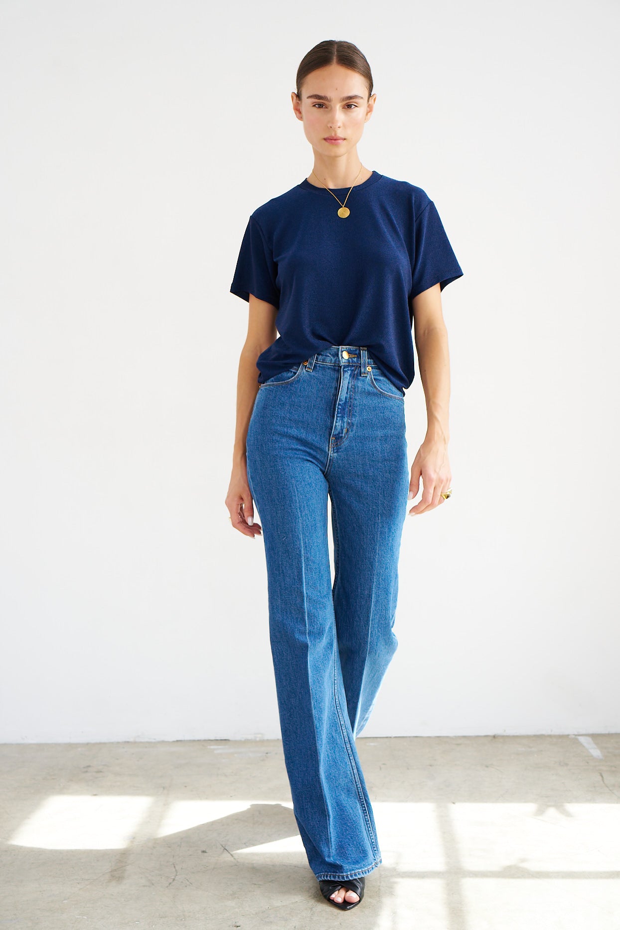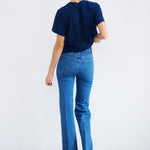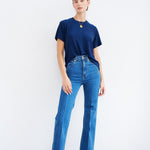 A relaxed flare that does the long and lean look well. A leg shaped like a narrow A. A leg that elongates. The shape that leans. A 33” inseam puddles with a flat and skims with a kitten. A 12” high rise that accentuates the natural waist. A silhouette that you fall in love with, and loves you back with it’s 2% stretch.