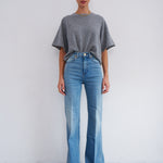 A relaxed flare that does the long and lean look well. A leg shaped like a narrow A. A leg that elongates. The shape that leans. A 33” inseam that puddles with a flat and skims with a kitten. A 12” high mid rise that accentuates the natural waist. A silhouette that you fall in love with, and loves you back with it’s 2% stretch.