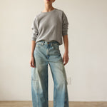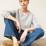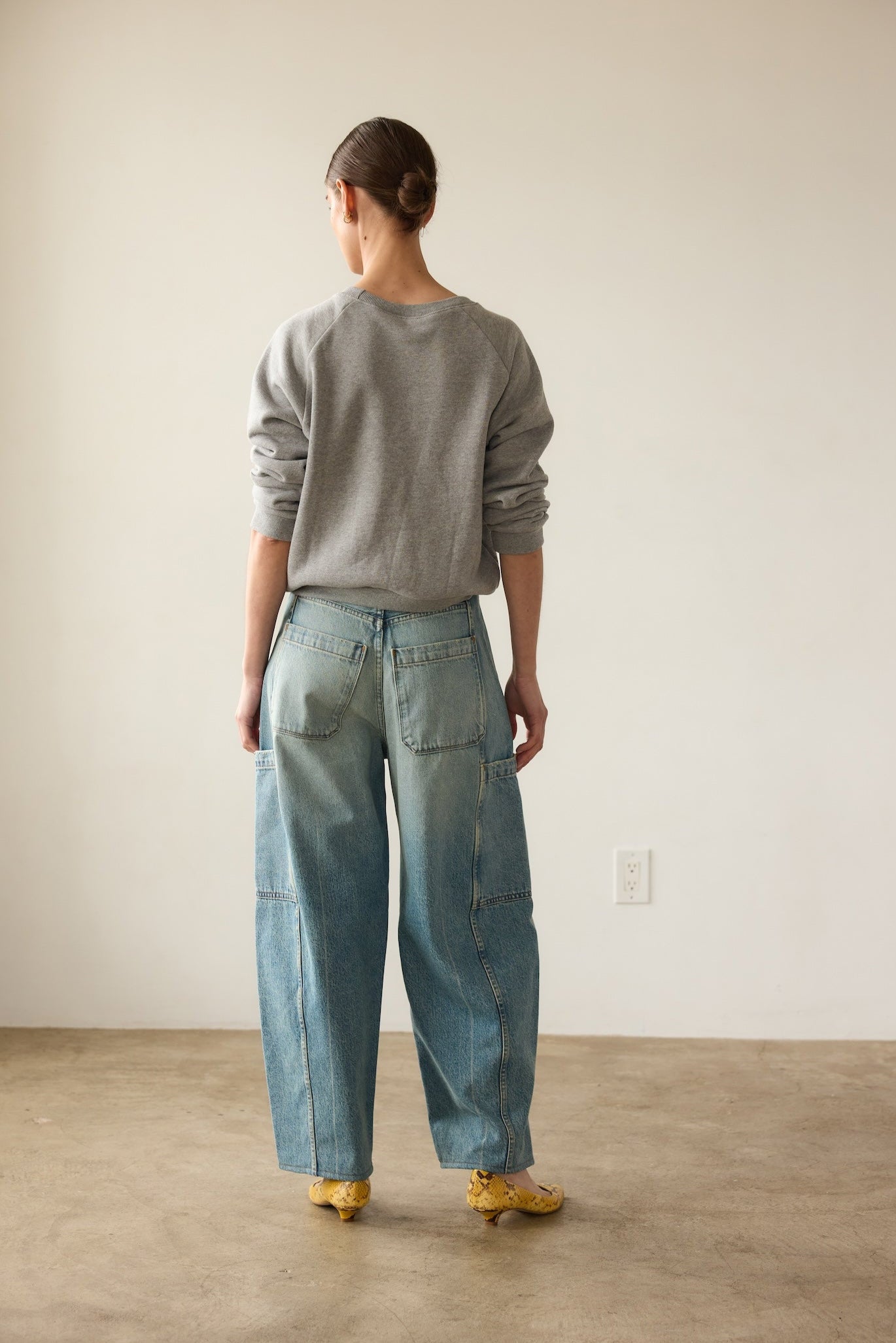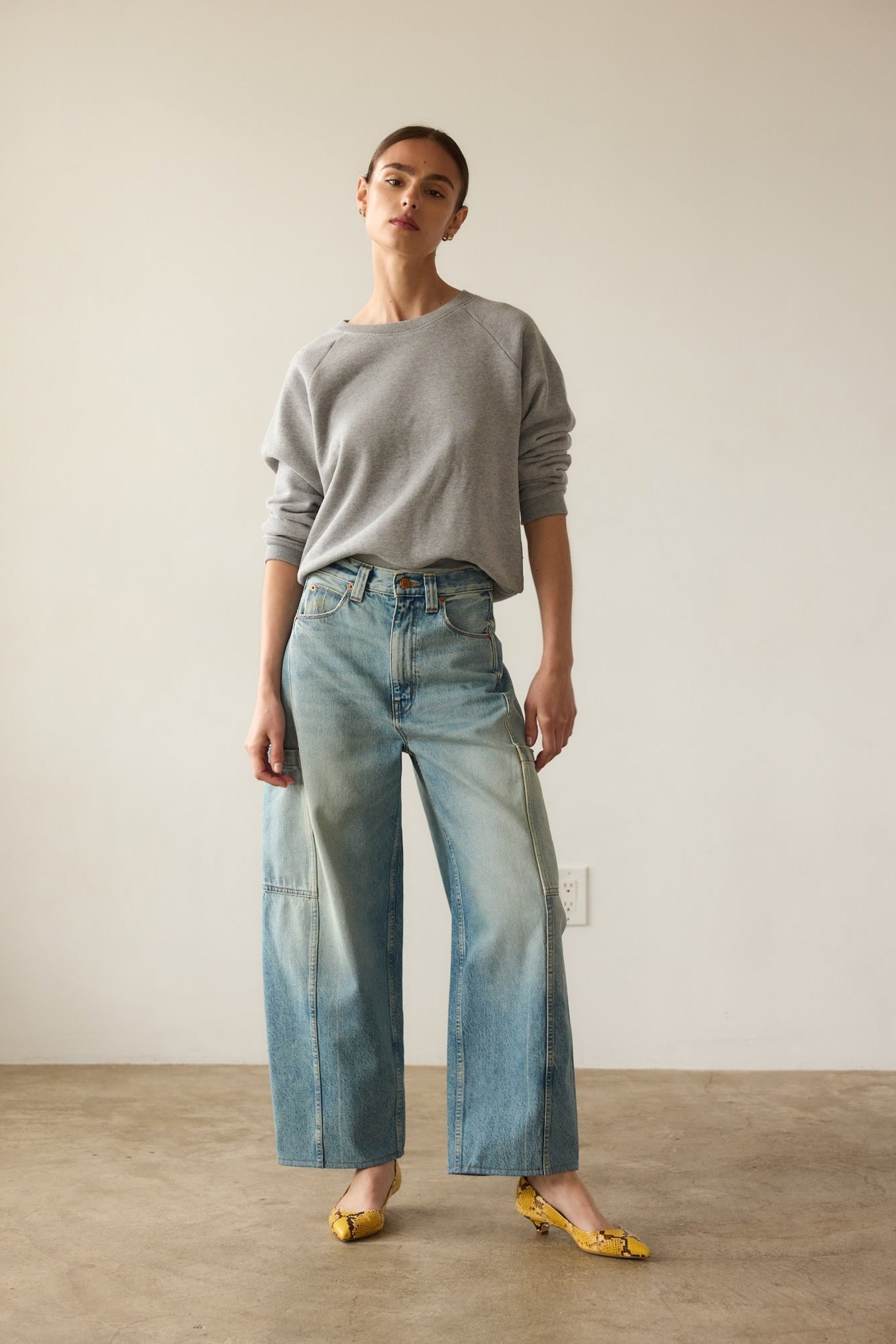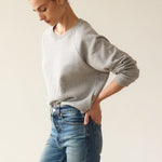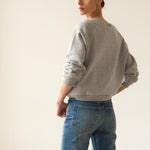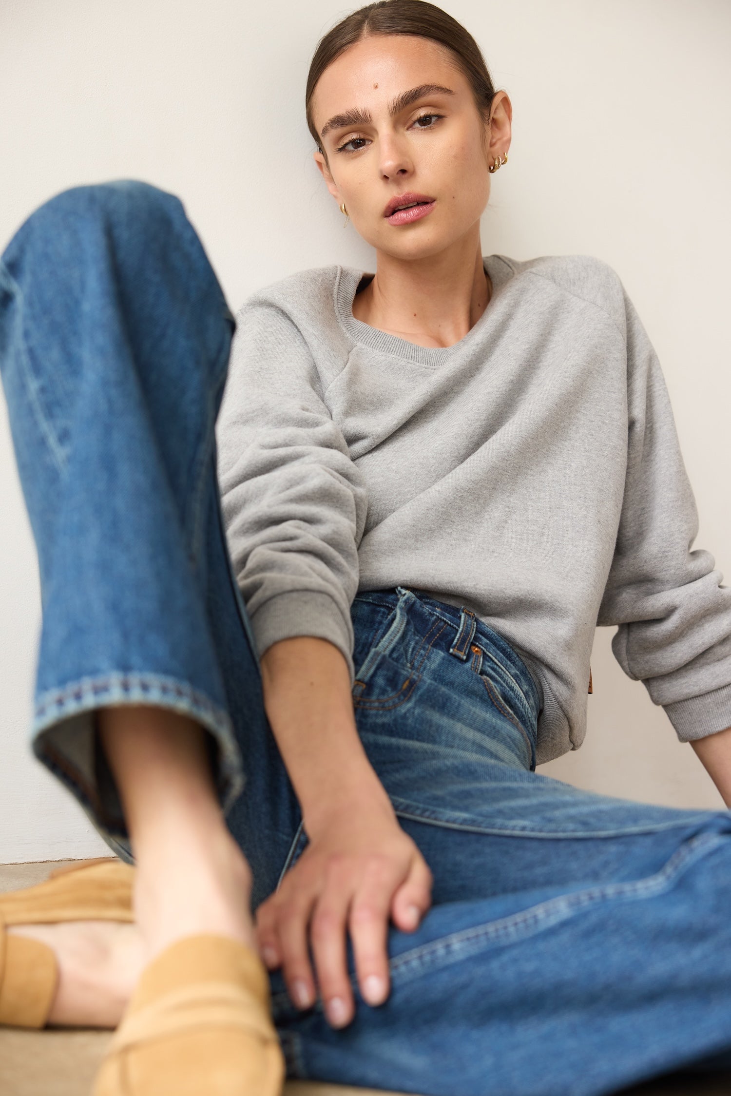 This is a shrunken but relaxed fit. It's shrunken in length but relaxed in width. The sleeves are bracelet length, the neckline is a feminine crewneck, a lovely shape that feels both high and tight, but soft in nature. The length tucks into the top of mid rise pants, hitting the high hipbones. The perfect sweatshirt. True to size