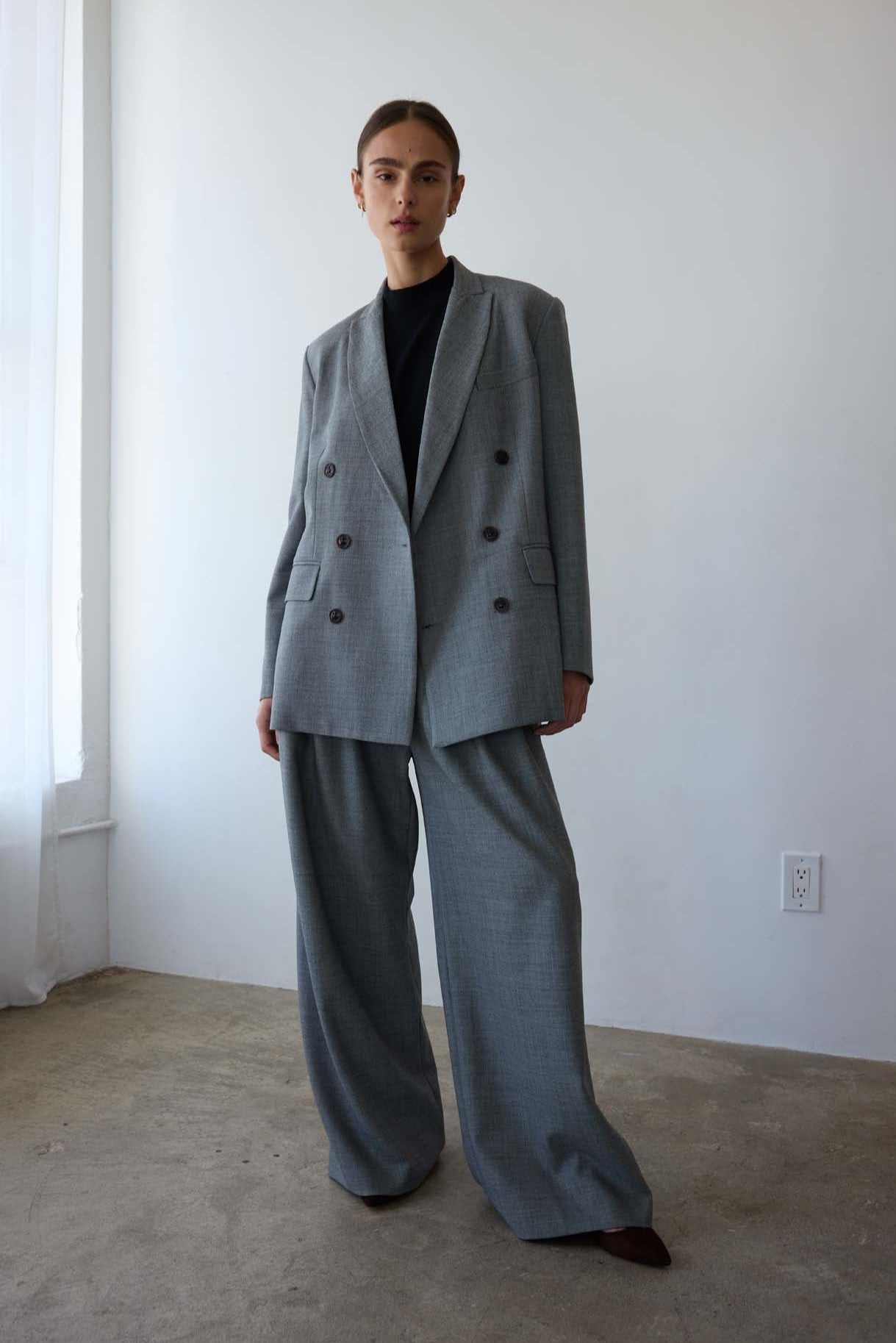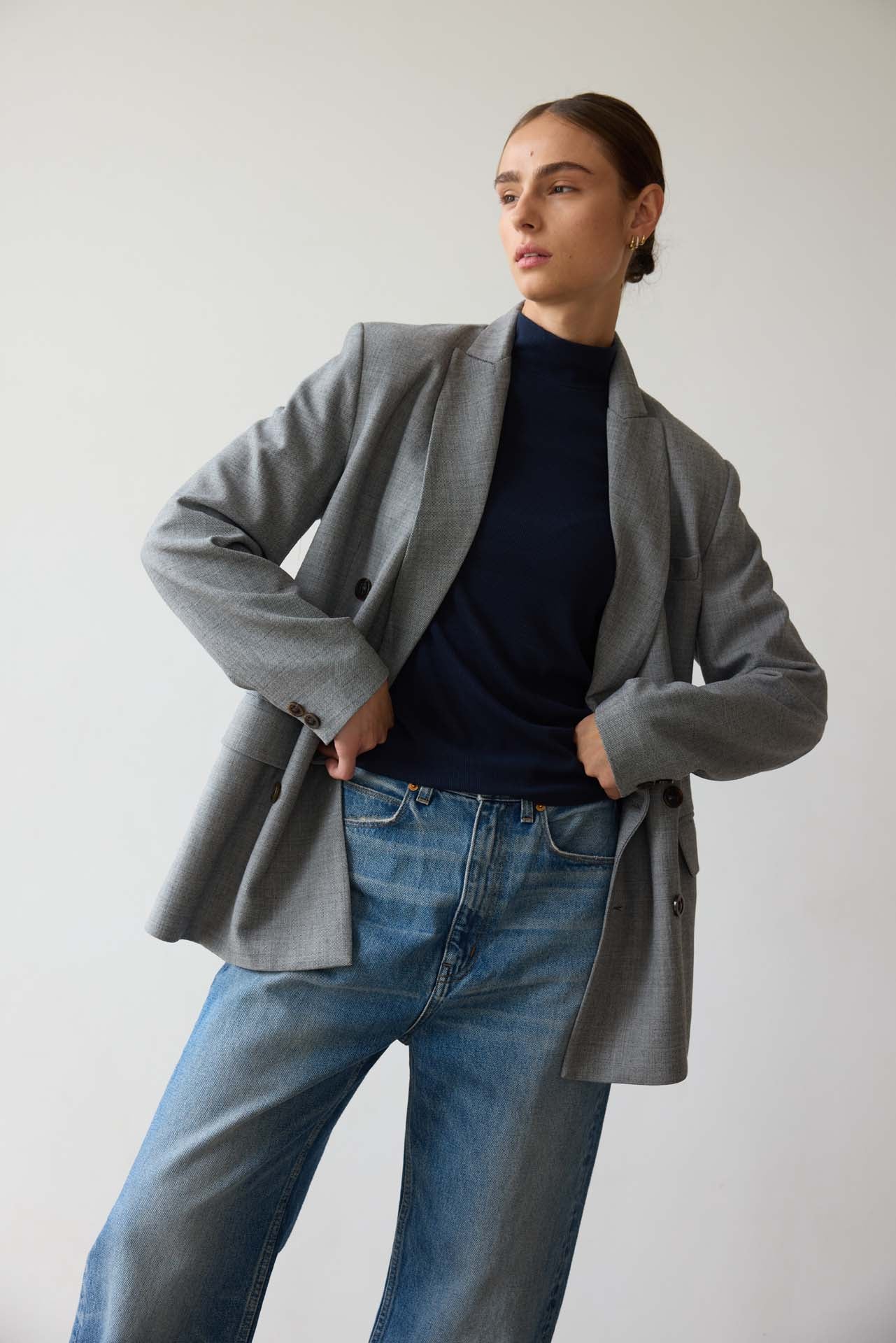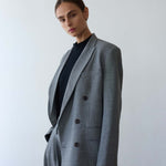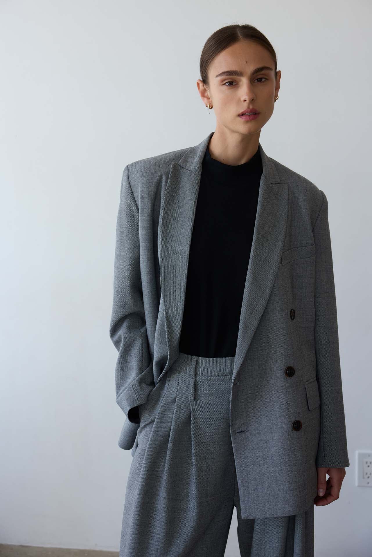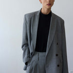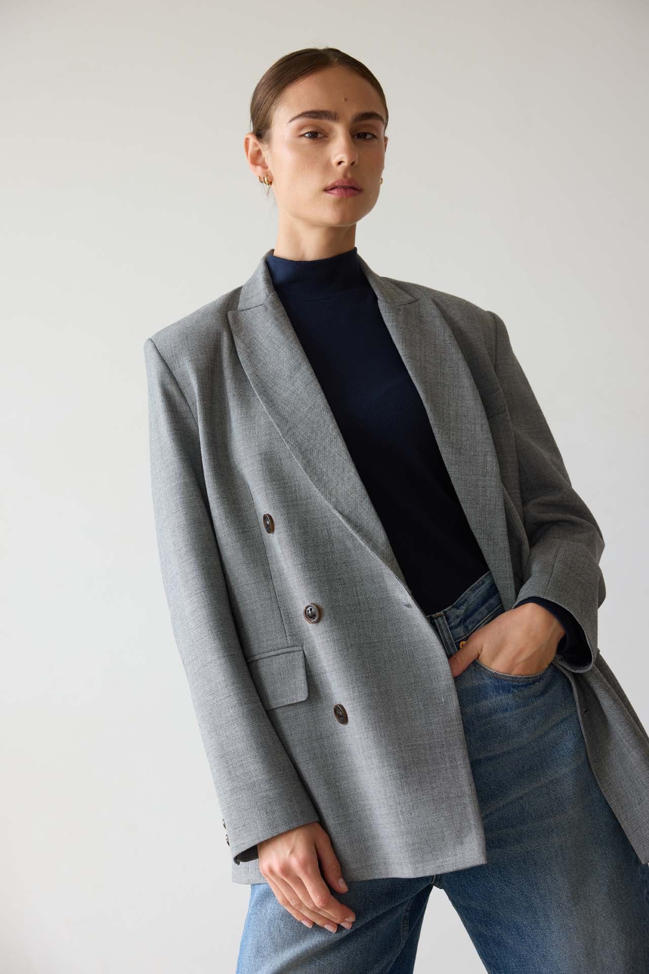 Oversized and chic, the DB blazer is a double breasted mens-inspired blazer. The cut is a little looser and longer with traditional button detailing and contrast lining.  Tailored in a soft and drapy Italian suiting. A virgin wool blend with a salt and pepper effect.