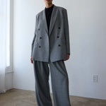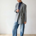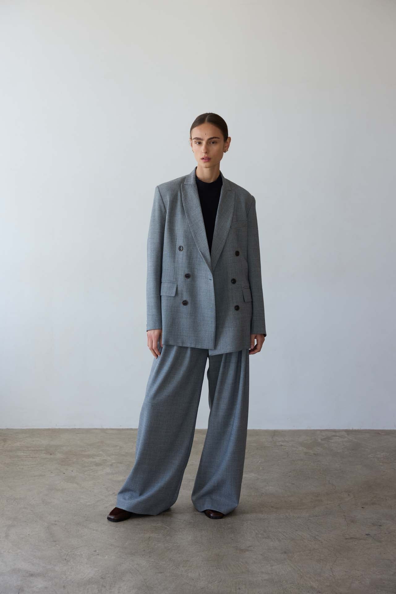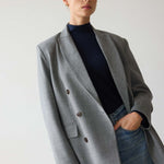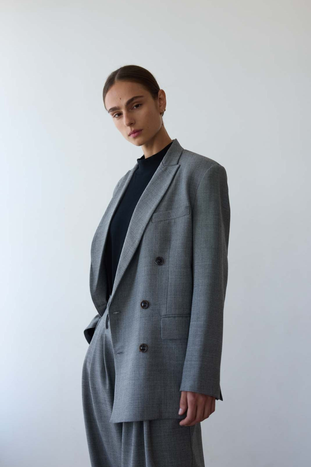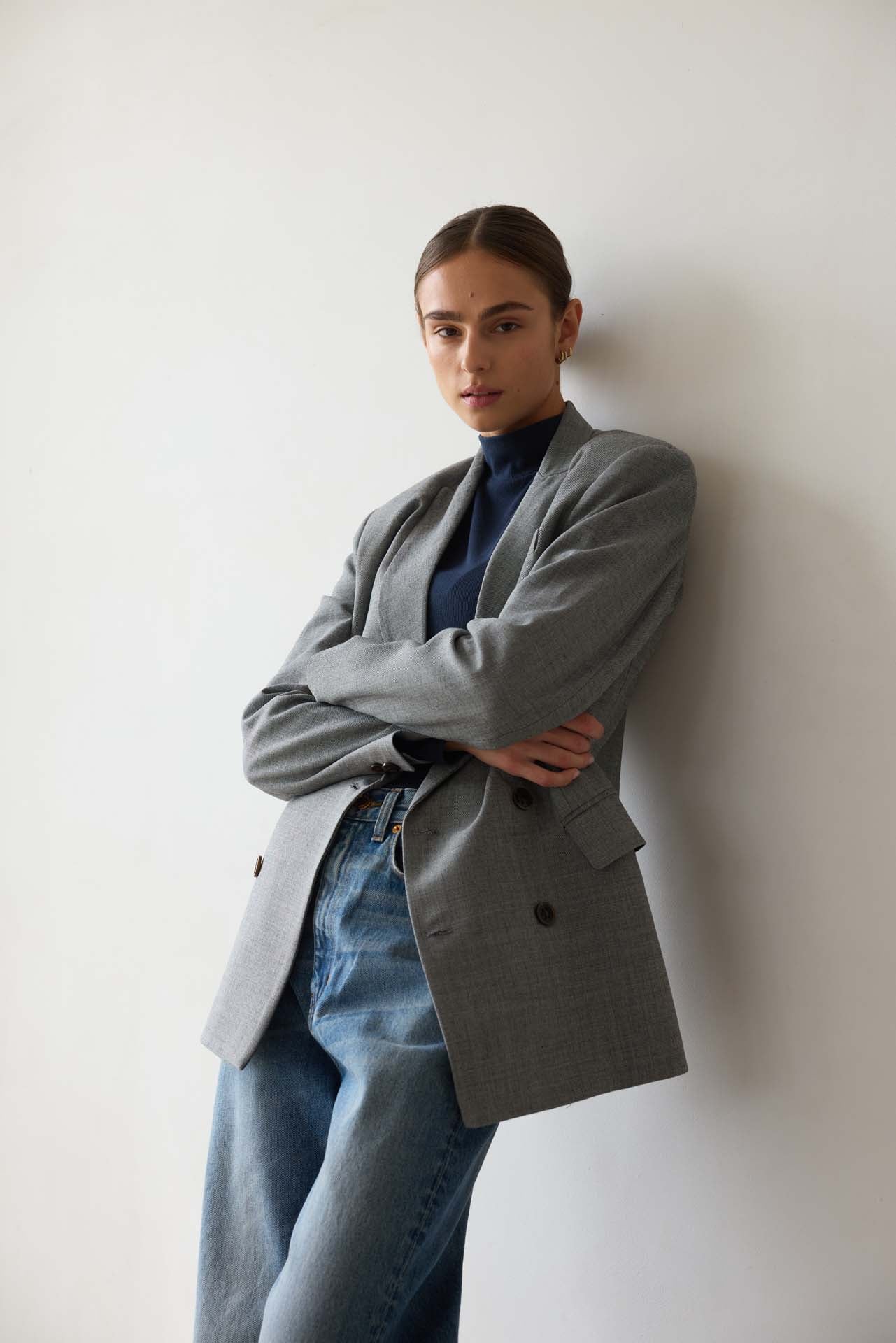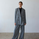Oversized and chic, the DB blazer is a double breasted mens-inspired blazer. The cut is a little looser and longer with traditional button detailing and contrast lining.  Tailored in a soft and drapy Italian suiting. A virgin wool blend with a salt and pepper effect.