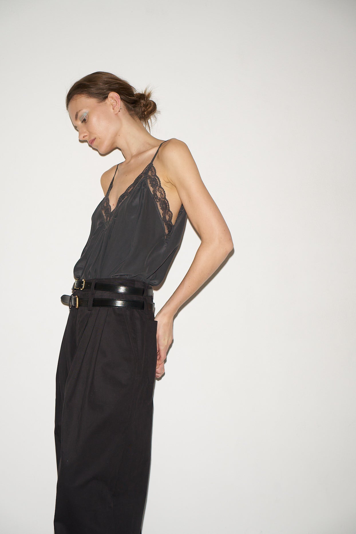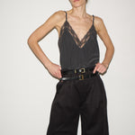 A deep V cami with delicate lace detail,  perfect for layering under a blazer or a night out with the Crease Jean. Tailored in sand washed silk charmeuse with the satin side soft to the skin.