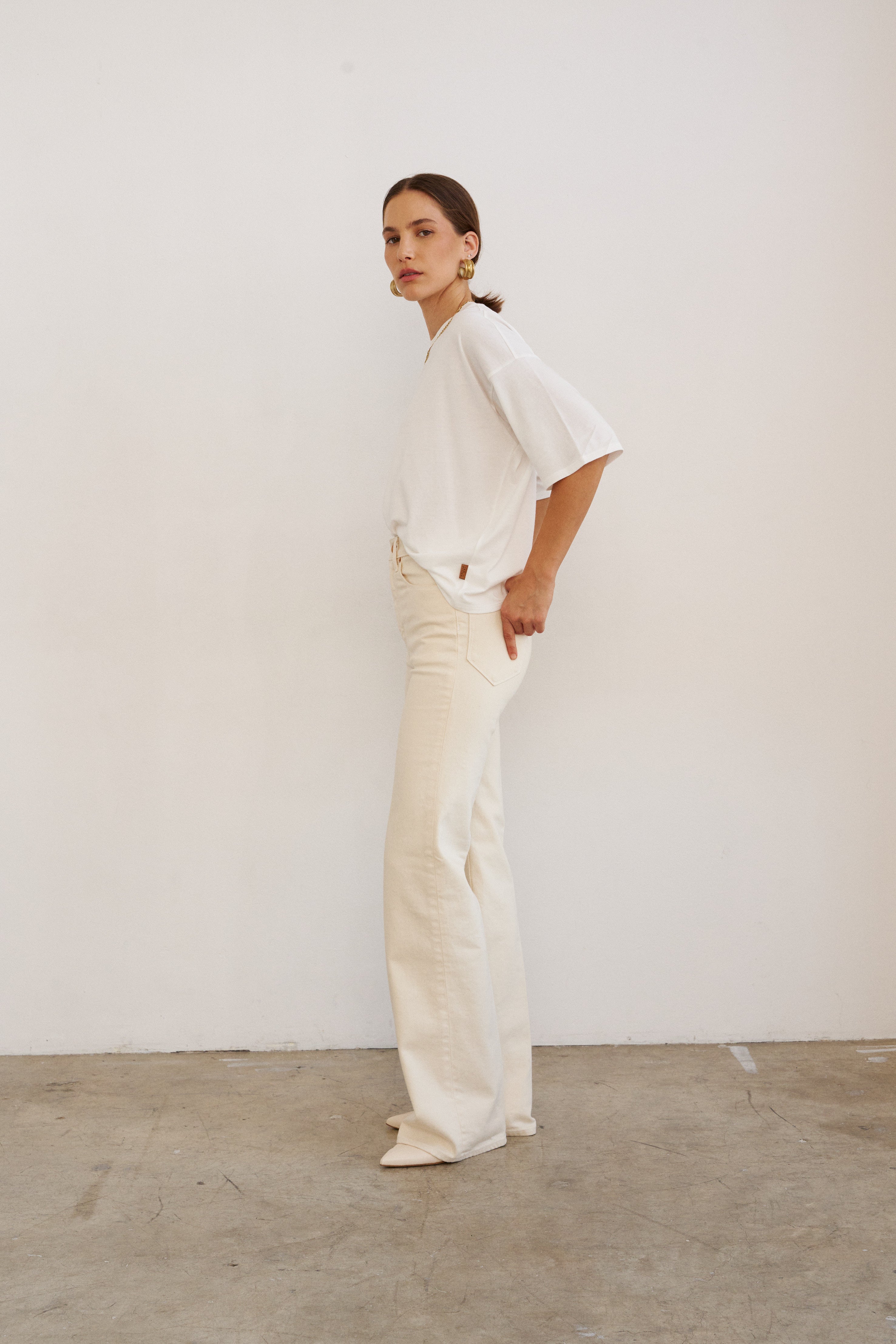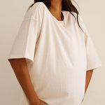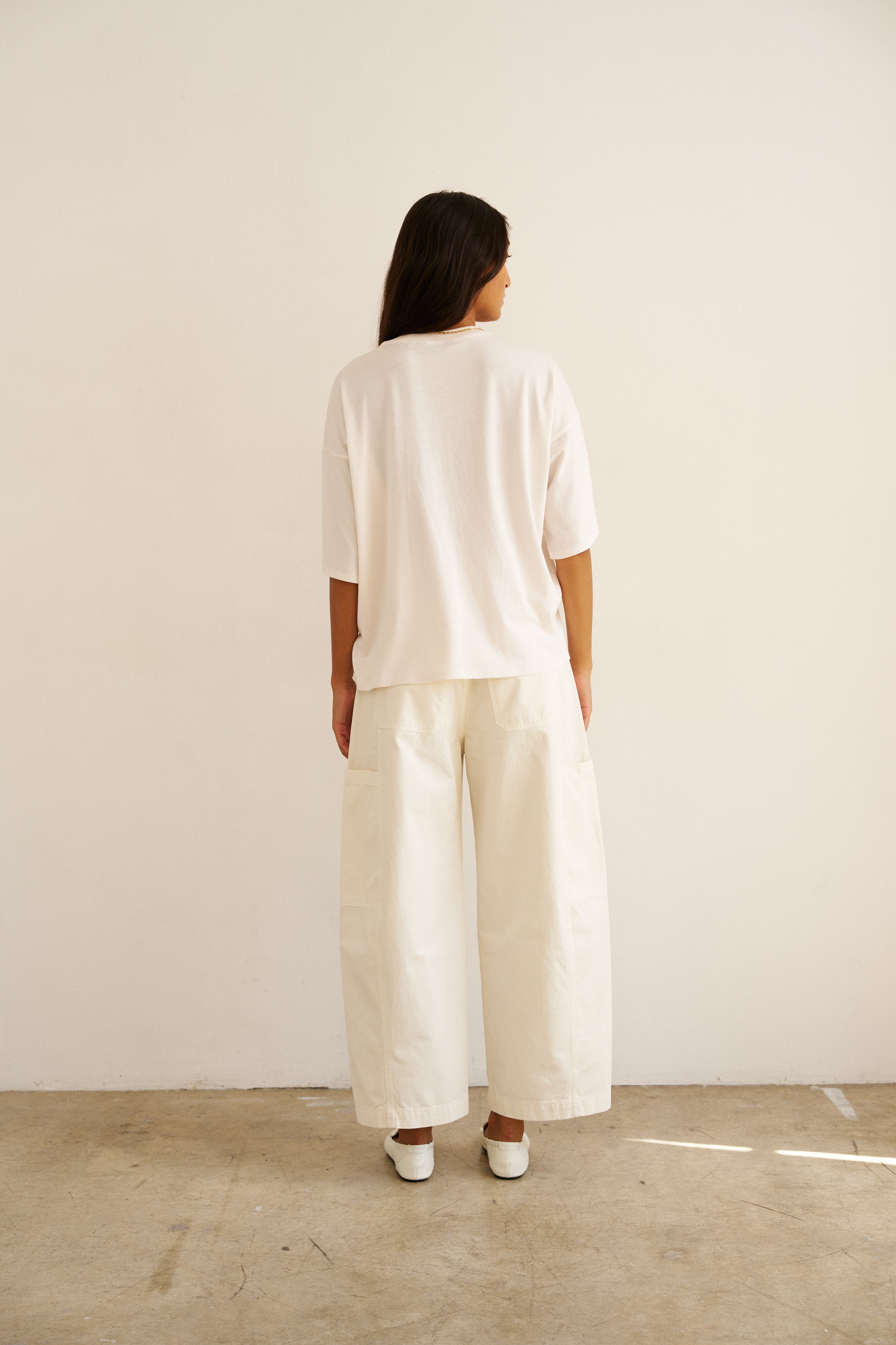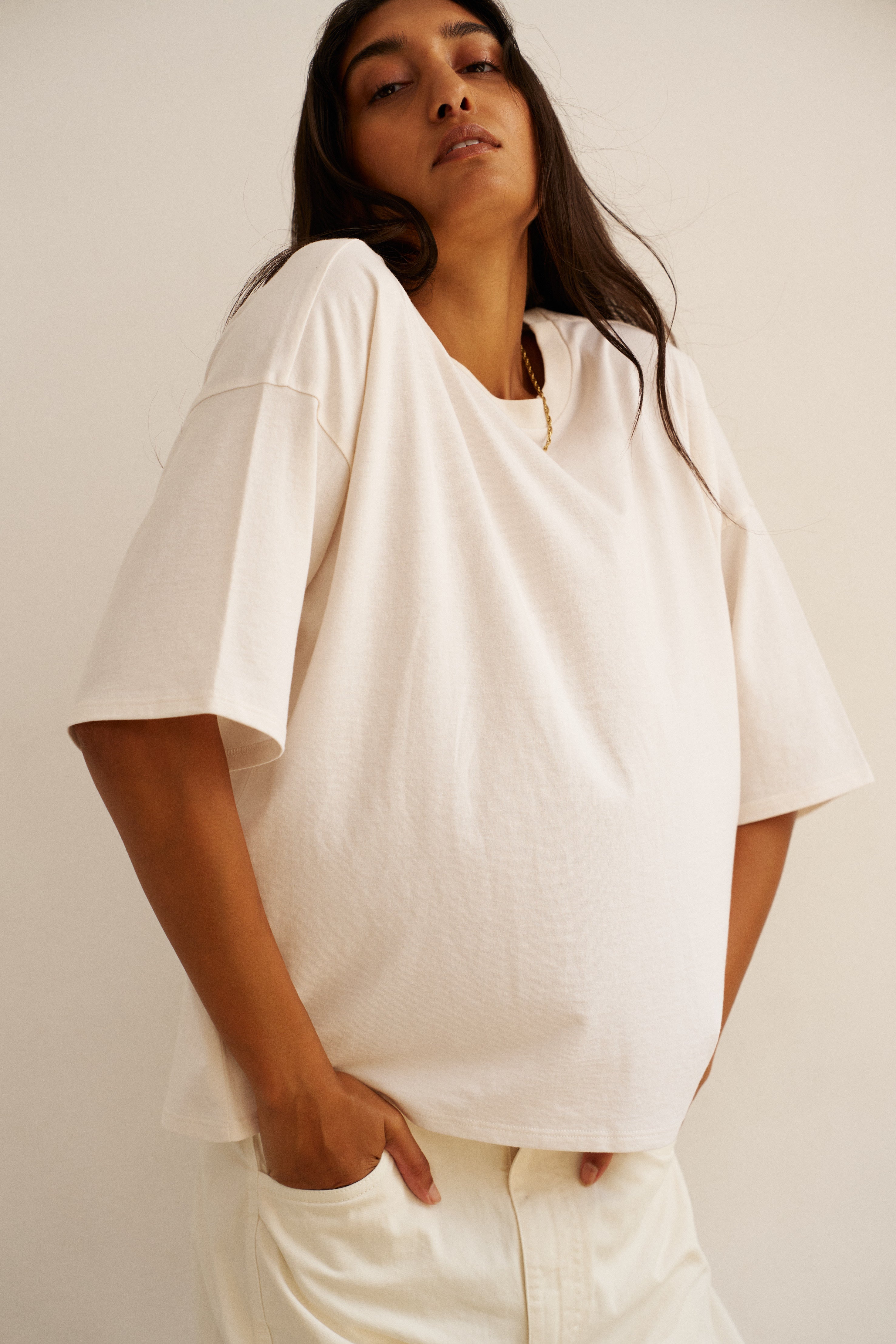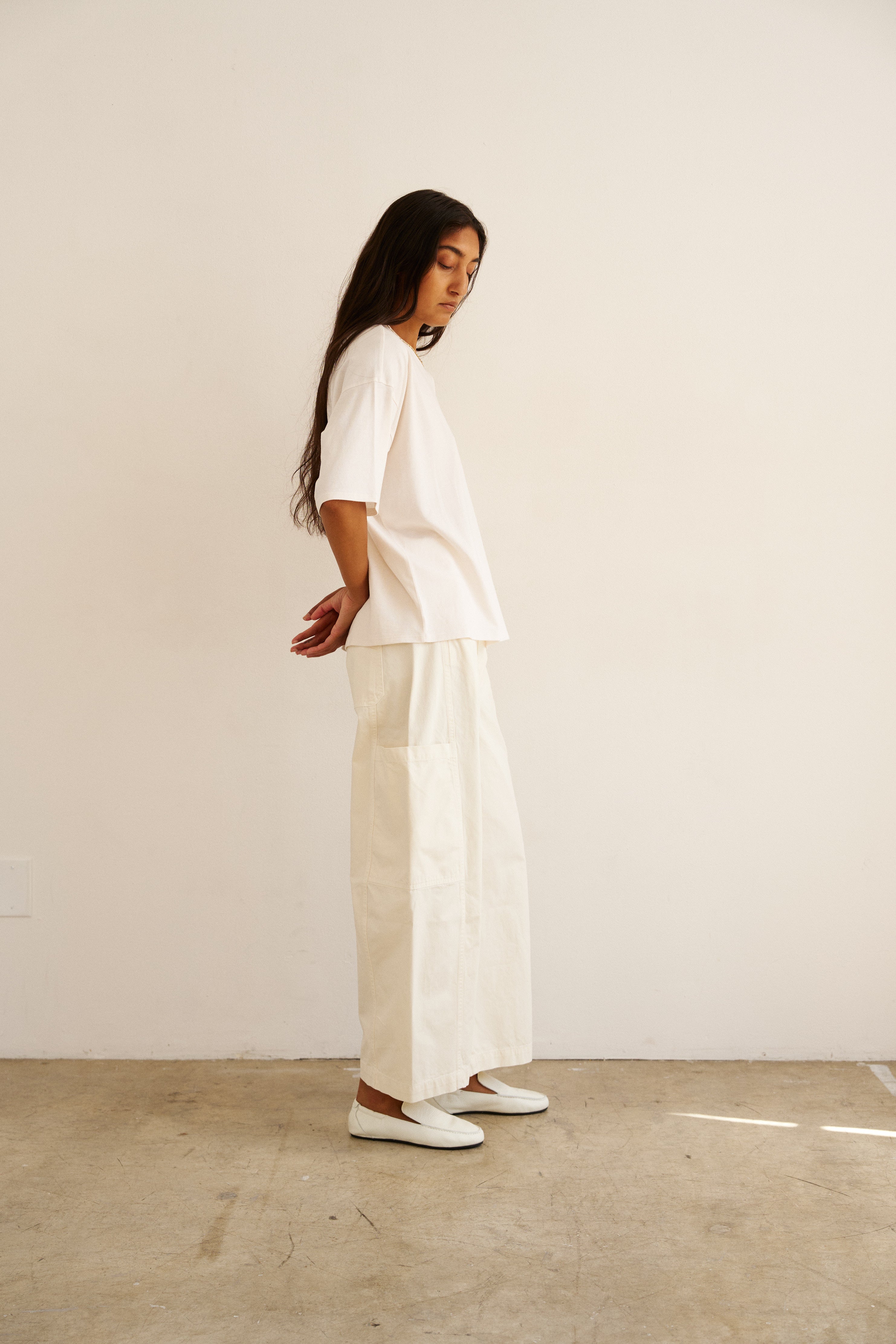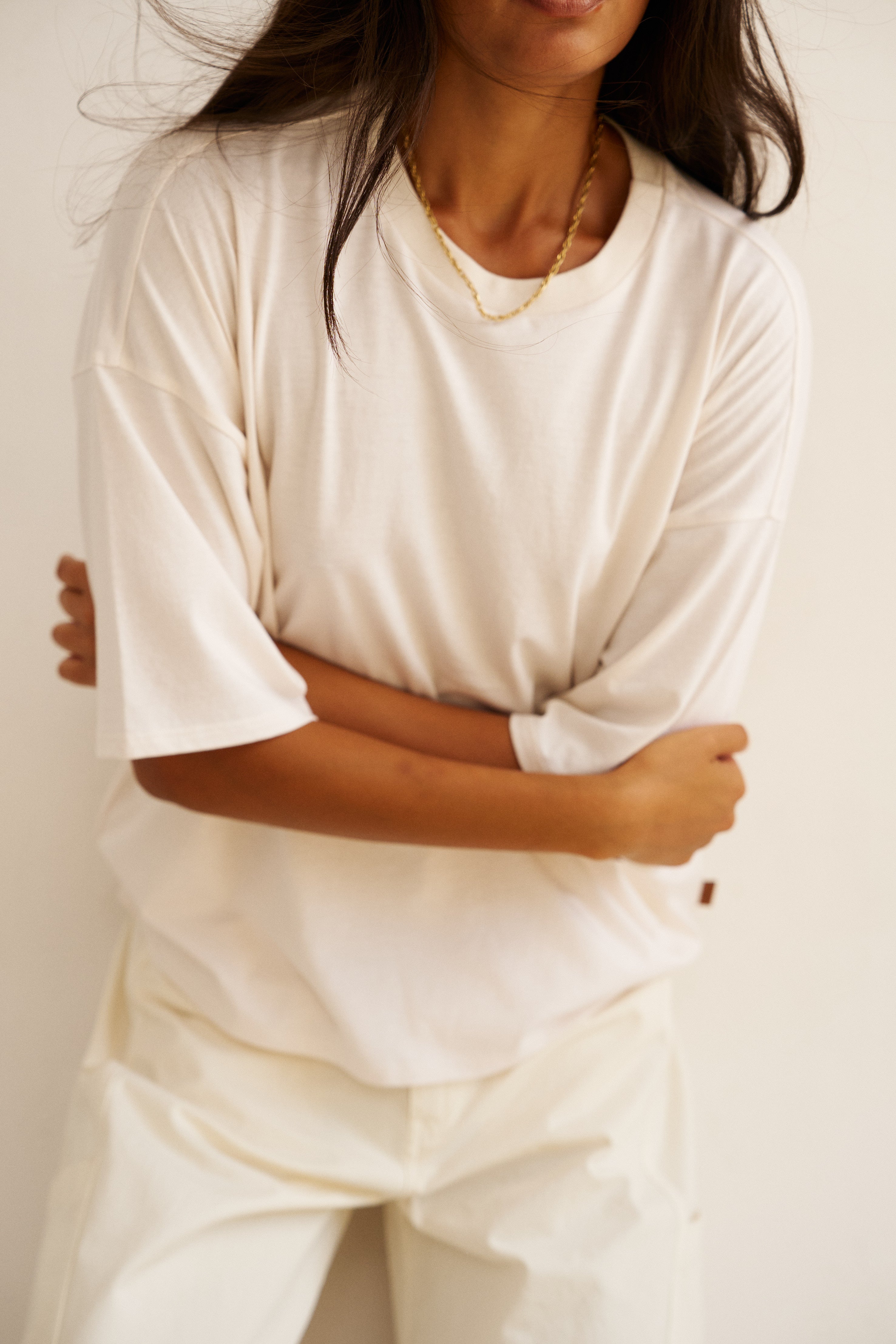 A high crew dolman tee with an elbow sleeve silhouette. A dolman shaped body, fluid and soft.