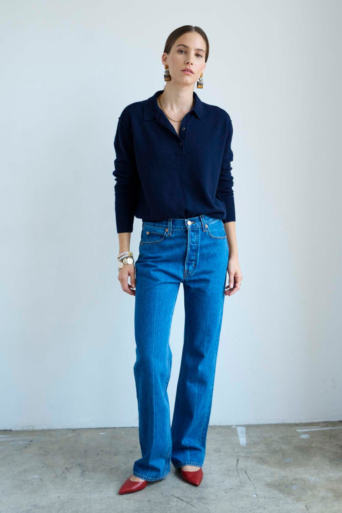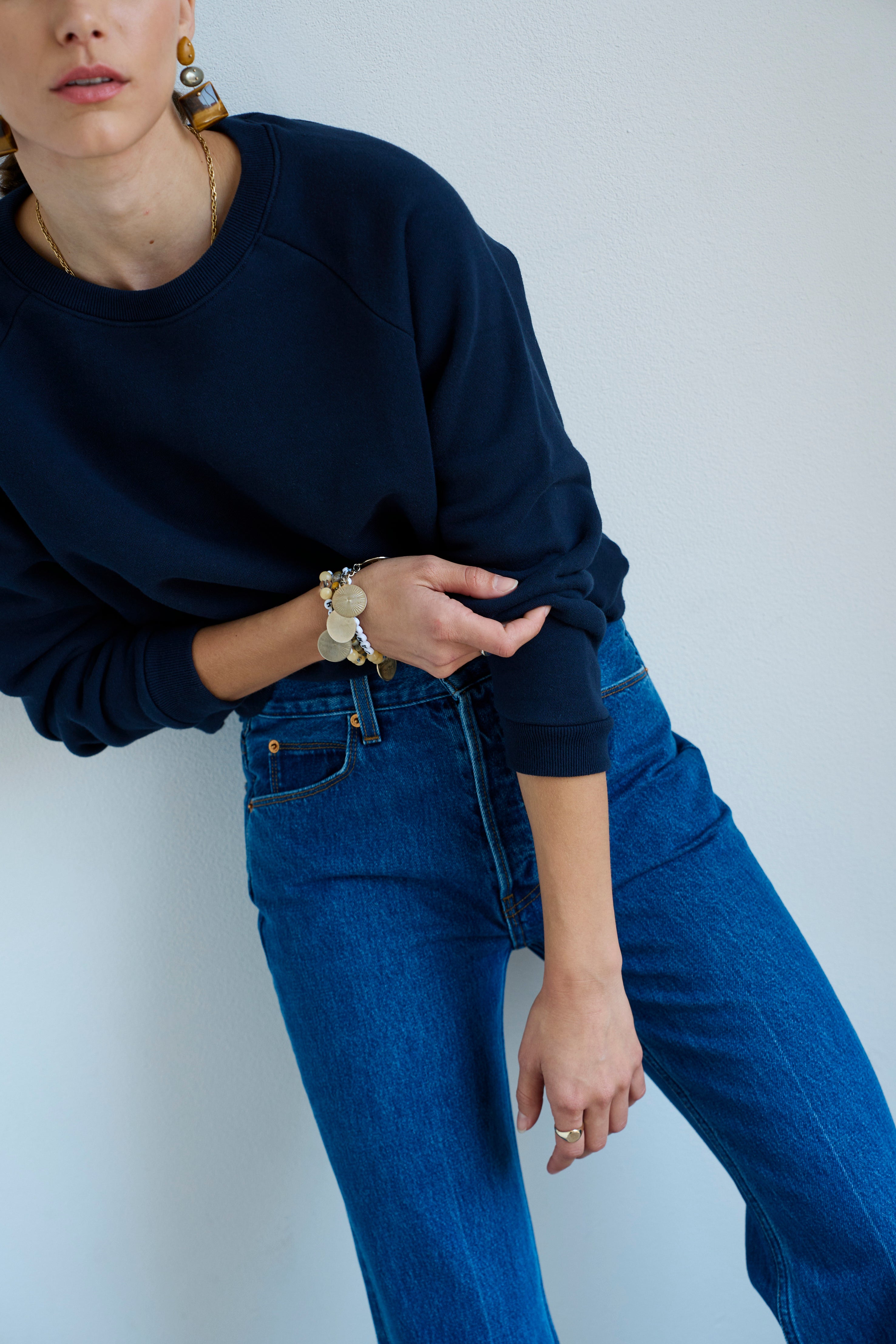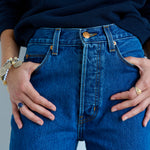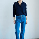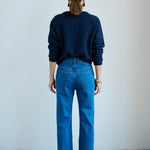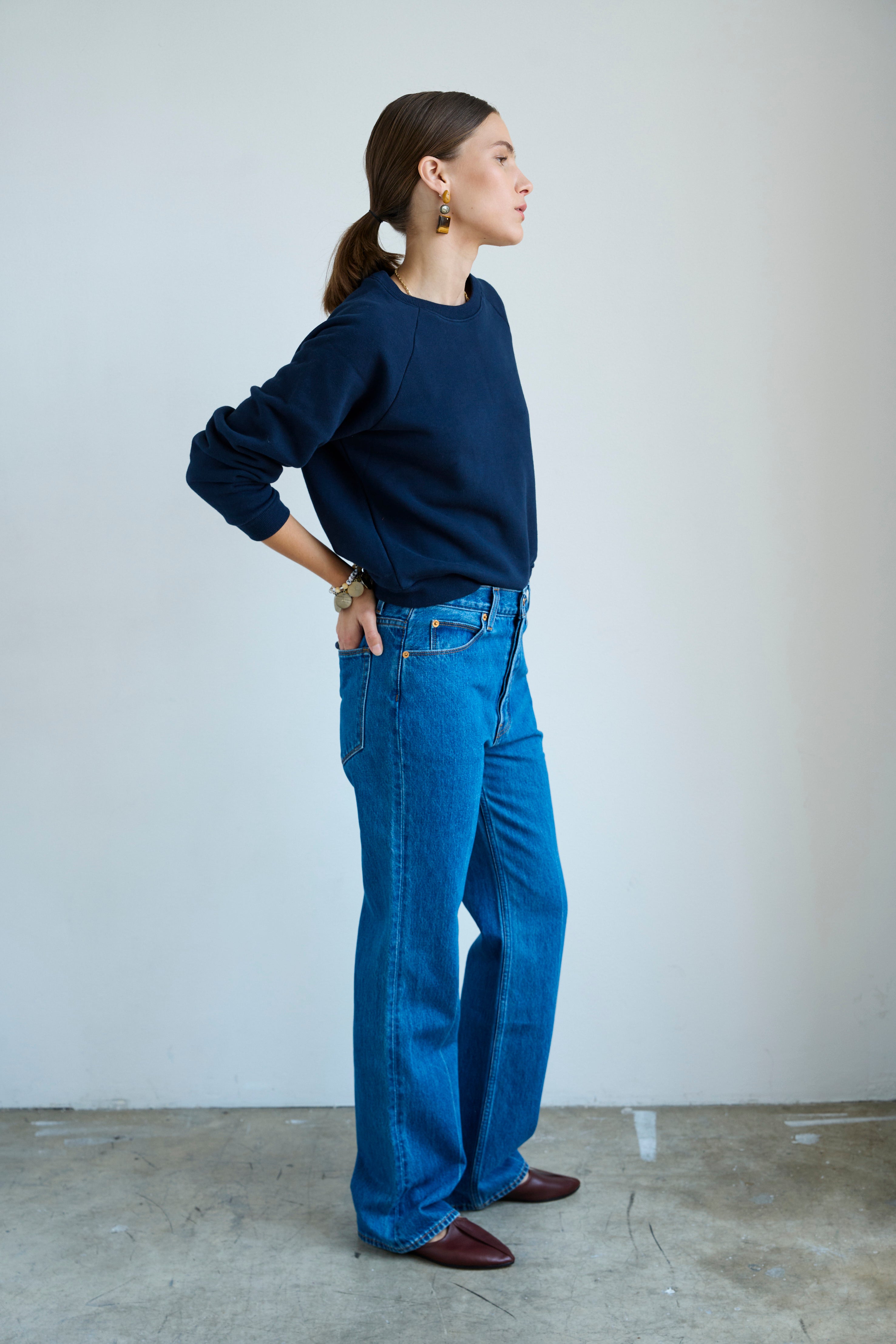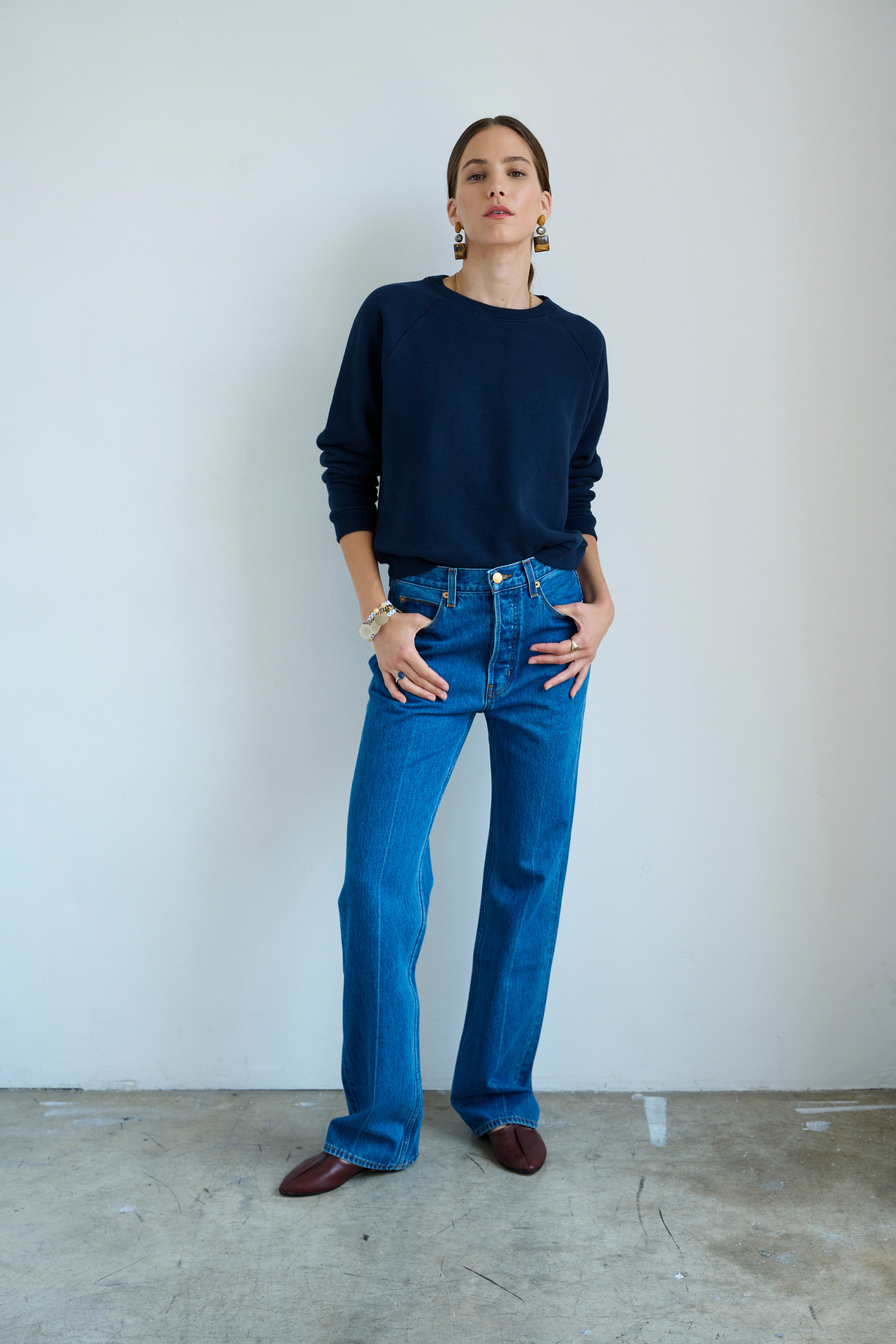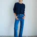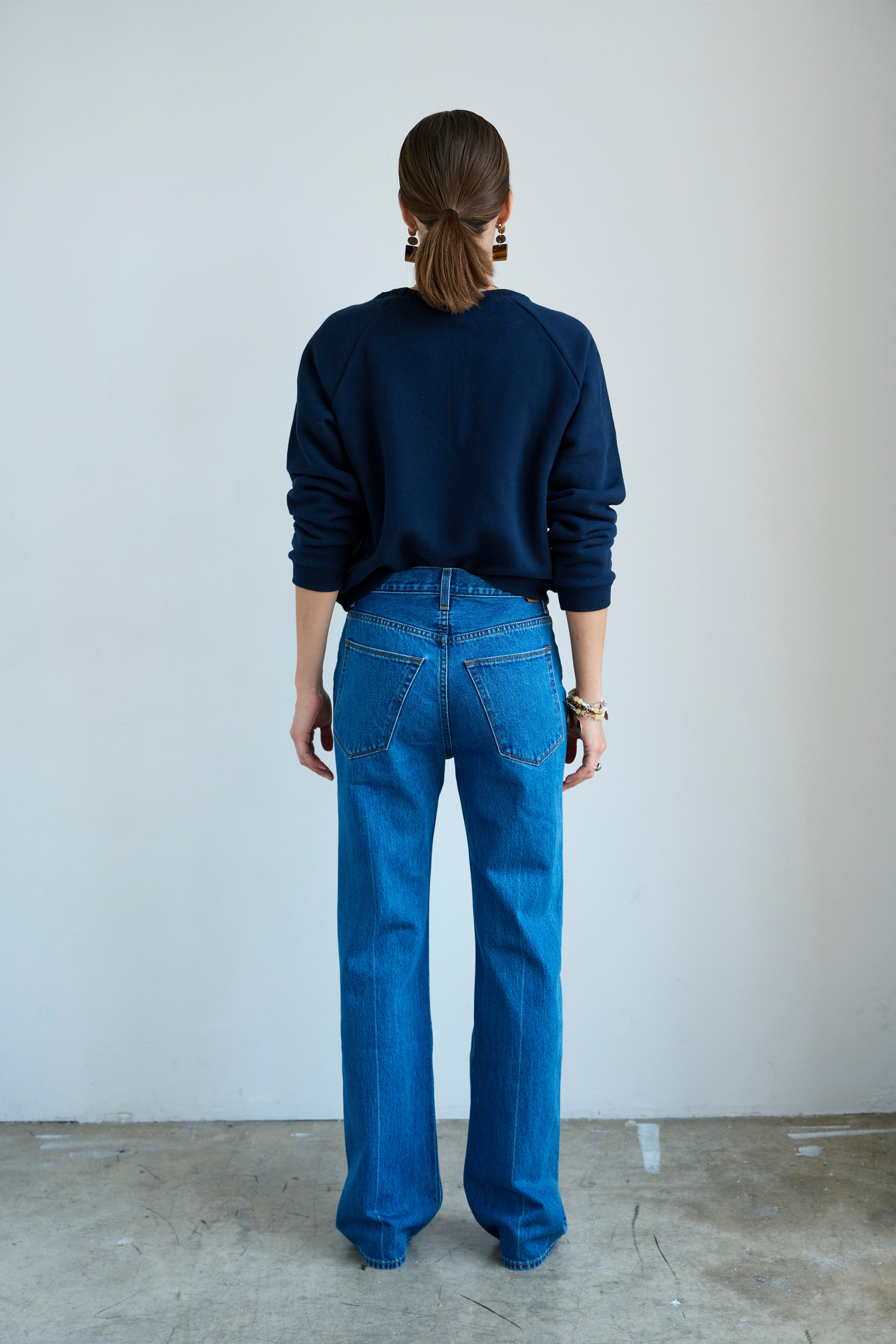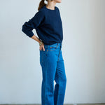 True blue meets minimal.. The Easy is a mid-rise jean with a relaxed fit.  A straight leg with a 31” inseam creates an intentional puddle when worn with flats or skims with a kittenl. A soft slung feel with a relaxed drape, this fit is the one you wear to soften the polish. A go to weekend jean. Casual but elegant, she is meant to very slightly slouch and be worn on the high hip.  Clean and modern,  the stone crease wash is a medium indigo stonewash with a faded crease.