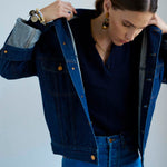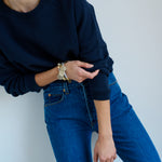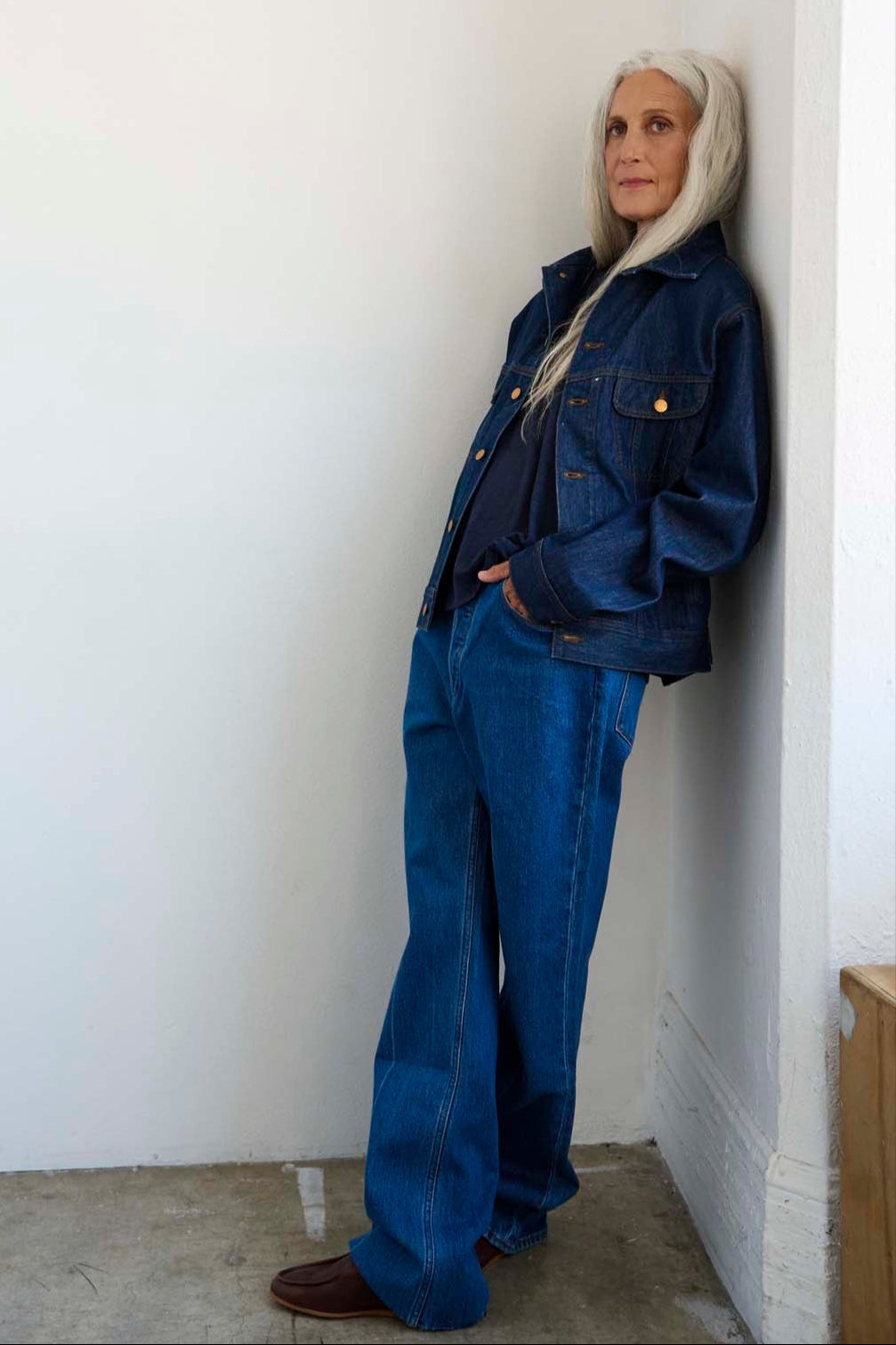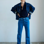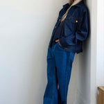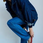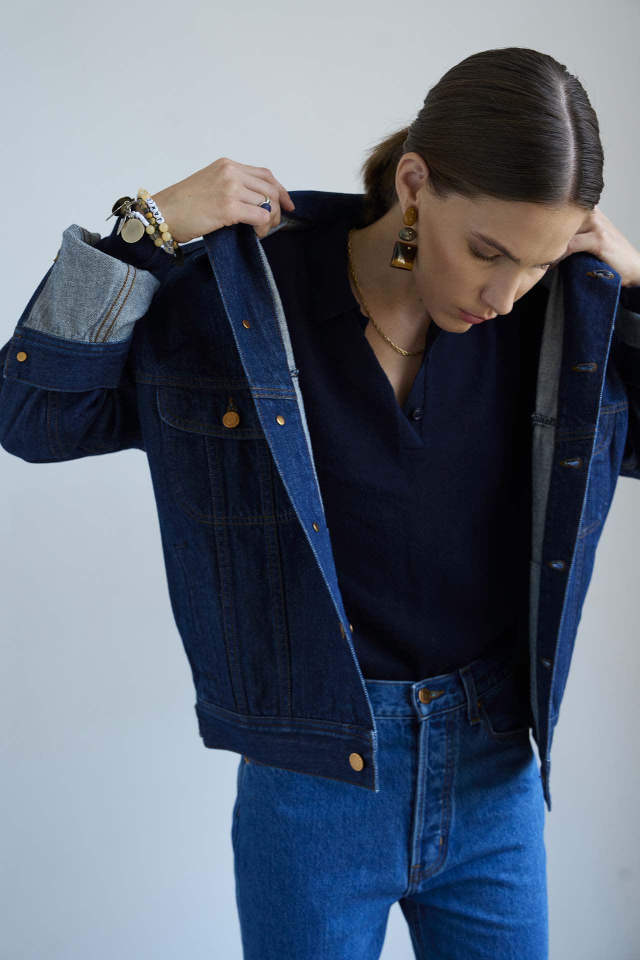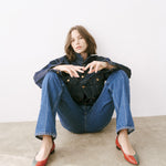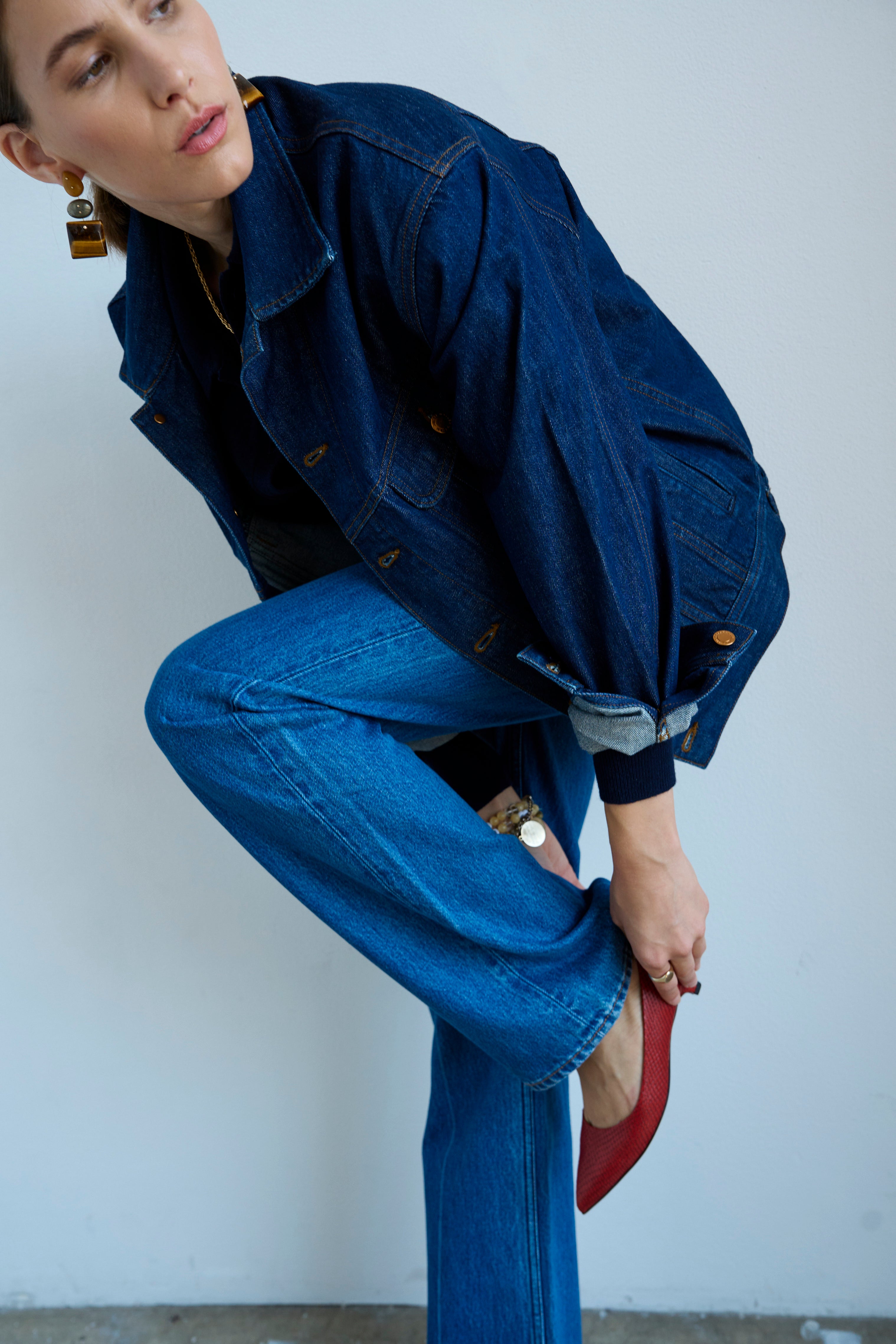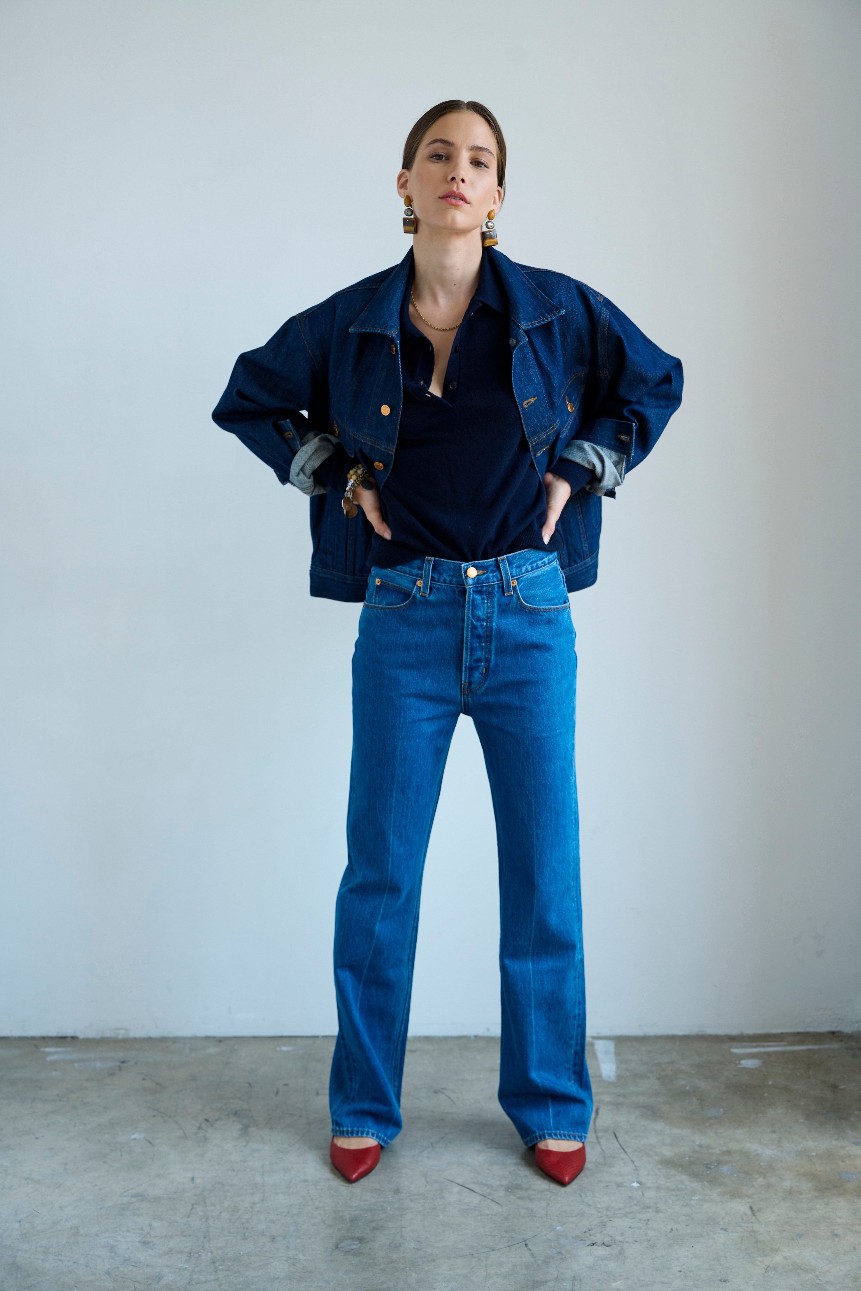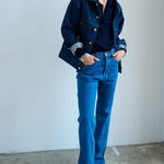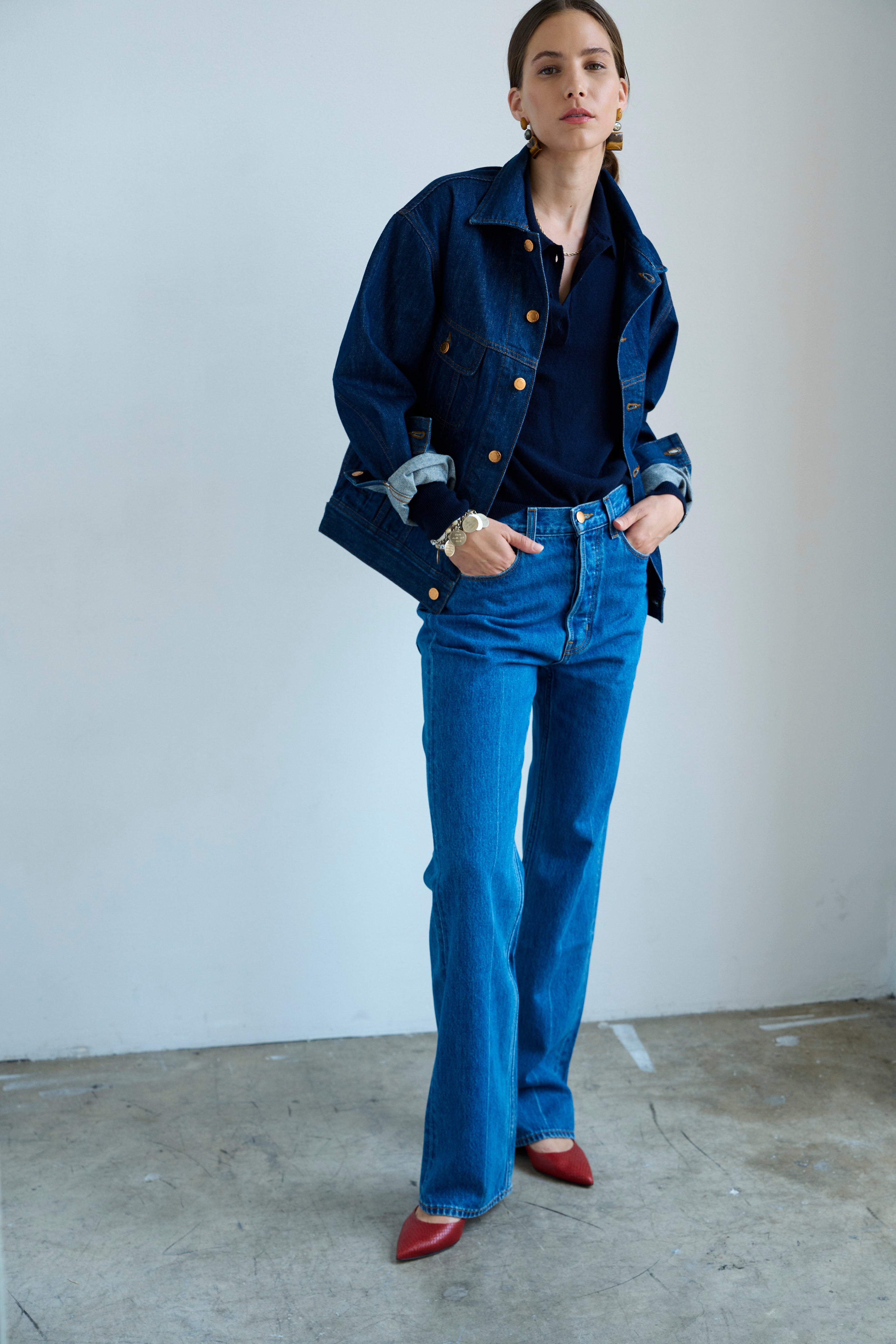 True blue meets minimal.. The Easy is a mid-rise jean with a relaxed fit.  A straight leg with a 31” inseam creates an intentional puddle when worn with flats or skims with a kittenl. A soft slung feel with a relaxed drape, this fit is the one you wear to soften the polish. A go to weekend jean. Casual but elegant, she is meant to very slightly slouch and be worn on the high hip.  Clean and modern,  the stone crease wash is a medium indigo stonewash with a faded crease.