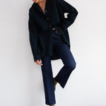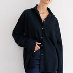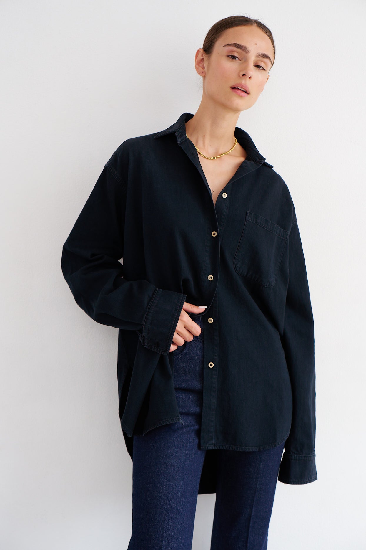 The bestselling Essential denim shirt in Vintage Black is expertly cut for a beautiful denim drape with a straight & relaxed shape. A perfectly placed button at the chest allows for a deep neckline. A button under the neckline creates the opportunity for a high buttoned up look without the choke. A small button perfectly placed on the hidden cuff placket for an easy undone cuff that doesn’t get away from you.