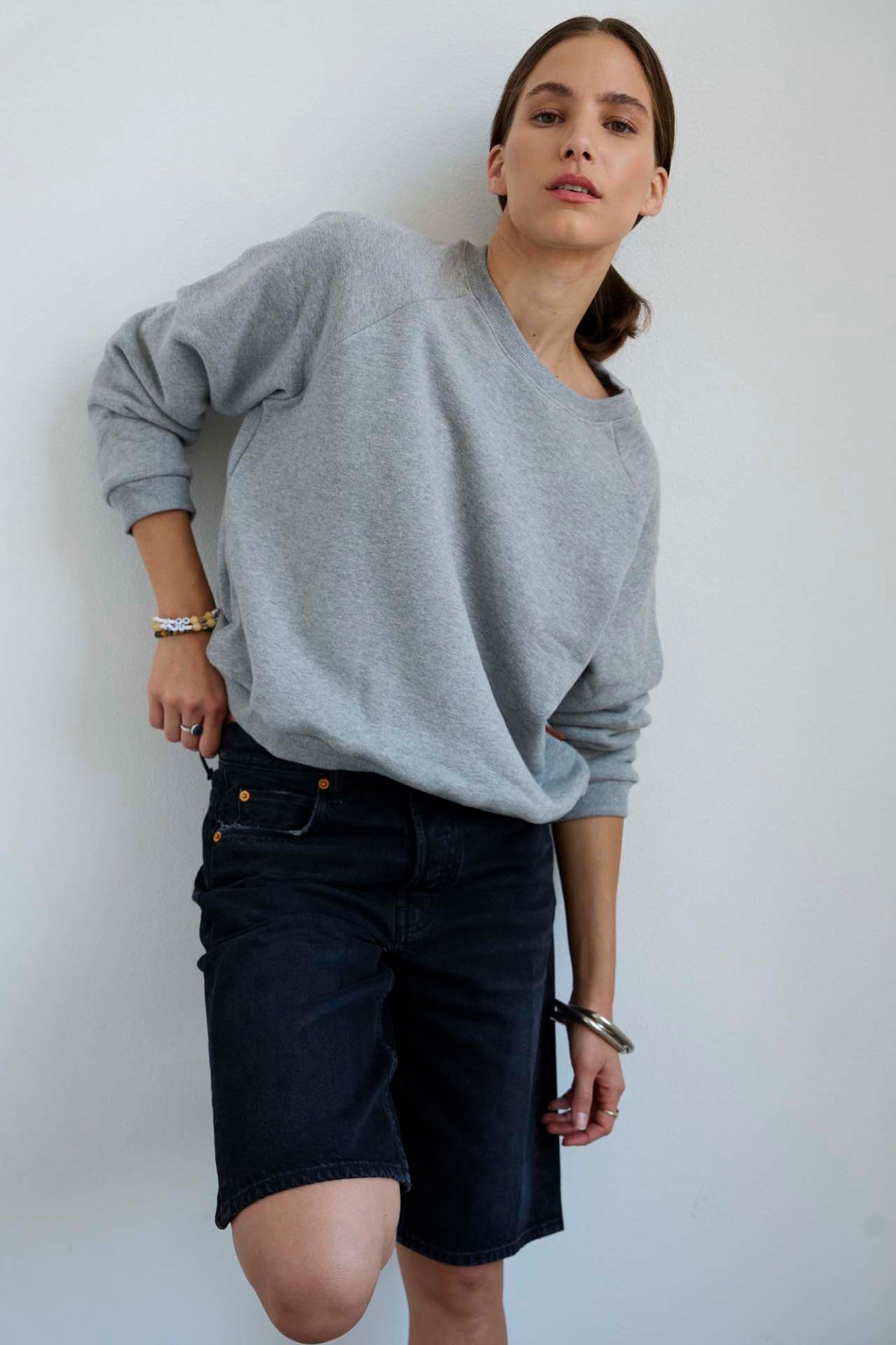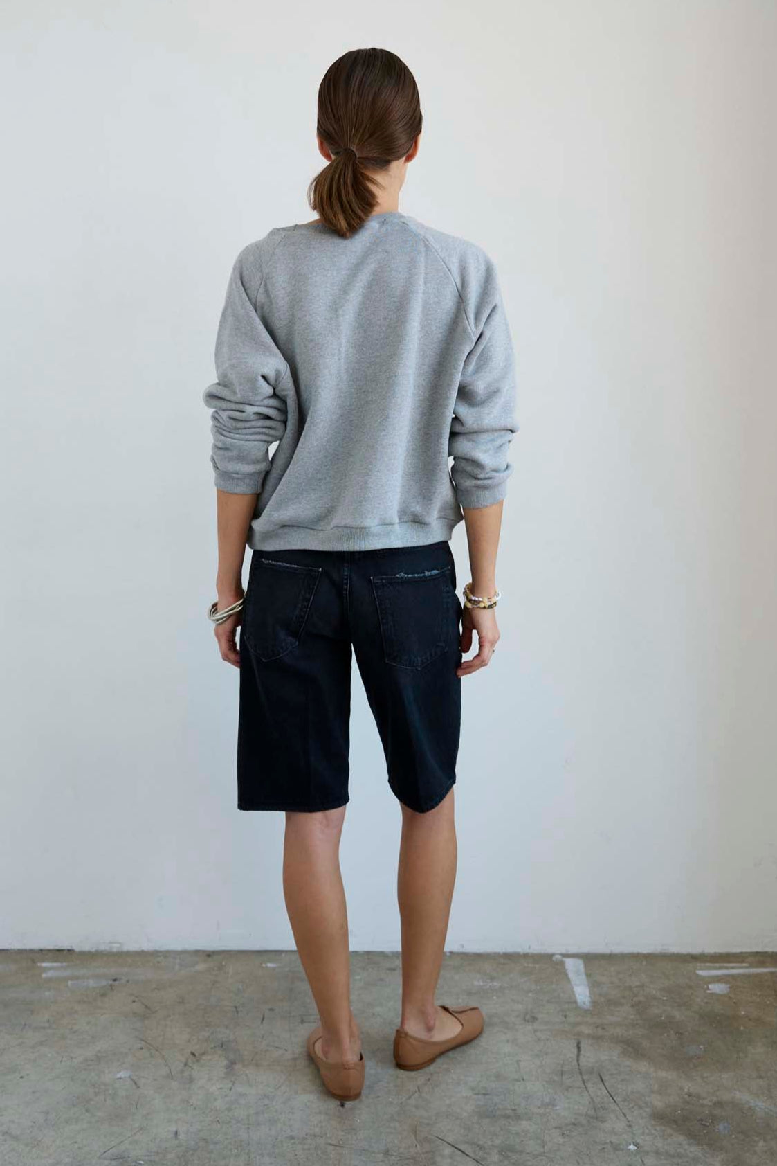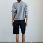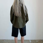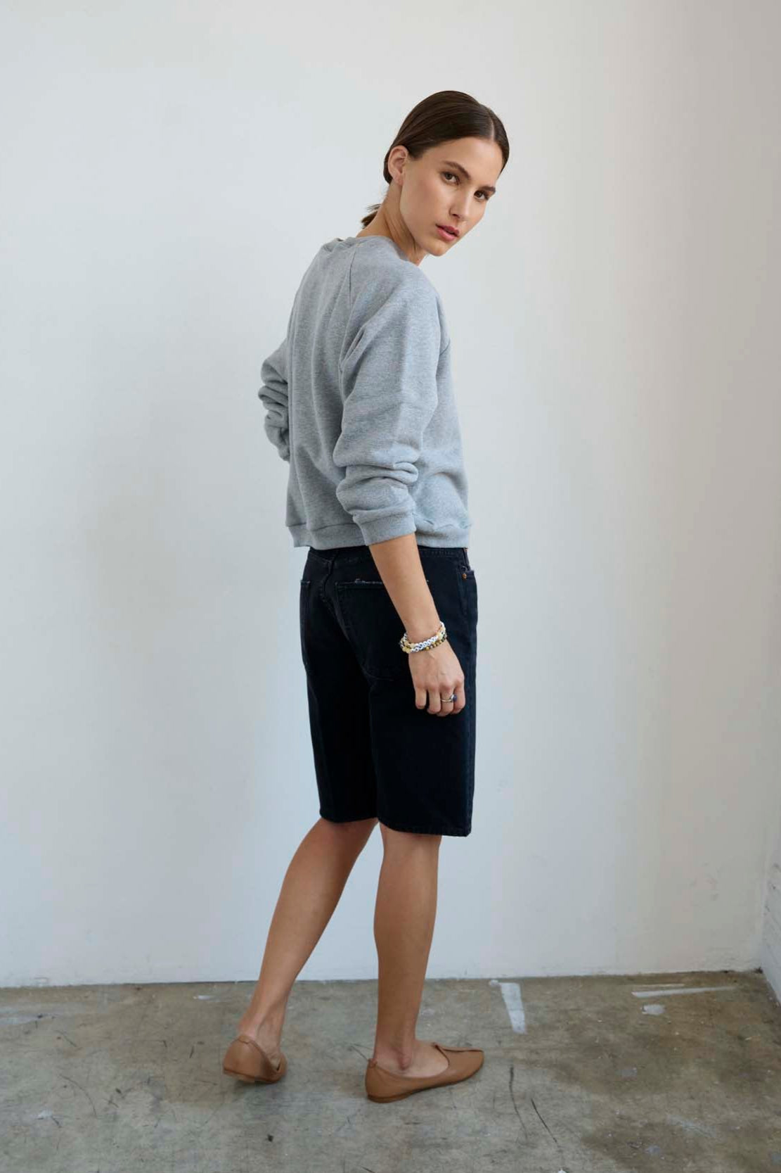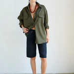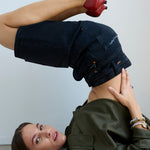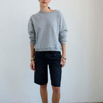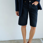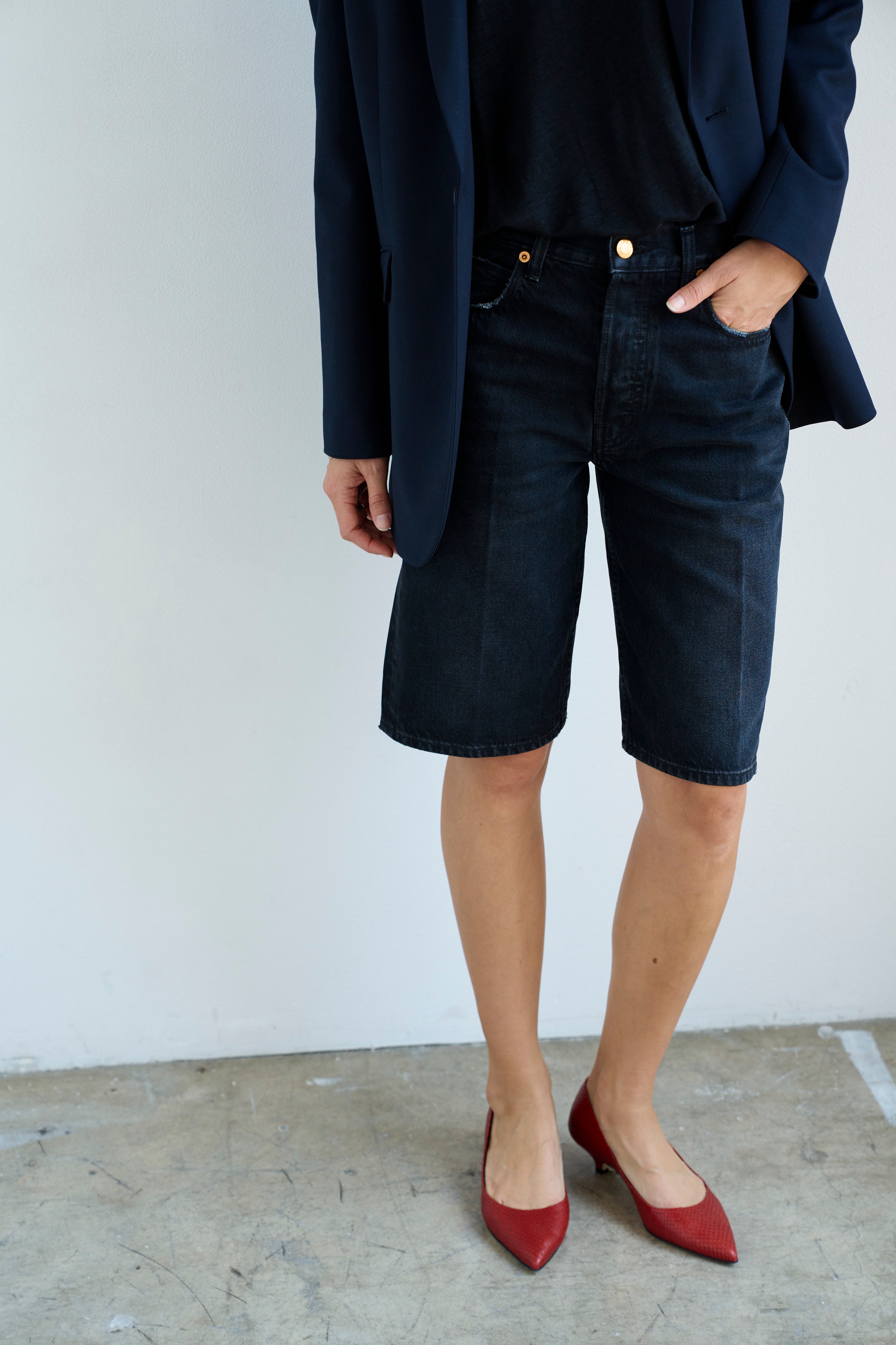 A slightly slouchy denim short with a hemmed finish and creased front. Polished meets casual in a soft black, vintage fade wash. Made in LA of Italian 100% cotton denim. The fit is true to size and the same as the Cut Knee short.
