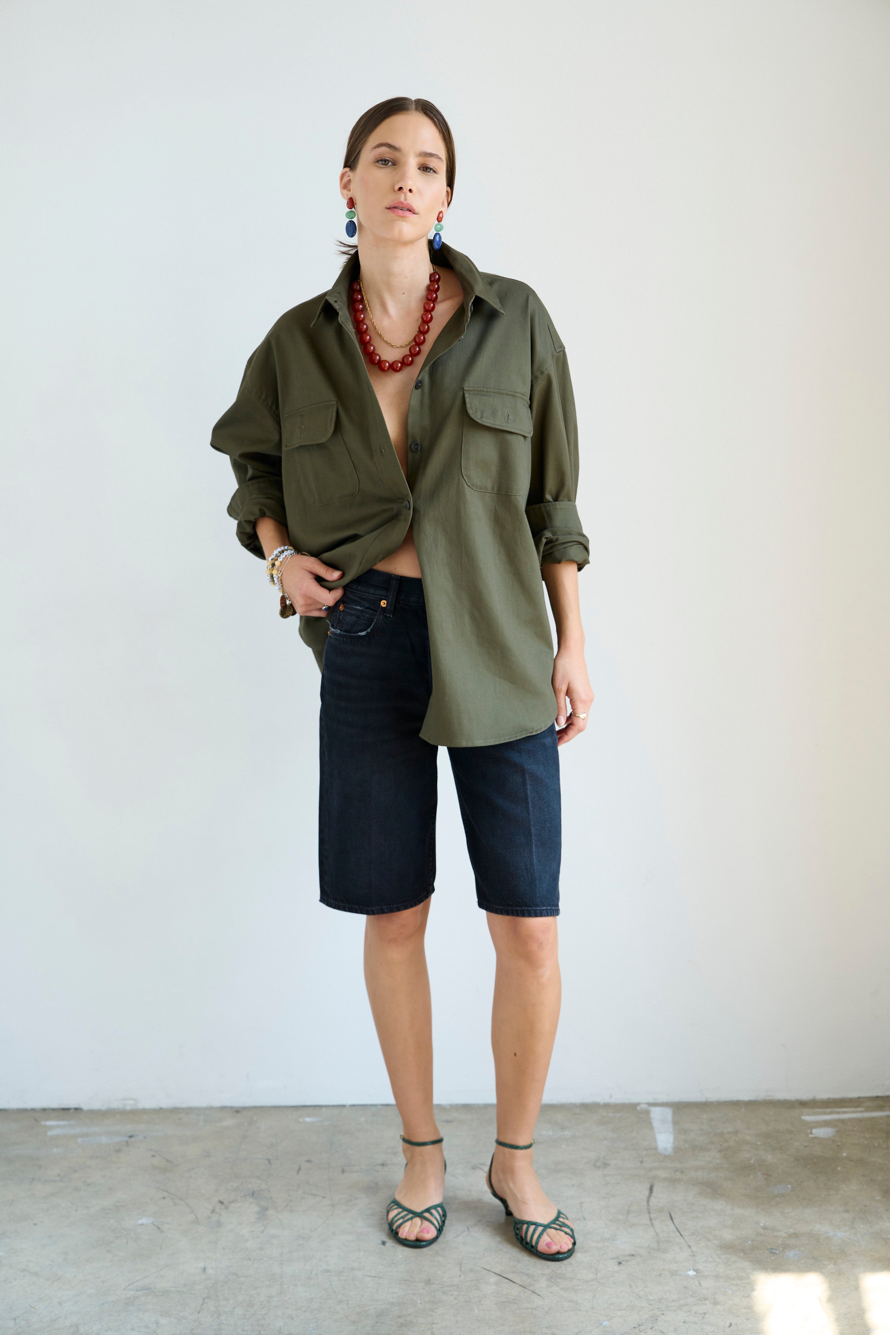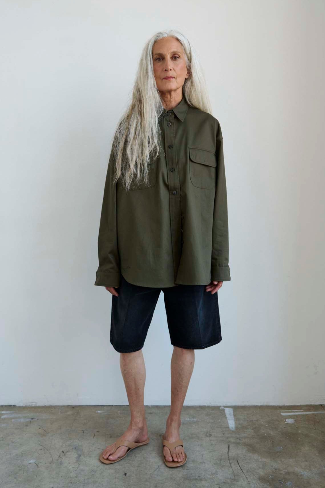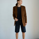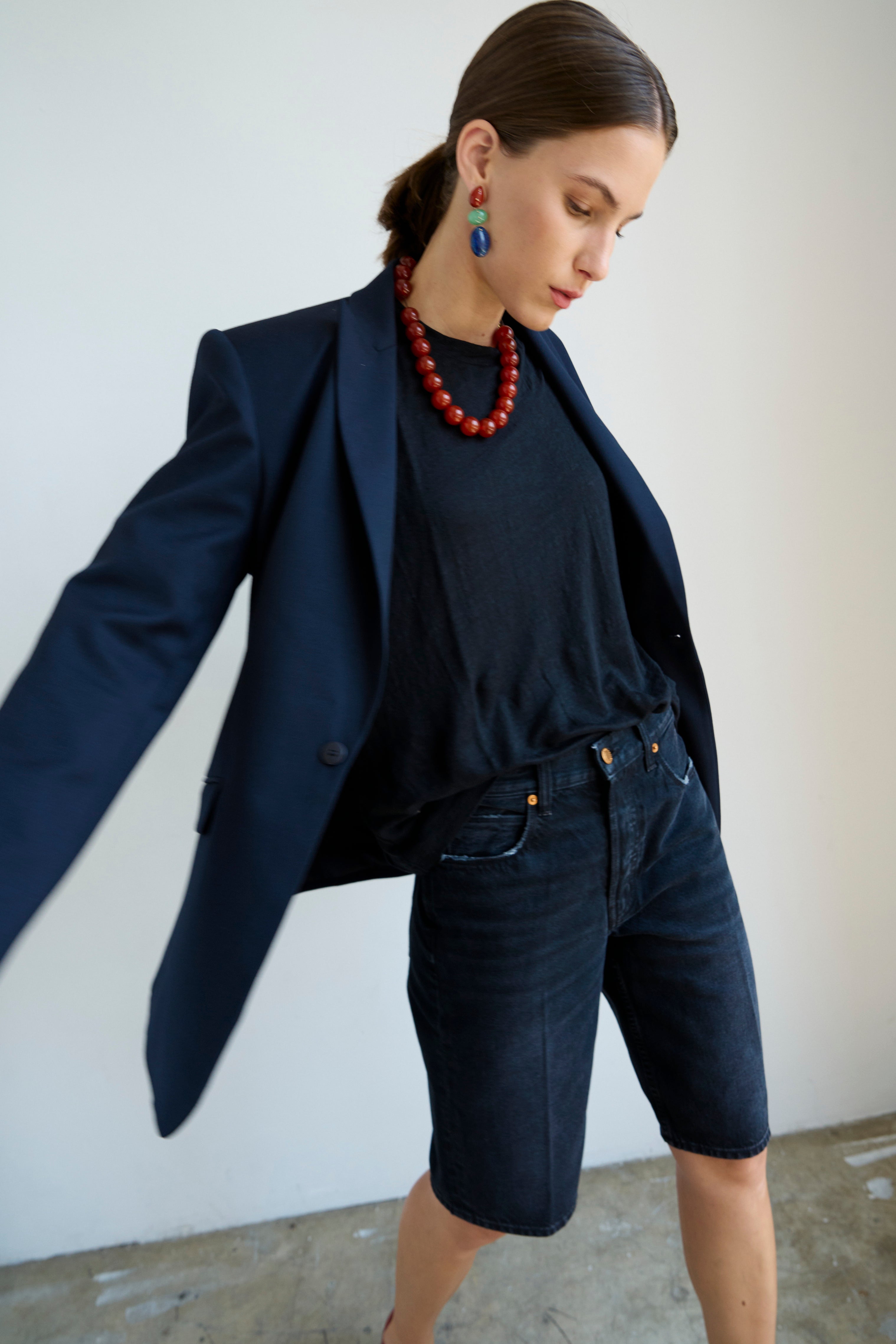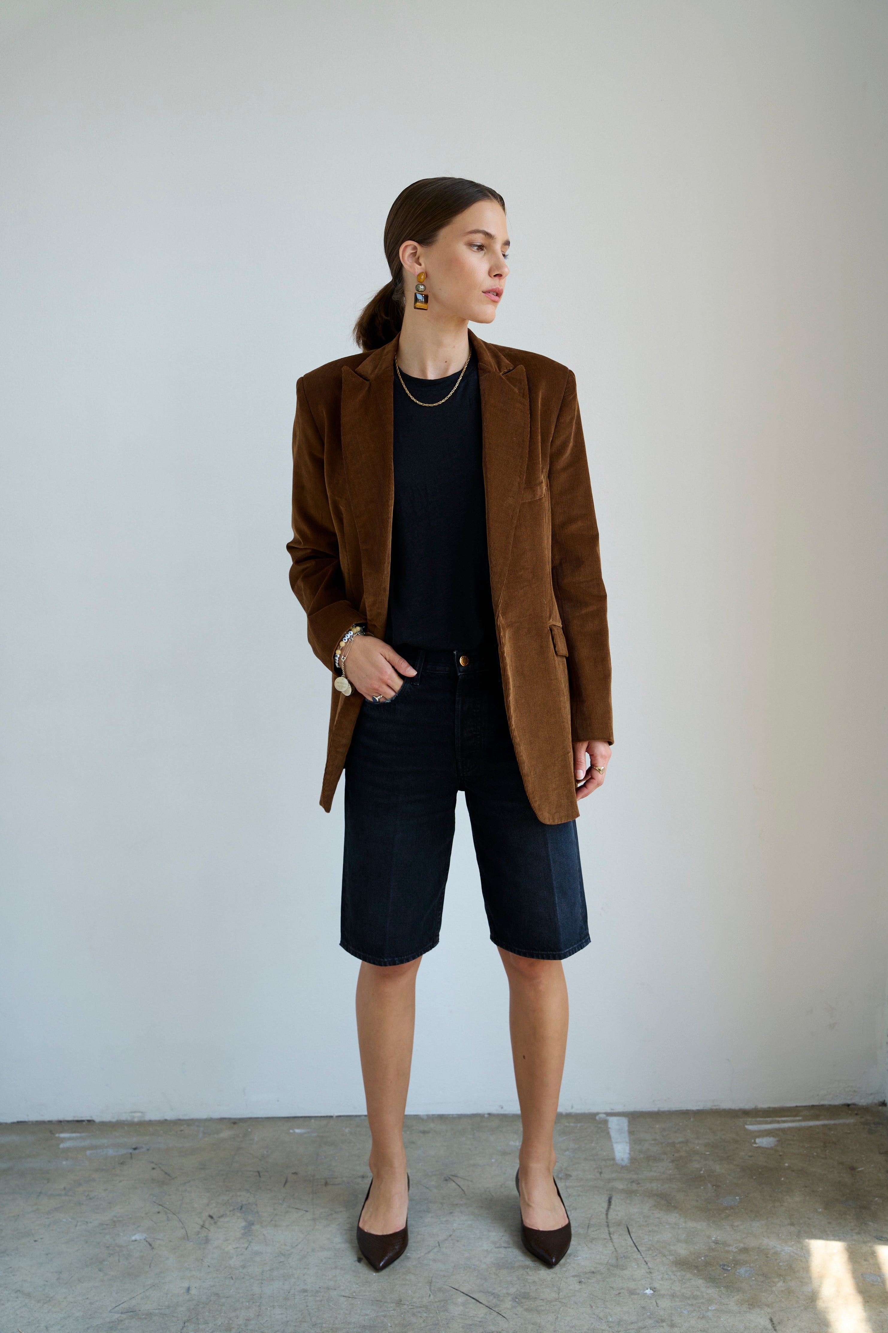 A slightly slouchy denim short with a hemmed finish and creased front. Polished meets casual in a soft black, vintage fade wash. Made in LA of Italian 100% cotton denim. The fit is true to size and the same as the Cut Knee short.