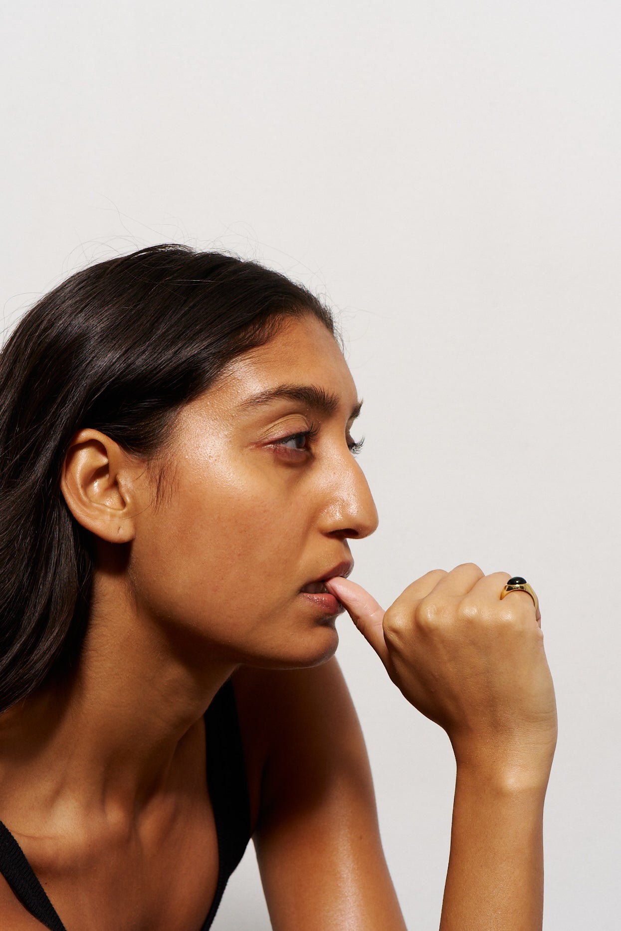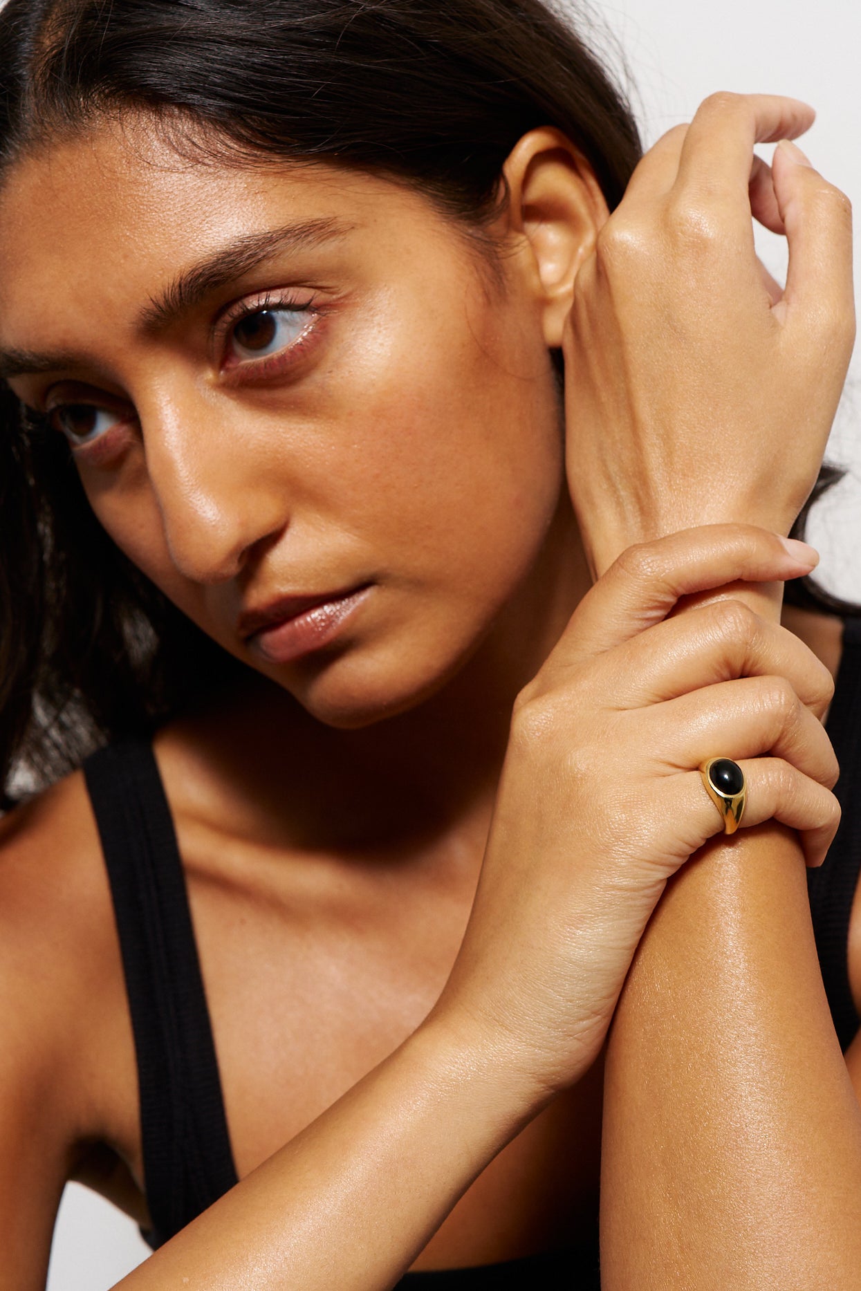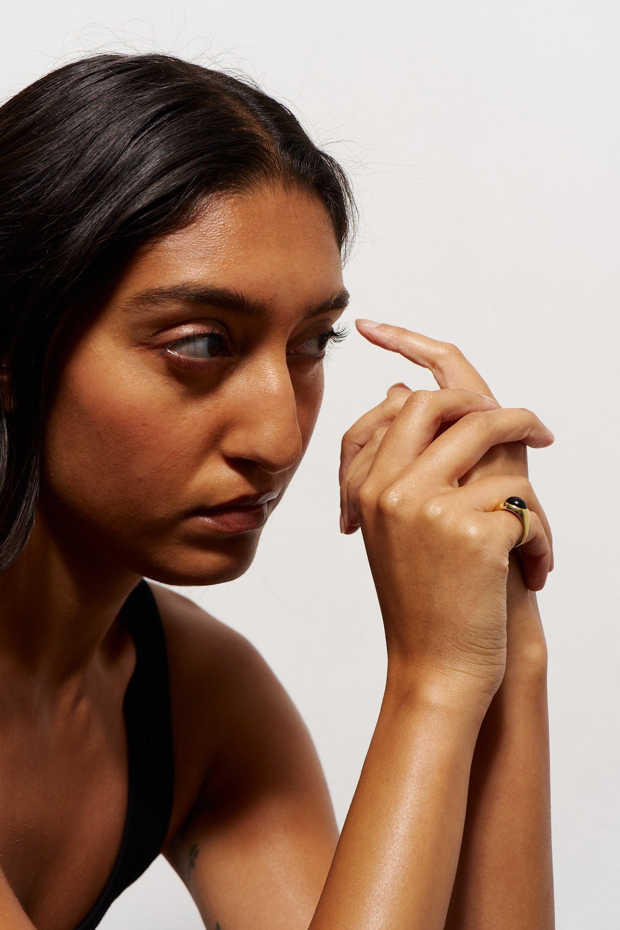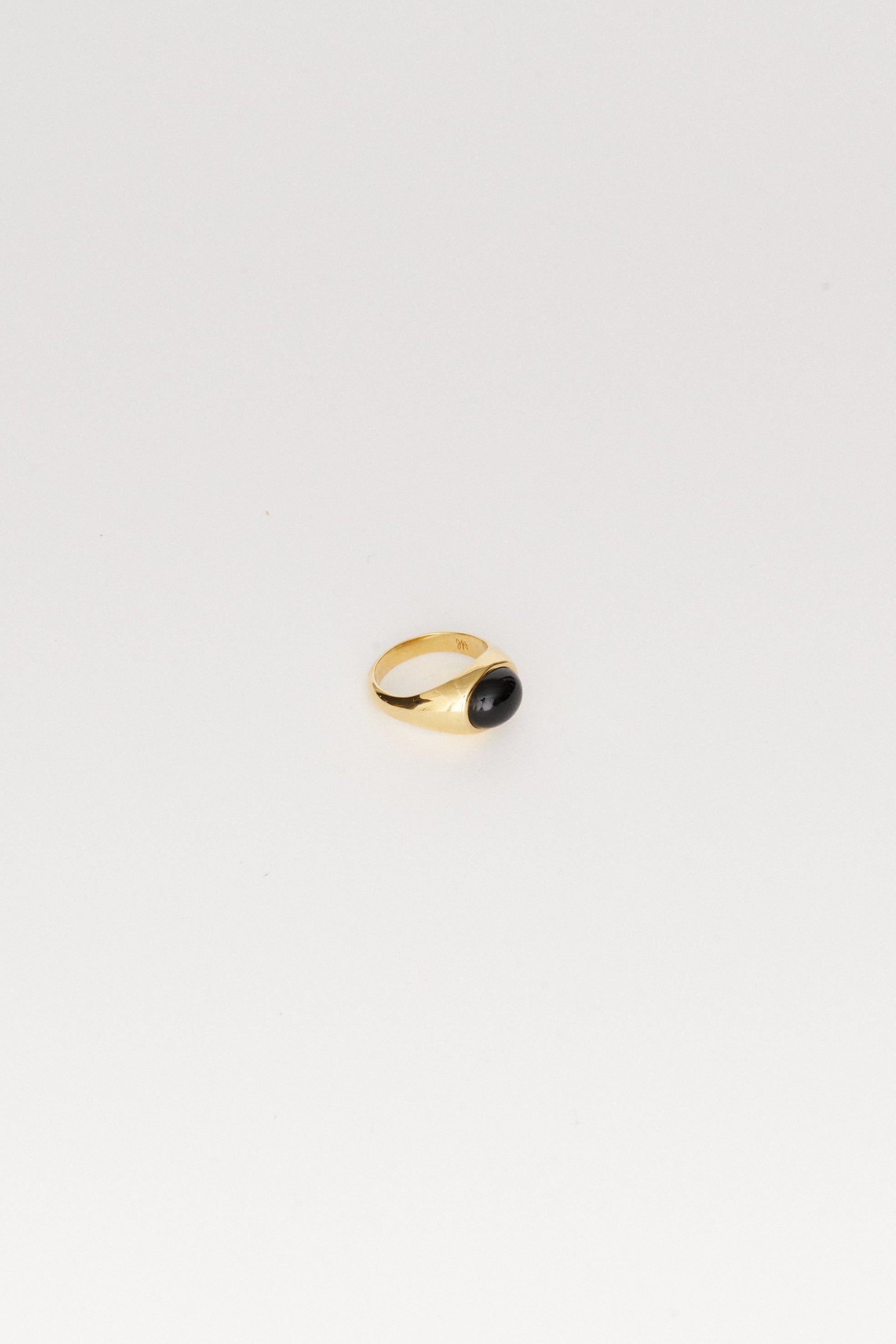 Introducing the Francis Oval Signet Ring in Onyx.  Inspired by vintage men's signet rings, the smooth oval cabochon stone is semi-precious. The natural stone is custom hand-cut and secured in a bezel setting. The ring has been designed to feel timeworn, with soft edges, something you have worn forever.