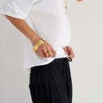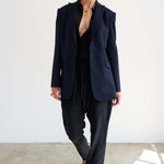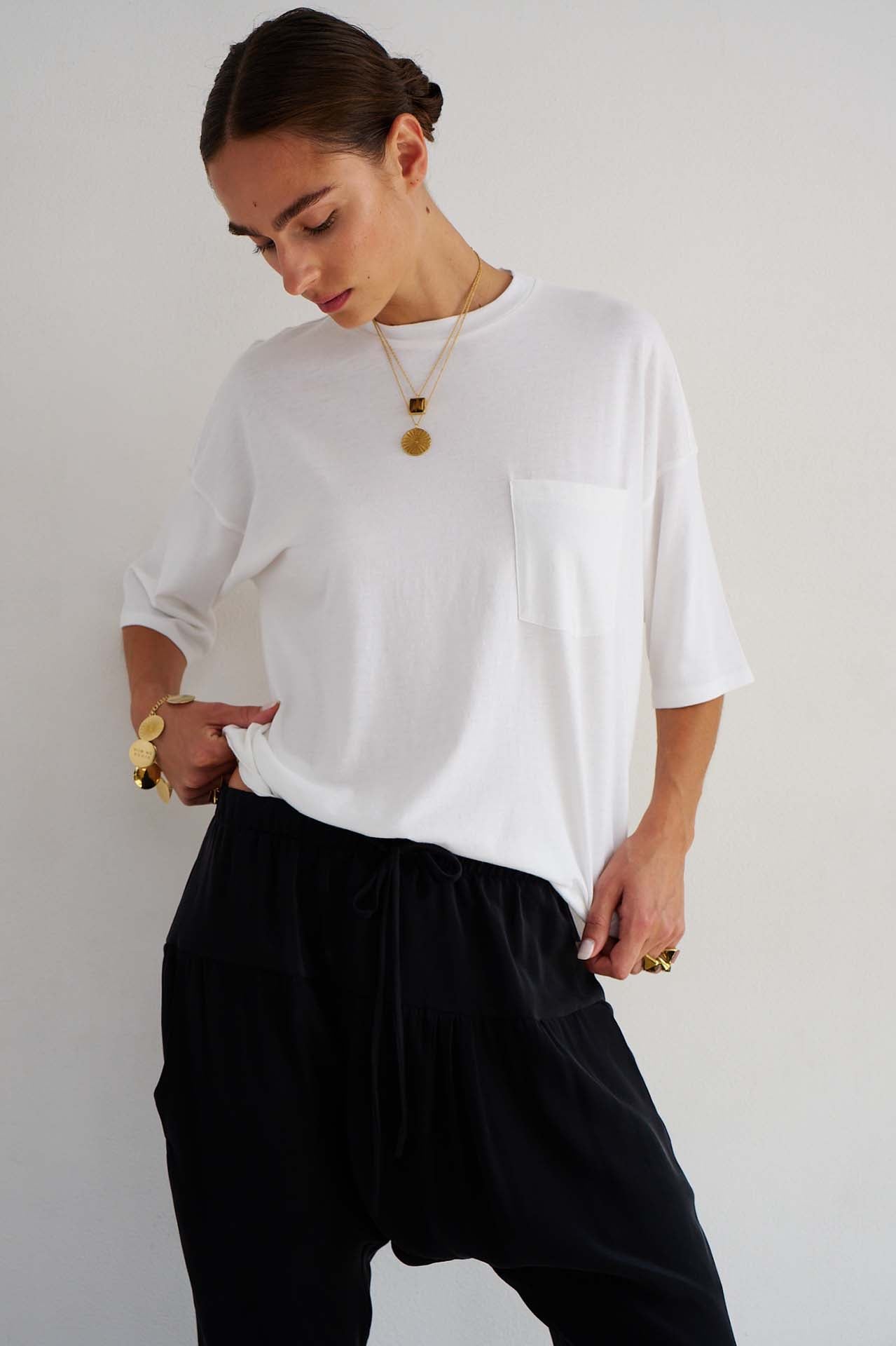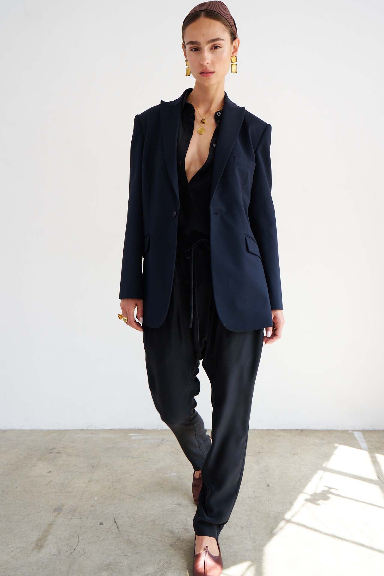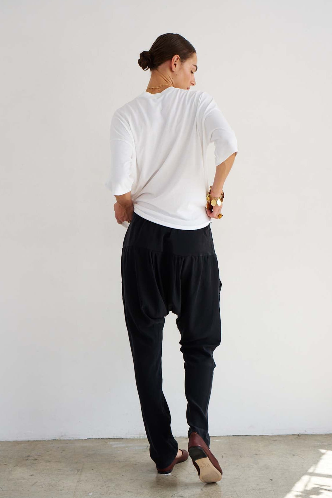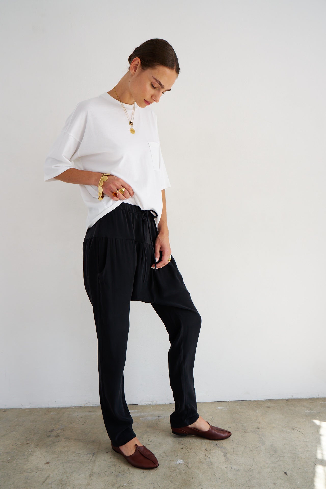 A drawstring style waist with elastic structure. A dropped yoke with low pockets and pleated details that create draped fullness. A slim leg.