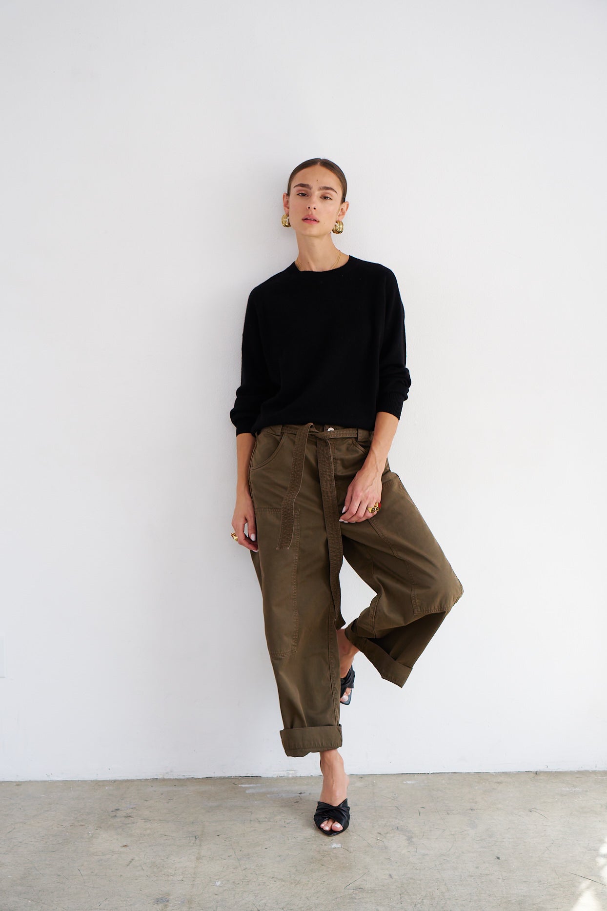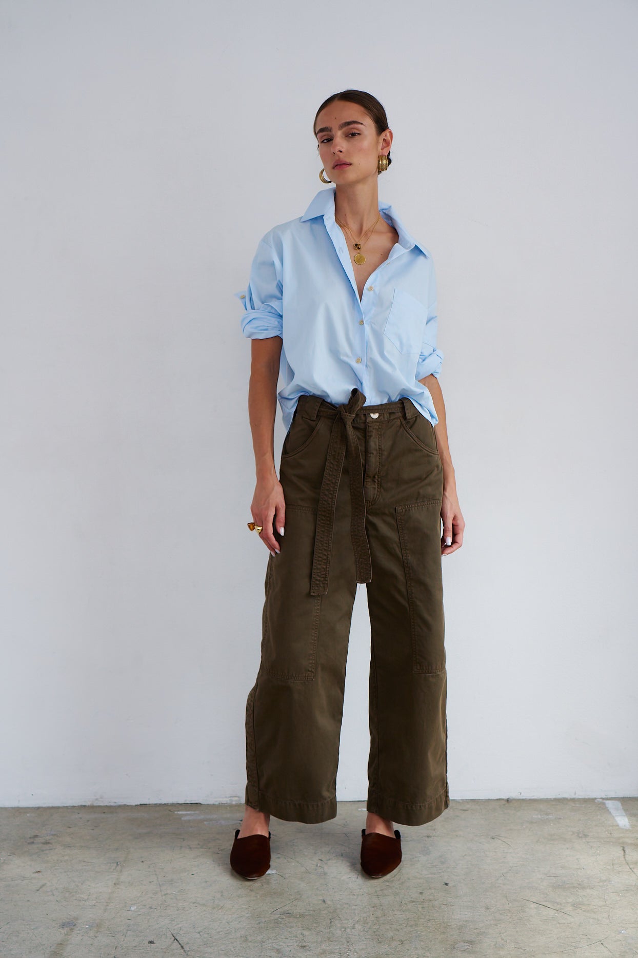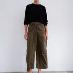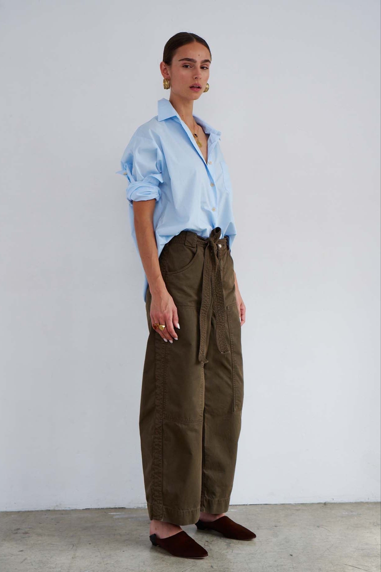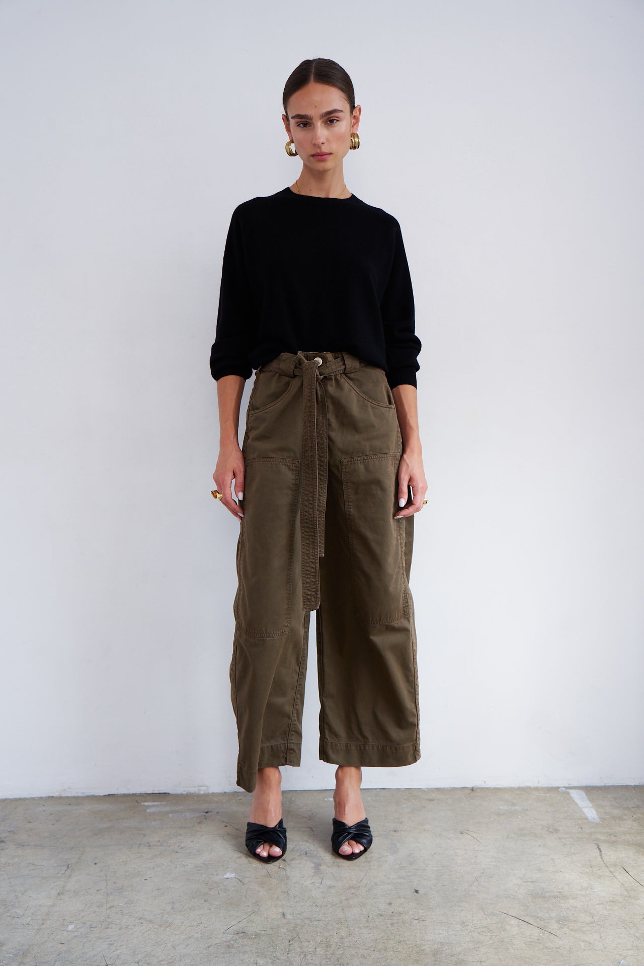 A rounded leg shape contrasts a natural fit waist.  Patch forward details and Obi Inspired belt detail. A wide cropped hem at ankle length, perfect for cuffs that show off loafers. Tailored in Japanese brushed twill. Garment dyed for a soft drape, washed-in appeal and undeniable ease.