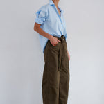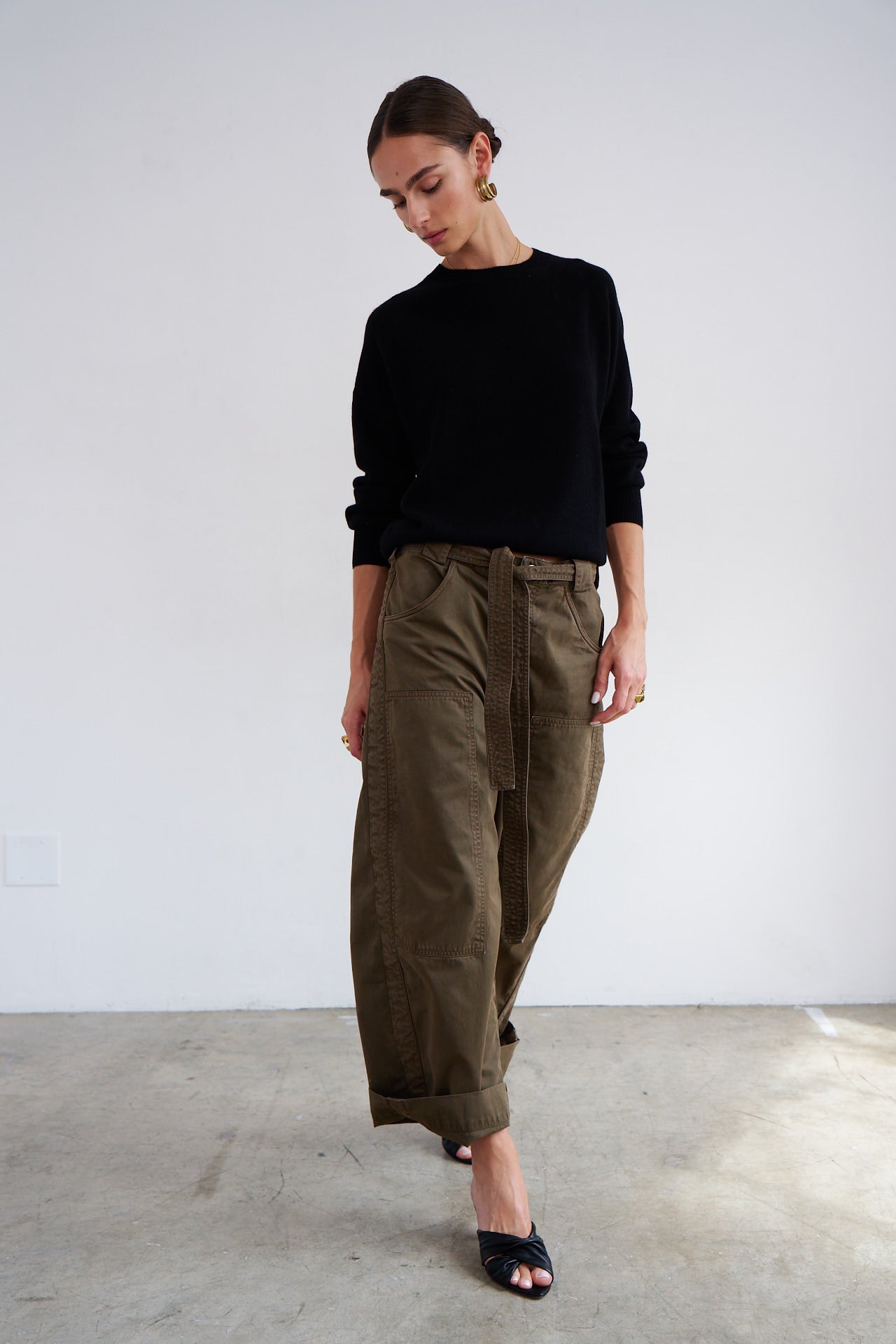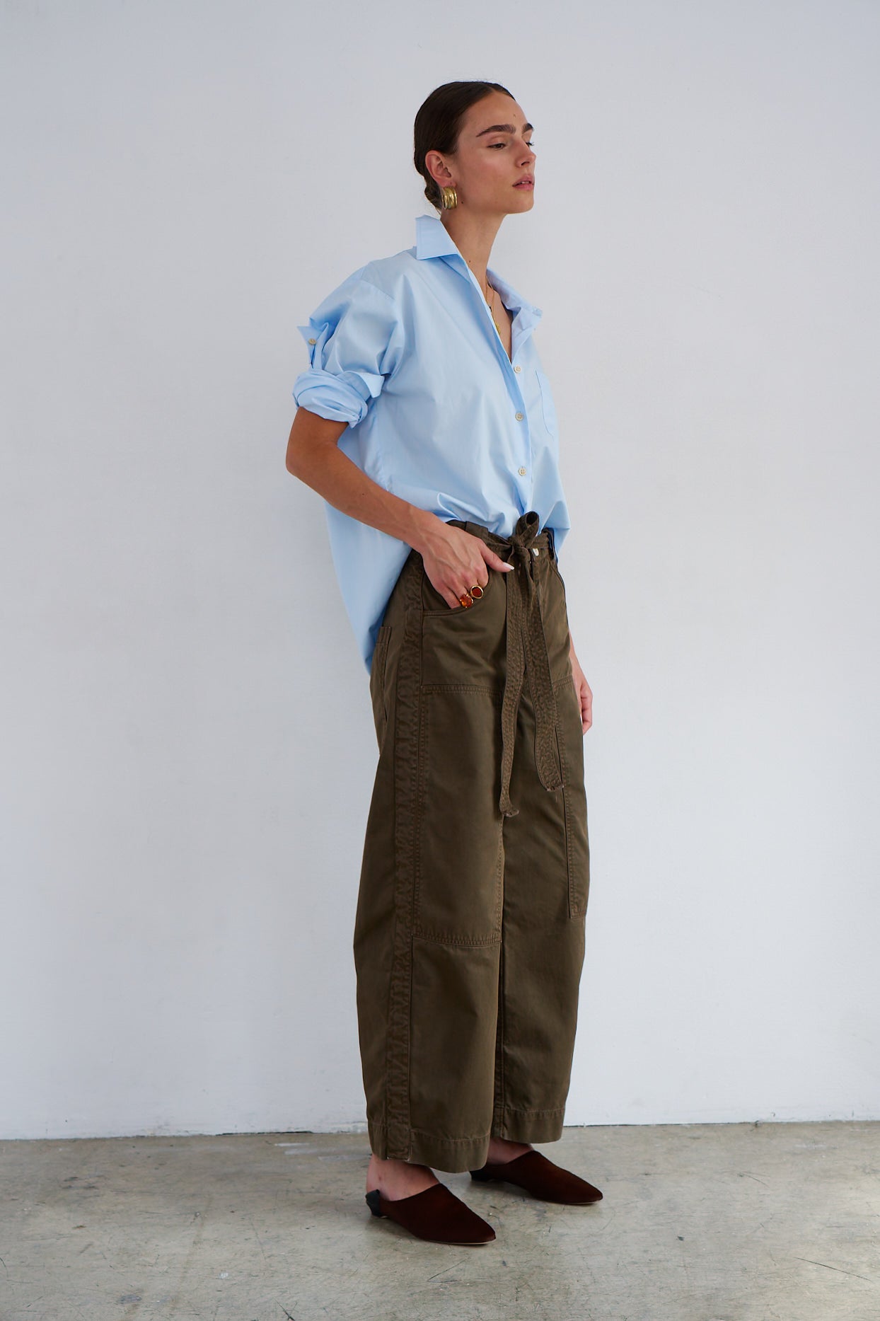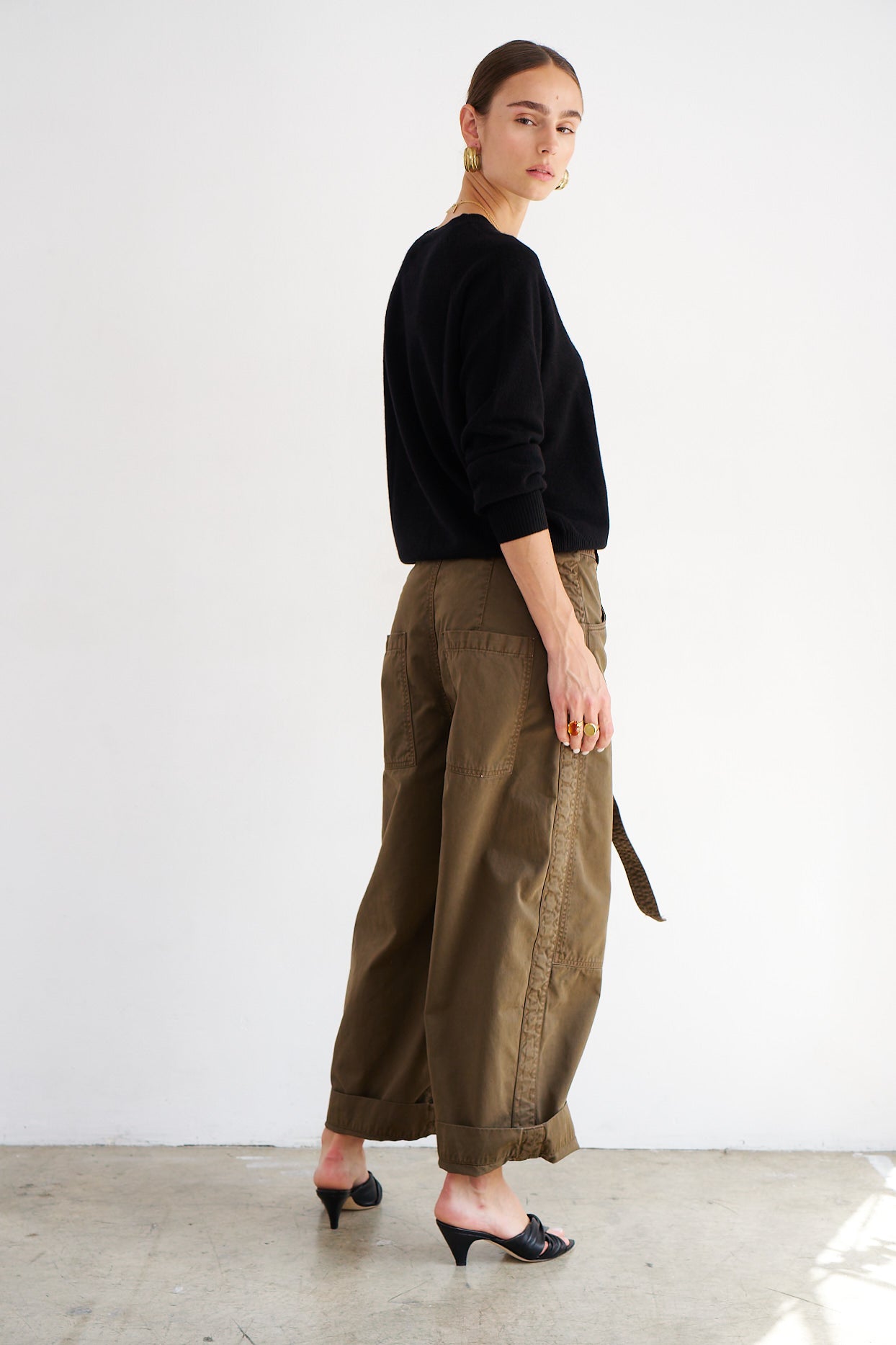 A rounded leg shape contrasts a natural fit waist.  Patch forward details and Obi Inspired belt detail. A wide cropped hem at ankle length, perfect for cuffs that show off loafers. Tailored in Japanese brushed twill. Garment dyed for a soft drape, washed-in appeal and undeniable ease.