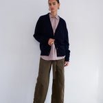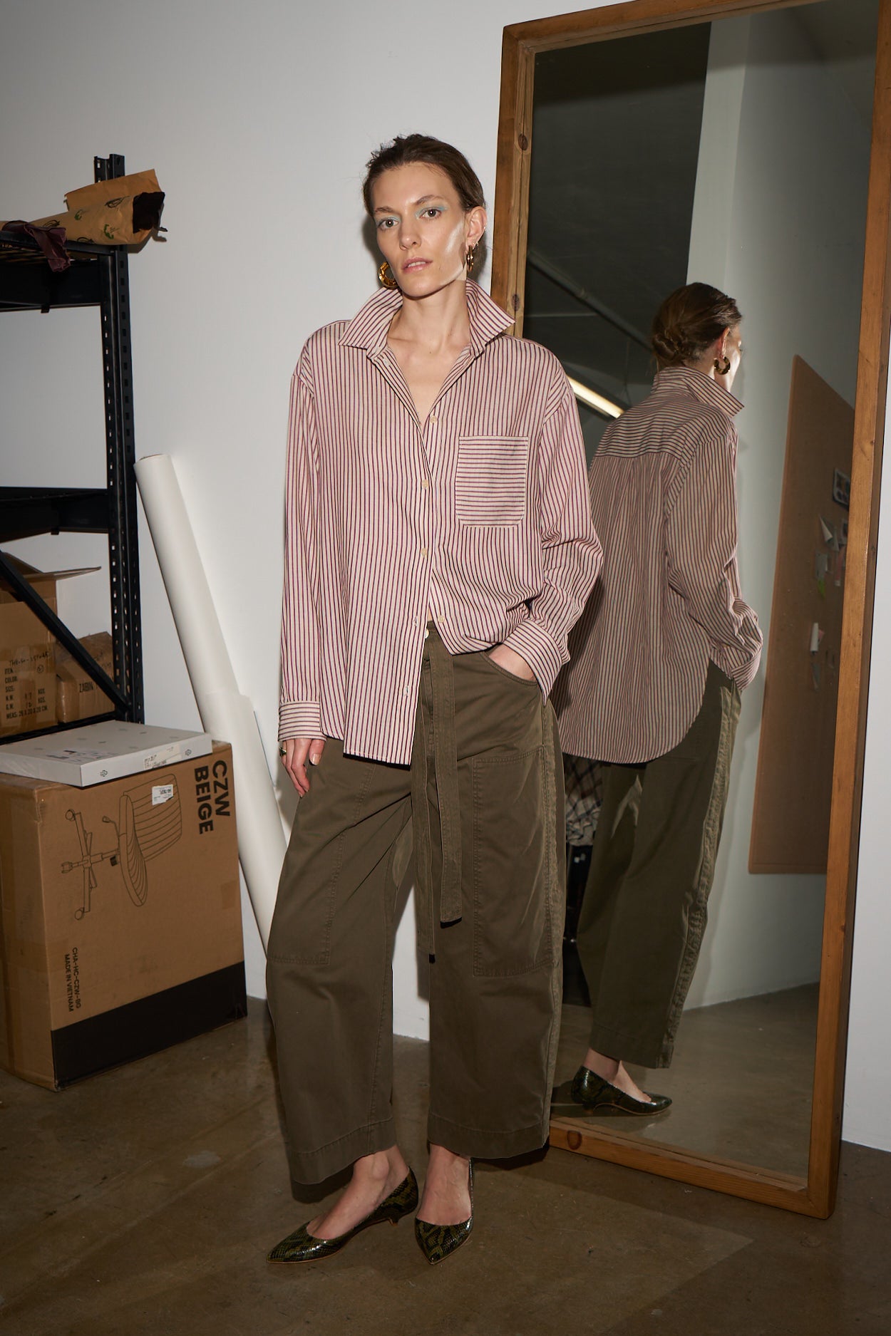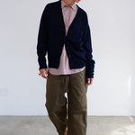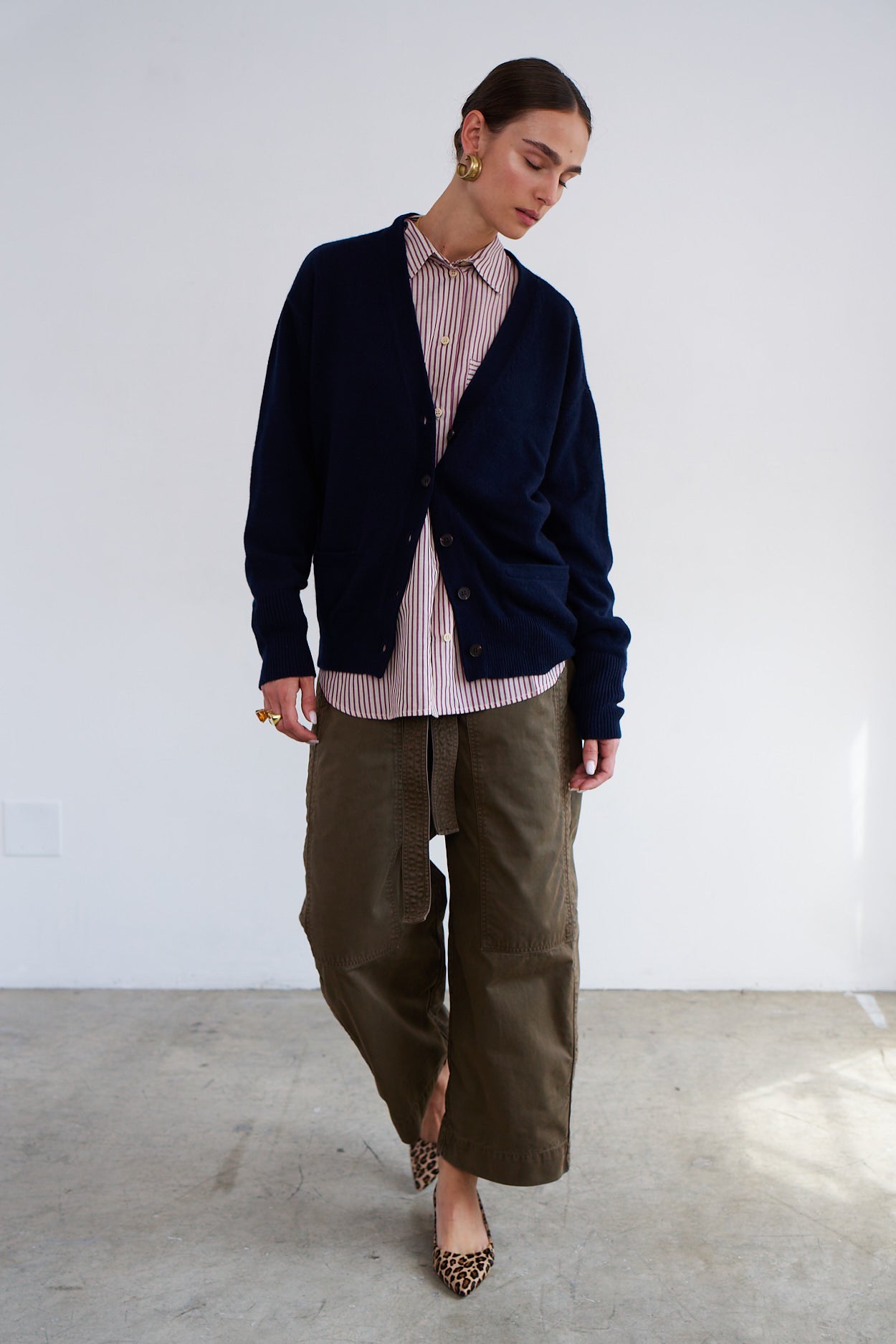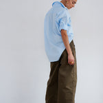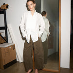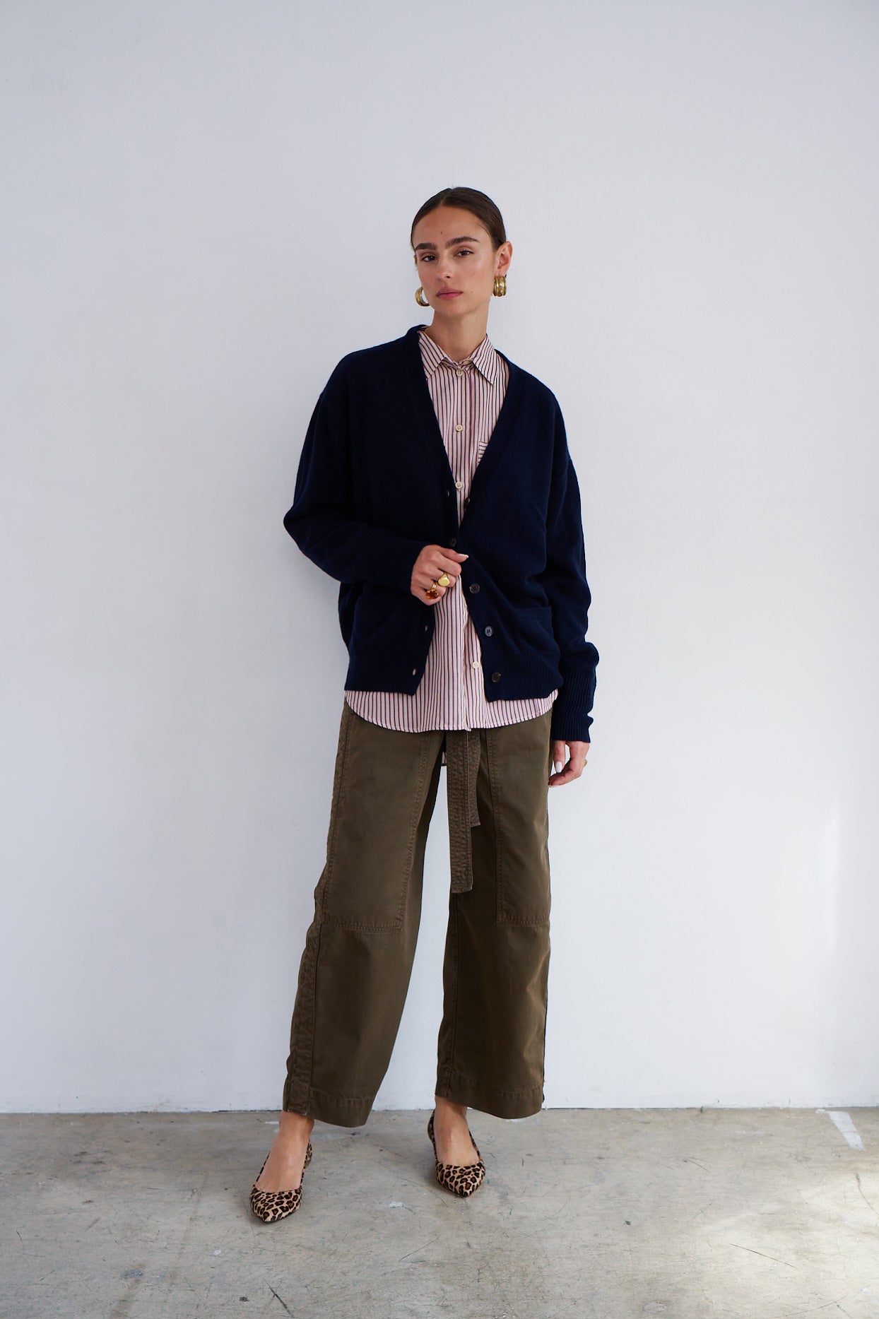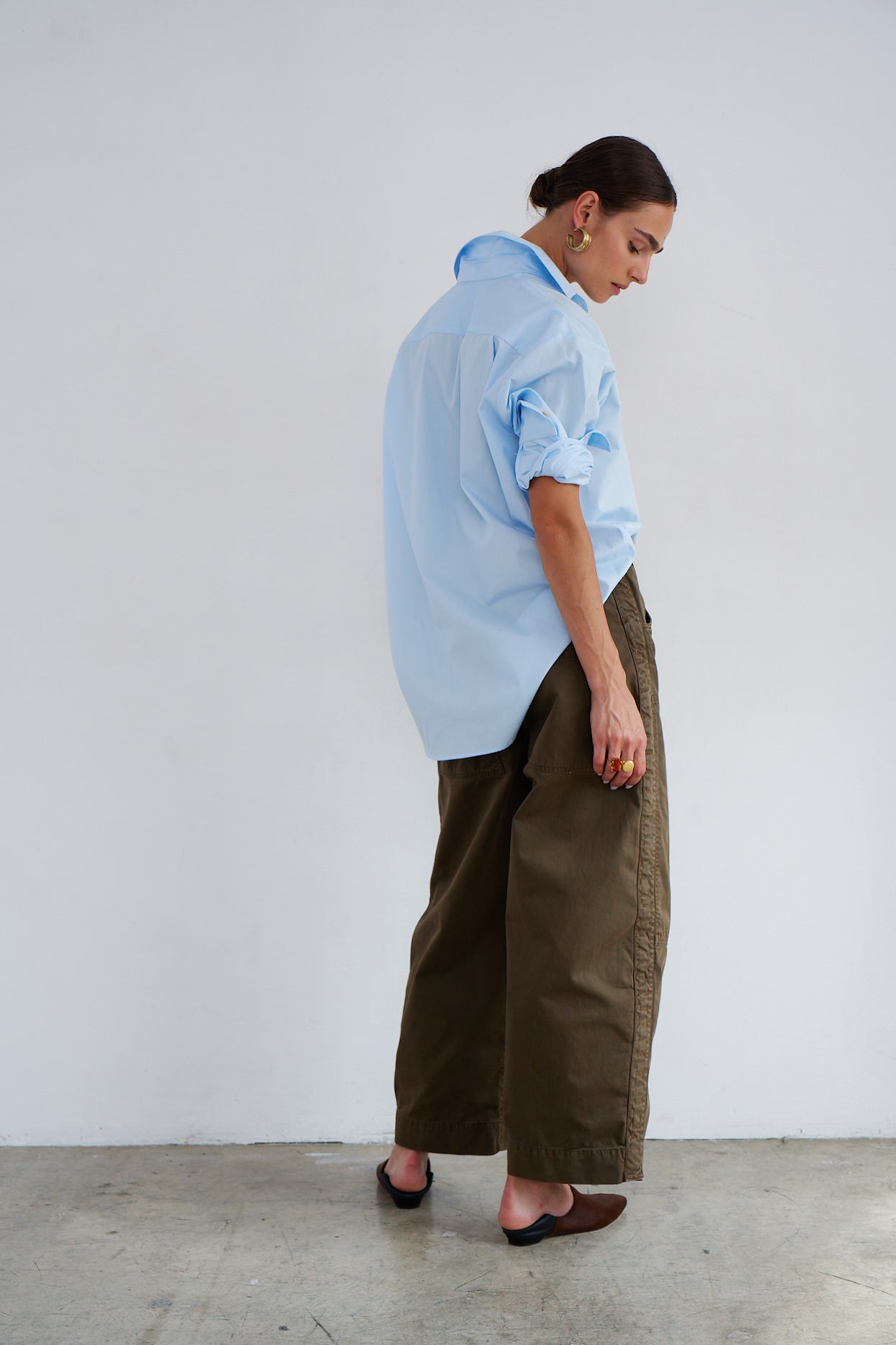 A rounded leg shape contrasts a natural fit waist.  Patch forward details and Obi Inspired belt detail. A wide cropped hem at ankle length, perfect for cuffs that show off loafers. Tailored in Japanese brushed twill. Garment dyed for a soft drape, washed-in appeal and undeniable ease.