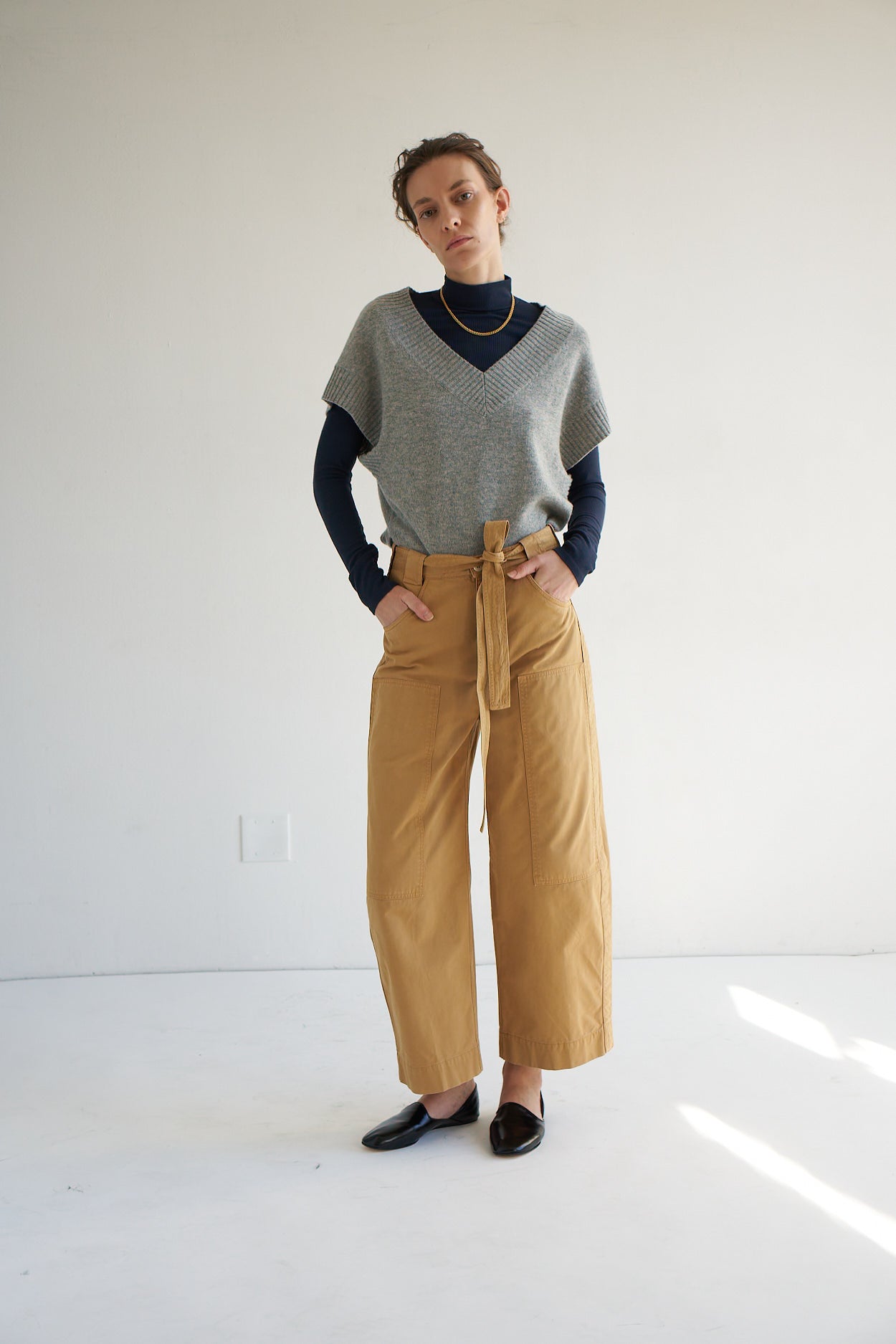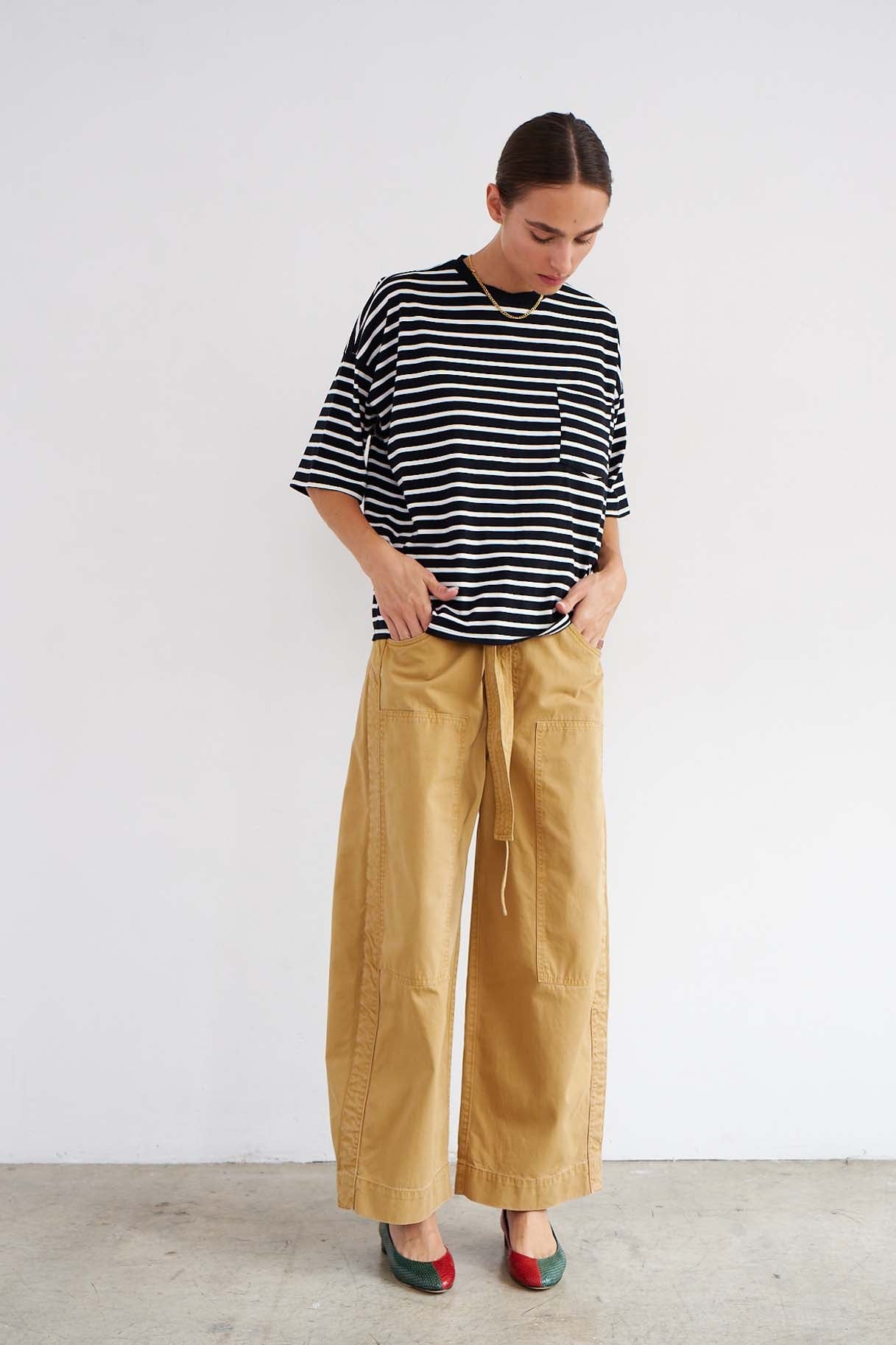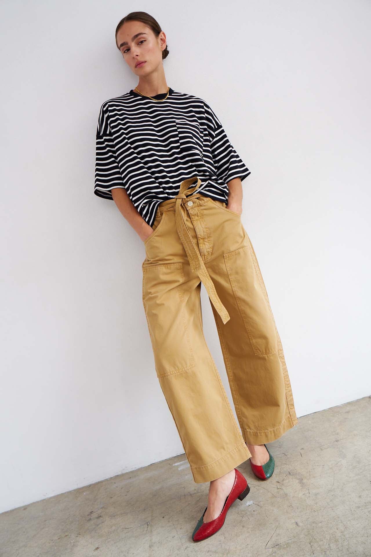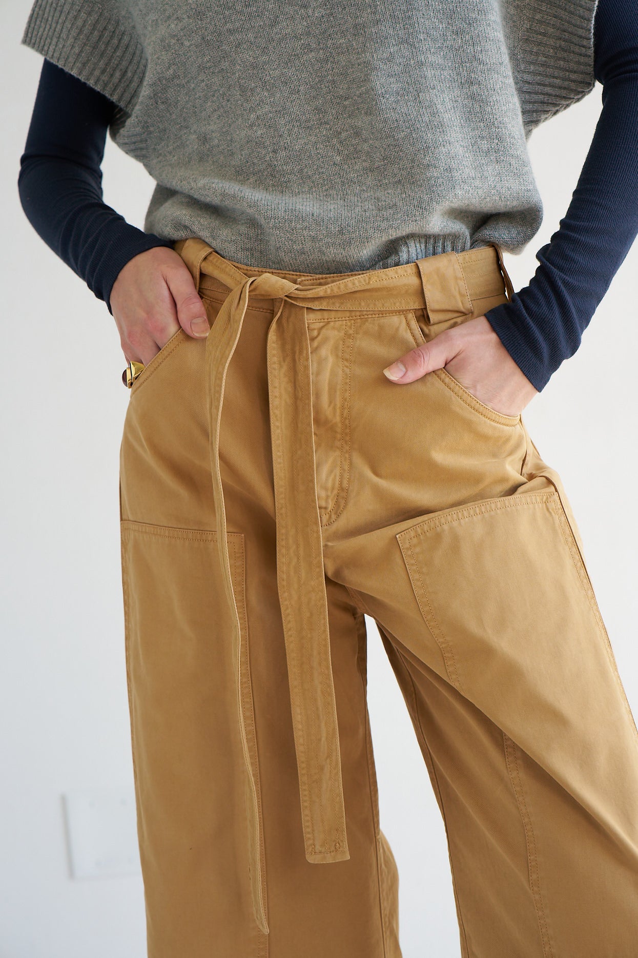 A rounded leg shape contrasts a natural fit waist.  Patch forward details and Obi Inspired belt detail. A wide cropped hem at ankle length, perfect for cuffs that show off loafers. Tailored in Japanese brushed twill. Garment dyed for a soft drape, washed-in appeal and undeniable ease.