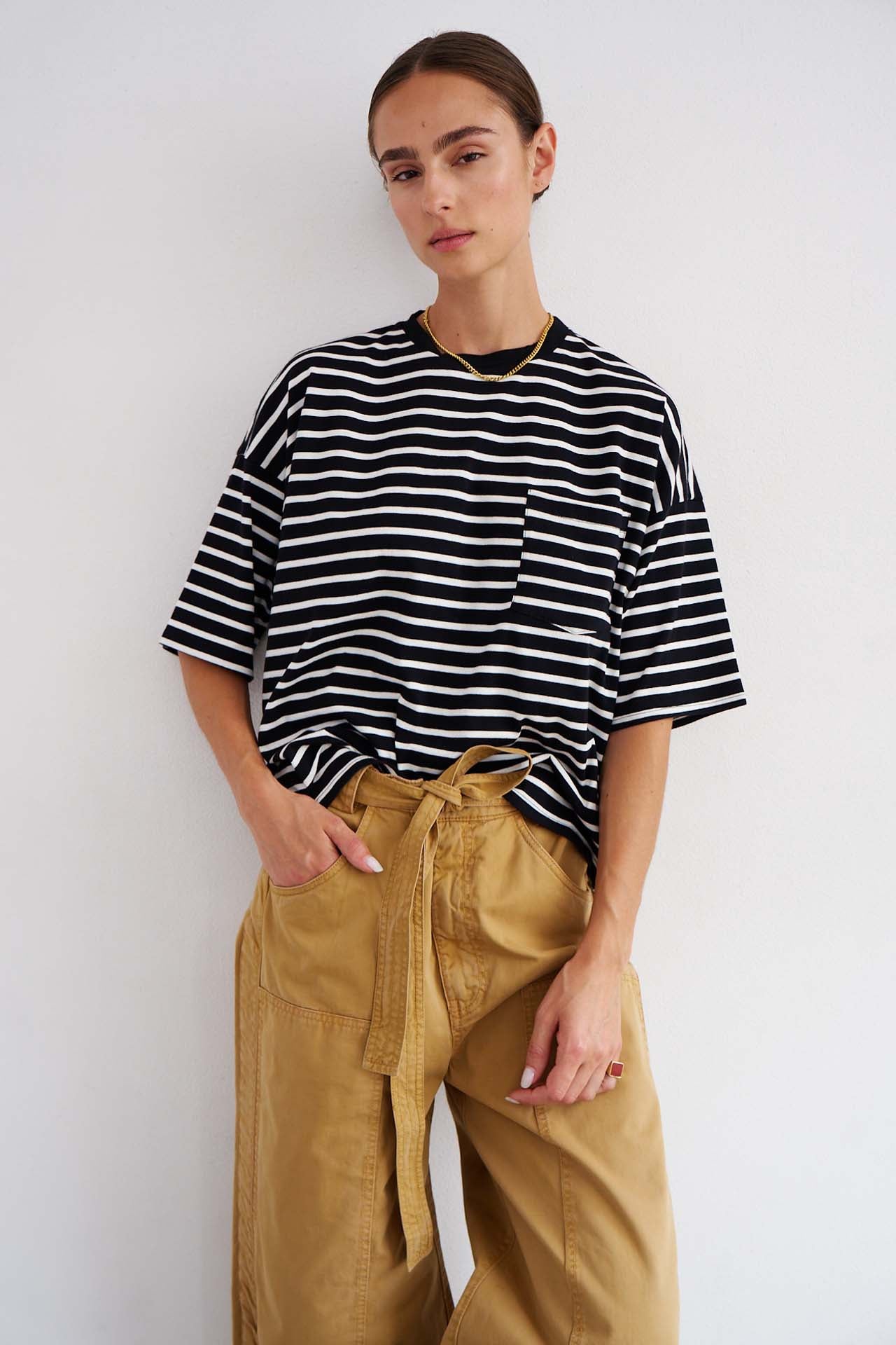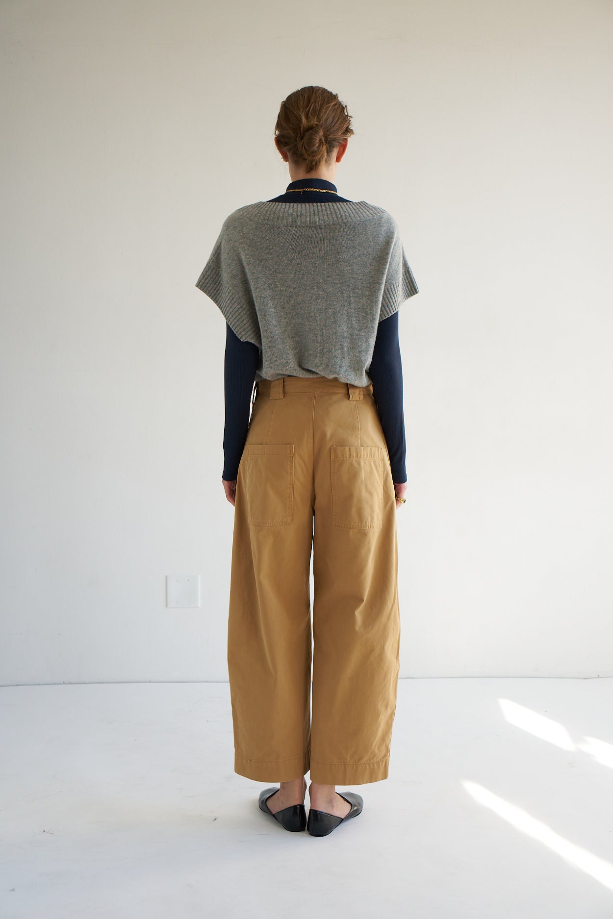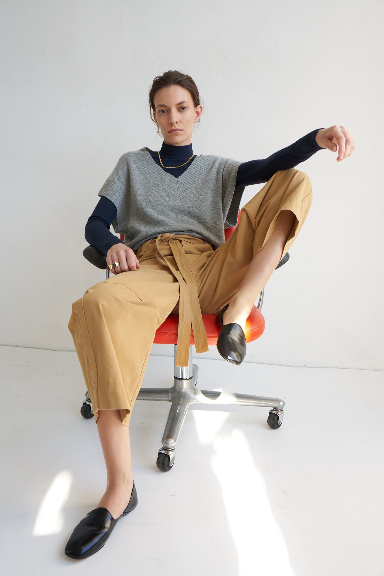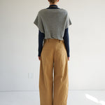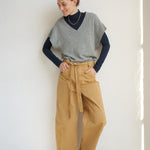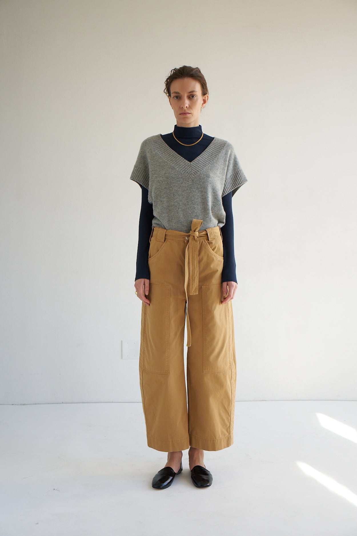 A rounded leg shape contrasts a natural fit waist.  Patch forward details and Obi Inspired belt detail. A wide cropped hem at ankle length, perfect for cuffs that show off loafers. Tailored in Japanese brushed twill. Garment dyed for a soft drape, washed-in appeal and undeniable ease.