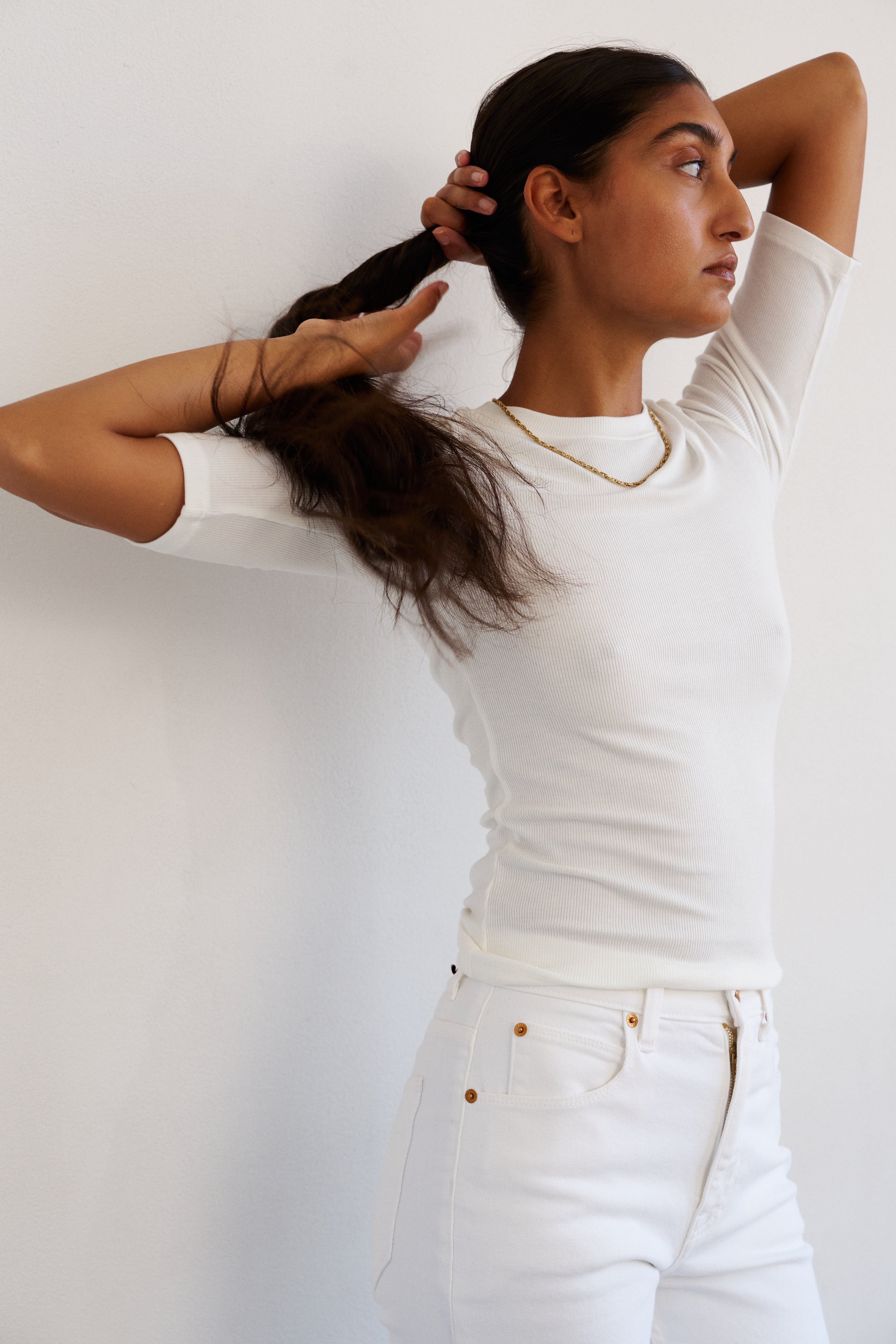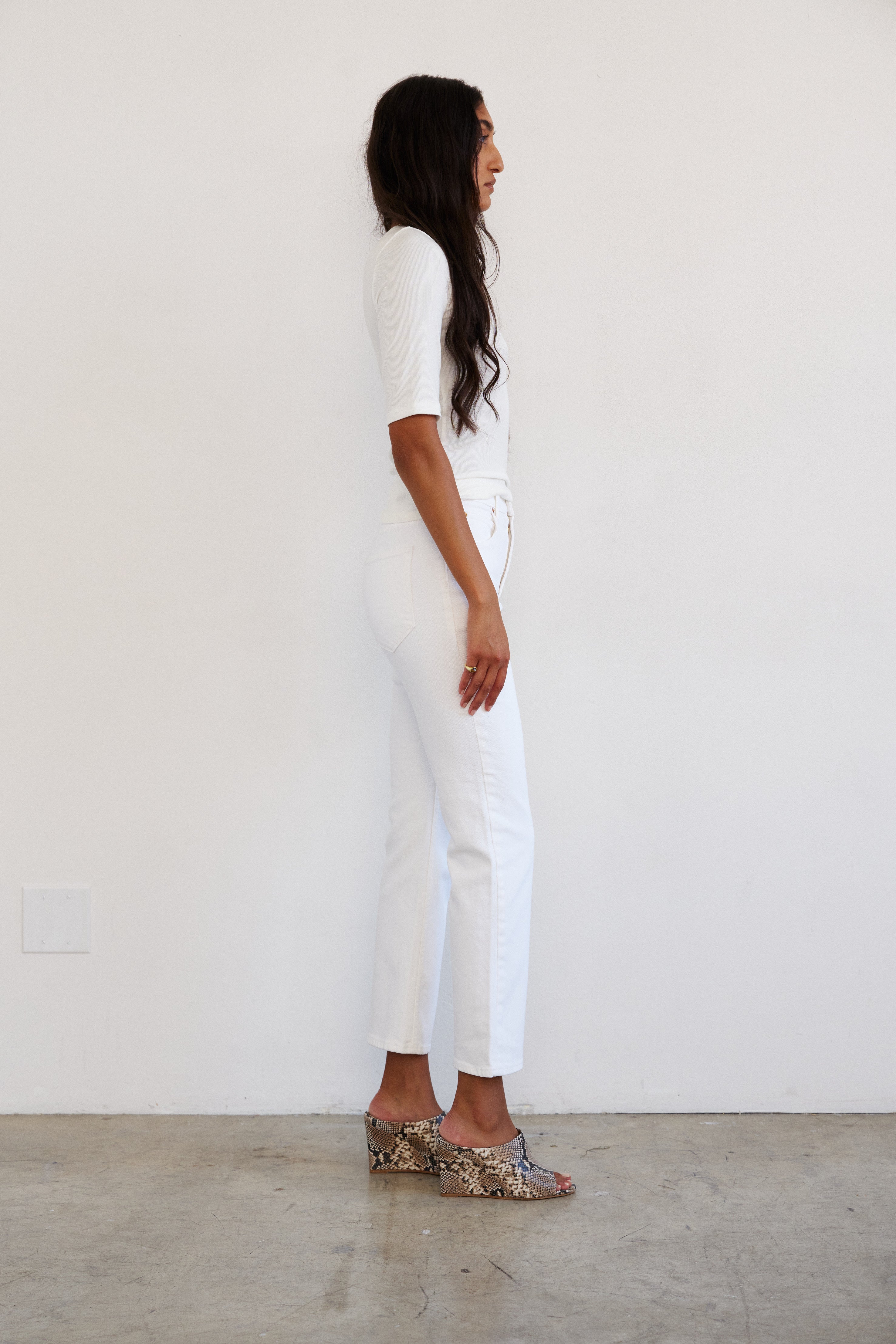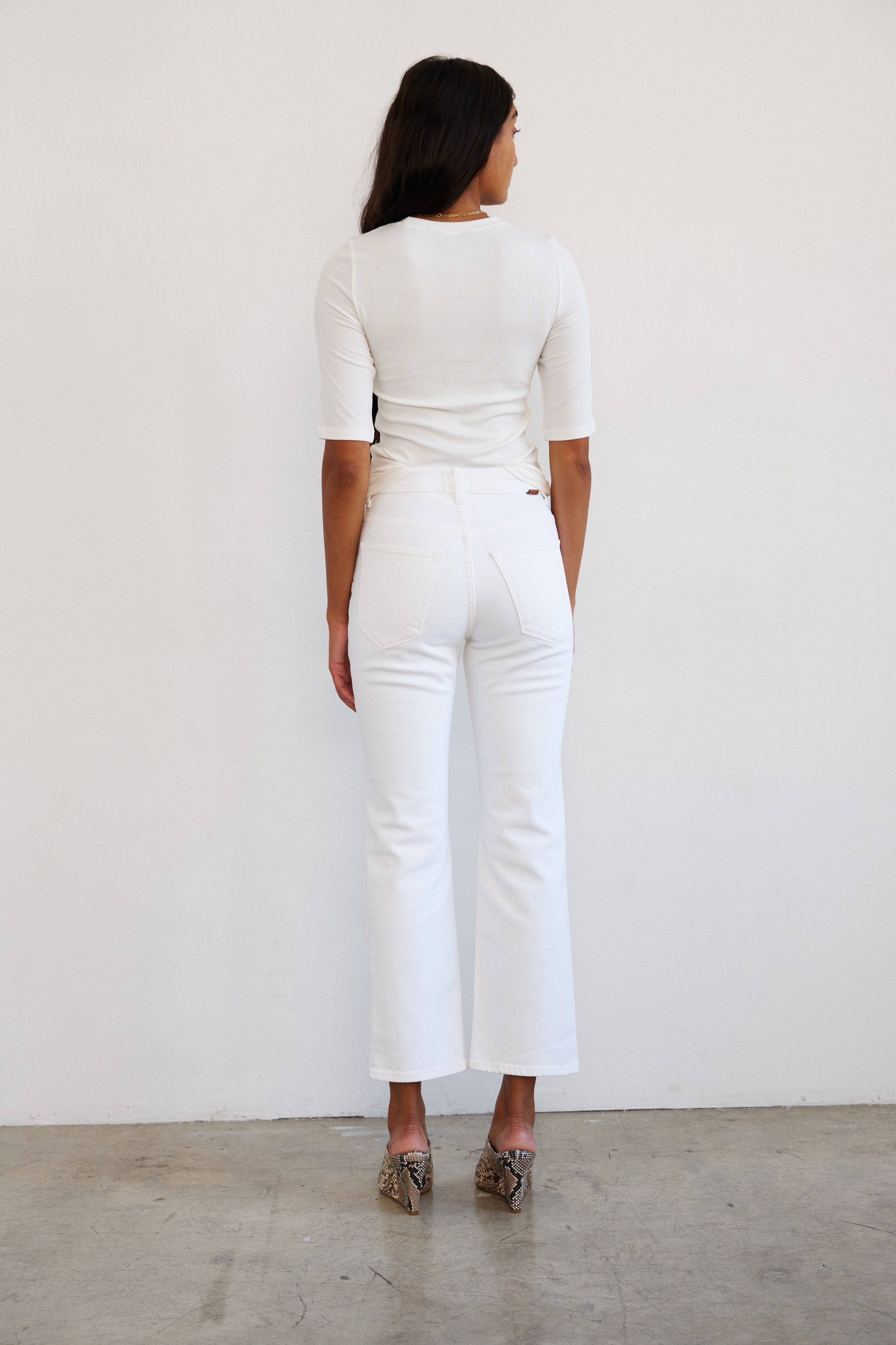 Soft White is the perfect spring white. Bright without an optic hue. Our structured stretch white denim feels polished and on point.