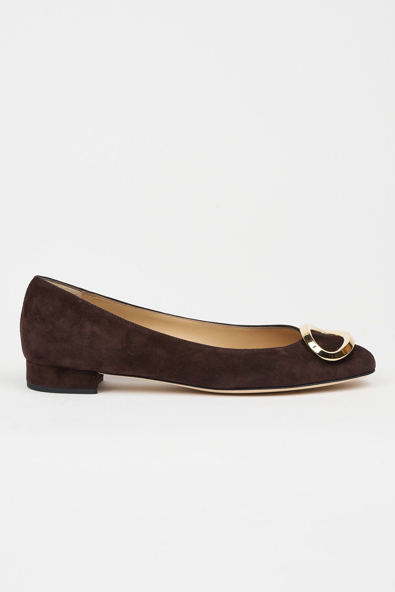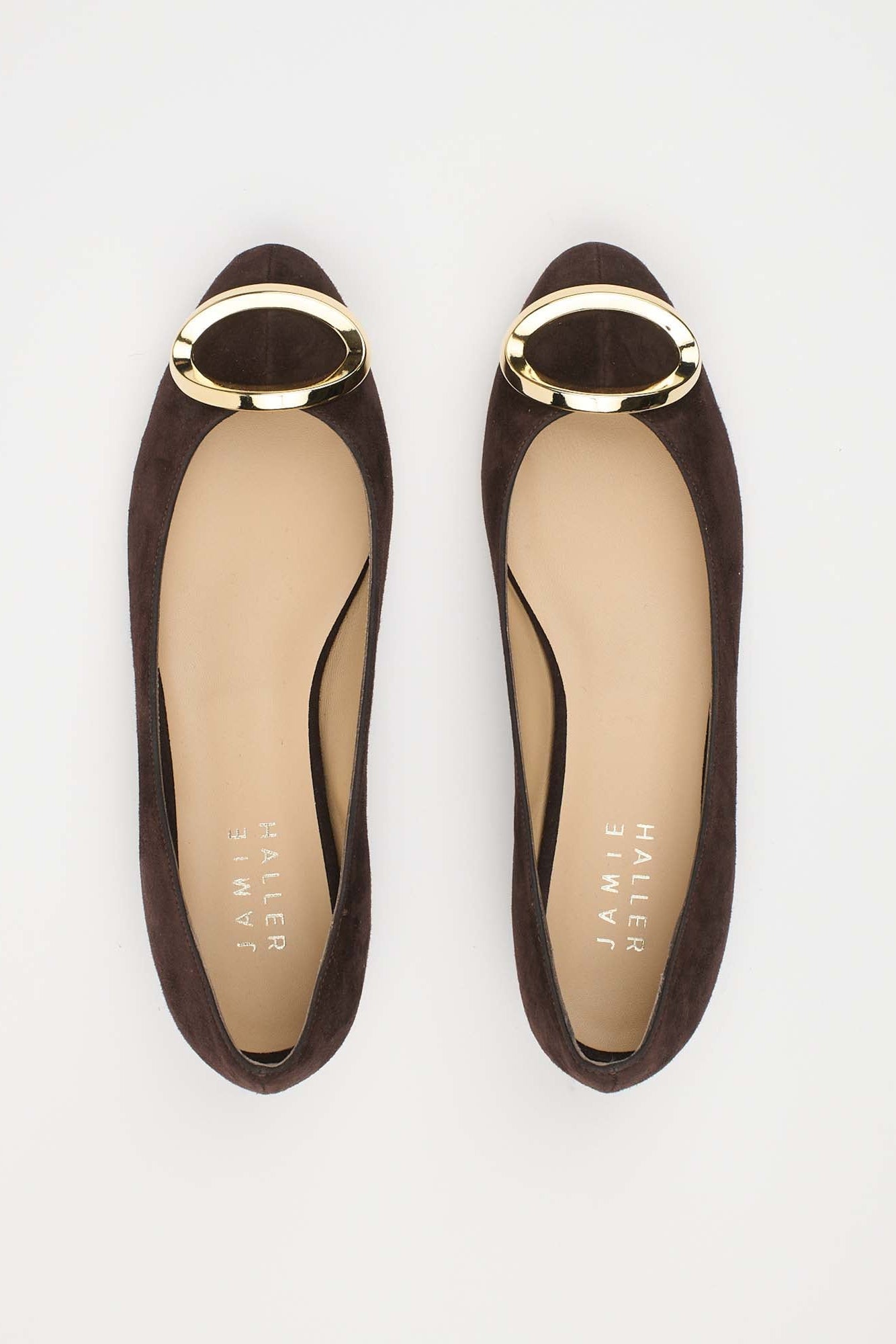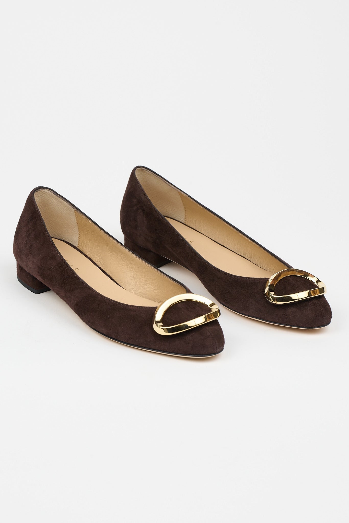 A new toe, soft and demur but cool. A low vamp and lady heel. Italian beautiful brass hardware in an organic oval. Handmade in Italian Suede with lamb lining.