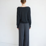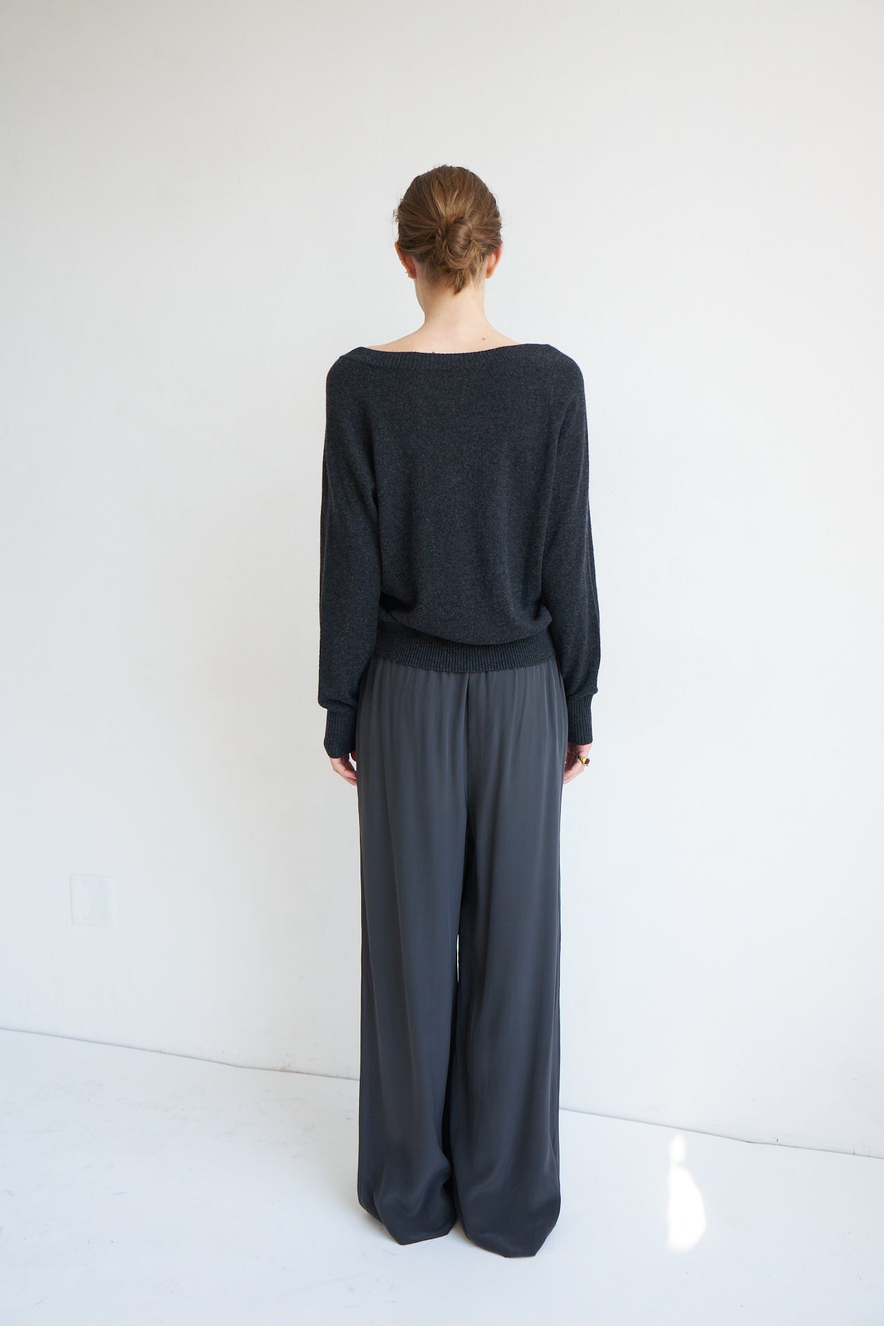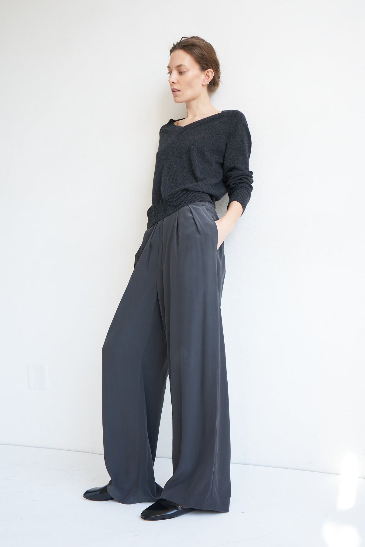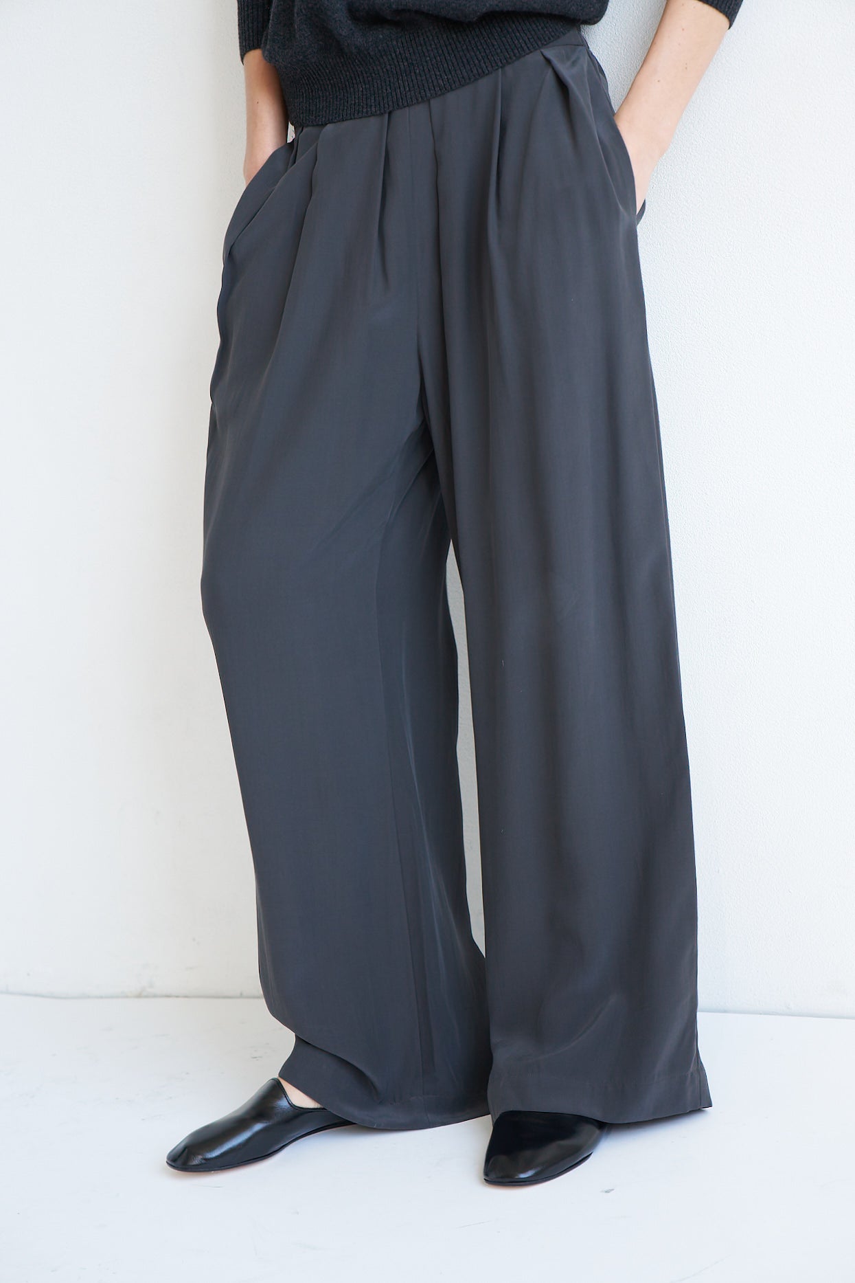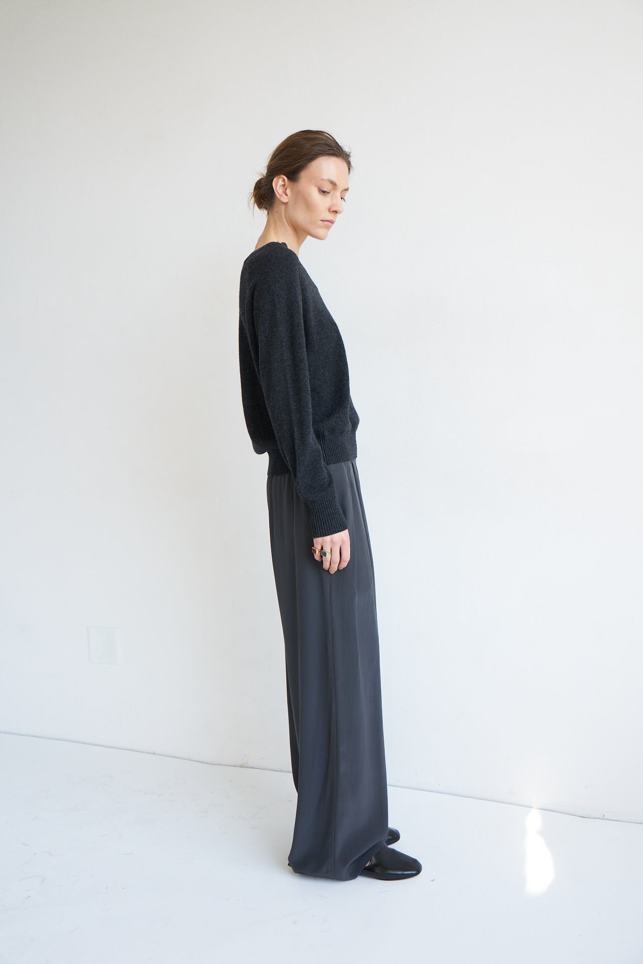 Soft sand washed silk charmeuse tailored into an elastic waist lounge pant, full of ease and luxury in a loose fitting straight leg.