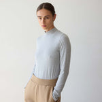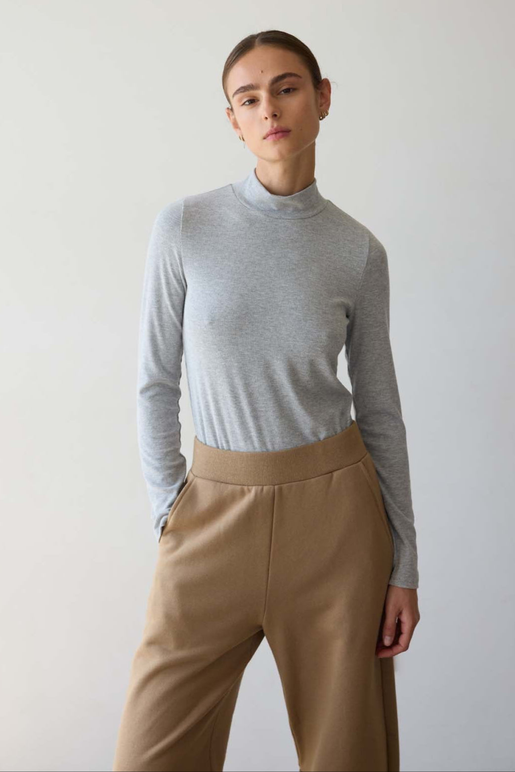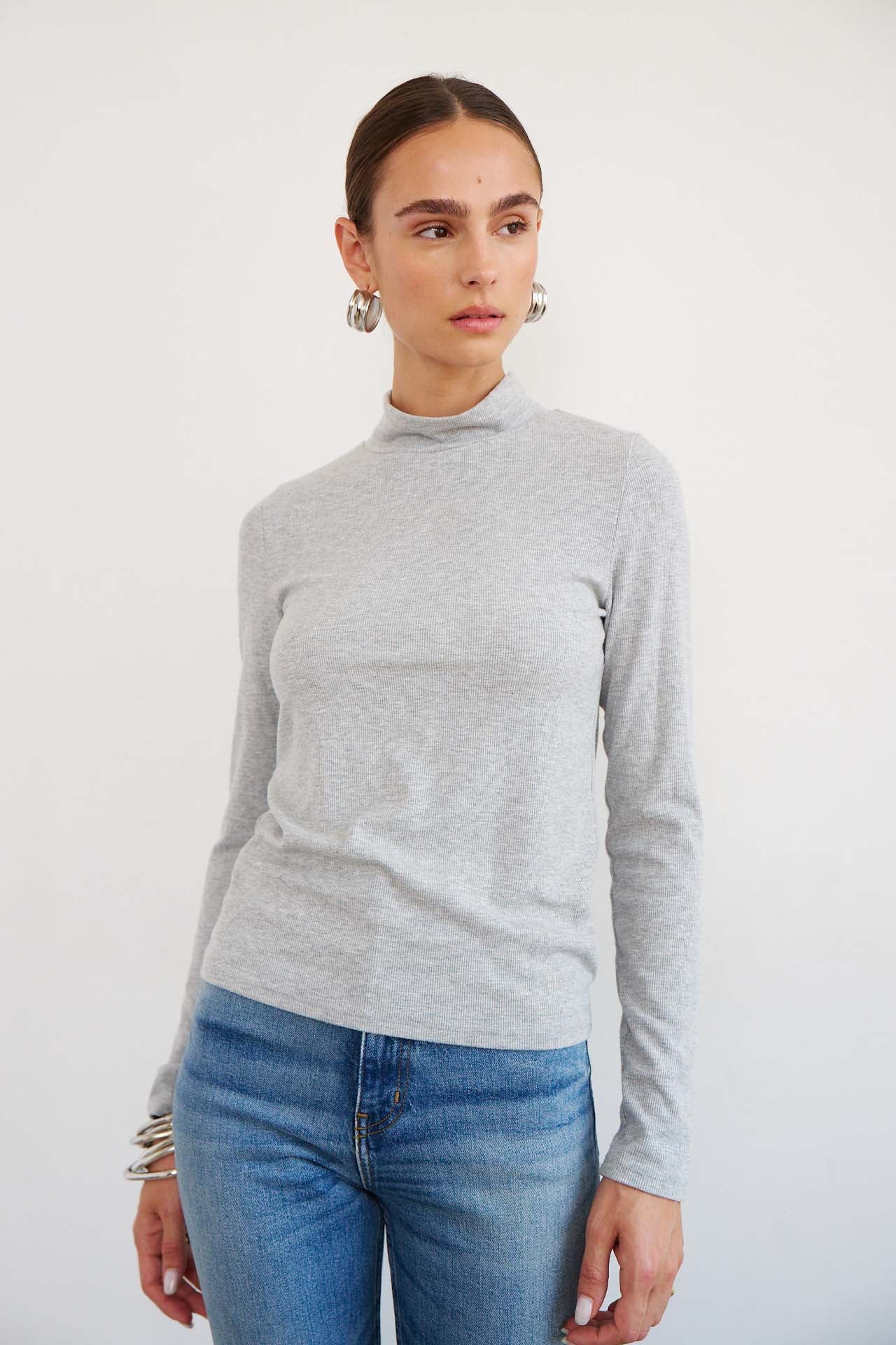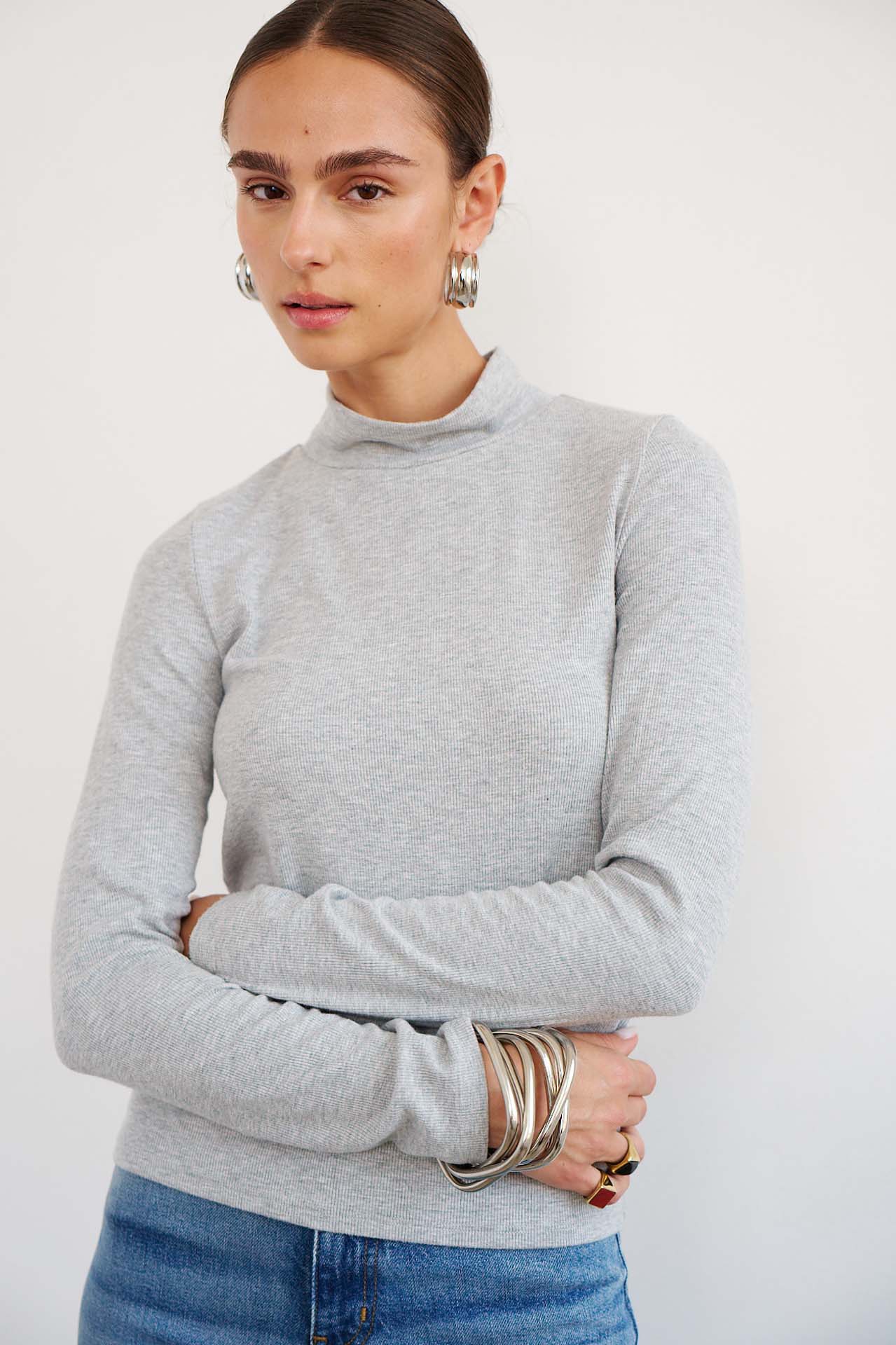 A slim fit, rib tee with a folded mock neck rib detail and long slim sleeves. With soft structure, our rib provides ease and form.