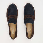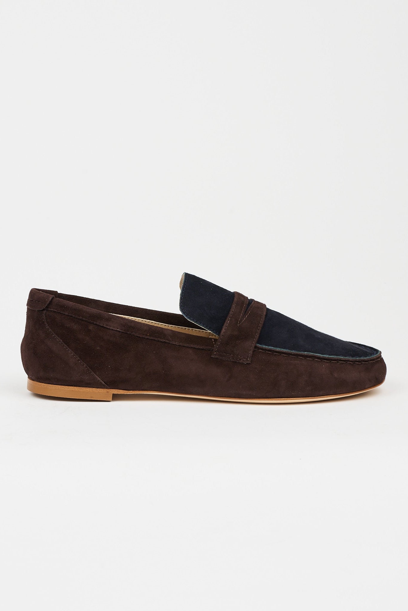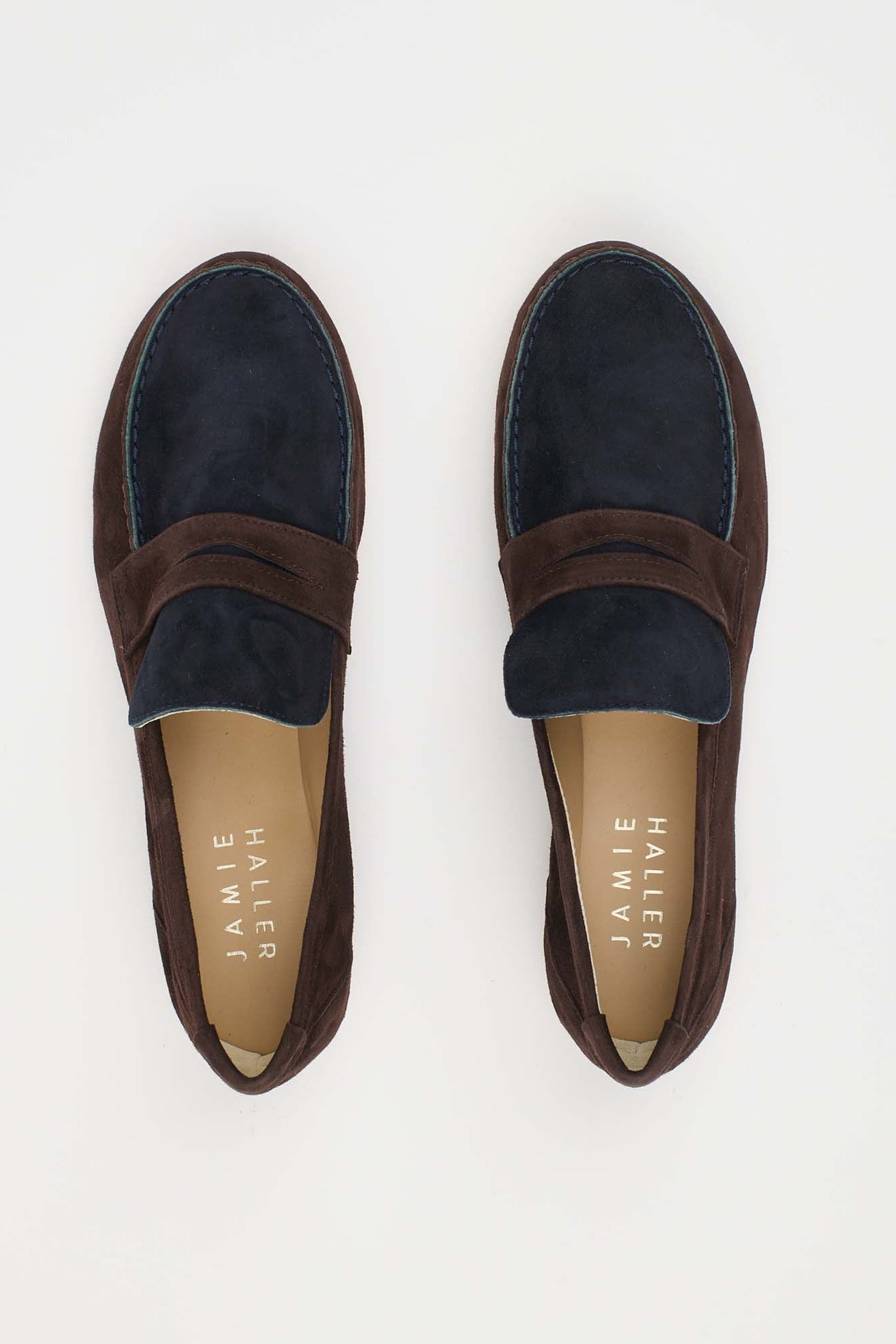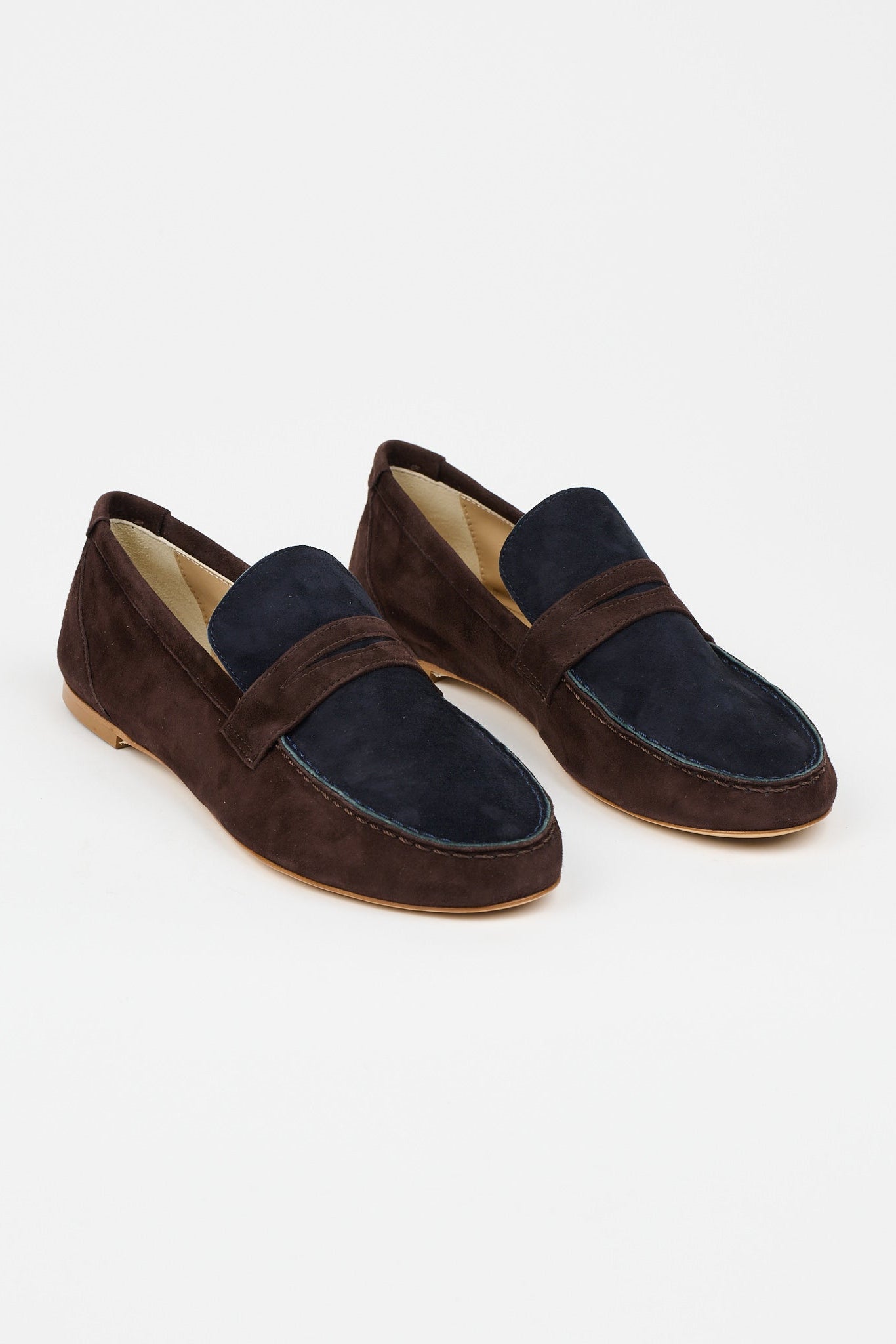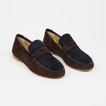 The two tone Penny Loafer debuts in Italian double dyed suede. Inspired by the classic silhouette of a men’s Italian loafer with the understated soul of a slipper. Handmade in Tuscany, in an old world Atelier using bespoke Sacchetto construction for a fit and feel you can’t unsee. Deep brown and navy are a combination made in heaven for a soulful update to our two tone. They are lined in soft tan leather with a leather sole.