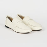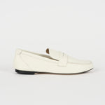 This Penny loafer is white with a black sole for a high contrast graphic element. The previous version of our white penny loafer from Spring 2025 and before, had a natural colored tan sole.