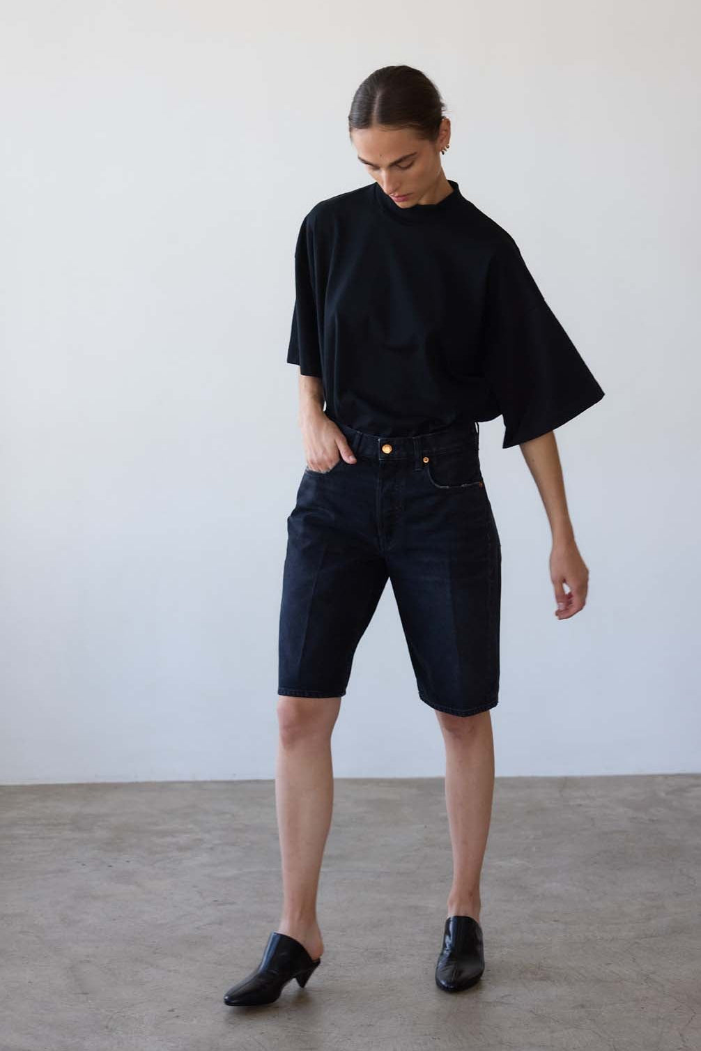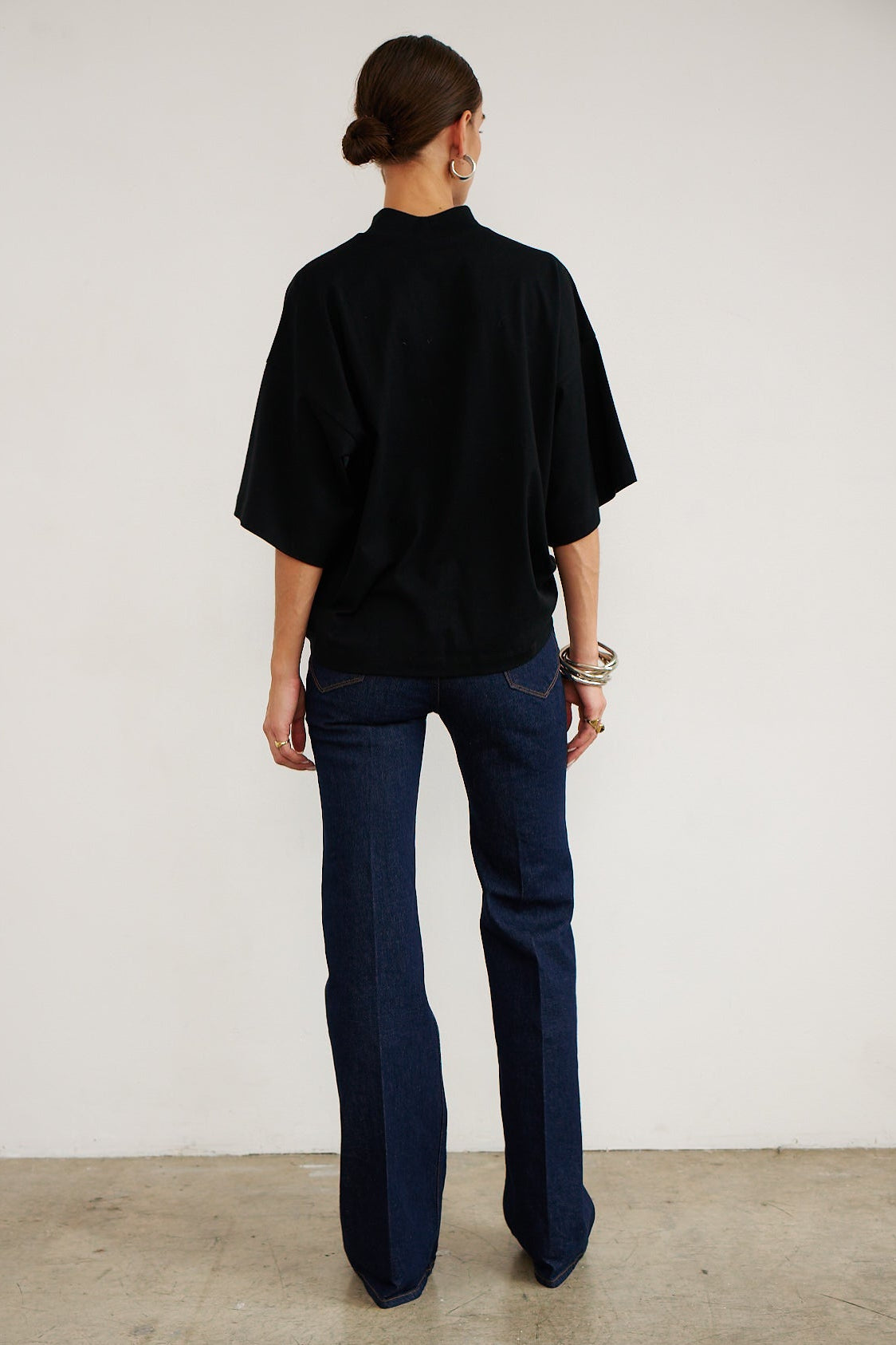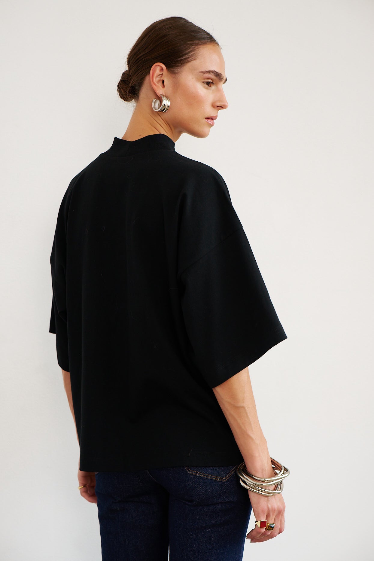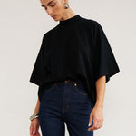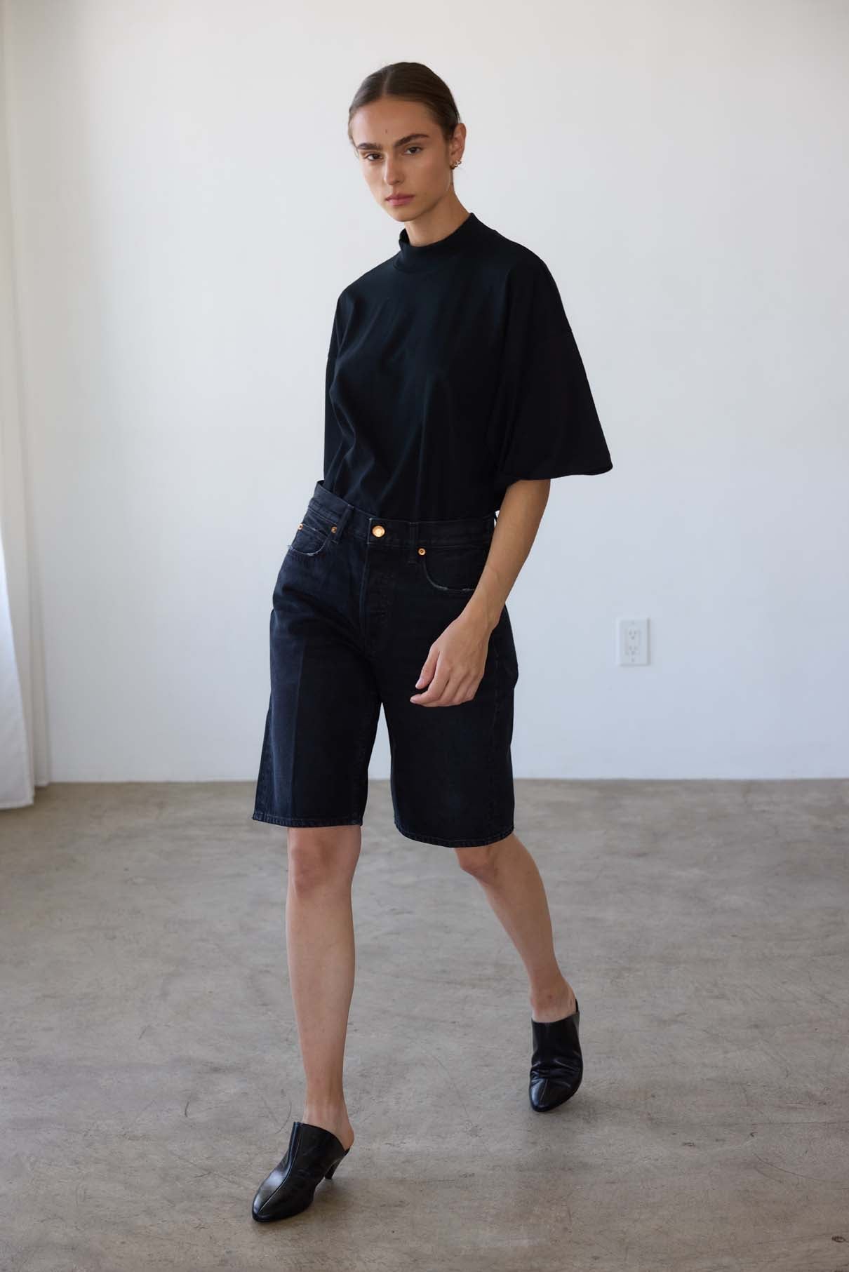 An architectural basic, with a pitched elbow length sleeve and mock neck detail.  A boxy tee of perfected Japanese jersey with weight enough to drape and yet remain casual.