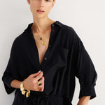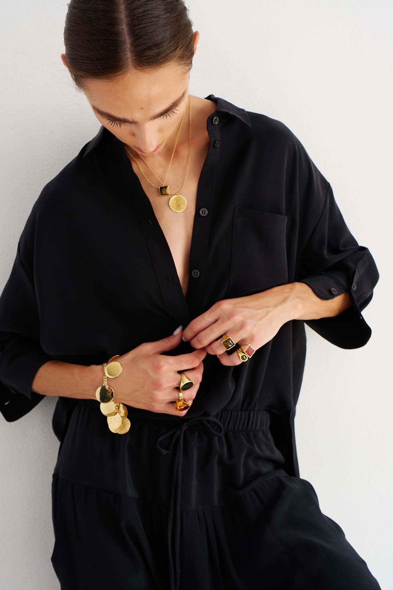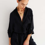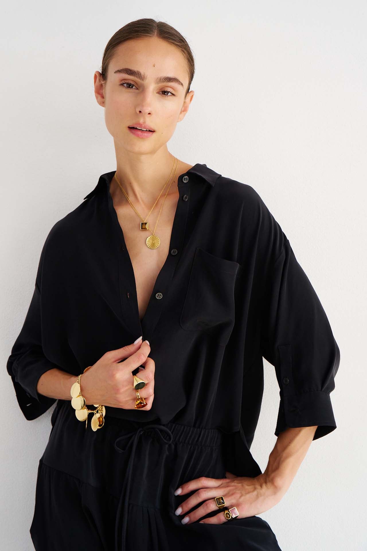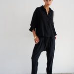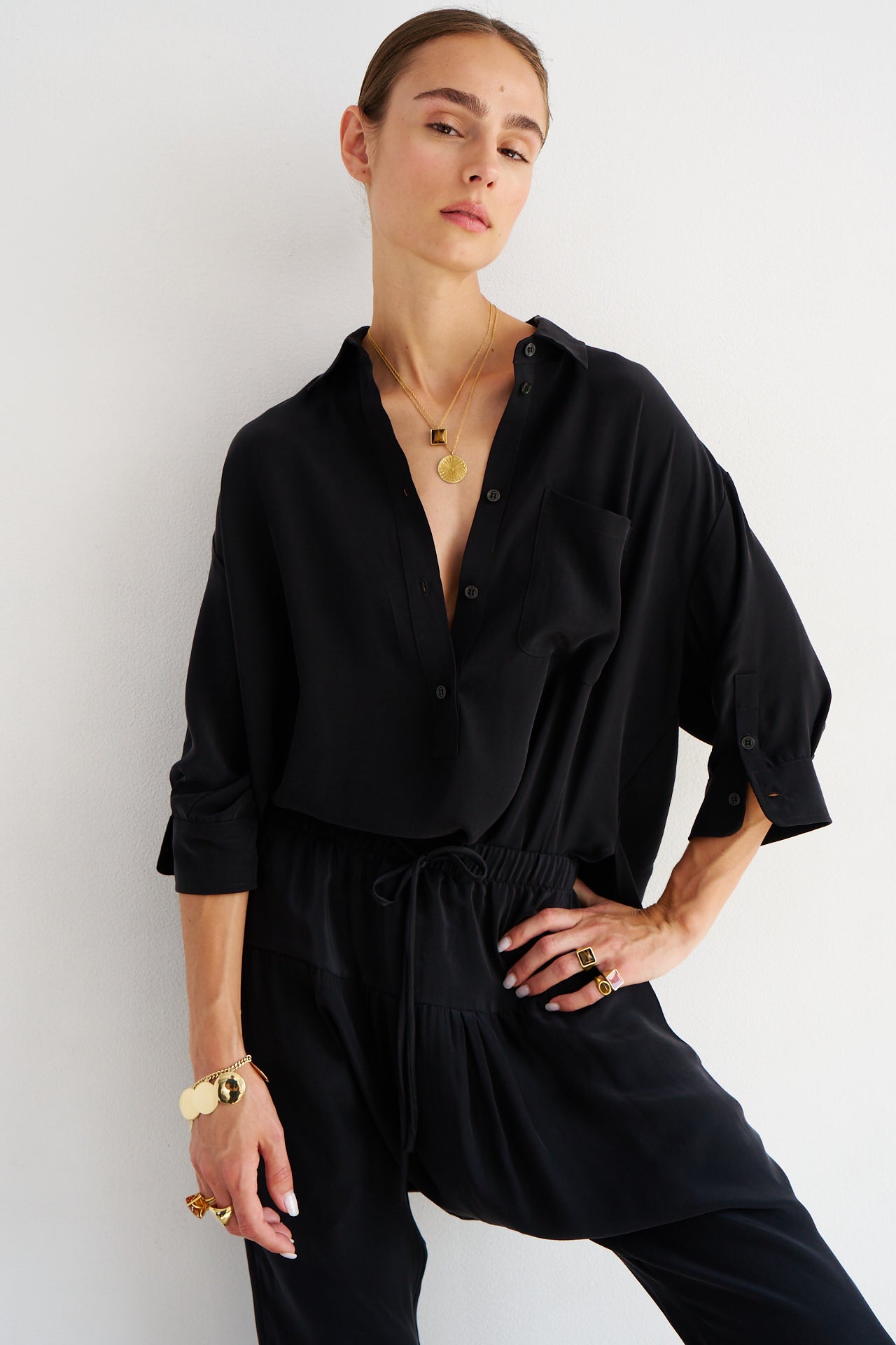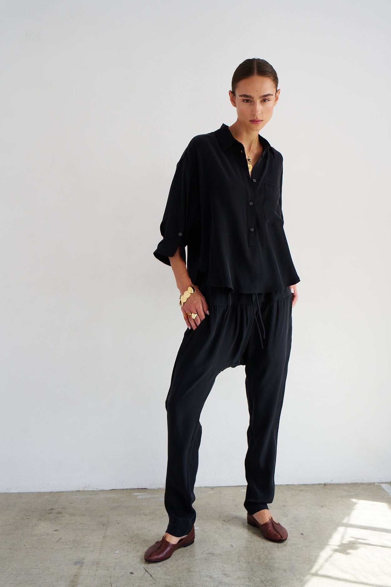 A billowy popover shirt with elbow length, cuffed sleeve detail. Semi cropped for easy tuck ins and front half tucks. A loose drapy shape tailored in soft, silk charmeuse. A day to night kind of blouse that will be a go to silhouette.