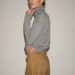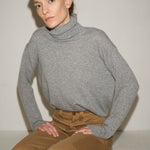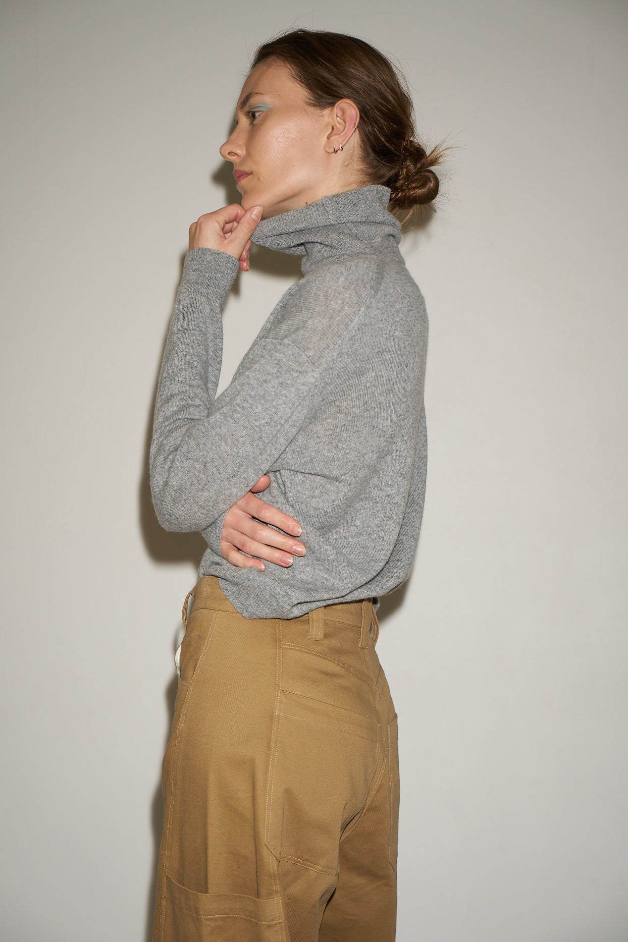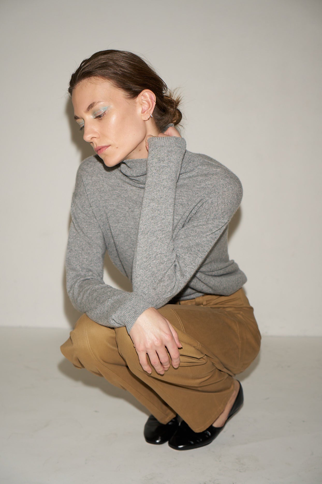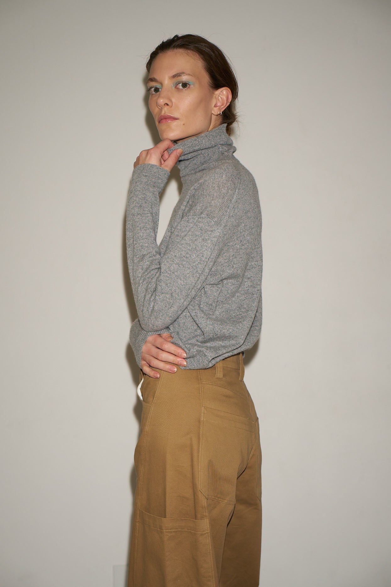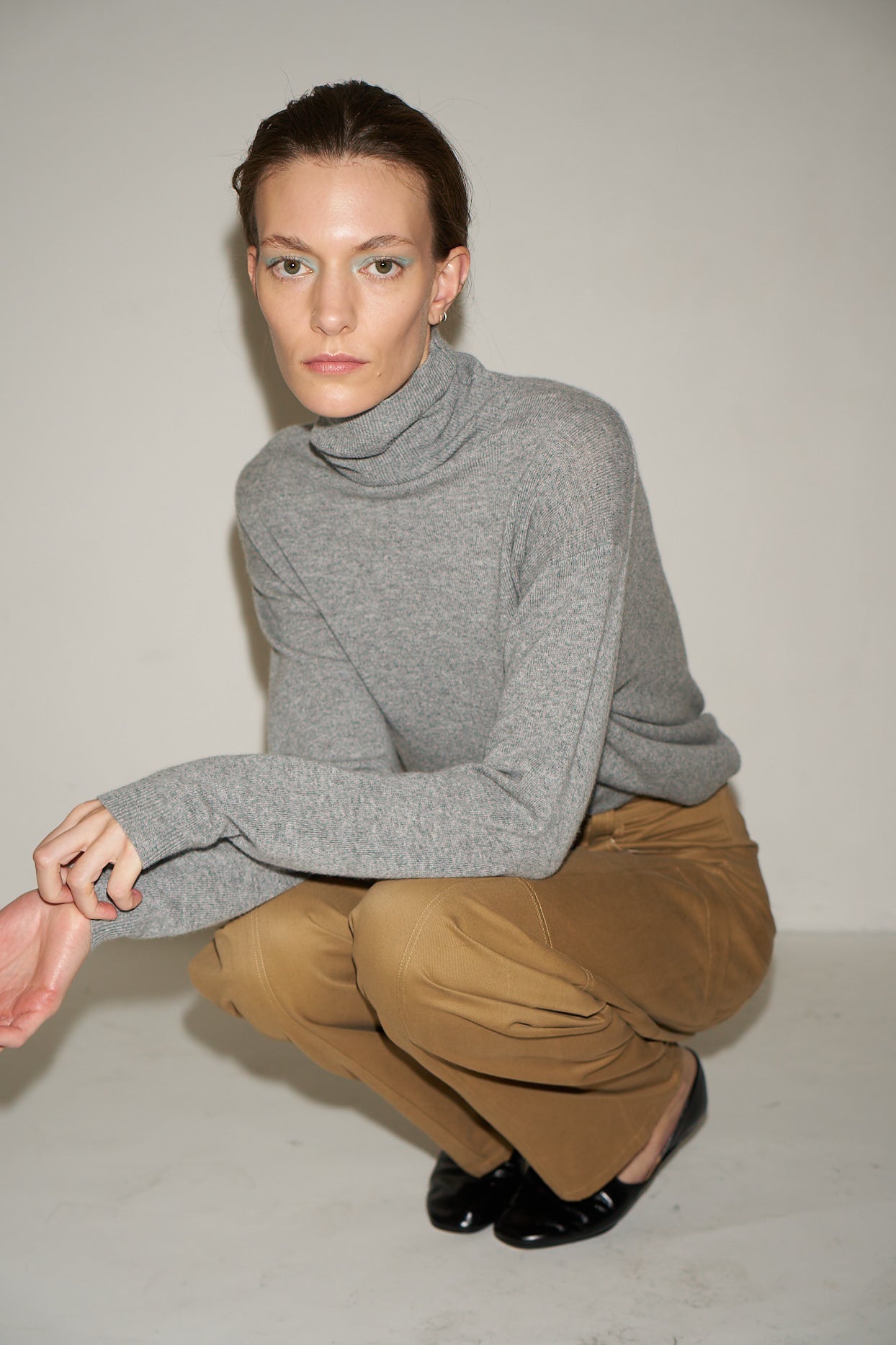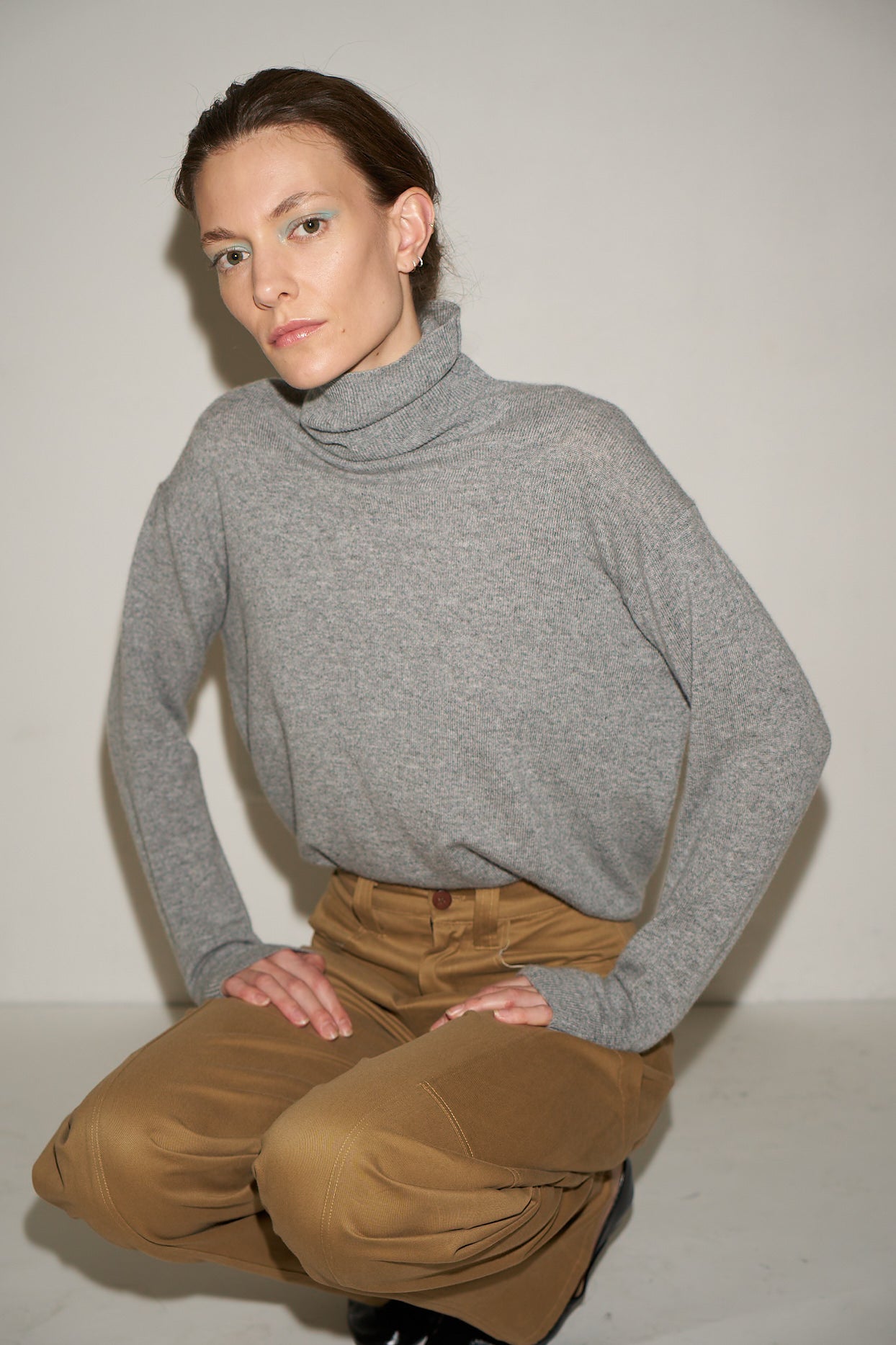 A relaxed fit sweater with an elongated turtle neck and slim sleeve define the Primm Sweater. Our tee shirt weight cashmere is soft, washed in for a “like butter” hand feel that becomes a second skin. A lightweight rib waistband finishes the sweater. It is soft and easy to tuck in.