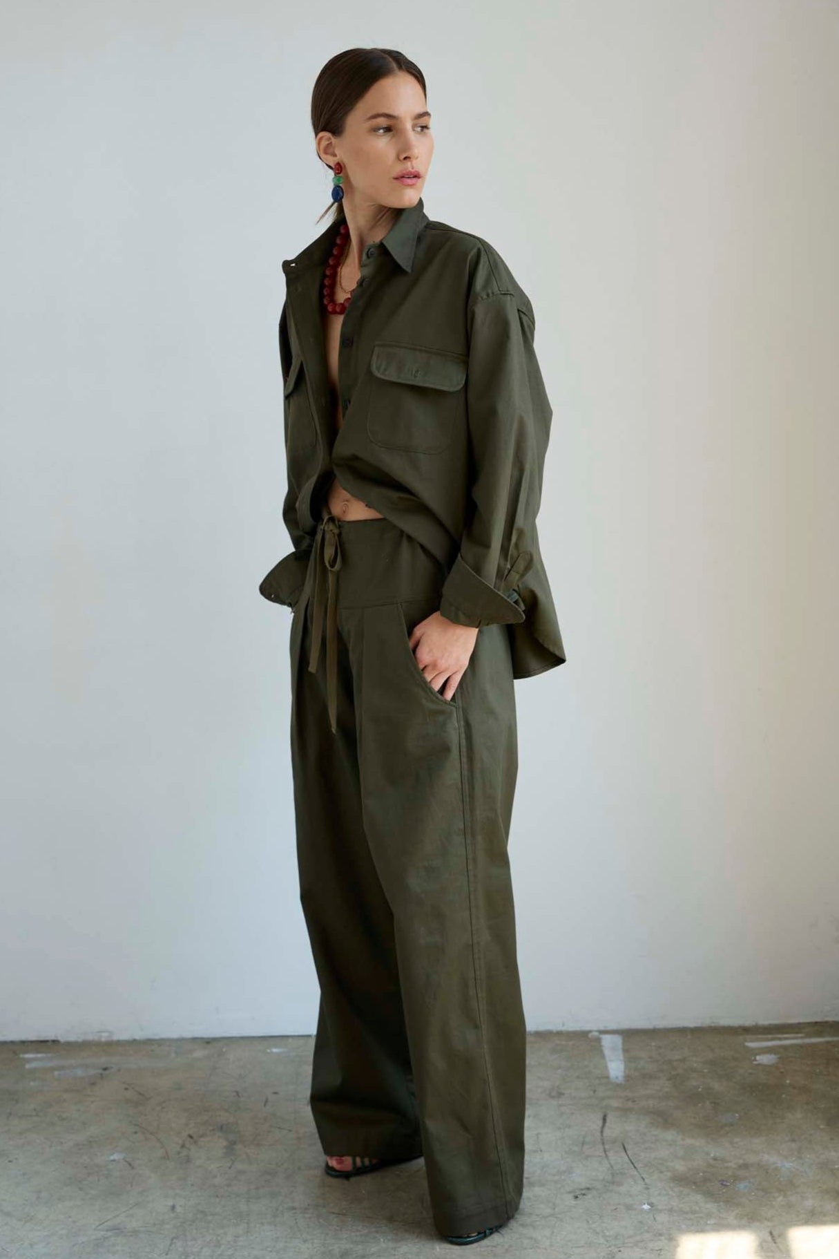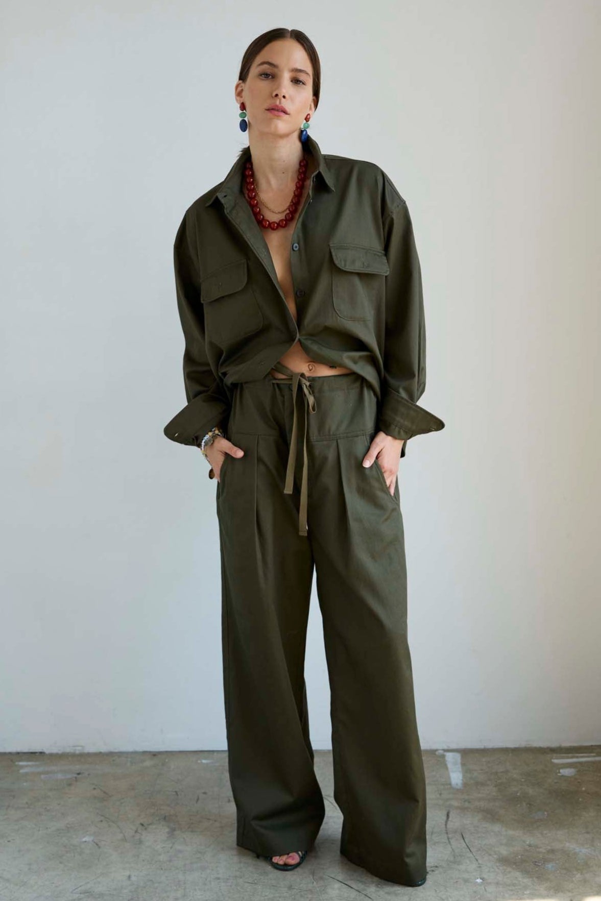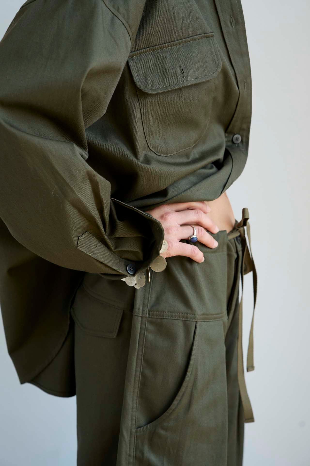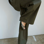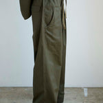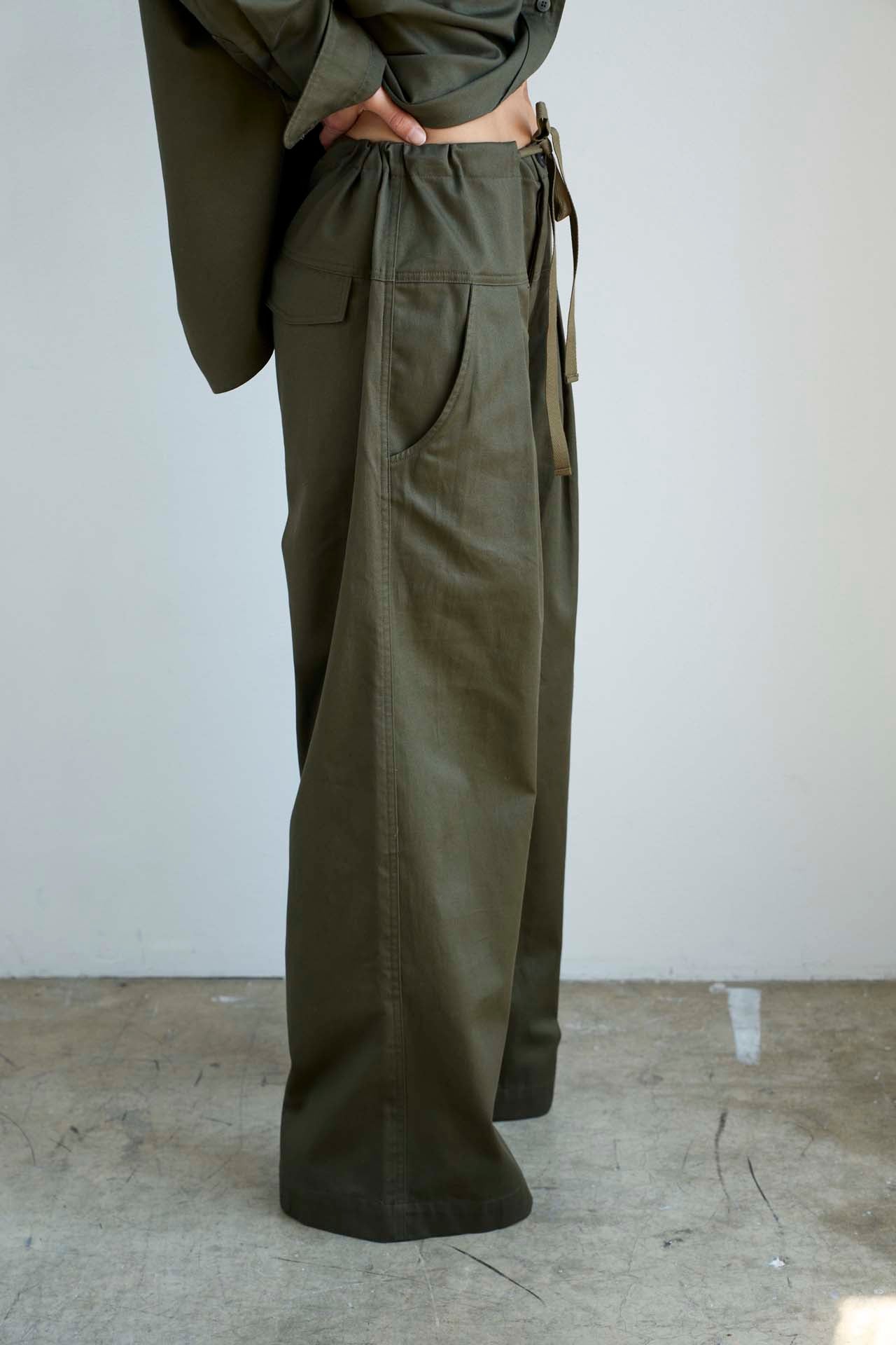 Inspired by those loose leg drawstring scrubs doctors wear. Pleats are placed below the hips for well placed volume and a streamlined silhouette. A drawstring tie adds a relaxed essence. A daily utilitarian uniform of COOL and EASY.