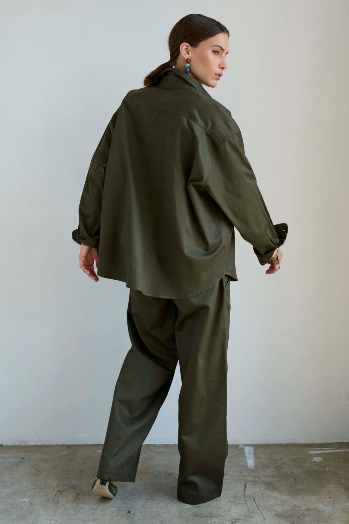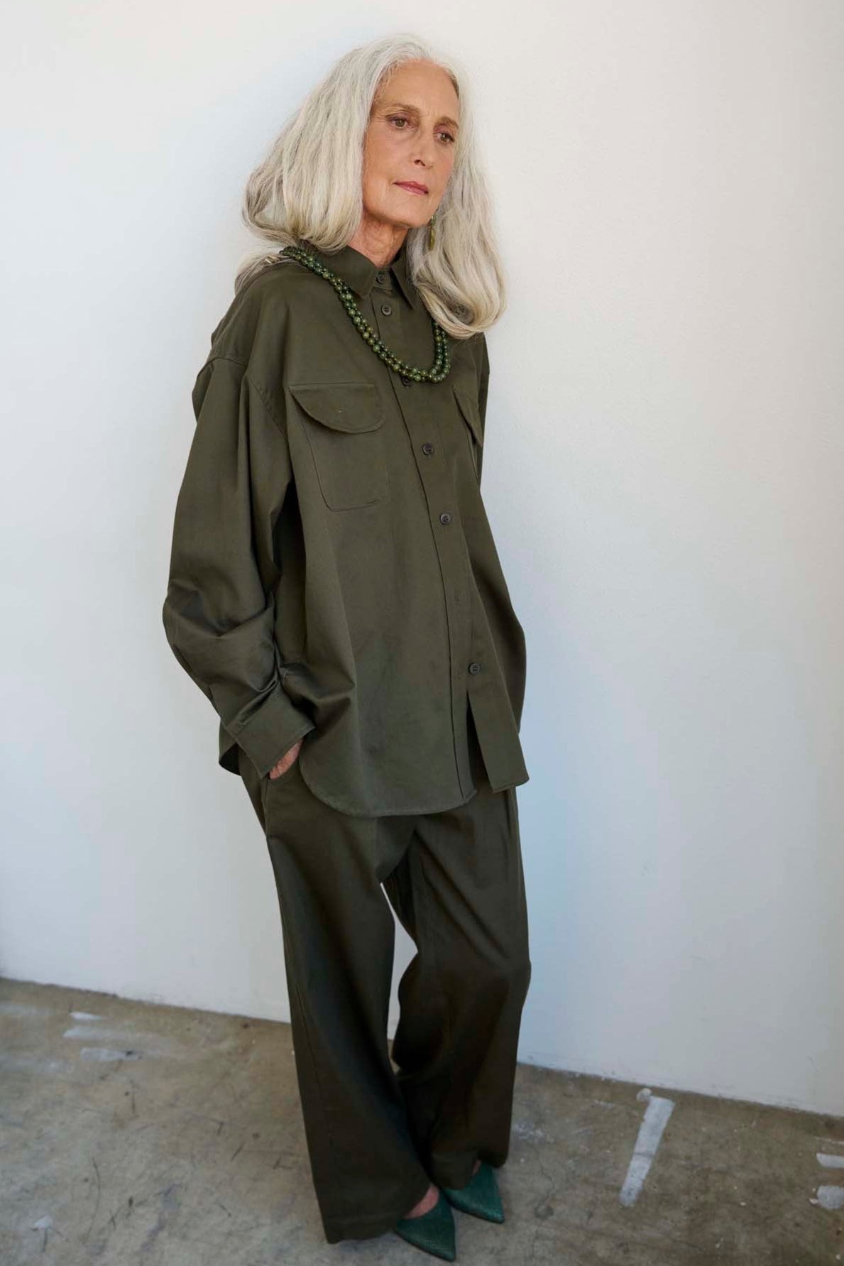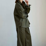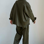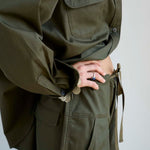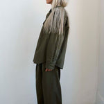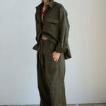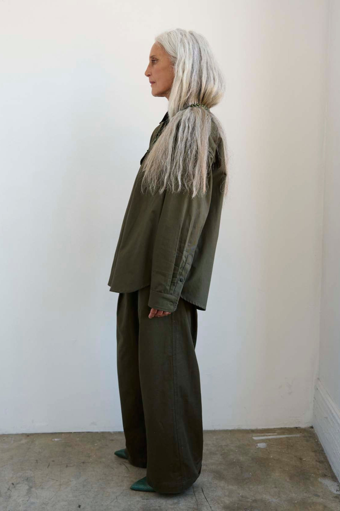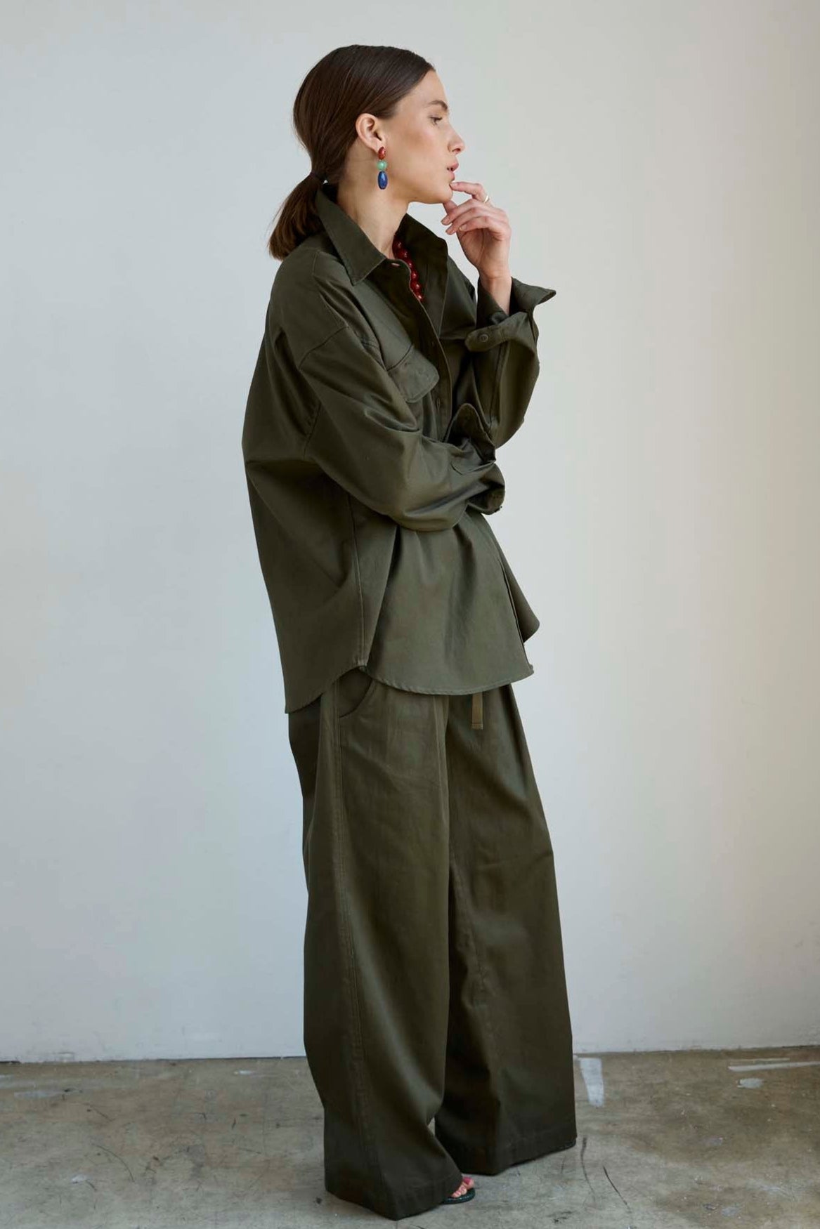 Inspired by those loose leg drawstring scrubs doctors wear. Pleats are placed below the hips for well placed volume and a streamlined silhouette. A drawstring tie adds a relaxed essence. A daily utilitarian uniform of COOL and EASY.