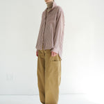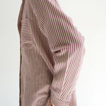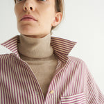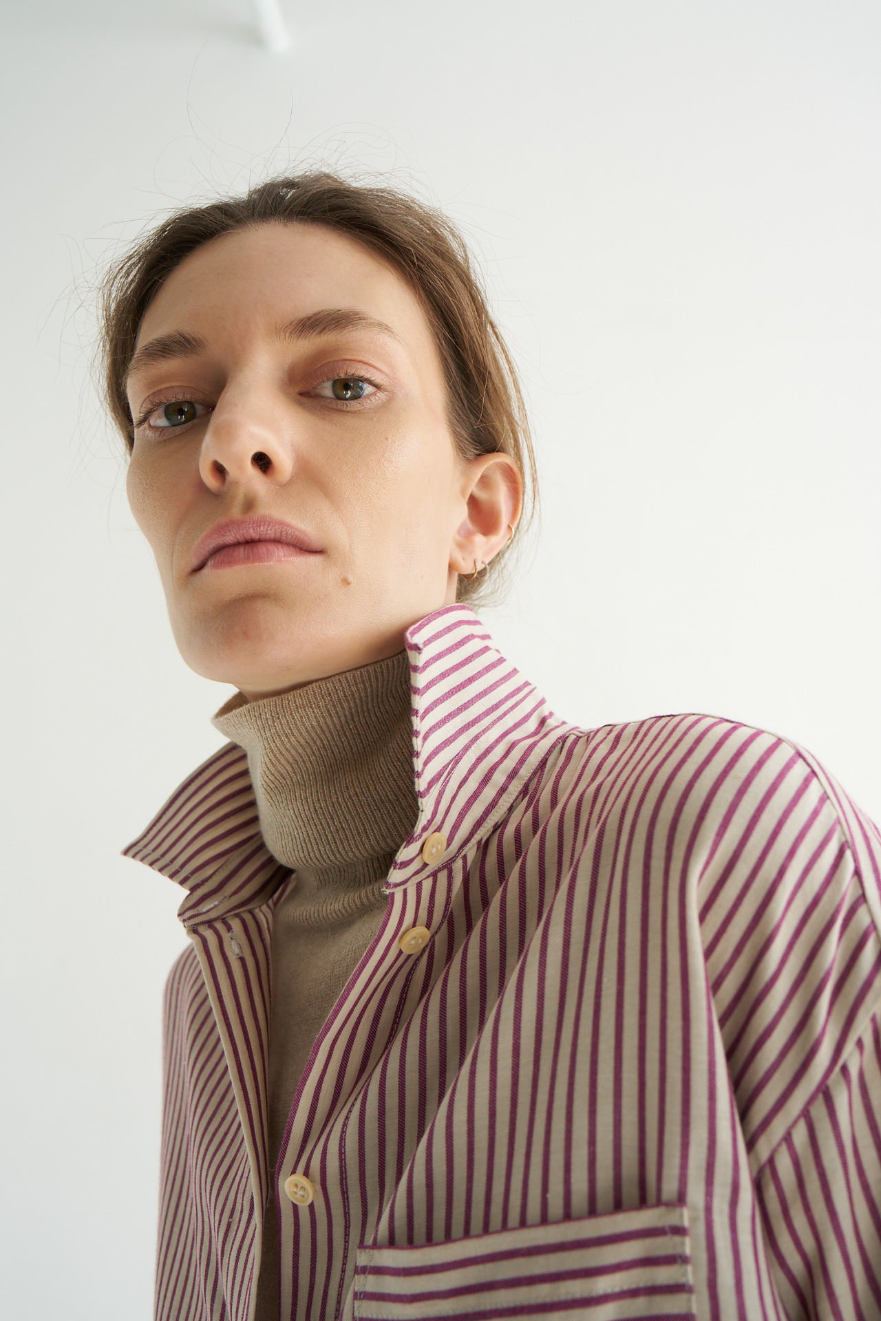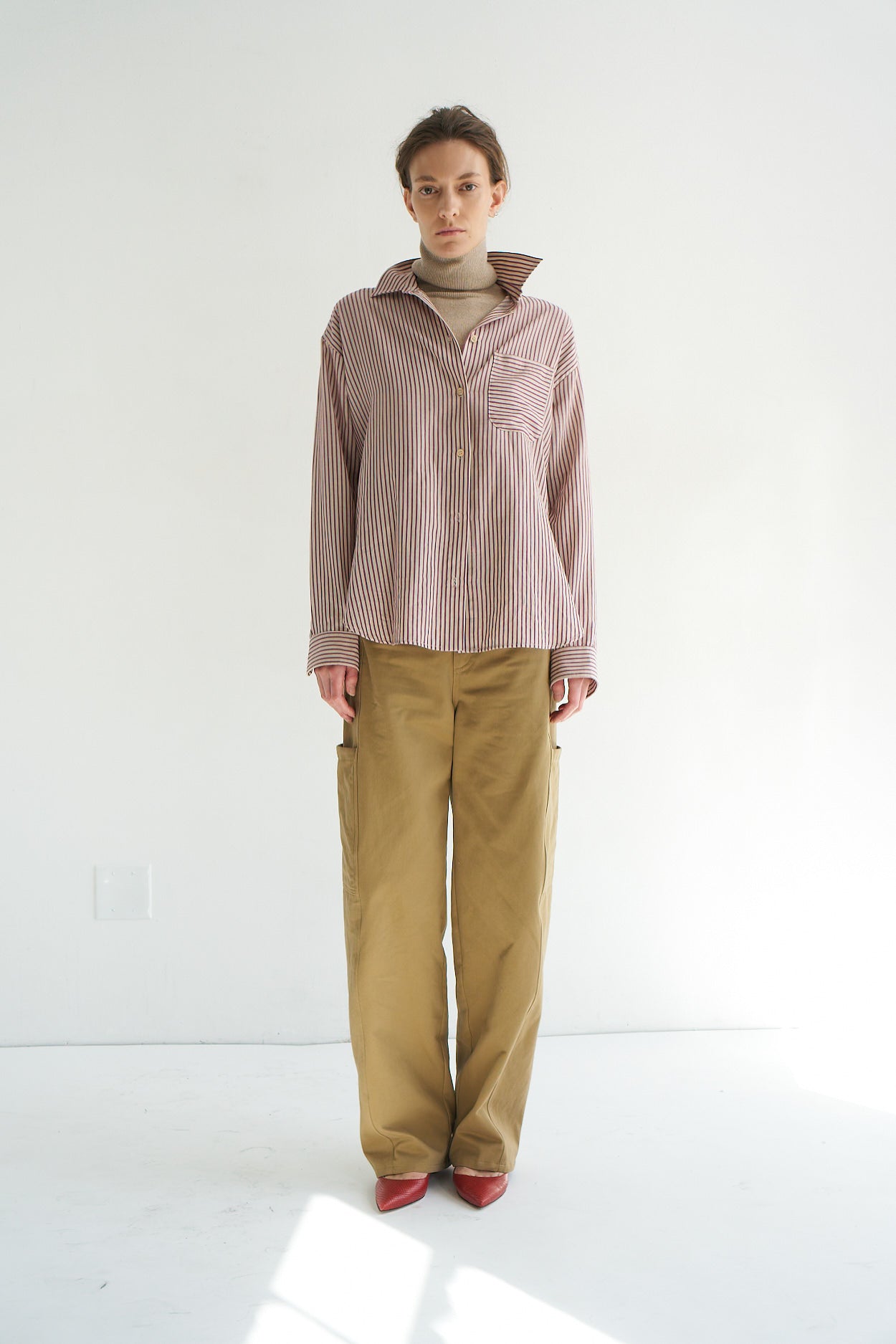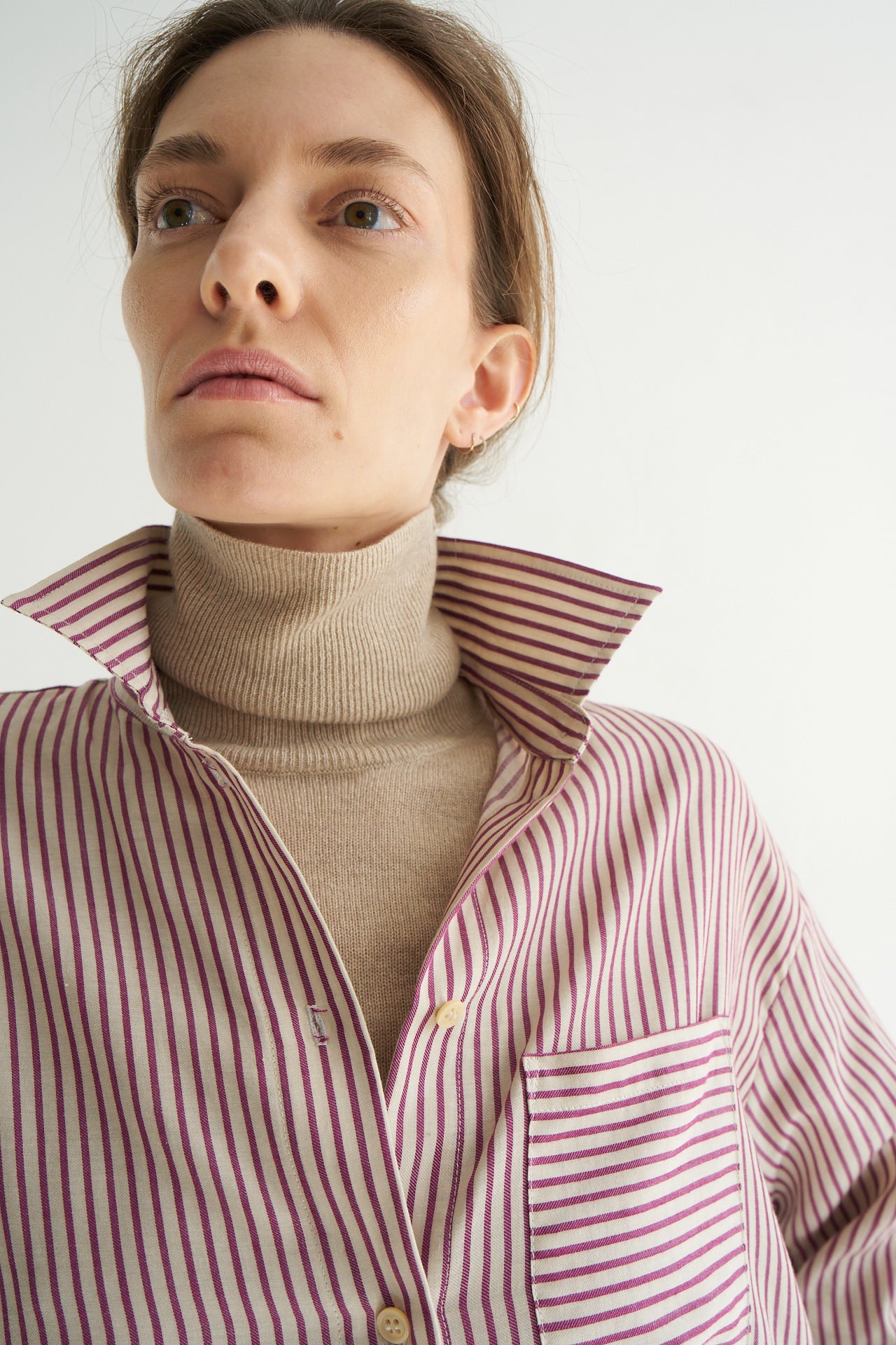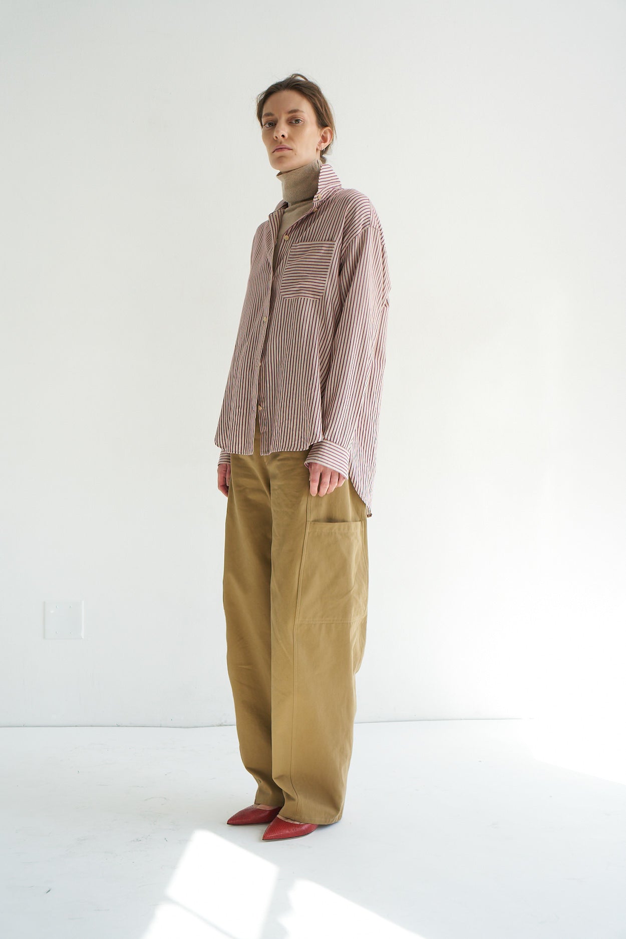 A relaxed fit and expertly cut shirt exudes beautiful drape. Fabric that expresses ease and structure, and is soft as silk. A perfectly placed button at the chest allows for a deep plunging neckline. A button just under the collar creates the opportunity for a high buttoned-up look without the choke. A small button perfectly placed on the cuff placket allows for an easily undone cuff that doesn’t get away from you.  Small details make the difference and create an undone feeling that can still feel polished. Design that supports styling.
