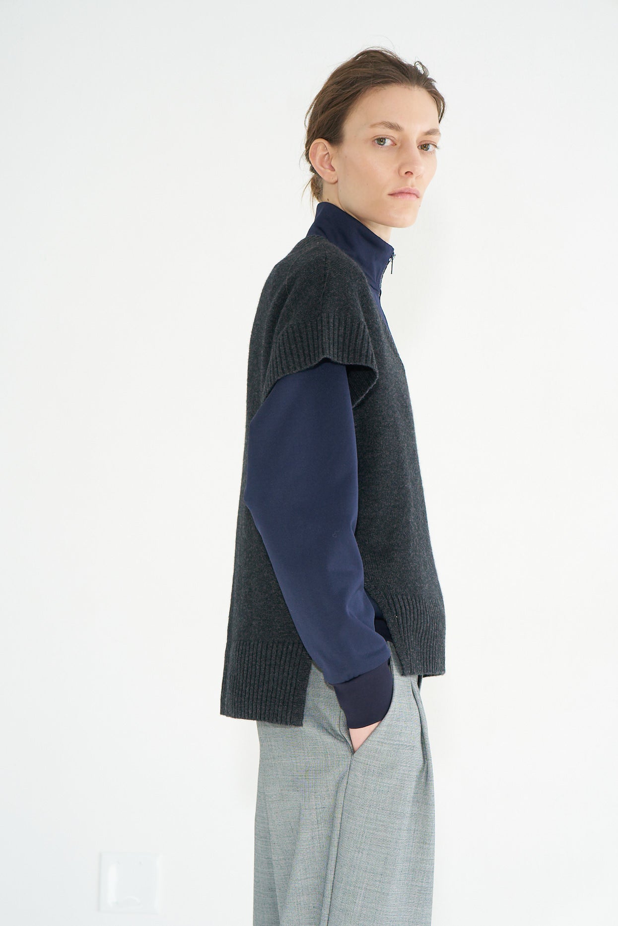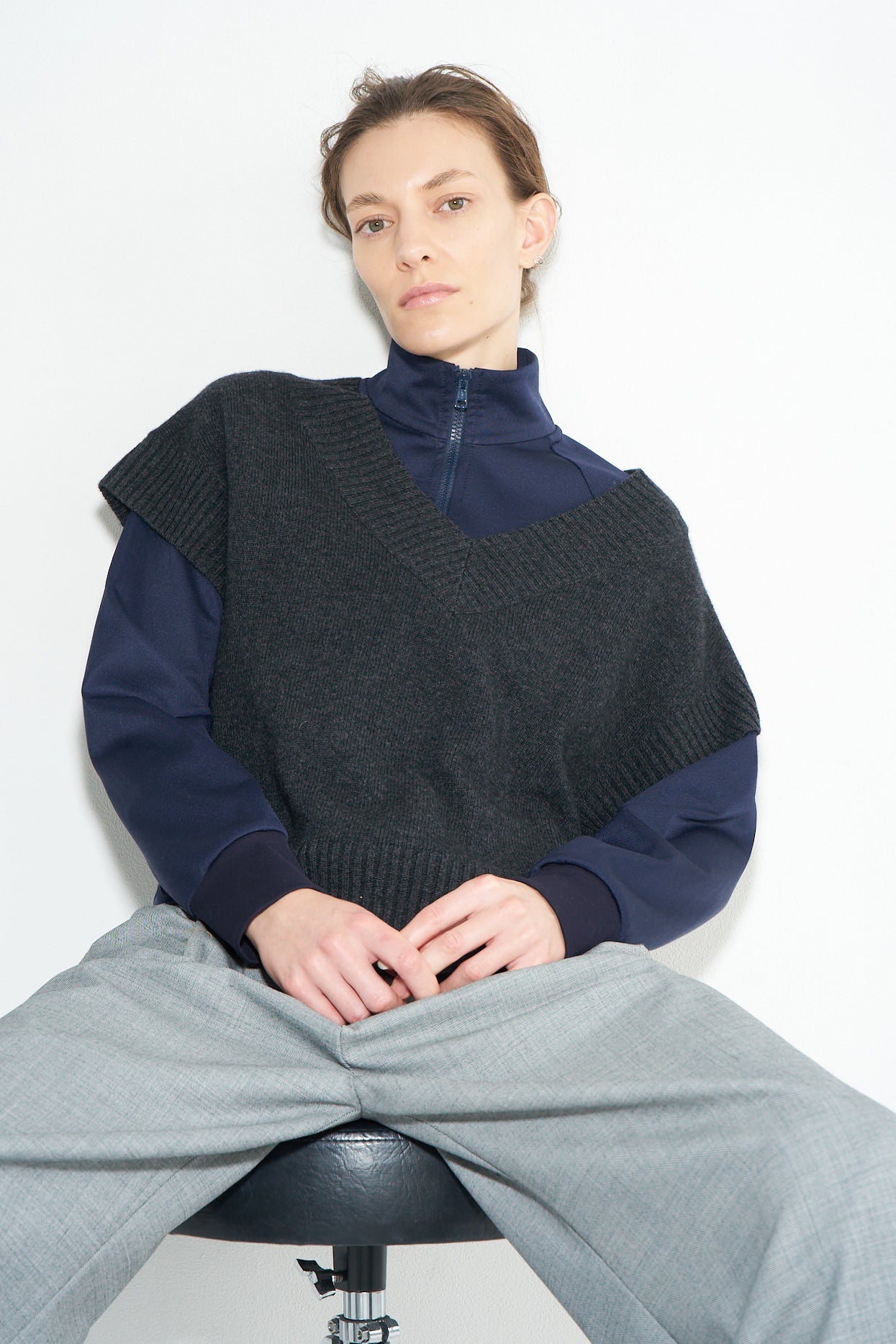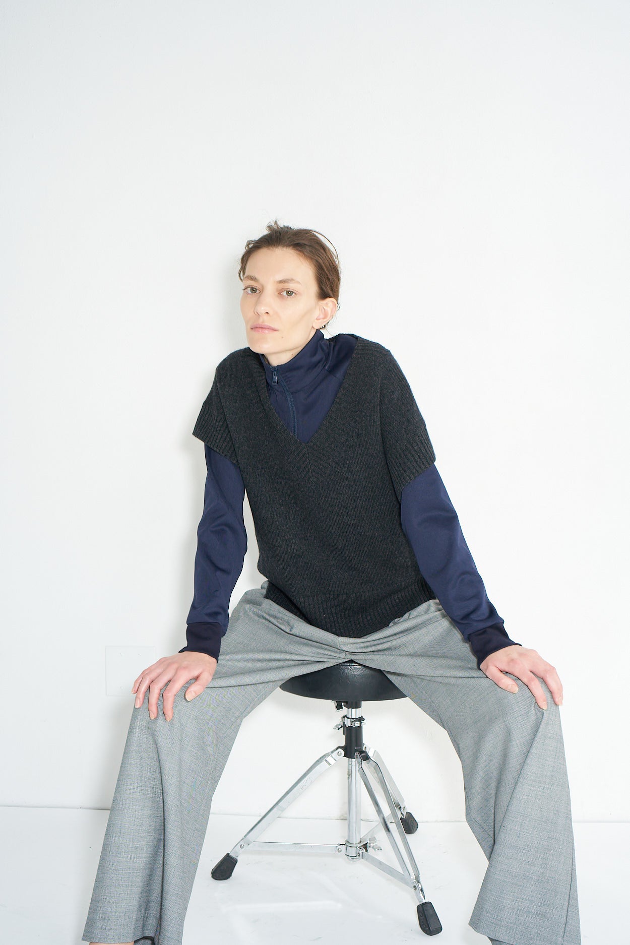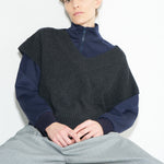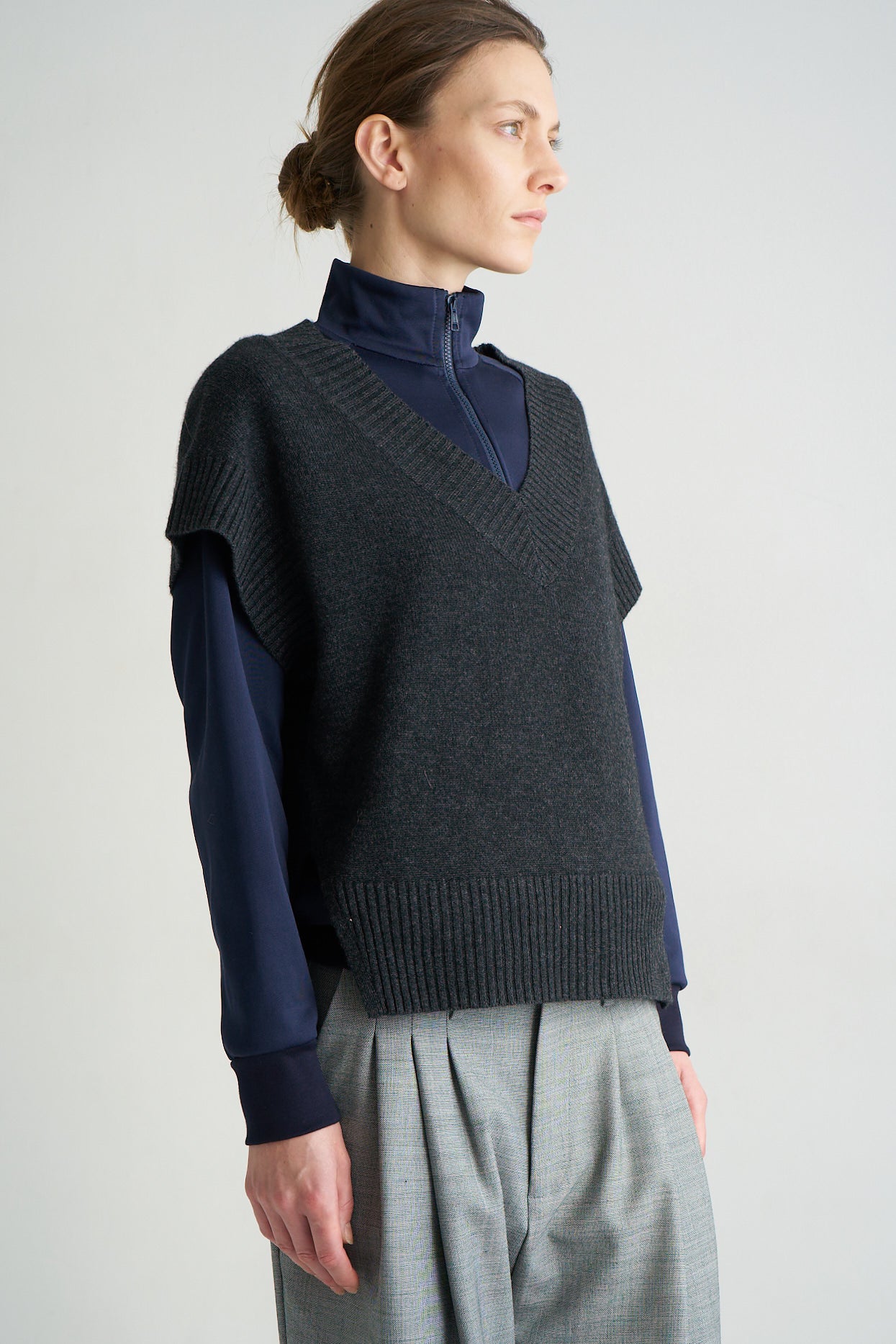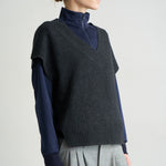 A boxy V neck sweater vest that can be worn on it's own or paired back to coordinating cashmere basics for that layered look with a 70s feel.