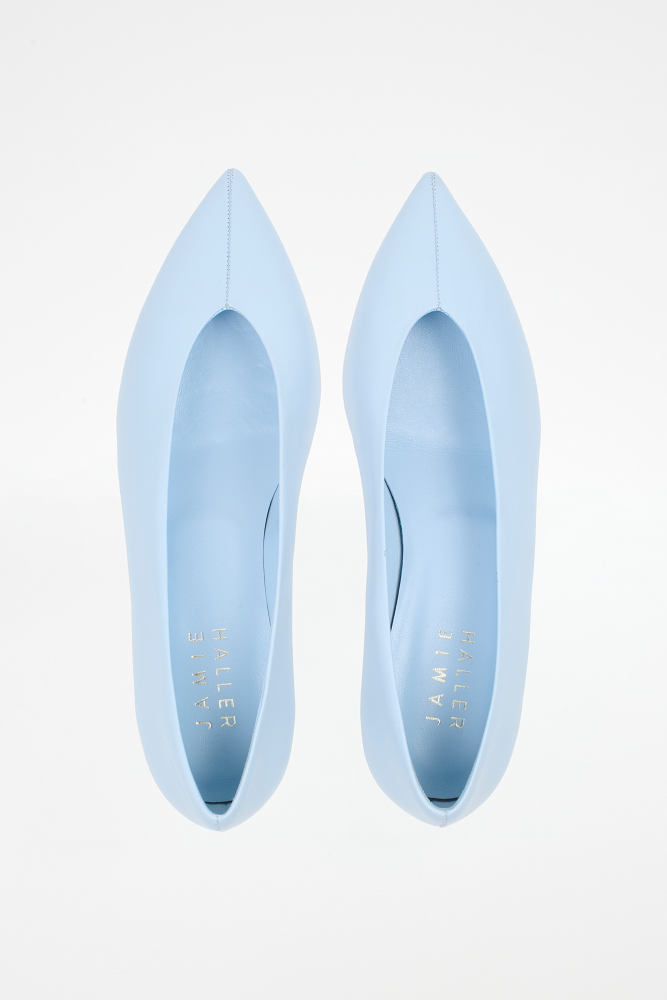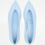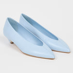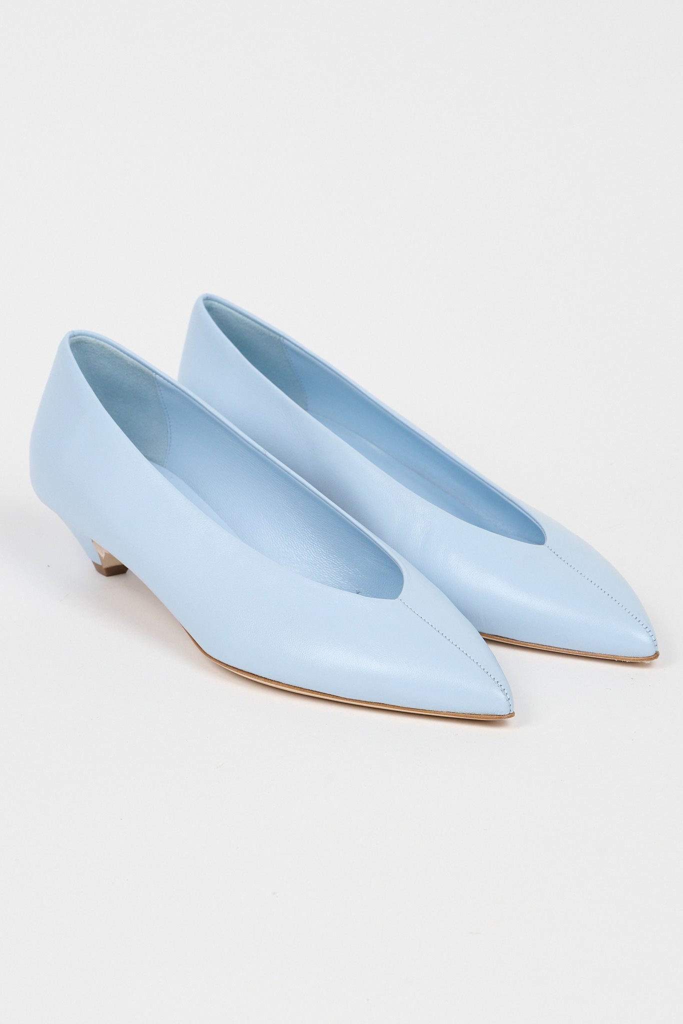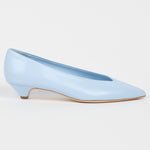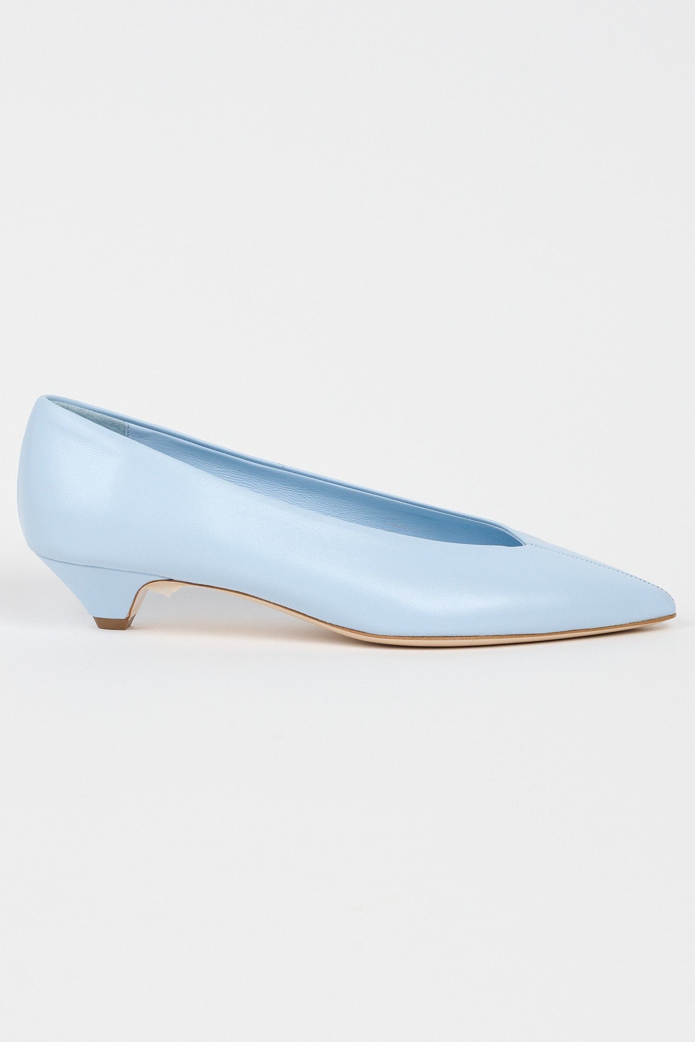 A trapezoidal shaped low heel, a more enclosed surround of the foot, a soft point and seamed detail. A modern pump.