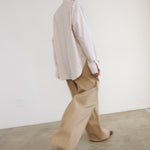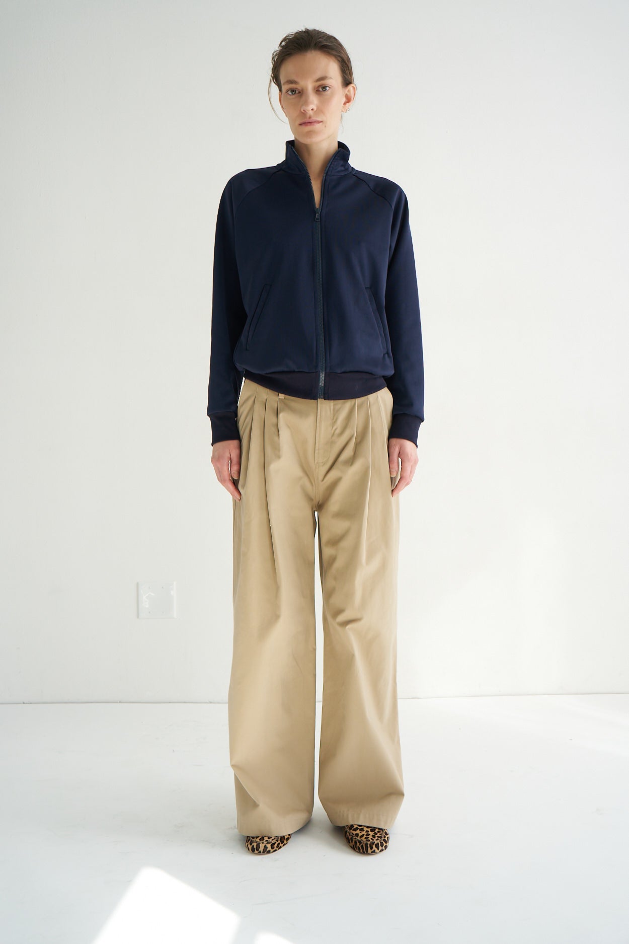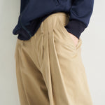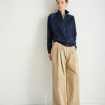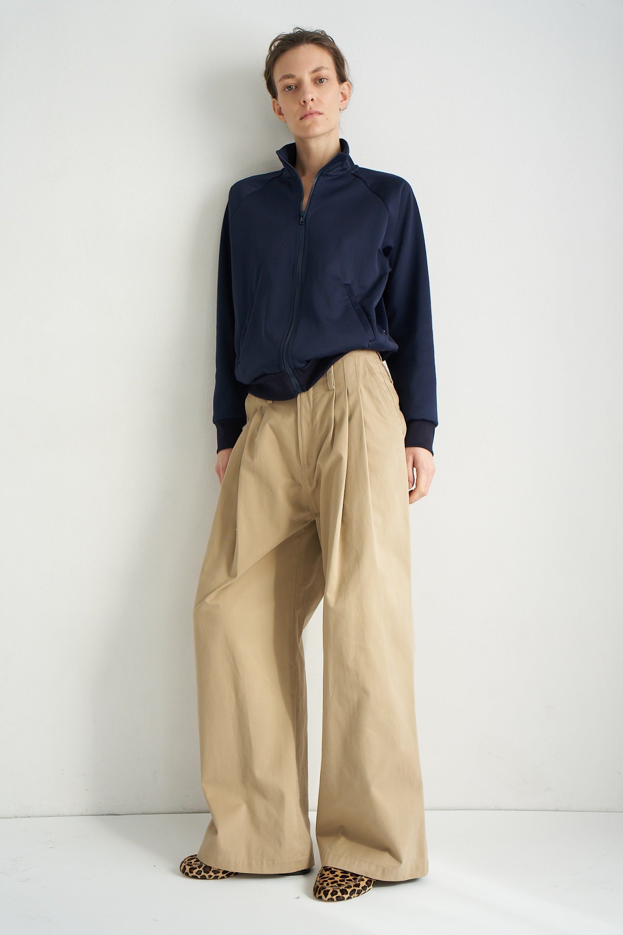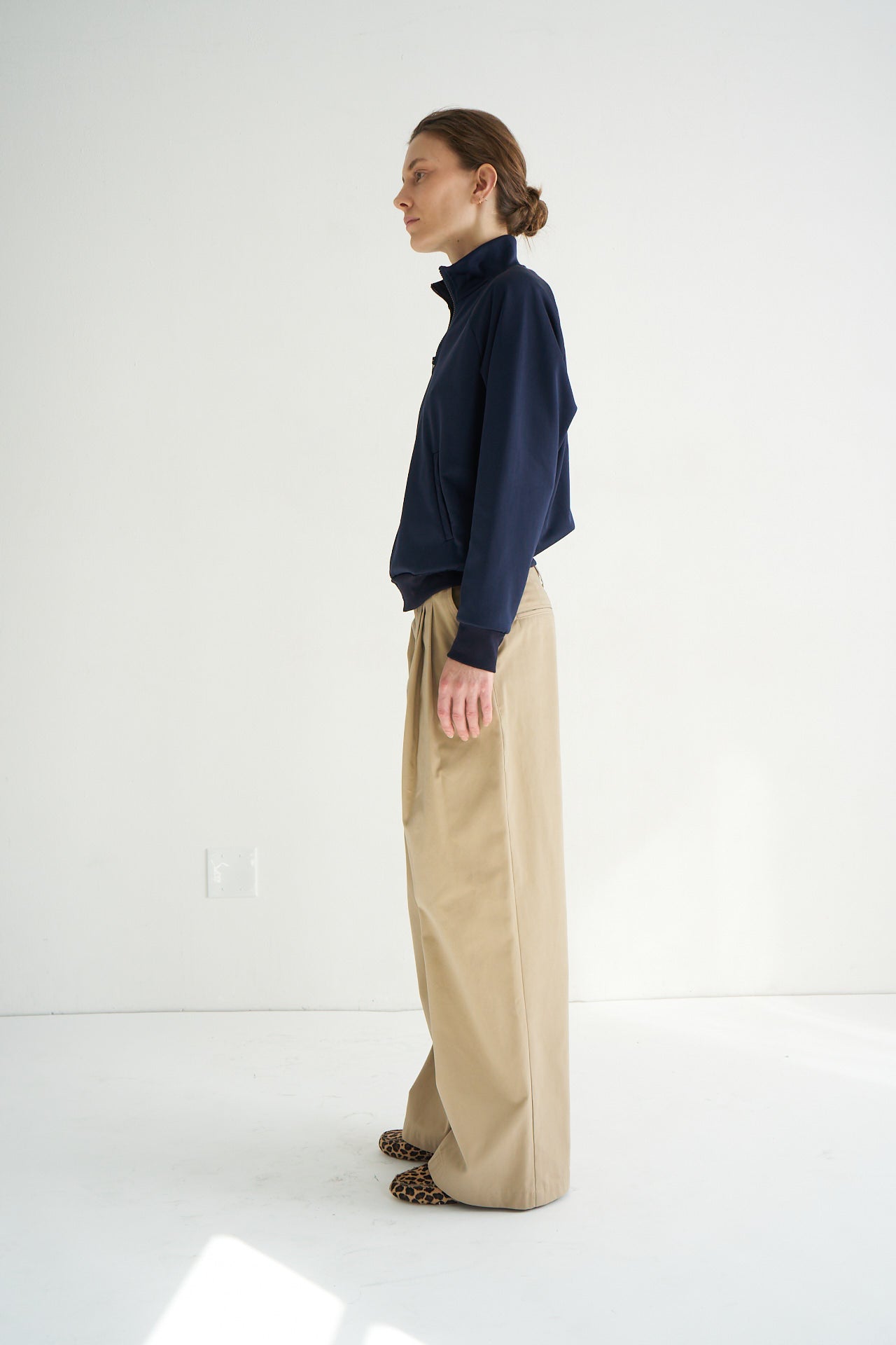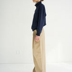 A mid rise trouser with triple pleat detailing at hip level offers beautiful drape and fullness in a low and extremely flattering position. Tailored in Los Angeles of Japanese twill.