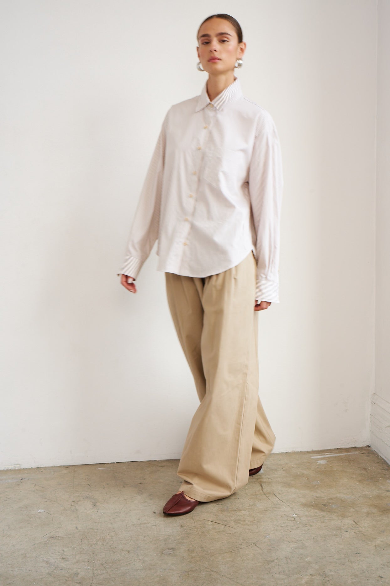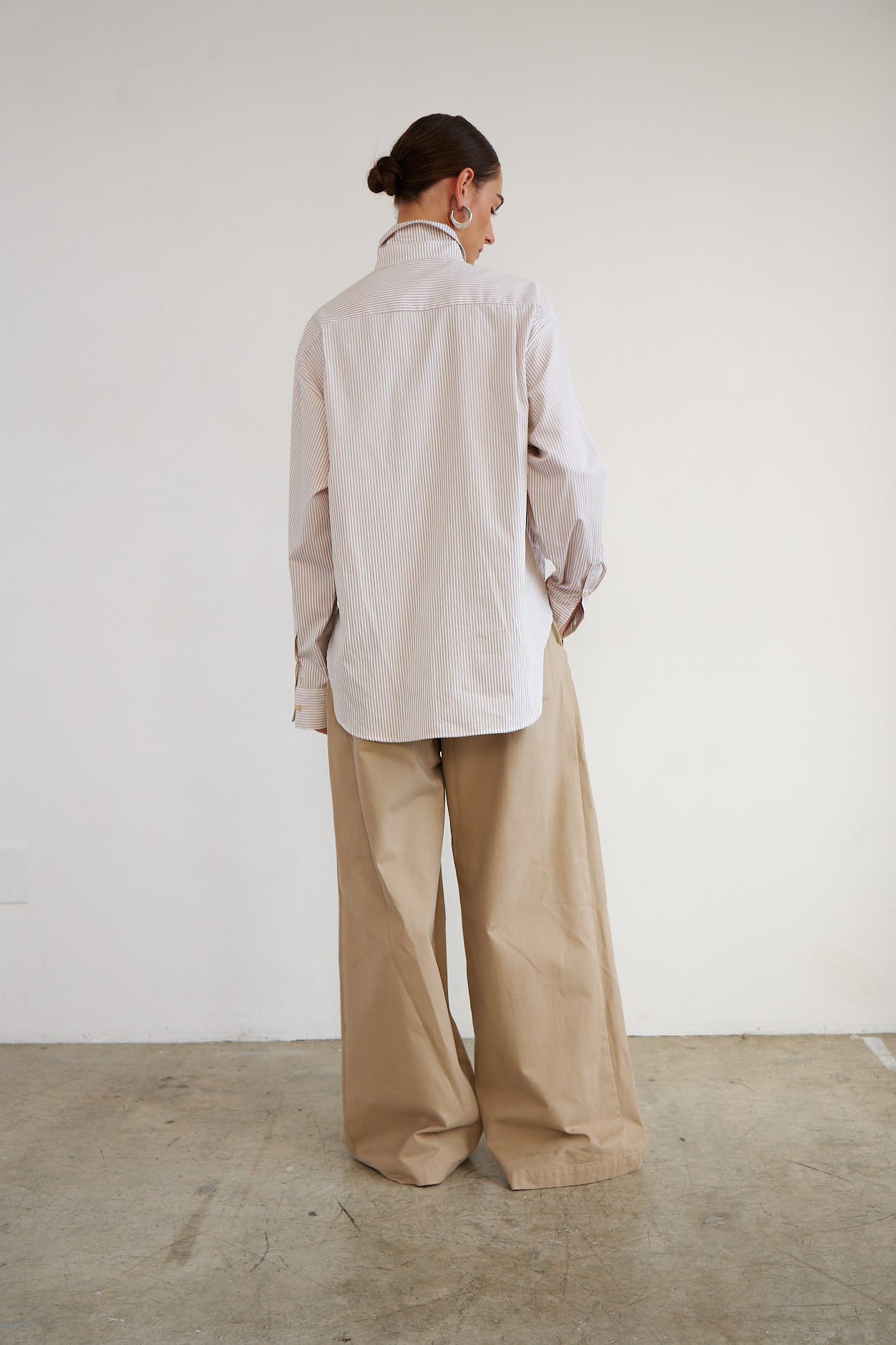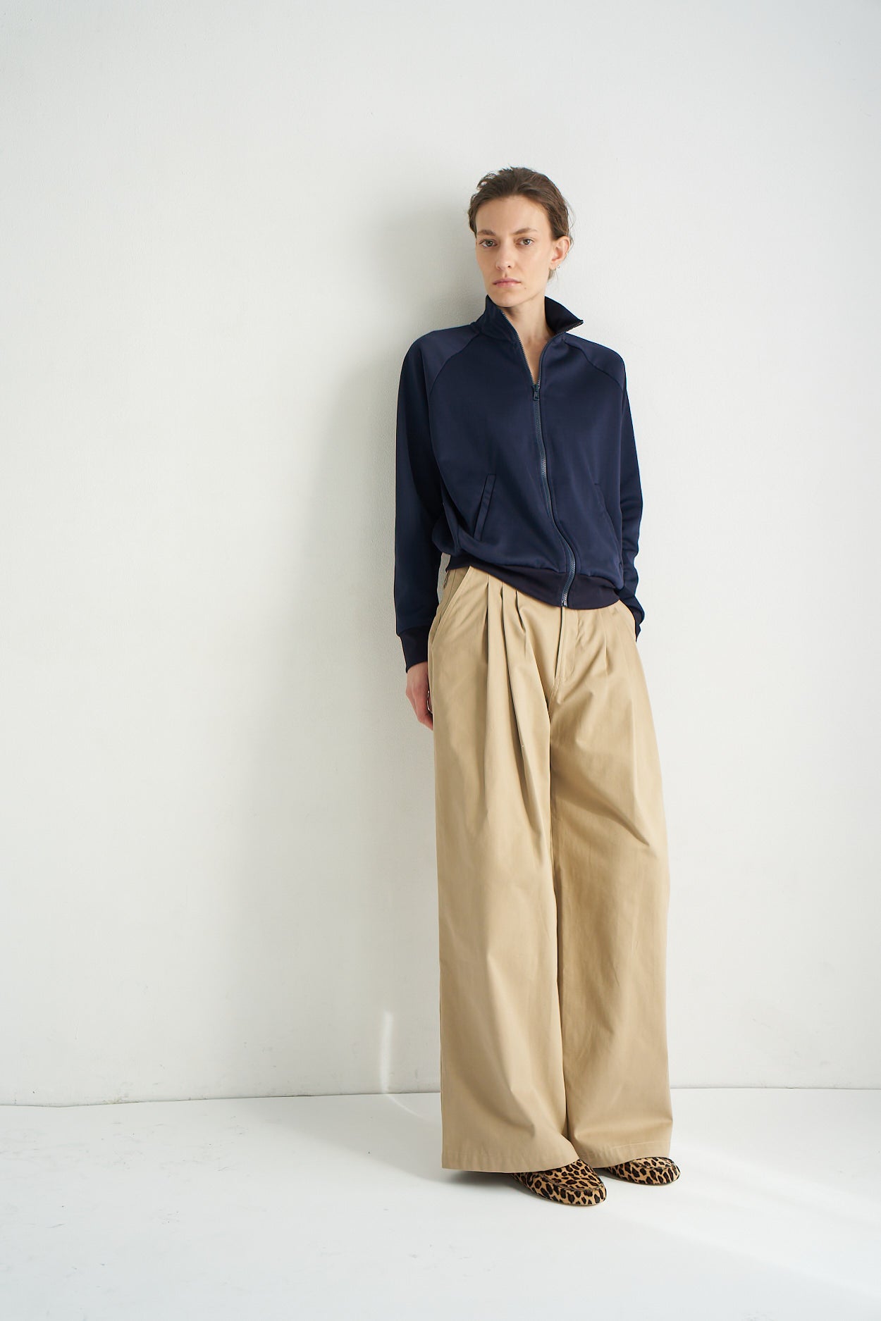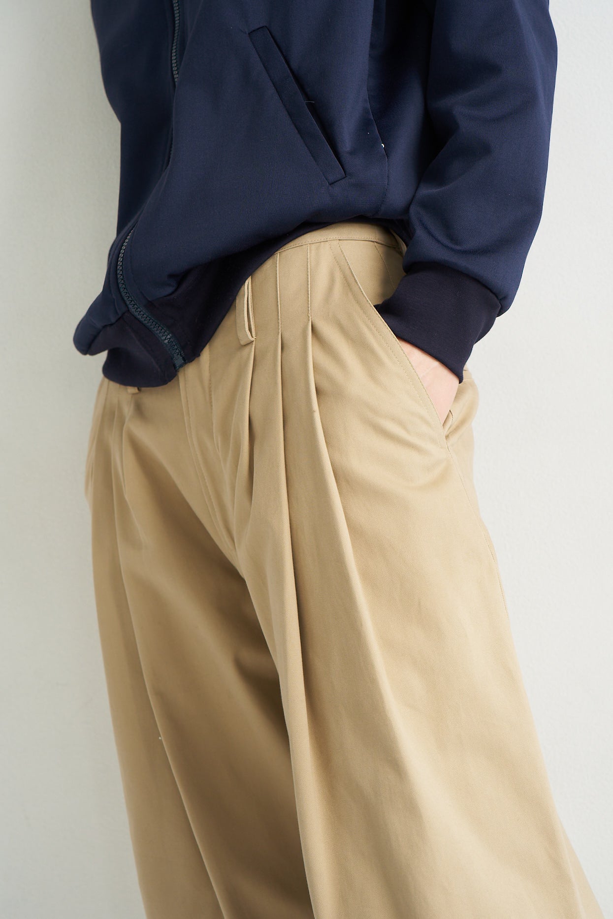 A mid rise trouser with triple pleat detailing at hip level offers beautiful drape and fullness in a low and extremely flattering position. Tailored in Los Angeles of Japanese twill.